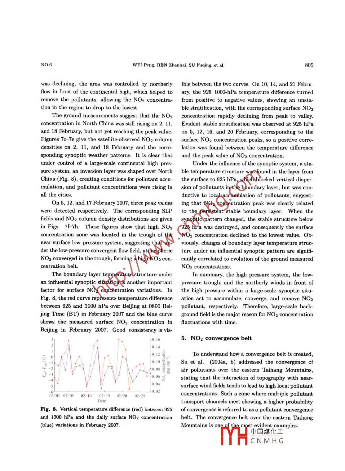 VOL.25 NO. 6ACTA METEOROLOGICA SINICA2011Environmental Process and Convergence Belt of Atmospheric NO2Pollution in North China*WEI Peng' (尉鵬), REN Zhenhai2t(任陣海), sU Fuqing?(蘇福慶), CHENG Shuiyuan'(程水源),ZHANG Peng3(張鵬), and GAO Qingxian2(高慶先)1 College of Environmental & Energy Engineering, Beijing University of Technology, Beijing 1000222 Chinese Research Acaderny of Environmental Sciences, Beijing 1000123 National Satelite Meteorological Center, China Meteorological Administration, Beijing 100081(Received October 16, 2010; in final form October 8, 2011)ABSTRACTBoth surface environmental monitoring and satellite remote sensing show that North China is one ofthe regions that are heavily polluted by NOz. Using the NO2 monitoring data from 18 major cities inthe region, the tropospheric NO2 column density data from the Ozone Monitoring Instrument (OMI) onthe Aura satellite, and the observations from the China Meteorological Administration network, this paperanalyzes a regional NO2 pollution event in February 2007 over North China, examines the convergence of thepollutant, and identifies its correlation with the atmospheric background conditions. The results show thatdaily mean NO2 concentrations derived from surface observations are consistent with the mean values of theOMI measurements, with their correlation coefficient reaching 0.81. The correlations of NO2 concentrationwith general weather patterns and sequential changes of temperature structure from 925 hPa down to thesurface indicate that the weather fronts, high pressure and low pressure systems in the atmosphere playrole in changing the temporal and spatial evolutions of NO2 through removing, accumulating or convergingof the pollutant, respectively. It is also found that the eastern Taihang Mountains is most heavily pollutedby NO2 in North China. Based on a model that correlates NOz column density with surface wind vector,the relation of the NO2 concentrations in six major cities in North China to the surrounding wind feldis analyzed. The results show that the maximum wind field is associated with the highest frequency opollution events, and under certain large scale atmospheric conditions together with the topographic effectsmall- and meso-scale wind fields often act to transport and converge pollutants, and become a major factorin forming the heaviest NO2 pollution event in North China. Analysis of the causes for the severe NOpollution event in this study may shed light on understanding, forecasting, and mitigating occurrences ofheavy NO2 pollution.Key words: atmospheric pollution, environmental process, convergence belt, satellite remote sensingCitation: Wei Peng, Ren Zhenhai, Su Fuqing, et al., 2011: Environmental process and convergence belt ofatmospheric NO2 pollution in North China. Acta Meteor. Sinica, 25(6), 797-811, doi: 10.1007/s13351-011-0610-x.1. IntroductionPrevious studies show that during 1996- 2006, adecreasing trend in NO2 concentration appeared glob-Nitrogen dioxide (NO2) is a major atmospherically, especially along the eastern coast of the Unitedpollutant and a main precursor of acid rain and photo- States (Kim et al, 2006) and Europe (Richter et al,chemical smog, which has serious effects on atmo-2005). In contrast, as a result of the rapid economicspheric environment quality. High NO2 concentration development in recent years, China now becomes amay lead to a higher mortality of lung cancer, 80 it isregion with the highest NO2 concentration and thedetrimental to human health. Also as a precursor offastestNO2 increase rate; especially, the easternozone, higher NO2 concentration often leads to peak-China has witnessed a rapid NO2 increase sincevalued ozone concentration.2000 (Sachin et al., 2009). Therefore, studies on the●Supported by the Fundamental Rescarch Fund of the Chinese Research Academy of Environmental Sciences (2010KYYW08).↑Corresponding author: weipeng - 1981 @hotmail.com.CThe Chinese Meteorological Society and Springer- Verlag Berlin Heidelberg 2011中國煤化工MYHCNMHG798ACTA METEOROLOGICA SINICAVOL.25 .characteristics and mechanisms of severe NO2 pollu-also analyzed the pollution sources. They suggestedtion events are of particular interest and urgency to that human activities may affect the spatial distribu-the environmental science community.tion of NO2 concentration (Zhang x. Y., et al, 2007).The concentration changes of pollutants in a reGOME and SCIAMACHY data, andgional air pllution process are subject to impacts of with an atmospheric chemistry transport model, Yueatmospheric conditions, as the removal, accumulation,t al. (2009) investigated the seasonal NO2 variationsand convergence of air pollutants are closely related and drew simnilar conclusions. Wang et al. (2009) con-to the changes in weather patterns (Ren et al, 2005;firmed the impacts of human activities on NO2 columnDing, 2005). A convergence belt usually representsa density in the troposphere in several geographic zoneszone with the highest concentration of a given pollu-of China.tant within a certain region, and its genesis and re-In the next five years (2011 -2015), the China en-moval with time and its spatial variation determine vironmental protection authority will make greater ef-the occurrence probability of severe pollution eventsforts to control the NO2 pollution. But so far, neitherin China (Su et al., 2004a).comprehensive investigations on the spatial distribu-In recent years, with advances in space-basedtion and temporal evolution of pollutants in Chinaremote sensing technologies, the sensorsnor studies on the seasonal NO2 variations have beenMACHY (Scanning Imaging Absorption Spectromecarried out at home and abroad. Using high resolu-ter for Atmosplheric CHartographY) and OMI (Ozonetion and large coverage satellite remote sensing ob-Monitoring Instrument), among others, have beenservations, this paper focuses on the pending issuesused to obtain the distributions of large-scale NO2 co