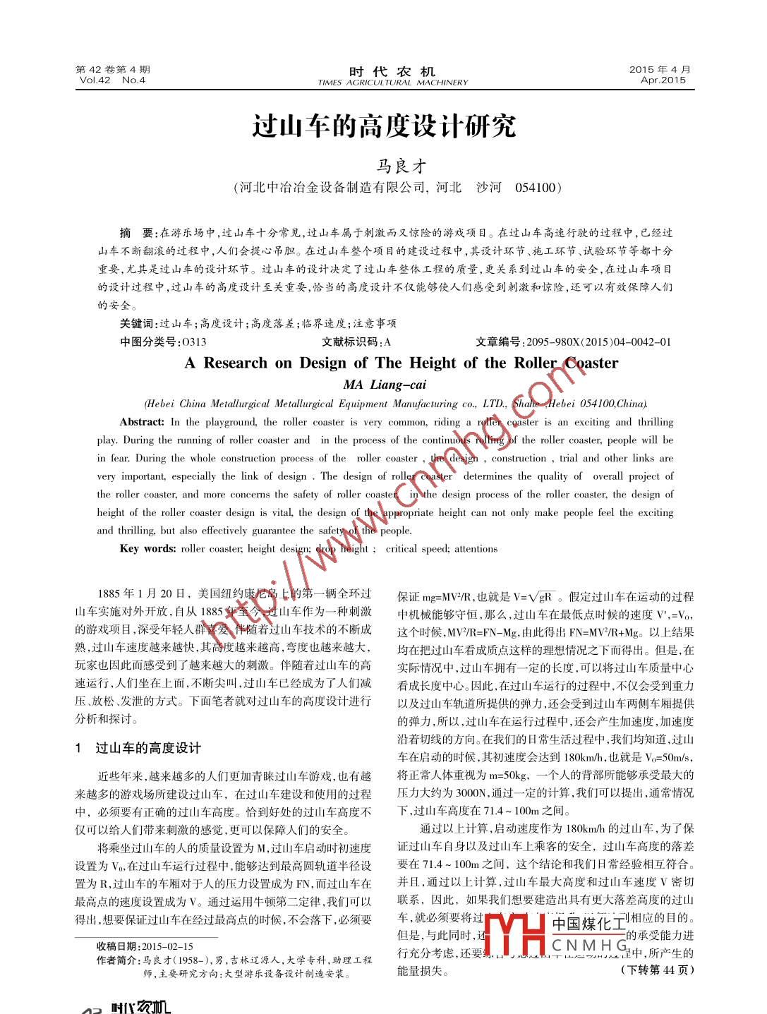 第42.卷第4期時代農(nóng)機2015年4月Vol.42 No.4TIMES AGRICULTURAL MACHINERYApr.2015過山車的高度設(shè)計研究馬良才(河北中冶冶金設(shè)備制造有限公司,河北沙河054100)摘要:在游樂場中 ,過山車十分常見,過山車屬于刺激而又驚險的游戲項目。在過山車高速行駛的過程中,已經(jīng)過山車不斷翻滾的過程中,人們會提心吊膽。在過山車整個項目的建設(shè)過程中,其設(shè)計環(huán)節(jié)、施工環(huán)節(jié)、試驗環(huán)節(jié)等都十分重要,尤其是過山車的設(shè)計環(huán)節(jié)。過山車的設(shè)計決定了過山車整體工程的質(zhì)量,更關(guān)系到過山車的安全,在過山車項目的設(shè)計過程中,過山車的高度設(shè)計至關(guān)重要,恰當?shù)母叨仍O(shè)計不僅能夠使人們感受到刺激和驚險,還可以有效保障人們的安全。關(guān)鍵詞:過山車;高度設(shè)計;高度落差;臨界速度;注意事項中圖分類號:0313文獻標識碼:A文章編號:2095- -980X(2015)04 -0042-01A Research on Design of The Height of the Roller CoasterMA Liang- -cai(Hebei China Metllurgical Metallurgical Equipment Manfacturing co, LTD., Shahe ,Hebei 054100,China.Abstract: In the playground, the rller coaster is very common, riding a rllr coaster is an exciting and thilingplay. During the running of roller coaster and in the process of the continuous rlling of the roller coaster, people will bein fear. During the whole construction process of the roller coaster,the design ,construction,trial and other links arevery important, especially the link of design . The design of roller coaster determines the quality of overall project ofthe roller coaster, and more concems the safety of roller coaster, in the design process of the roller coaster, the design ofheight of the roller coaster design is vital, the design of the appropriate height can not only make people feel the excitingand thilling, but also efectively guarantee the safety of the people.Key words: rollere coaster; height design; drop height ; critical speed; attentions1885年1月20日,美國紐約康尼島上的第-輛全環(huán)過保證mg=MV2/R,也就是V=VgR。假定過山車在運動的過程山車實施對外開放,自從1885年至今,過山車作為一-種刺激中機械能夠守恒,那么,過山車在最低點時候的速度V",=Vo,的游戲項目,深受年輕人群喜愛。伴隨著過山車技術(shù)的不斷成這個時候, MV/R=FN-Mg,由此得出FN=MV/R+Mg。以上結(jié)果熟,過山車速度越來越快,其高度越來越高,彎度也越來越大,均在把過山車看成質(zhì)點這樣的理想情況之下而得出。但是,在玩家也因此而感受到了越來越大的刺激。伴隨著過山車的高.實際情況中,過山車擁有--定的長度,可以將過山車質(zhì)量中心速運行,人們坐在上面,不斷尖叫,過山車已經(jīng)成為了人們減看成長度中心。因此,在過山車運行的過程中,不僅會受到重力壓放松、發(fā)泄的方式。下面筆者就對過山車的高度設(shè)計進行以及過山車軌道所提供的彈力,還會受到過山車兩側(cè):車廂提供分析和探討。的彈力,所以,過山車在運行過程中,還會產(chǎn)生加速度,加速度沿著切線的方向。在我們的日常生活過程中,我們均知道,過山1過山車的高 度設(shè)計車在啟動的時候,其初速度會達到180km/h, 也就是Vo -50m/s,近些年來,越來越多的人們更加青睞過山車游戲,也有越將正常人體重視為m=50kg, - -個人的背部所能夠承受最大的來越多的游戲場所建設(shè)過山車,在過山車建設(shè)和使用的過程壓力大約為3000N,通過一-定的計算,我們可以提出,通常情況中,必須要有正確的過山車高度。恰到好處的過山車高度不下,過山車高度在71.4 ~ 100m之間。僅可以給人們帶來刺激的感覺,更可以保障人們的安全。通過以上計算,啟動速度作為180kmh的過山車,為了保將乘坐過山車的人的質(zhì)量設(shè)置為M,過山車啟動時初速度證過山車自身以及過山車上乘客的安全,過山車高度的落差設(shè)置為Vo,在過山車運行過程中,能夠達到最高圓軌道半徑設(shè)要在71.4~ 100m之間,這個結(jié)論和我們?nèi)粘=?jīng)驗相互符合。.置為R,過山車的車廂對于人的壓力設(shè)置成為FN,而過山車在并且,通過以上計算,過山車最大高度和過山車速度V密切最高點的速度設(shè)置成為V。通過運用牛頓第二定律,我們可以聯(lián)系, 因此,如果我們想要建造出具有更大落差高度的過山得出想要保證過山車在經(jīng)過最高點的時候,不會落下,必須要車,就必須要將過中國煤化工相應(yīng)的目的。但是,與此同時,的承受能力進收稿日期:2015-02-15HCNMHG作者簡介:馬良才(1958-),男,吉林遼源人,大學(xué)???助理工程行充分考慮,還要身.e.程中,所產(chǎn)生的師,主要研究方向:大型游樂設(shè)備設(shè)計制造安裝。能量損失。(下轉(zhuǎn)第44頁)42時仆農(nóng)機,設(shè)計研究唐玉兵,秦祖銘:構(gòu)建基于24XX系列存儲器通用函數(shù)庫的研究SCLSDA+ START→←SDA→- SDA ++STOP +CONDITIONINPUT CHANGE圖1 I2C 協(xié)議時序圖*ucData=i2c_ recvbyte0:// 讀取存儲器數(shù)據(jù){LenTmp=(Addr/64+ 1)*64-Addr;}i2c_ sendnoack0;//發(fā)送N0ACK信號else if(i!=Addr && i==(Addr+Len)/64)*64)i2c_ stp://C/結(jié)束{LenTmp= (Addr+Len)%64}; // 最后一次寫人最后的未滿24C04以下類型采用8位地址操作,在編寫隨機讀取函64字節(jié)部分數(shù)時,只需要把函數(shù)中分兩次8位寫入的地址,改為寫人- -次else //中間部分長度為固定的64字節(jié)8位地址即可。{ Len'Tmp=64;}(2)存儲器的頁操作,為了提升存儲器的讀寫速度,24xxi2c_ writstiAdd