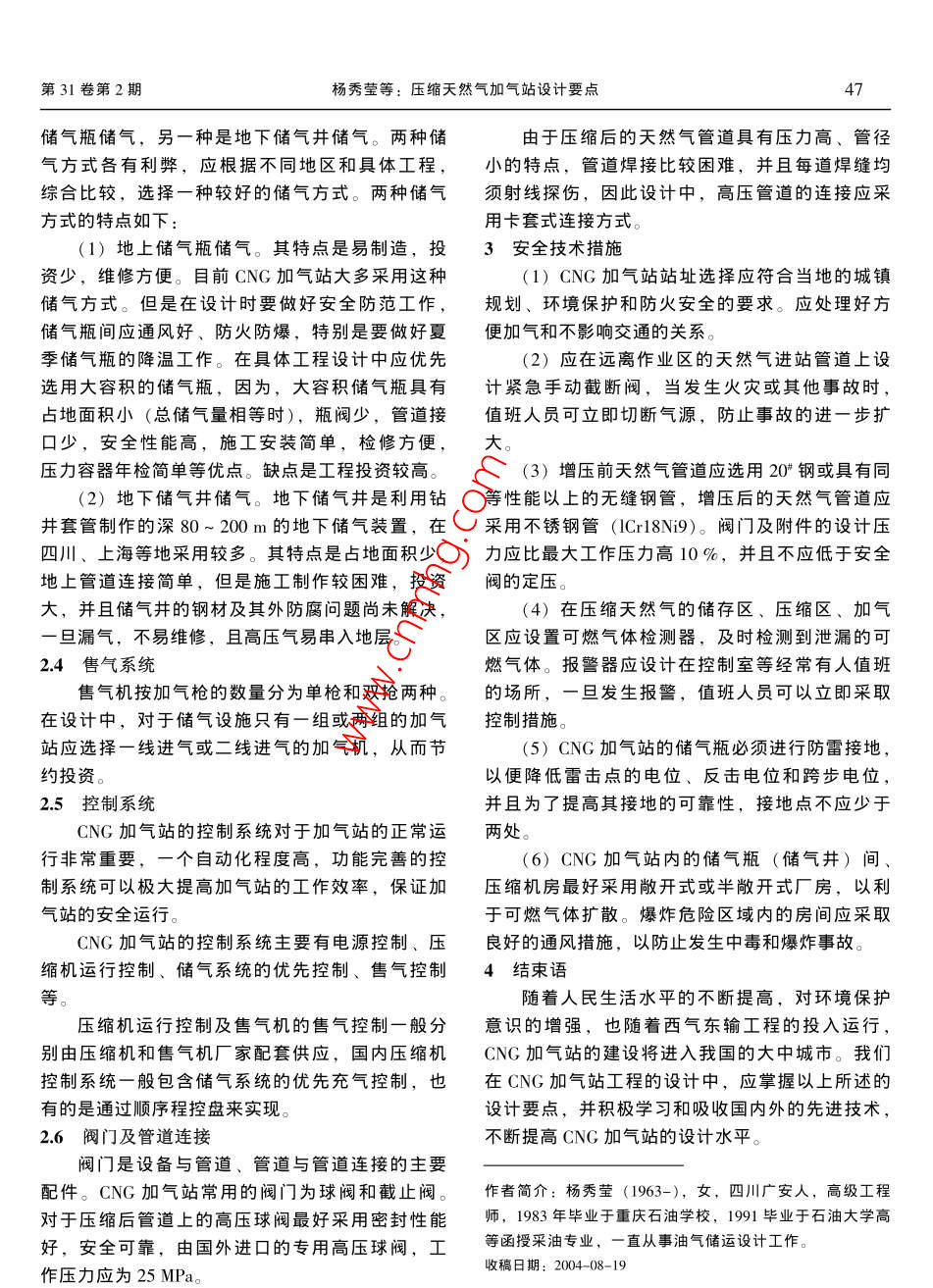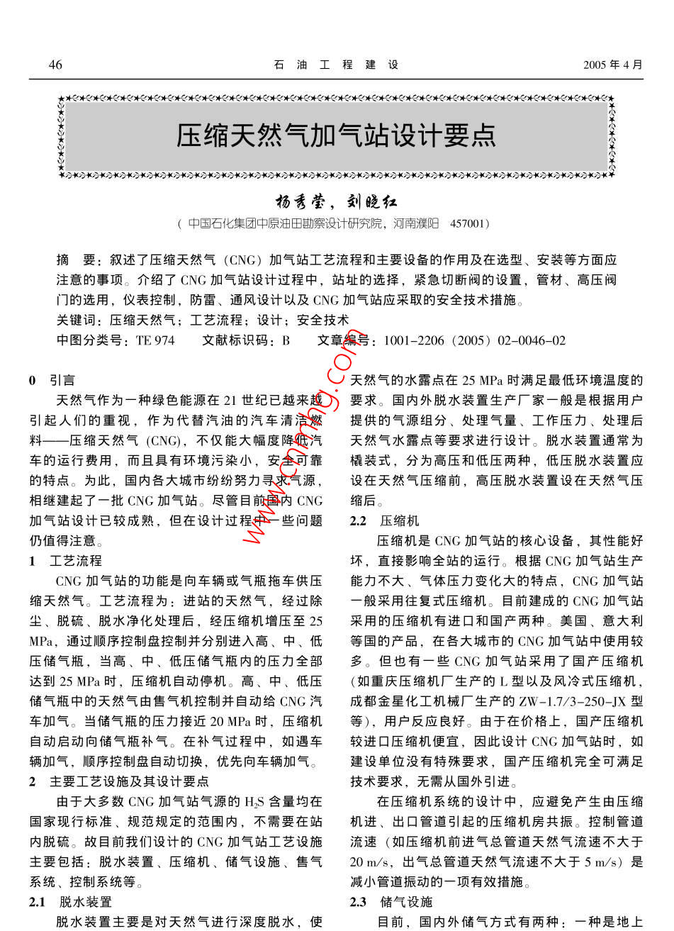 石油工程建2005年4月壓縮天然氣加氣站設(shè)計(jì)要點(diǎn)楊秀瑩,劉曉紅(中國(guó)石化集團(tuán)中原油田勘察沒(méi)計(jì)研究院,河南濮陽(yáng)457001)摘要:敘述了壓縮天然氣(CNG)加氣站工藝流程和主要設(shè)備的作用及在選型、安裝等方面應(yīng)注意的事項(xiàng)。介紹了CNG加氣站設(shè)計(jì)過(guò)程中,站址的選擇,緊急切斷閥的設(shè)置,管材、高壓閥門的選用,儀表控制,防雷、通風(fēng)設(shè)計(jì)以及CNG加氣站應(yīng)采取的安全技術(shù)措施。關(guān)鍵詞:壓縮天然氣;工藝流程;設(shè)計(jì);安全技術(shù)中圖分類號(hào):TE974文獻(xiàn)標(biāo)識(shí)碼:B文章編號(hào):1001-2206(2005)02-0046-020引言天然氣的水露點(diǎn)在25MPa時(shí)滿足最低環(huán)境溫度的天然氣作為一種綠色能源在21世紀(jì)已越來(lái)越要求。國(guó)內(nèi)外脫水裝置生產(chǎn)廠家一般是根據(jù)用戶引起人們的重視,作為代替汽油的汽車清潔燃提供的氣源組分、處理氣量、工作壓力、處理后料——壓縮天然氣(CNG),不僅能大幅度降低汽天然氣水露點(diǎn)等要求進(jìn)行設(shè)計(jì)。脫水裝置通常為車的運(yùn)行費(fèi)用,而且具有環(huán)境污染小,安全可靠橇裝式,分為高壓和低壓兩種,低壓脫水裝置應(yīng)的特點(diǎn)。為此,國(guó)內(nèi)各大城市紛紛努力尋求氣源,設(shè)在天然氣壓縮前,高壓脫水裝置設(shè)在天然氣壓相繼建起了一批CNG加氣站。盡管目前國(guó)內(nèi)CNG縮后。加氣站設(shè)計(jì)已較成熟,但在設(shè)計(jì)過(guò)程中一些問(wèn)題22壓縮機(jī)仍值得注意。壓縮機(jī)是CNG加氣站的核心設(shè)備,其性能好1工藝流程壞,直接影響全站的運(yùn)行。根據(jù)CNG加氣站生產(chǎn)CNG加氣站的功能是向車輛或氣瓶拖車供壓能力不大、氣體壓力變化大的特點(diǎn),CNG加氣站縮天然氣。工藝流程為:進(jìn)站的天然氣,經(jīng)過(guò)除般采用往復(fù)式壓縮機(jī)。目前建成的CNG加氣站塵、脫硫、脫水凈化處理后,經(jīng)壓縮機(jī)增壓至25采用的壓縮機(jī)有進(jìn)口和國(guó)產(chǎn)兩種。美國(guó)、意大利MPa,通過(guò)順序控制盤控制并分別進(jìn)入高、中、低等國(guó)的產(chǎn)品,在各大城市的CNG加氣站中使用較壓儲(chǔ)氣瓶,當(dāng)高、中、低壓儲(chǔ)氣瓶?jī)?nèi)的壓力全部多。但也有一些CNG加氣站采用了國(guó)產(chǎn)壓縮機(jī)達(dá)到25MPa時(shí),壓縮機(jī)自動(dòng)停機(jī)。高、中、低壓(如重慶壓縮機(jī)廠生產(chǎn)的L型以及風(fēng)冷式壓縮機(jī),儲(chǔ)氣瓶中的天然氣由售氣機(jī)控制并自動(dòng)給CNG汽成都金星化工機(jī)械廠生產(chǎn)的ZW-1.7/3-250-JX型車加氣。當(dāng)儲(chǔ)氣瓶的壓力接近20MPa時(shí),壓縮機(jī)等),用戶反應(yīng)良好。由于在價(jià)格上,國(guó)產(chǎn)壓縮機(jī)自動(dòng)啟動(dòng)向儲(chǔ)氣瓶補(bǔ)氣。在補(bǔ)氣過(guò)程中,如遇車較進(jìn)囗壓縮機(jī)便宜,因此設(shè)計(jì)CNG加氣站時(shí),如輛加氣,順序控制盤自動(dòng)切換,優(yōu)先向車輛加氣。建設(shè)單位沒(méi)有特殊要求,國(guó)產(chǎn)壓縮機(jī)完全可滿足2主要工藝設(shè)施及其設(shè)計(jì)要點(diǎn)技術(shù)要求,無(wú)需從國(guó)外引進(jìn)由于大多數(shù)CNG加氣站氣源的HS含量均在在壓縮機(jī)系統(tǒng)的設(shè)計(jì)中,應(yīng)避免產(chǎn)生由壓縮國(guó)家現(xiàn)行標(biāo)準(zhǔn)、規(guī)范規(guī)定的范圍內(nèi),不需要在站機(jī)進(jìn)、岀口管道引起的壓縮機(jī)房共振??刂乒艿纼?nèi)脫硫。故目前我們?cè)O(shè)計(jì)的CNG加氣站工藝設(shè)施流速(如壓縮機(jī)前進(jìn)氣總管道天然氣流速不大于主要包括:脫水裝置、壓縮機(jī)、儲(chǔ)氣設(shè)施、售氣20m/s,出氣總管道天然氣流速不大于5m/s)是系統(tǒng)、控制系統(tǒng)等。減小管道振動(dòng)的一項(xiàng)有效措施。21脫水裝置23儲(chǔ)氣設(shè)施脫水裝置主要是對(duì)天然氣進(jìn)行深度脫水,使目前,國(guó)內(nèi)外儲(chǔ)氣方式有兩種:一種是地上第31卷第2期楊秀瑩等:壓縮天然氣加氣站設(shè)計(jì)要點(diǎn)儲(chǔ)氣瓶?jī)?chǔ)氣,另一種是地下儲(chǔ)氣井儲(chǔ)氣。兩種儲(chǔ)由于壓縮后的天然氣管道具有壓力高、管徑氣方式各有利弊,應(yīng)根據(jù)不同地區(qū)和具體工程,小的特點(diǎn),管道焊接比較困難,并且每道焊縫均綜合比較,選擇一種較好的儲(chǔ)氣方式。兩種儲(chǔ)氣須射線探傷,因此設(shè)計(jì)中,高壓管道的連接應(yīng)采方式的特點(diǎn)如下用卡套式連接方式(1)地上儲(chǔ)氣瓶?jī)?chǔ)氣。其特點(diǎn)是易制造,投3安全技術(shù)措施資少,維修方便。目前CNG加氣站大多采用這種(1)CNG加氣站站址選擇應(yīng)符合當(dāng)?shù)氐某擎?zhèn)儲(chǔ)氣方式。但是在設(shè)計(jì)時(shí)要做好安全防范工作,規(guī)劃、環(huán)境保護(hù)和防火安全的要求。應(yīng)處理好方儲(chǔ)氣瓶間應(yīng)通風(fēng)好、防火防爆,特別是要做好夏便加氣和不影響交通的關(guān)系。季儲(chǔ)氣瓶的降溫工作。在具體工程設(shè)計(jì)中應(yīng)優(yōu)先(2)應(yīng)在遠(yuǎn)離作業(yè)區(qū)的天然氣進(jìn)站管道上設(shè)選用大容積的儲(chǔ)氣瓶,因?yàn)?大容積儲(chǔ)氣瓶具有計(jì)緊急手動(dòng)截?cái)嚅y,當(dāng)發(fā)生火災(zāi)或其他事故時(shí)占