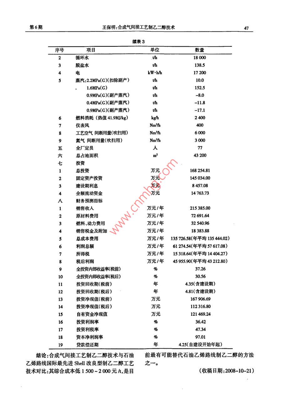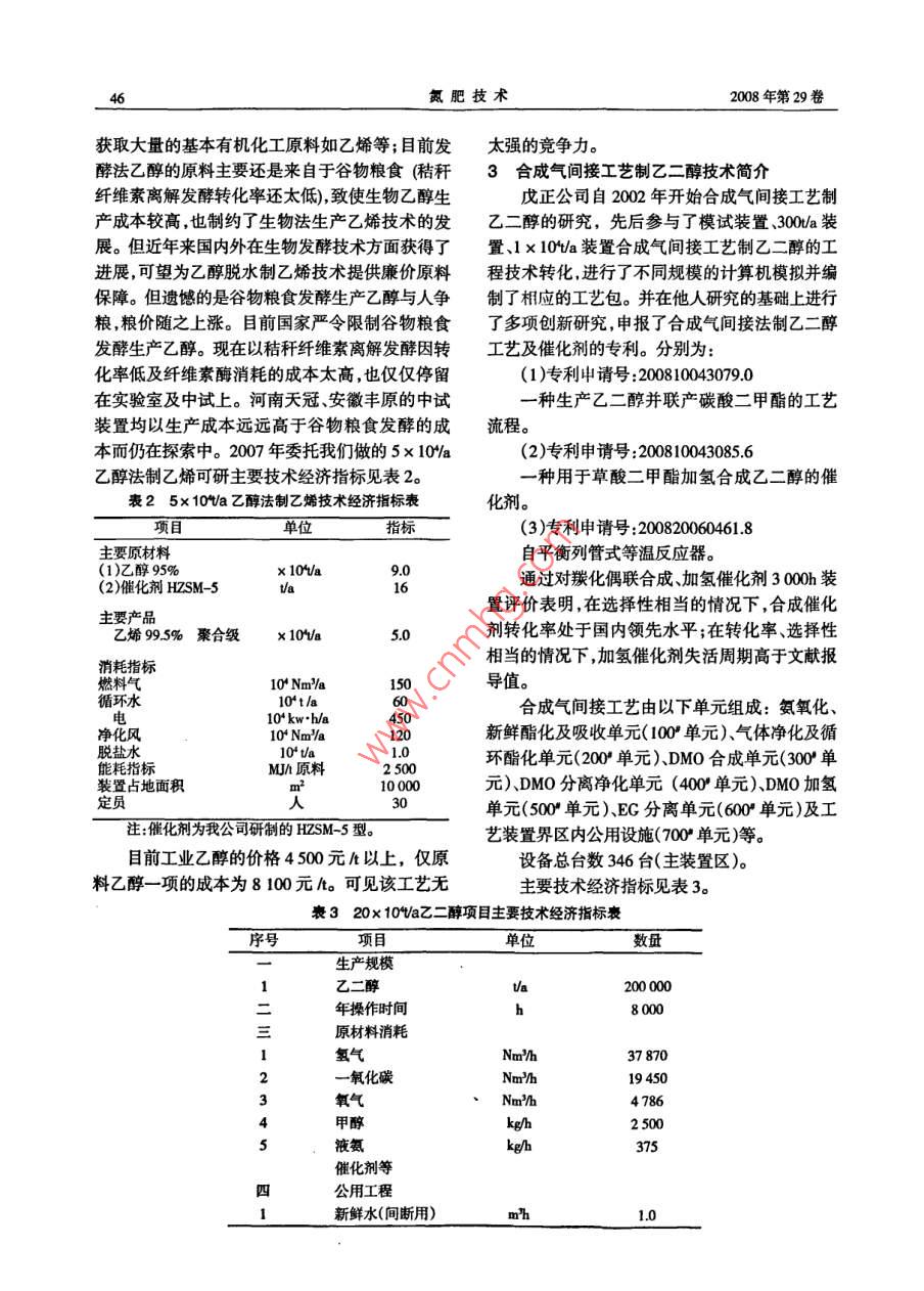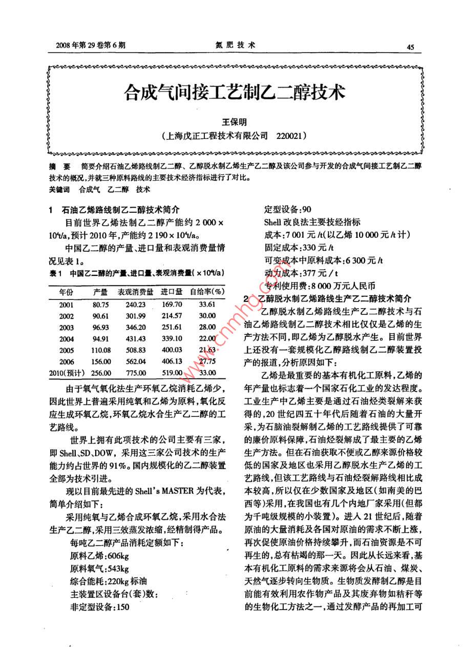 2008年第29卷第6期氮肥技術(shù)合成氣間接工藝制乙二醇技術(shù)王保明(上海戊正工程技術(shù)有限公司220021)摘要簡要介紹石油乙烯路線制乙二醇、乙醇脫水制乙烯生產(chǎn)乙二醇及該公司參與開發(fā)的合成氣間接工藝制乙二醇技術(shù)的概況,并就三種原料路線的主要技術(shù)經(jīng)濟指標進行了對比關(guān)鍵詞合成氣乙二醇技術(shù)1石油乙烯路線制乙二醇技術(shù)簡介定型設(shè)備:90目前世界乙烯法制乙二醇產(chǎn)能約2000xShell i改良法主要技經(jīng)指標10ta,預(yù)計2010年,產(chǎn)能約2190x10a成本:7001元N(以乙烯10000元/計)中國乙二醇的產(chǎn)量進口量和表觀消費量情固定成本:330元/t況見表1。可變成本中原料成本:6300元豪1中國乙二醇的產(chǎn)量進口量表觀消費量(x10%a)動力成本:377元/t年份產(chǎn)量表觀消費量進口量自給率(%)專利使用費:8000萬元人民幣200180.75240231697033612乙醇脫水制乙烯路線生產(chǎn)乙二醇技術(shù)簡介214.57乙醇脫水制乙烯路線生產(chǎn)乙二醇技術(shù)與石2003969334620251612800油乙烯路線制乙二醇技術(shù)相比僅僅是乙烯的生949143143339102200產(chǎn)方法不同,即乙烯為乙醇脫水產(chǎn)生。目前世界1100850883上還沒有一套規(guī)?;掖悸肪€制乙二醇裝置投200615600562044061327.75產(chǎn)的報道,分析原因如下2010預(yù)計)256007500519003300乙烯是最重要的基本有機化工原料,乙烯的由于氧氣氧化法生產(chǎn)環(huán)氧乙烷消耗乙烯少,年產(chǎn)量也標志著一個國家石化工業(yè)的發(fā)達程度。因此世界上普遍采用純氧和乙烯為原料,氧化反工業(yè)生產(chǎn)中乙烯主要是通過石油烴類裂解來獲應(yīng)生成環(huán)氧乙烷環(huán)氧乙烷水合生產(chǎn)乙二醇的工得的,20世紀四五十年代后隨著石油的大量開藝路線采,為石腦油裂解制乙烯的工藝路線提供了可靠世界上擁有此項技術(shù)的公司主要有三家,的廉價原料保障,石油烴裂解成了最主要的乙烯即Shel、SD、D0W,采用這三家公司技術(shù)的生產(chǎn)生產(chǎn)方法。但在石油獲取不便或乙醇來源價格較能力約占世界的91%。國內(nèi)規(guī)?;囊叶佳b置低的國家及地區(qū)也采用乙醇脫水生產(chǎn)乙烯的工全部為技術(shù)引進。藝路線但該工藝路線與石油烴裂解路線相比成現(xiàn)以目前最先進的 Shell s master為代表,本較高,所以僅在少數(shù)國家及地區(qū)(如南美的巴簡單介紹如下西等)采用在我國也有幾個內(nèi)地廠家采用(但都采用純氧與乙烯合成環(huán)氧乙烷采用水合法為千噸級規(guī)模的小裝置)。進入21世紀后隨著生產(chǎn)乙二醇,采用三效蒸發(fā)濃縮經(jīng)精制得產(chǎn)品。原油的大量消耗及各國對原油的需求不斷上漲,每噸乙二醇產(chǎn)品消耗定額如下:再次促使原油價格持續(xù)攀升,而石油資源是不可原料乙烯:606kg再生的,總有枯竭的那一天。因此從長遠來看,基原料氧氣:543kg本有機化工原料的需求來源將會從石油、煤炭綜合能耗:220kg標油天然氣逐步轉(zhuǎn)向生物質(zhì)。生物質(zhì)發(fā)酵制乙醇是目主裝置區(qū)設(shè)備臺(套)數(shù):前能有效利用農(nóng)作物產(chǎn)品及其廢棄物如秸稈等非定型設(shè)備:150的生物化工方法之一,通過發(fā)酵產(chǎn)品的再加工可氮肥技術(shù)2008年第29卷獲取大量的基本有機化工原料如乙烯等;目前發(fā)太強的競爭力。酵法乙醇的原料主要還是來自于谷物糧食秸稈3合成氣間接工藝制乙二醇技術(shù)簡介纖維素離解發(fā)酵轉(zhuǎn)化率還太低),致使生物乙醇生戊正公司自2002年開始合成氣間接工藝制產(chǎn)成本較高也制約了生物法生產(chǎn)乙烯技術(shù)的發(fā)乙二醇的研究,先后參與了模試裝置、300a裝展。但近年來國內(nèi)外在生物發(fā)酵技術(shù)方面獲得了置、1×10%a裝置合成氣間接工藝制乙二醇的工進展,可望為乙醇脫水制乙烯技術(shù)提供廉價原料程技術(shù)轉(zhuǎn)化,進行了不同規(guī)模的計算機模擬并編保障。但遺憾的是谷物糧食發(fā)酵生產(chǎn)乙醇與人爭制了相應(yīng)的工藝包。并在他人研究的基礎(chǔ)上進行糧糧價隨之上漲。目前國家嚴令限制谷物糧食了多項創(chuàng)新研究,申報了合成氣間接法制乙二醇發(fā)酵生產(chǎn)乙醇?,F(xiàn)在以秸稈纖維素離解發(fā)酵因轉(zhuǎn)工藝及催化劑的專利。分別為:化率低及纖維素酶消耗的成本太高,也僅僅停留(1)專利屮請?zhí)?2008100430790在實驗室及中試上。河南天冠、安徽豐原的中試種生產(chǎn)乙二醇并聯(lián)產(chǎn)碳酸二甲酯的工藝裝置均以生產(chǎn)成本遠遠高于谷物糧食發(fā)酵的成流程。本而仍在探索中。2007年委托我們做的5×10/a(2)專利申請?zhí)?2008100430856乙醇法制乙烯可研主要技術(shù)經(jīng)濟指標見表2。一種用于草酸二甲酯加氫合成乙二醇的催表25×10t/a乙醇法制乙烯技術(shù)經(jīng)濟指標表化劑。項目單位指標(3)專利申請?zhí)?2008200604618主要原材料自平衡列管式等溫反應(yīng)器。(1)乙醇95%x 10/a90(2)催化劑HZSM-56通過對羰化偶聯(lián)合成加氫催化劑3000h裝置評價表明,在選擇性相當?shù)那闆r下,合成催化乙烯995%聚合級x10t/a劑轉(zhuǎn)化率處于國內(nèi)領(lǐng)先水平;在轉(zhuǎn)化率、選擇性消耗指標相當?shù)那闆r下加氫催化劑失活周期高于文獻報燃料氣10 Nmla導(dǎo)值。循環(huán)水10t/a6010 kw.w/a450合成氣間接工藝由以下單