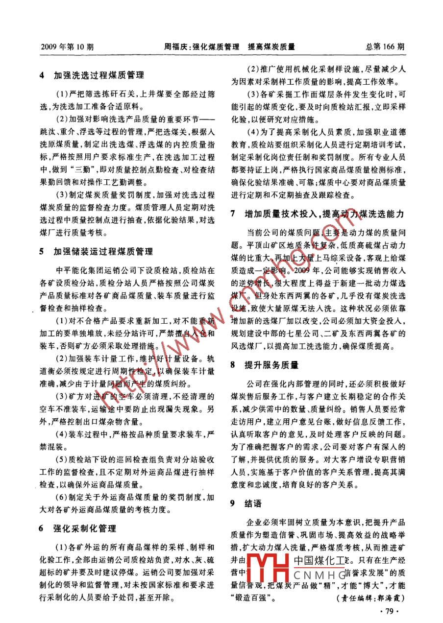 2009年第10期中州煤炭總第166期強(qiáng)化煤質(zhì)管理提高煤炭質(zhì)量周福慶(平頂山天安煤業(yè)股份有限公司運(yùn)銷公司,河南平頂山467000)摘要:要想在激烈的市場(chǎng)競(jìng)爭(zhēng)中立于不敗之地,煤炭企業(yè)必須要牢固樹(shù)立質(zhì)量為本意識(shí),把提升產(chǎn)品質(zhì)量作為塑造信譽(yù)、鞏固市場(chǎng)、提高效益的戰(zhàn)略舉措。從完善煤質(zhì)管理保證體系,建立成本與質(zhì)量的經(jīng)營(yíng)考核機(jī)制,加強(qiáng)生產(chǎn)過(guò)程的煤質(zhì)管理,洗選過(guò)程煤質(zhì)管理,增加質(zhì)量技術(shù)投入,提高動(dòng)力煤洗選能力等方面闡述了中平能化集團(tuán)改善和提高煤質(zhì)、強(qiáng)化煤質(zhì)管理應(yīng)采取的具體措施。關(guān)鍵詞:質(zhì)量管理;客戶價(jià)值;價(jià)值分析;煤質(zhì)中圖分類號(hào):F253.3文獻(xiàn)標(biāo)識(shí)碼:B文章編號(hào):1003 - 0506(2009)10 - 0078 - 02煤炭企業(yè)必須牢固樹(shù)立質(zhì)量為本意識(shí),努力提日?qǐng)?bào)、銷售月報(bào)形式構(gòu)成質(zhì)量回饋系統(tǒng)。高改善煤炭質(zhì)量,才能在激烈的市場(chǎng)競(jìng)爭(zhēng)中立于不2建立成本與質(zhì)量的經(jīng)營(yíng)考核機(jī)制敗之地。為了滿足客戶對(duì)煤炭產(chǎn)品的質(zhì)量要求,中平能化集團(tuán)的一一切生產(chǎn)經(jīng)營(yíng)活動(dòng)必須堅(jiān)持客戶導(dǎo)建立質(zhì)量與成本的經(jīng)營(yíng)考核機(jī)制,在機(jī)制上完向,以滿足客戶需求為出發(fā)點(diǎn),強(qiáng)化煤質(zhì)管理,努力全與市場(chǎng)對(duì)接,依據(jù)市場(chǎng)的需要,把煤炭在市場(chǎng)上的提高、改善煤炭質(zhì)量。價(jià)值實(shí)現(xiàn)作為考核指標(biāo),變目前的內(nèi)部成本、質(zhì)量考核為完全與市場(chǎng)對(duì)接的成本、質(zhì)量經(jīng)營(yíng)考核,促使原1完善 煤質(zhì)管理保證體系煤生產(chǎn)單位在生產(chǎn)源頭想著銷售終端,切實(shí)把煤質(zhì)(1)實(shí)行質(zhì)量礦長(zhǎng)負(fù)貴制。礦長(zhǎng)對(duì)煤炭質(zhì)量全納人企業(yè)經(jīng)營(yíng)管理范疇,與收人切實(shí)掛鉤,從而促進(jìn)面負(fù)責(zé),分管副礦長(zhǎng)、職能部門、生產(chǎn)單位,按其煤質(zhì)煤質(zhì)的提高。責(zé)任制履行職責(zé)。(2)質(zhì)量目標(biāo)控制管理。各礦要制定煤質(zhì)計(jì)3加強(qiáng)生產(chǎn)過(guò)程的煤質(zhì)管理劃,并將之分解到質(zhì)量構(gòu)成的各個(gè)環(huán)節(jié),按計(jì)劃進(jìn)行(1)開(kāi)展各種形式的質(zhì)量意識(shí)教育活動(dòng),提高控制。井下一線職工煤炭品質(zhì)意識(shí),使職工充分認(rèn)識(shí)到提(3)構(gòu)建全面質(zhì)量管理的管理理念。煤質(zhì)管理高煤炭質(zhì)量的重要性。系統(tǒng)化涉及到設(shè)計(jì)、生產(chǎn)、運(yùn)輸、洗送、銷售的各個(gè)環(huán)(2)制定合理、切實(shí)可行的煤質(zhì)管理措施,要求節(jié),質(zhì)量管理實(shí)行全員全過(guò)程管理。每個(gè)采面必須嚴(yán)格執(zhí)行“三揀、四不上”制度。(4)嚴(yán)格檢查與控制。各礦要不定期進(jìn)行煤質(zhì).(3)為消除生產(chǎn)過(guò)程中影響煤質(zhì)的隱患,設(shè)計(jì)抽樣分析和檢查,及時(shí)發(fā)現(xiàn)問(wèn)題,控制洗選條件。部門認(rèn)真分析井下地質(zhì)數(shù)據(jù),根據(jù)煤質(zhì)變化和化驗(yàn)(5)定期考核與通報(bào)處罰相結(jié)合的考核手段。結(jié)果及時(shí)調(diào)整工作面。根據(jù)計(jì)劃指標(biāo)分月份考核,依據(jù)獎(jiǎng)罰辦法嚴(yán)格考核。(4)加強(qiáng)頂板支護(hù),防止冒頂和竄矸。同時(shí),對(duì)煤質(zhì)責(zé)任沒(méi)有落實(shí)的單位和個(gè)人以通報(bào)方(5)采煤工作面遇到薄煤帶時(shí),做到煤、矸石分式進(jìn)行處罰。離,把矸石翻到采空區(qū),掘進(jìn)工作面嚴(yán)格執(zhí)行分裝、(6)完普質(zhì)量反饋渠道。生產(chǎn)過(guò)程的質(zhì)量由煤分運(yùn)。采掘工作面保證水路暢通,做到煤、水分離,質(zhì)科及煤質(zhì)管理領(lǐng)導(dǎo)小組以各種通報(bào)、質(zhì)量檢查五杜絕大矸石上運(yùn)輸線。中國(guó)煤化工:情況,并結(jié)合工作收稿日期: 2009-09 -10面MHCNMHG質(zhì)量計(jì)劃。煤質(zhì)科作者簡(jiǎn)介:周福慶(1970- -),男.湖北洪安人.經(jīng)濟(jì)師,碩士,2006年人員按采樣國(guó)標(biāo)要求,定期對(duì)各個(gè)采掘工作面進(jìn)行畢業(yè)于中國(guó)礦業(yè)大學(xué),現(xiàn)從事媒炭運(yùn)銷管理工作。采樣檢查,并根據(jù)檢查結(jié)果,實(shí)施嚴(yán)格考核。.●78●2009年第10期周福慶:強(qiáng)化煤質(zhì)管理提高煤炭質(zhì)量總第166期(2)推廣使用機(jī)械化采制樣設(shè)施,盡量減少人4加強(qiáng)洗選過(guò)程 煤質(zhì)管理為因素對(duì)采制樣工作質(zhì)量的影響,提高工作效率。(1)嚴(yán)把篩選揀矸石關(guān),上井煤要全部經(jīng)過(guò)篩(3)各礦采掘工作面煤層條件發(fā)生變化時(shí),可選,為洗選加工準(zhǔn)備合適原料。能引起的煤質(zhì)變化,要及時(shí)向質(zhì)檢站匯報(bào),立即采樣(2)加強(qiáng)對(duì)影響洗選產(chǎn)品質(zhì)量的重要環(huán)節(jié)一化驗(yàn),以便研究對(duì)應(yīng)措施。跳汰、重介、浮選等過(guò)程的管理,嚴(yán)把選煤關(guān),根據(jù)