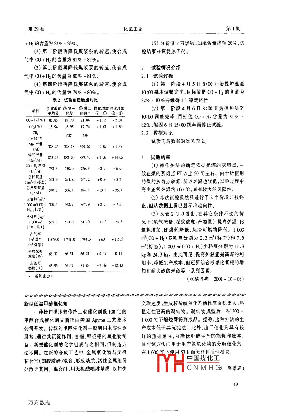 第29卷化肥工業(yè)第1期德士古氣化爐的提溫操作金剛張濤(山東省兗礦魯南化肥廠滕州277527)摘要通過更換煤種使生產(chǎn)消耗得到了大幅度降低,生產(chǎn)能力得到了較大的捉高,但渣中可燃物較設(shè)計標(biāo)提高了2-3倍。為此進(jìn)行了提高爐溫的試驗,考察渣中可燃物隨爐溫的變化關(guān)系,同時考核不同渣中可然物含量下的氧耗和煤耗。關(guān)鍵詞德士古氣化爐灰渣可燃物操作溫度兗礦魯南化肥廠的德士古氣化裝置自1993本次試驗的主要日的是考察渣屮可燃物隨爐年4月試車以來進(jìn)行了較多的技術(shù)改造,生產(chǎn)能溫的變化關(guān)系,同時考核不同渣中可燃物含量下力由年產(chǎn)8萬t合成氨提高到年產(chǎn)10.7t,生產(chǎn)用的氧耗煤耗ε煤由原來的單一“七五"煤發(fā)展成多礦點混煤。隨1.2試驗原則及注意事項著生產(chǎn)產(chǎn)量的提高、使用煤種的增多,灰渣中可燃(1)本次試驗氧氣流量不變、壓力保持穩(wěn)定物含量也有所升高(表1)。分析其原因,認(rèn)為操在(3.8±0.05)MPa,氧氣純度在9.6%以上,通作爐溫過低是主要因素,因此在200年4月進(jìn)行過逐漸降低煤漿泵轉(zhuǎn)速以提高O/C伯,最終達(dá)到了提高爐溫的試驗工作提溫之目的。表1不同煤種灰渣可燃物含量(2)以合成氣中C+H2的百分含量每降低項1993年194年1995年1996年1998年%為一個階段,每個階段穩(wěn)定運行24h,每個階北i段從8:00開始,氣體分析又增加了9:00和1:00北宿北宿楊落陵≯落2次(原是每個雙點分析1次)(3)爐溫提升應(yīng)緩慢,煤漿泵轉(zhuǎn)速應(yīng)緩慢降燃物)10-1515-202530操作溫1450I400140013501350(4)試驗時應(yīng)嚴(yán)格監(jiān)視合成氣溫度(≤℃)、合成氣成份、支撐板溫度(≤25℃)、爐壁溫度(≤260℃)、甲烷含量、排渣情況等,在上述參1試驗方案的制定數(shù)不出現(xiàn)異常時才能進(jìn)行下一步的試驗,否則試本次系統(tǒng)運行從200年3月11日開始,試驗終止。驗時系統(tǒng)運行穩(wěn)定,各項指標(biāo)已得到優(yōu)化,試驗結(jié)(5)儀表車間應(yīng)保持在線甲烷表的準(zhǔn)確性,果應(yīng)是具有代表性的并每天校驗1次德士古氣化爐高溫?zé)犭娕嫉氖褂脡勖话悴?6)試驗期間灰渣取樣每班2次(原每班1超過1周。本次試驗選在非初始開車階段熱電次),分別在接班后的第三第六小時取樣:煤質(zhì)分偶已不能指示,只能以氣體成份為參考來標(biāo)定爐析室分白班、中班隨時分析,分析結(jié)果及時上報至溫。盡管甲烷含量能較快地反映爐溫,但變化較相關(guān)部門決,受系統(tǒng)其它因素影響較大。CO+H2的百分含(7)試驗期間操作人員應(yīng)真實地記錄工藝參量隨爐溫的升高而降低,雖變化慢一些,但受其它數(shù),認(rèn)真巡回檢查,氣化爐壁溫每2小時用紅外測因素干擾小,爐溫與CO+H2含量的對應(yīng)關(guān)系較溫儀實測1次為確定,再現(xiàn)性較好,所以選定以CO+H的含量1L凵中國煤化工標(biāo)定爐溫CNMHG+H2=83.85%),1.1試驗?zāi)康闹鸩浇档兔簼{泵轉(zhuǎn)速,提高OC值,使合成氣中第29卷化肥工業(yè)第期+H2的含量為8%-83%c(5)分析渣中可燃物,如果含量降至20%,試(2)第二階段再降低煤漿泵的轉(zhuǎn)速,使合成驗結(jié)束并恢復(fù)原工況氣中CO0+H2的含量為81%~82%c(3)第三階段再降低煤漿泵的轉(zhuǎn)速,使合成2試驗情況介紹氣中CO+H2的含量為80%~81%c2.1試驗過程(4)第四階段再降低煤漿泵的轉(zhuǎn)速,使合成(1)第一階段4月5日8:00開始提爐溫至氣中CO+H2的含量為79%~80%。10:00基本調(diào)整完畢,目標(biāo)值是CO+H2的含量為2試驗前后數(shù)據(jù)對比82%~83%并維持2h穩(wěn)定運行項日①試驗前②第一③第二同比增加同比增加(2)第二階段4月6日8:00開始提爐溫至段C0+H(%)83.8582.708184-1.15-2.0110:00調(diào)整完畢,目標(biāo)值CO+H含量為81%O2(%)159416.9517.74+1.01+1.8082%,但因6日15:00跳車而停止試驗2.2數(shù)據(jù)對比H2產(chǎn)量試驗前后數(shù)據(jù)對比見表2t/d)3825328.18329.62-007+1.37煤氣產(chǎn)量km/d873.35882,70887,40+935+14.053試驗結(jié)果CO+H產(chǎn)量0726.3(1)操作爐溫的確定依據(jù)是煤的灰熔點,般在煤的灰熔點FT以上50℃左右。由于所使用263.9264.8267.2+0.9+3.3的煤的灰熔點較低,所以爐溫也較低,試驗過程中總投煤漿量520.2506,7494.5高出正常爐溫約100℃,具有較大的風(fēng)險性比氧耗[m3(2)本次試驗雖然只進(jìn)行了2個階段即被終0m3(CO+360.436273679+23+75止,但從數(shù)據(jù)上看已顯示出趨向性H2)標(biāo)態(tài)]3)從表2可以看出,在其它條件不變的情565.3554.0541.0.3-24.3況下(氧氣流量、煤漿濃度、產(chǎn)氨量),提高爐溫,比(CO+H: )氧耗增加,比煤耗降低,灰渣可燃物降低ε100m3煤氣1679.01742.0179.5+63+115.5m3(CO+H2)多耗氧分別為23m3(標(biāo)態(tài))和75m煤漿)標(biāo)態(tài)),1000m3(C0+H2)少耗煤分別為1l3平均煤漿濃度(66,326.5166.21+0.19-0.1lkg和24-.3kg。由此可見,提高爐溫能提高煤的利灰渣可燃物(袋)439364731.83-749-12.13用率,降低生產(chǎn)成本,但還要綜合考慮比氧耗的增加和耐火磚的壽命等一系列因素折算成24h收稿日期001-10-08)心必必必必必分心辦必必辦?、诒乇丌谵k價命必必必必分必必必必②分分必分新型低溫甲醇催化劑交聯(lián)速度,生成較傳統(tǒng)催化劑活性表面積更大、熱種操作溫度較鉸傳統(tǒng)工業(yè)催化劑低100℃的穩(wěn)定性更高的凝結(jié)物。凝結(jié)物成型后,在300甲醇合成催化劑目前正由美國 Apron工藝技術(shù)100℃下