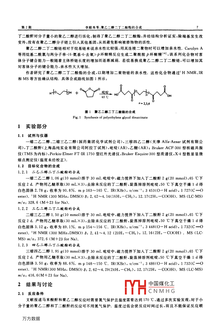 第22卷第2期中國科技核心期刊2011年3月CHEMICAL RESEARCHhxyj@henu.edu.cn聚乙二醇二丁二酸酯的合成李殿秀13,袁保重2…3,馬金飛13,王平安3,邱禎13,代本才3,趙永德(1.河南大學化學化工學院,河南開封475004;2.河南工業(yè)大學化學化工學院,河南鄭州4500013.河南省科學院化學研究所,河南鄭州450002)摘要:聚乙二醇在藥物合成上有很廣泛的用途,但其端羥基的活性相對較低,直接應用受到限制.若將羥基活化為羧基則可以擴大其應用范圍;尤其是在合成二聚物時,將疏水鏈換成親水的聚乙二醇二丁二酸酯鏈可以增加橋鏈的親水性,為此,以聚乙二醇、丁二酸酐為反應物,以吡啶為溶劑,分別合成了一縮二乙二醇二丁二酸酯二縮三乙二醇二丁二酸酯、三縮四乙二醇二丁二酸酯關鍵詞:聚乙二醇;丁二酸酐;吡啶;合成中圖分類號:O623.2文獻標志碼:A文章編號:1008-1011(2011)02-0006-03Synthesis of polyethylene glycol disuccinateLI Dian-xiu" 2, YUAN Bao-zhong MA Jin-fei, WANG Ping-an.3QIU Zhen, DAI Ben-cai, ZHAO Yong-de(1. College of Chemistry and Chemical Engineering, Henan University, Kaifeng 475004, Henan, China2. College of Chemistry and Chemical Engineering, Henan Polytechnical University, Zhengzhou 450001, Henan, China3. Institute of Chemistry, Henan Academy of Sciences, Zhengzhou 450002, Henan, China)Abstract: Polyethylene glycol (PEG) is widely applied to synthesize drug. However, its directapplication is limited due to low activity of terminal hydroxyl groups. This means that the application field of Peg can be extended under the condition that the hydroxyl groups are conver-ted to active carboxyl groups, Particularly, it is feasible to enhance the bridge chain's hydrophilicity when substituting hydrophobic chain with hydrophilic chain during the synthesis of thepolymers. Therefore, diethylene disuccinate, triethylene disuccinate and tetraethylene disucci-nate were synthesized by using PEG and succinic anhydride as the starting matKeywords: polyethylene glycol; succinic anhydride; pyridine; synthesis聚乙二醇作為一種兩親性聚合物既可以溶于水,又可溶于大多數(shù)有機溶劑具有生物相容性好、性質(zhì)穩(wěn)定、無副作用、免疫原性低等特點,當聚乙二醇偶聯(lián)到藥物分子或藥物表面時,可以將許多優(yōu)異性能賦予被修飾的物質(zhì),改變它們在水溶液中的生物分配行為和溶解性,在其修飾的藥物周圍產(chǎn)生空間屏障,減少藥物的酶解,避免在腎臟的代謝中很快消除,并使藥物能被免疫系統(tǒng)的細胞識別.聚乙二醇常用來修飾蛋白質(zhì)、多肽、脂質(zhì)體和小分子有機物等藥物材料.聚乙二醇端基是反應活性較低的羥基,只能在較激烈的條件下與其他基團發(fā)生反應,易破壞被修飾物,實際應用時常需先進行活化.聚乙二醇傳統(tǒng)活化方法有氧化酯化法等口.由于羧酸的羧基化學性質(zhì)比較活潑,可以轉(zhuǎn)變?yōu)轷ヵ0孵B群退狒纫幌盗谢衔?所以在合成上用途很廣.把聚乙二醇活化為羧基在合成上具有重要應用意的一元物酸的反應非常多元羧酸的反應相對少些-8,二元羧酸中有兩個可解離的氫,中國煤化工此二元羧酸作為聚體的中間物應用前景非常廣,文獻報道用丁二酸酐和聚CNMHG9),本文作者采用收稿日期:2010-11-22.者簡介:李殿秀(1979-)男碩士生,主要從事膽酸和環(huán)糊精術生物研究.E-mail:dianxiul@163.com李殿秀等;聚乙二醇二丁二酸酯的合成丁二酸酐對分子量小的聚乙二醇進行活化,制得了聚乙二醇二丁二酸酯,并經(jīng)結(jié)構分析證實,除端基發(fā)生改變外,沒有在聚乙二醇分子鏈上引入其他基團,從而避免影響被修飾物的活性聚乙二醇二丁二酸鏈相對于烷基鏈來說親水性比較強,用其連接二聚物時可以增加親水性. Carolyn A等用烷基二酰氯與兩分子單(6氨基6去氧)P環(huán)糊精反應生成二聚酰胺環(huán)糊精,該系列化合物對客體分子鍵合能力一般隨著主體橋鏈長度的增加而逐漸減弱.若烷基換成聚乙二醇二丁二酸鏈,可以增加其對客體分子的鍵合能力,親水性大大增加作者研究了聚乙二醇酸酯的合成,以期增加二聚物鏈的親水性,這些化合物通過HNMR、IR和MS等方法確認結(jié)構.具體合成路線如圖1所示65℃圖1聚乙二醇二丁二酸酯的合成Fig. 1 Synthesis of polyethylene glycol disuccinate1實驗部分1.1試劑與儀器一縮二乙二醇、二縮三乙二醇(國藥集團化學試劑公司),三縮四乙二醇(天津 Alfa-Aesar試劑有限公司),丁二酸酐(上海晶純實業(yè)有限公司阿拉丁試劑)吡啶(AR),乙醚(AR); Bruker ace-300型核磁共振儀(TMS為內(nèi)標), Perkin-Elmer FT-IR1750型紅外光譜儀, Bruker Esquire300型質(zhì)譜儀,X-4型數(shù)顯顯微熔點測定儀(溫度未經(jīng)校正)1.2目標化合物的合成1.2.1二乙二醇二丁二酸酯的合成縮二乙二醇1.06g(10mmol)溶于30mL吡啶中,磁力攪拌下加入丁二酸酐2g(20mmol),65C下反應2d.產(chǎn)物用乙醚萃取(30mL×3),去除未反應的丁二酸酐,旋蒸掉溶劑吡啶,50℃下真空干燥1d得白色固體2.78g,收率為90.8%,mp163~165℃.IR(KBr),v/cm:3453(O- H acid),1727(C=Oester).H NMR(300 MHz, DMSO)8:2.42-4.14(16H,-CH2), 12 17(2H, -COOH). MS (LC-MS)m/z:328.6(M+23 for Na)1.2.2三乙二醇二丁二酸酯的合成二縮三乙二醇1.50g(10mmol)溶于30mL吡啶中,磁力攪拌下加入丁二酸酐2g(20mmol),65℃下反應2d.產(chǎn)物用乙醚萃取(30mL×3),去除未反應的丁二酸酐,旋蒸掉溶劑吡啶,50℃下真空干燥1d得白色固體3.12g,收率為89.1%.mp154~156℃.IR(KBr),vcm-:3448(O- H acid),1732(C=0ester).H NMR(300 MHz, DMSO)&: 2. 41-4. 12(20H, -CH2 ), 12 16(2H, -COOH). MS (LCMS)m/z: 372.6(M+23 for Na)1.2.3四