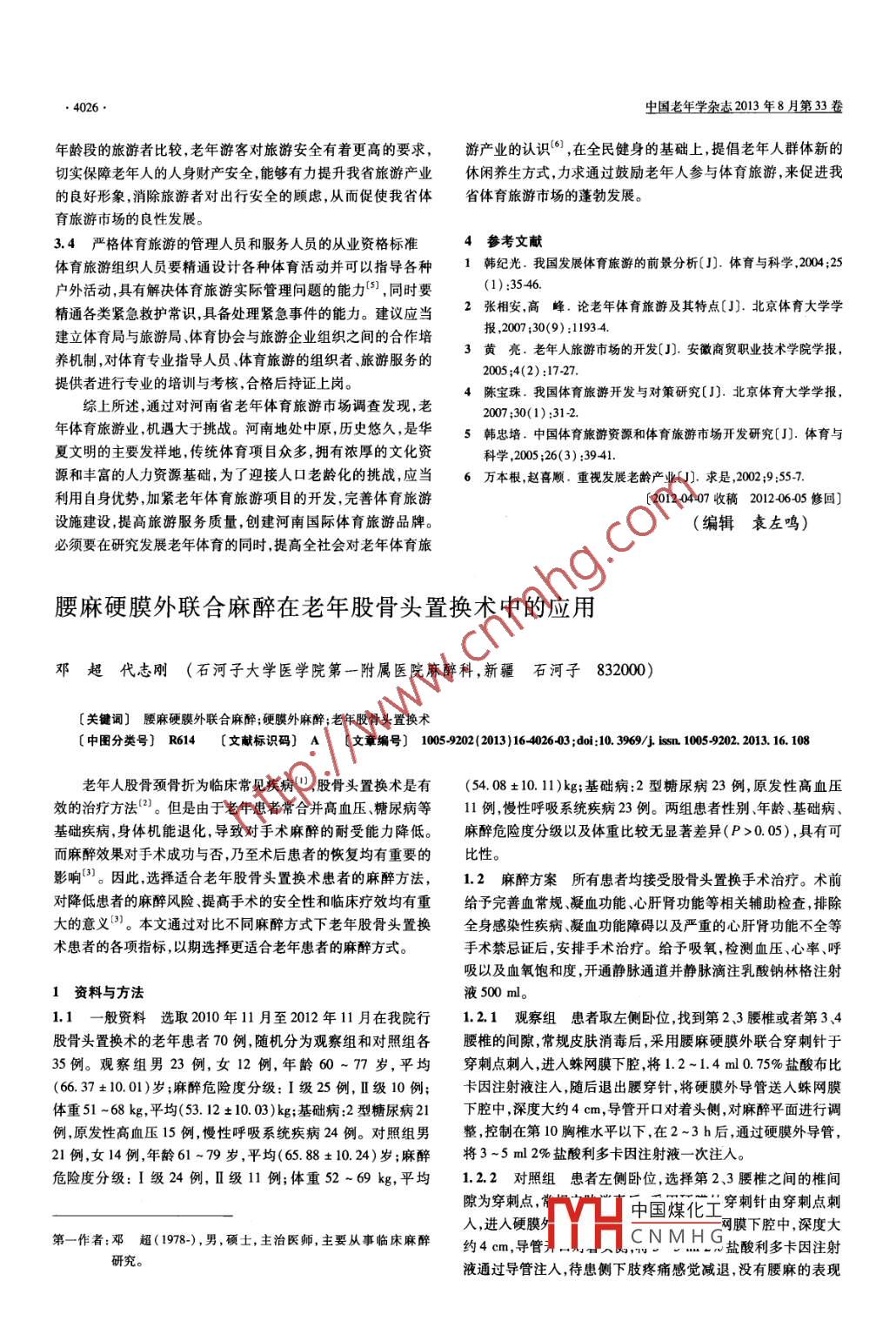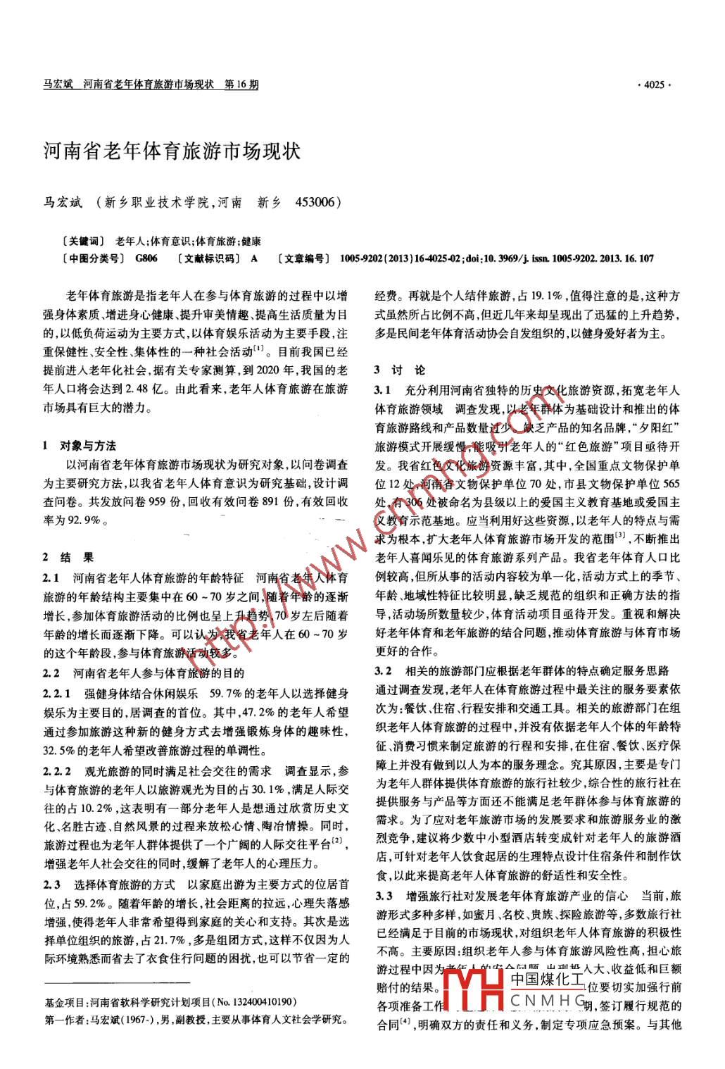 馬宏斌河南省老年體育 旅游市場現(xiàn)狀第16期河南省老年體育旅游市場現(xiàn)狀馬宏斌(新鄉(xiāng)職業(yè)技術學院,河南 新鄉(xiāng)453006)[關鍵詞]老年人;體育 意識;體育旅游;健康[中圖分類號] G806 [ 文獻標識碼] A [ 文章編號] 105-9202 (2013) 16 4025 02 ;doi:10.3969/j isn. 1005-9202. 2013. 16. 107老年體育旅游是指老年人在參與體育旅游的過程中以增經(jīng)費。再就是個人結伴旅游,占19. 1% ,值得注意的是,這種方強身體素質、增進身心健康、提升審美情趣、提高生活質量為目式雖然所占比例不高,但近幾年來卻呈現(xiàn)出了迅猛的上升趨勢,的,以低負荷運動為主要方式,以體育娛樂活動為主要手段,注多是民間老年體育活動協(xié)會自發(fā)組織的,以健身愛好者為主。重保健性、安全性、集體性的一種社會活動"。 目前我國已經(jīng)提前進入老年化社會,據(jù)有關專家測算,到2020年,我國的老3討論年人口將會達到2. 48億。由此看來,老年人體育旅游在旅游3.1充分利用河南省 獨特的歷史文化旅游資源,拓寬老年人市場具有巨大的潛力。體育旅游領域調查發(fā)現(xiàn), 以老年群體為基礎設計和推出的體育旅游路線和產(chǎn)品數(shù)量過少。缺乏產(chǎn)品的知名品牌,“夕陽紅”1對象與方法旅游模式開展緩慢,能吸引老年人的“紅色旅游”項目亟待開以河南省老年體育旅游市場現(xiàn)狀為研究對象,以問卷調查發(fā)。我省紅色文化旅游資源豐富,其中,全國重點文物保護單為主要研究方法,以我省老年人體育意識為研究基礎,設計調位12處,河南省文物保護單位70處,市縣文物保護單位565查問卷。共發(fā)放問卷959份,回收有效問卷891份,有效回收處,有306處被命名為縣級以上的愛國主義教育基地或愛國主率為92.9%。義教育示范基地。應當利用好這些資源,以老年人的特點與需求為根本,擴大老年人體育旅游市場開發(fā)的范圍(3),不斷推出2結果老年人喜聞樂見的體育旅游系列產(chǎn)品。我省老年體育人口比2.1河南省 老年人體育旅游的年齡特征河南省老年人體 育例較高,但所從事的活動內(nèi)容較為單一化, 活動方式上的季節(jié)、旅游的年齡結構主要集中在60 ~70歲之間,隨著年齡的逐漸年齡、地域性特征比較明顯,缺乏規(guī)范的組織和正確方法的指增長,參加體育旅游活動的比例也呈上升趨勢,70歲左后隨著導,活動場所數(shù)量較少,體育活動項目亟待開發(fā)。重視和解決年齡的增長而逐漸下降。可以認為,我省老年人在60~70歲好老年體育和老年旅游的結合問題推動體育旅游與體育市場的這個年齡段,參與體育旅游活動較多。更好的合作。2.2河南省老年人參 與體育旅游的目的3.2相關的旅游部門應根據(jù) 老年群體的特點確定服務思路2.2.1強健身體結合休閑娛樂 59. 7%的老年人以選擇健身通過調查發(fā)現(xiàn),老年人在體育旅游過程中最關注的服務要素依娛樂為主要目的,居調查的首位。其中,47.2%的老年人希望次為:餐飲、住宿、行程安排和交通工具。相關的旅游部門在組通過參加旅游這種新的健身方式去增強鍛煉身體的趣味性,織老年人體育旅游的過程中,并沒有依據(jù)老年人個體的年齡特32.5%的老年人希望改善旅游過程的單調性。征、消費習慣來制定旅游的行程和安排,在住宿、餐飲、醫(yī)療保2.2.2觀光旅游的同時滿足社 會交往的需求調查顯示,參障上并沒有做到以人為本的服務理念。究其原因,主要是專門與體育旅游的老年人以旅游觀光為目的占30. 1% ,滿足人際交為老年人群體提供體育旅游的旅行社較少,綜合性的旅行社在往的占10.2% ,這表明有一部分老年人是想通過欣賞歷史文提供服務與產(chǎn)品等方面還不能滿足老年群體參與體育旅游的化、名勝古跡.自然風景的過程來放松心情、陶冶情操。同時,需求。為了應對老年旅游市場的發(fā)展要求和旅游服務業(yè)的激旅游過程也為老年人群體提供了一個廣闊的人際交往平臺(2) ,烈競爭,建議將少數(shù)中小型酒店轉變成針對老年人的旅游酒增強老年人社會交往的同時,緩解了老年人的心理壓力。店,可針對老年人飲食起居的生理特點設計住宿條件和制作飲2.3選擇體育 旅游的方式以家庭出游 為主要方式的位居首食,以此來提高老年人體育旅游的舒適性和安全性。位,占59.2%。隨著年齡的增長,社會距離的拉遠,心理失落感3.3增強旅行社對發(fā)展 老年體育旅游產(chǎn)業(yè)的信心當前,旅增強,使得老年人非常希望得到家庭的關心和支持。其次是選游形式多種多樣,如蜜月、名校、貴族探險旅游等,多數(shù)旅行社擇單位組織的旅游,占21. 7% ,多是組團方式,這樣不僅因為人已經(jīng)滿足于目前的市場現(xiàn)狀,對組織老年人體育旅游的積極性際環(huán)境熟悉而省去了衣食住行問題的困擾,也可以節(jié)省- -定的不高。主要原因:組織老年人參與體育旅游風險性高,擔心旅游過程中因為當年上的中A要出兜奶人大、收益低和巨額賠付的結果。中國煤化工.位要切實加強行前基金項目:河南省軟科學研究計劃項目(Na.132400410190)各項準備工作THCNM H G明,簽訂履行規(guī)范的第一作者:馬宏斌( 1967-) ,男,副教授,主要從事體育人文社會學研究。合同(4,明確雙方的責任和義務,制定專項應急預案。與其他. 4026 .中國老年學雜志2013年8月第33卷年齡段的旅游者比較,老年游客對旅游安全有著更高的要求,游產(chǎn)業(yè)