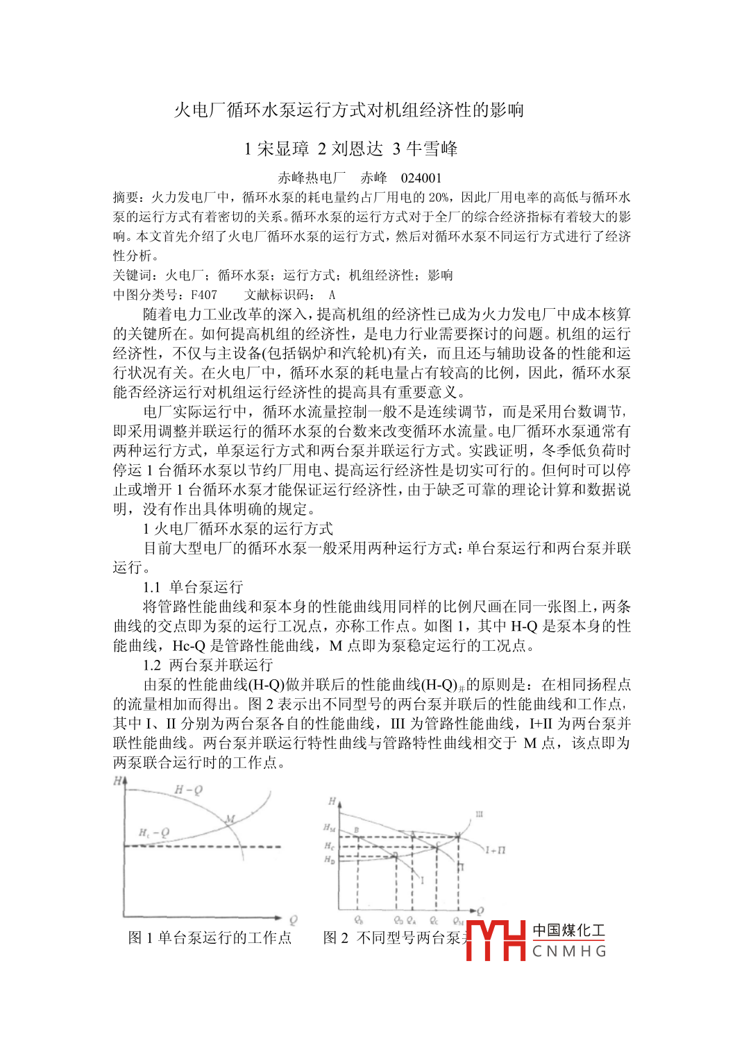 火電廠循環(huán)水泵運(yùn)行方式對(duì)機(jī)組經(jīng)濟(jì)性的影響1宋顯璋2劉恩達(dá)3牛雪峰赤峰熱電廠赤峰 024001摘要:火力發(fā)電廠中,循環(huán)水泵的耗電量約占廠用電的20%,因此廠用電率的高低與循環(huán)水泵的運(yùn)行方式有著密切的關(guān)系。循環(huán)水泵的運(yùn)行方式對(duì)于全廠的綜合經(jīng)濟(jì)指標(biāo)有著較大的影響。本文首先介紹了火電廠循環(huán)水泵的運(yùn)行方式,然后對(duì)循環(huán)水泵不同運(yùn)行方式進(jìn)行了經(jīng)濟(jì)性分析。關(guān)鍵詞:火電廠;循環(huán)水泵;運(yùn)行方式;機(jī)組經(jīng)濟(jì)性;影響中圖分類號(hào): F407文獻(xiàn)標(biāo)識(shí)碼: A隨著電力工業(yè)改革的深入,提高機(jī)組的經(jīng)濟(jì)性已成為火力發(fā)電廠中成本核算的關(guān)鍵所在。如何提高機(jī)組的經(jīng)濟(jì)性,是電力行業(yè)需要探討的問題。機(jī)組的運(yùn)行經(jīng)濟(jì)性,不僅與主設(shè)備(包括鍋爐和汽輪機(jī))有關(guān),而且還與輔助設(shè)備的性能和運(yùn)行狀況有關(guān)。在火電廠中,循環(huán)水泵的耗電量占有較高的比例,因此,循環(huán)水泵能否經(jīng)濟(jì)運(yùn)行對(duì)機(jī)組運(yùn)行經(jīng)濟(jì)性的提高具有重要意義。電廠實(shí)際運(yùn)行中,循環(huán)水流量控制一-般不是連續(xù)調(diào) 節(jié),而是采用臺(tái)數(shù)調(diào)節(jié),即采用調(diào)整并聯(lián)運(yùn)行的循環(huán)水泵的臺(tái)數(shù)來改變循環(huán)水流量。電廠循環(huán)水泵通常有兩種運(yùn)行方式,單泵運(yùn)行方式和兩臺(tái)泵并聯(lián)運(yùn)行方式。實(shí)踐證明,冬季低負(fù)荷時(shí)停運(yùn)1臺(tái)循環(huán)水泵以節(jié)約廠用電、提高運(yùn)行經(jīng)濟(jì)性是切實(shí)可行的。但何時(shí)可以停止或增開1臺(tái)循環(huán)水泵才能保證運(yùn)行經(jīng)濟(jì)性,由于缺乏可靠的理論計(jì)算和數(shù)據(jù)說明,沒有作出具體明確的規(guī)定。1火電廠循環(huán)水泵的運(yùn)行方式目前大型電廠的循環(huán)水泵一般采用兩種運(yùn)行方式:單臺(tái)泵運(yùn)行和兩臺(tái)泵并聯(lián)運(yùn)行。1.1 單臺(tái)泵運(yùn)行將管路性能曲線和泵本身的性能曲線用同樣的比例尺畫在同--張圖上,兩條曲線的交點(diǎn)即為泵的運(yùn)行工況點(diǎn),亦稱工作點(diǎn)。如圖1,其中H-Q是泵本身的性能曲線,Hc_Q是管路性能曲線,M點(diǎn)即為泵穩(wěn)定運(yùn)行的工況點(diǎn)。1.2兩臺(tái)泵并聯(lián)運(yùn)行由泵的性能曲線(H-Q)做并聯(lián)后的性能曲線(H-Q)#的原則是:在相同揚(yáng)程點(diǎn).的流量相加而得出。圖2表示出不同型號(hào)的兩臺(tái)泵并聯(lián)后的性能曲線和工作點(diǎn),其中I、II分別為兩臺(tái)泵各自的性能曲線,II 為管路性能曲線,I+II 為兩臺(tái)泵并聯(lián)性能曲線。兩臺(tái)泵并聯(lián)運(yùn)行特性曲線與管路特性曲線相交于M點(diǎn),該點(diǎn)即為兩泵聯(lián)合運(yùn)行時(shí)的工作點(diǎn)。H4.. H-QHuH.-Q1+1中國(guó)煤化工圖1單臺(tái)泵運(yùn)行的工作點(diǎn)圖2不同型號(hào)兩臺(tái)泵MYHCNMH G2循環(huán)水泵不同運(yùn)行方式下的經(jīng)濟(jì)性分析2.1循環(huán)水系統(tǒng)技術(shù)概況某火電廠機(jī)組是300MW亞臨界機(jī)組,其循環(huán)水泵型號(hào)為“湘江56-23A",是動(dòng)葉不可調(diào)的定速斜流泵,因此無法通過改變動(dòng)葉角度或者調(diào)整電機(jī)轉(zhuǎn)速的方式來改變循環(huán)水泵的流量,只能通過啟停循環(huán)水泵改變循環(huán)水泵的臺(tái)數(shù)來調(diào)整流量。其循環(huán)水系統(tǒng)設(shè)計(jì)運(yùn)行方式為:夏季及春秋季運(yùn)行時(shí),一機(jī)配兩 臺(tái)循環(huán)水泵,單元制運(yùn)行;冬季運(yùn)行時(shí),兩機(jī)配三臺(tái)循環(huán)水泵,擴(kuò)大單元制運(yùn)行;嚴(yán)冬季節(jié)或低負(fù)荷運(yùn)行時(shí),一機(jī)配一 臺(tái) 循環(huán)水泵。2.250%負(fù)荷時(shí)單臺(tái)運(yùn)行與兩臺(tái)并聯(lián)運(yùn)行的經(jīng)濟(jì)性比較循泵的Q_G曲線具有一個(gè)普遍性的特點(diǎn):通常往流量增大方向經(jīng)過最高效率點(diǎn)后,斜率逐漸增加,呈陡降型,即在這一范圍內(nèi),即使流量變化不大,也會(huì).引起效率較大的下降。而兩臺(tái)泵并聯(lián)后的Q-H曲線比單臺(tái)泵的Q-H曲線要平坦得多,同時(shí)由于管路的阻力損失與流量是近似成平方關(guān)系的,因此管路特性曲線是一條較陡的近似二次拋物曲線,對(duì)應(yīng)在Q-H曲線上,Q井與Q .就相距較遠(yuǎn)。由于電廠選泵的結(jié)果住住是使并聯(lián)工作點(diǎn)處的流量略大于設(shè)計(jì)流量,即Q>Q設(shè)計(jì),而在減少泵運(yùn)行臺(tái)數(shù)后,因凝汽器和管道為阻力減小,每臺(tái)泵的揚(yáng)程降低。流量增大,工作點(diǎn)進(jìn)-步向大流量方向移動(dòng),效率進(jìn)一步降低。由于阻力特性曲線較陡,使每臺(tái)泵在并聯(lián)時(shí)和單臺(tái)時(shí)的流量相差較大(或者說工作點(diǎn)相距較遠(yuǎn)),即單臺(tái)時(shí)的效率要下降得更多些。最后,因在這一流量區(qū)的Q_G曲線呈陡降型,更加劇了單臺(tái)運(yùn)行時(shí)效率值的減小。這三個(gè)因素的綜合結(jié)果即如圖3所示。即導(dǎo)致泵單臺(tái)運(yùn)行時(shí)的