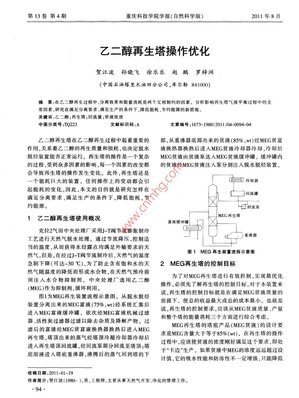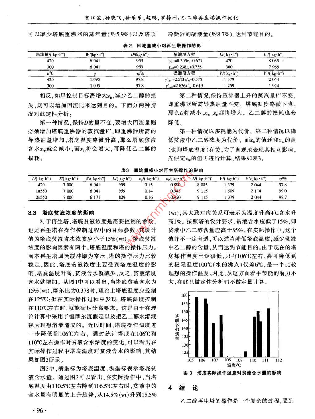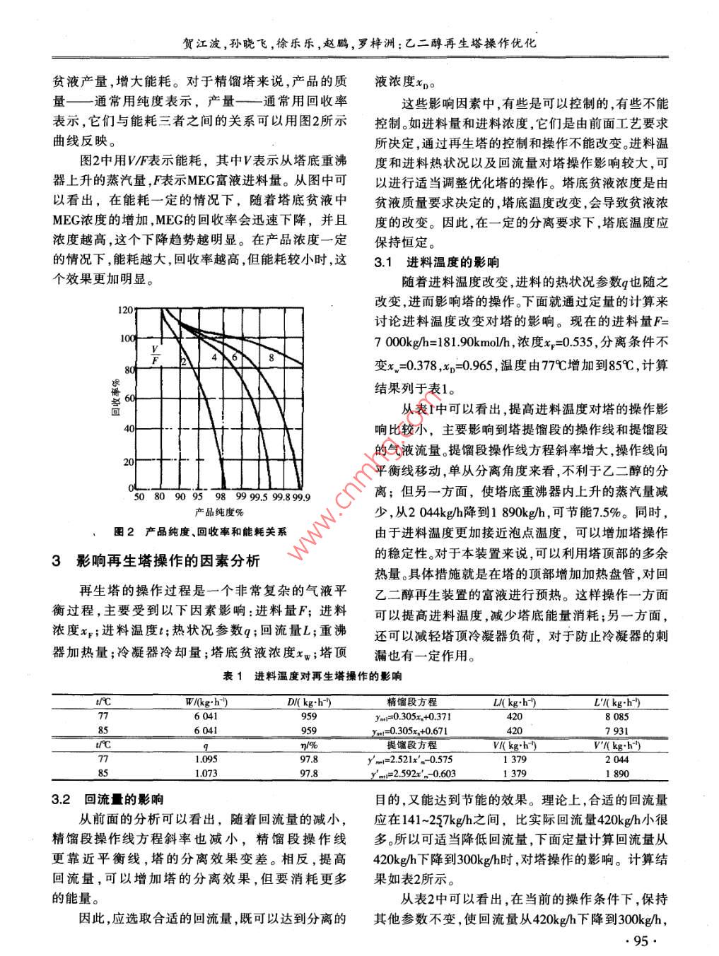 第13卷第4期重慶科技學(xué)院學(xué)報(bào)(自然科學(xué)版)011年8月乙二醇再生塔操作優(yōu)化賀江波孫曉飛徐樂樂趙鵬羅梓洲(中國石油塔里木油田分公司,庫爾勒8410000摘要:在乙二醇再生過程中,分離效果和能量消耗是兩個(gè)互相制約的因素。分析影響再生塔氣液平衡過程中的主要因素,研究在滿足分離要求、滿足生產(chǎn)的條件下,降低能耗、節(jié)約能源的新措施。關(guān)鍵詞:乙二醇;再生塔;回流量;貧液濃度中圖分類號:TQ223文獻(xiàn)標(biāo)識碼:A文章編號:1673-1980(2011)040094-04乙二醇再生塔在乙二醇再生過程中起著重要的部,從重沸器底部出來的貧液(85%,wt)經(jīng)MEG貧富作用,關(guān)系著乙二醇的再生質(zhì)量和損耗,也決定脫水液換熱器換熱后進(jìn)入MEG貧液冷卻器冷卻,冷卻后脫烴裝置能否正常運(yùn)行。再生塔的操作是一個(gè)復(fù)雜MEG貧液由貧液泵送人MEG貧液緩沖罐。緩沖罐內(nèi)的過程,受到眾多因素的影響,每一個(gè)因素的改變都的貧液經(jīng)MEG貧液注入泵分別注入脫水脫烴裝置。會(huì)導(dǎo)致再生塔的操作發(fā)生變化。此外,再生塔還是個(gè)能耗巨大的裝置,任何操作上的變動(dòng)都會(huì)引年D冷卻器起能耗的變化。因此,本文的目的就是研究怎樣在回流罐滿足分離要求、滿足生產(chǎn)的條件下,降低能耗,節(jié)約能源。回流泵1乙二醇再生塔使用概況MEG再生塔富液緩沖罐克拉2氣田中央處理廠采用J_T閥節(jié)流膨脹制冷工藝進(jìn)行天然氣脫水處理。通過節(jié)流降壓,控制適重沸器當(dāng)?shù)臏囟?從而獲得水烴露點(diǎn)均滿足外輸要求的天然氣。但是,在經(jīng)過J-T閥節(jié)流制冷后,天然氣的溫度圖1MEG再生裝置流程示意圖急劇下降(可達(dá)-30℃),為了防止含有飽和水的天2MEG再生塔的控制目標(biāo)然氣隨溫度的降低而形成水合物,在天然氣預(yù)冷前須注入水合物抑制劑,中央處理廠選用乙二醇為了對MEG再生塔進(jìn)行有效控制,實(shí)現(xiàn)最優(yōu)化(MEG)作為抑制劑,循環(huán)利用。操作,必須先了解再生塔的控制目標(biāo)。對于本裝置來圖1為MEG再生裝置流程示意圖。從脫水脫烴說,再生塔的控制目標(biāo)就是在滿足MEG貧液質(zhì)量的裝置分離出來的MEG富液(75%,w)經(jīng)系統(tǒng)匯集后前提下,使總的收益最大或總的成本最小。也就是進(jìn)入MEG富液緩沖罐,依次經(jīng)MEG富液機(jī)械過濾說,再生塔的控制要求,應(yīng)該從MEG貧液質(zhì)量、產(chǎn)量器、活性炭過濾器過濾以除去雜質(zhì)及降解產(chǎn)物。和整個(gè)塔的能量消耗三個(gè)方面進(jìn)行綜合考慮濾后的宮液經(jīng)MEG貧富液換熱器換熱后進(jìn)入MEGMEG再生塔的塔底產(chǎn)品(MFG貧液)的設(shè)計(jì)要再生塔,塔頂出來的蒸氣經(jīng)塔頂冷凝冷卻器冷卻后求是MEG含量大于等于85%(w),在再生塔的操作進(jìn)人再生塔頂回流罐經(jīng)回流泵部分回流至塔頂;塔過程中,應(yīng)該使貧液的濃度剛好滿足這個(gè)要求,即處底溶液進(jìn)入塔底重沸器,沸騰后的蒸氣回到塔的下卡邊”生產(chǎn)。如果貧液中MEG的濃度遠(yuǎn)遠(yuǎn)超過設(shè)計(jì)值,它的吸水性能和防凍性不一定增強(qiáng),只能降低收稿日期:2011-01-19作者簡介:賀江波(1980-),男,工程師,主要從事天然氣開發(fā)、凈化的管理工作。賀江波,孫曉飛,徐樂樂,趙鵬,羅梓洲:乙二醇再生塔操作優(yōu)化貧液產(chǎn)量,增大能耗。對于精餾塔來說,產(chǎn)品的質(zhì)液濃度x。量——通常用純度表示,產(chǎn)量—通常用回收率這些影響因素中,有些是可以控制的,有些不能表示,它們與能耗三者之間的關(guān)系可以用圖2所示控制。如進(jìn)料量和進(jìn)料濃度,它們是由前面工藝要求曲線反映。所決定,通過再生塔的控制和操作不能改變。進(jìn)料溫圖2中用V/表示能耗,其中ν表示從塔底重沸度和進(jìn)料熱狀況以及回流量對塔操作影響較大,可器上升的蒸汽量,F表示MEG富液進(jìn)料量。從圖中可以進(jìn)行適當(dāng)調(diào)整優(yōu)化塔的操作。塔底貧液濃度是由以看出,在能耗一定的情況下,隨著塔底貧液中貧液質(zhì)量要求決定的塔底溫度改變,會(huì)導(dǎo)致貧液濃MEG濃度的增加,MEG的回收率會(huì)迅速下降,并且度的改變。因此,在一定的分離要求下,塔底溫度應(yīng)濃度越高,這個(gè)下降趨勢越明顯。在產(chǎn)品濃度一定保持恒定的情況下,能耗越大,回收率越高,但能耗較小時(shí),這3.1進(jìn)料溫度的影響個(gè)效果更加明顯。隨著進(jìn)料溫度改變,進(jìn)料的熱狀況參數(shù)q也隨之改變,進(jìn)而影響塔的操作。下面就通過定量的計(jì)算來討論進(jìn)料溫度改變對塔的影響?,F(xiàn)在的進(jìn)料量F=7000kg/h=18190kmol/h,濃度x=0.535,分離條件不變x=0.378,x12=0.965,溫度由77℃增加到85℃,計(jì)算結(jié)果列于表1從表1中可以看出,提高進(jìn)料溫度對塔的操作影響比較小,主要影響到塔提餾段的操作線和提餾段的氣液流量。提餾段操作線方程斜率增大,操作線向平衡線移動(dòng),單從分離角度來看,不利于乙二醇的分50809095989999.599.8999離;但另一方面,使塔底重沸器內(nèi)上升的蒸汽量減產(chǎn)品純度%少,從2044kgh降到1890kg/h,可節(jié)能7.5%。同時(shí)圖2產(chǎn)品純度、回收率和能耗關(guān)系由于進(jìn)料溫度更加接近泡點(diǎn)溫度,可以增加塔操作3影響再生塔操作的因素分析的