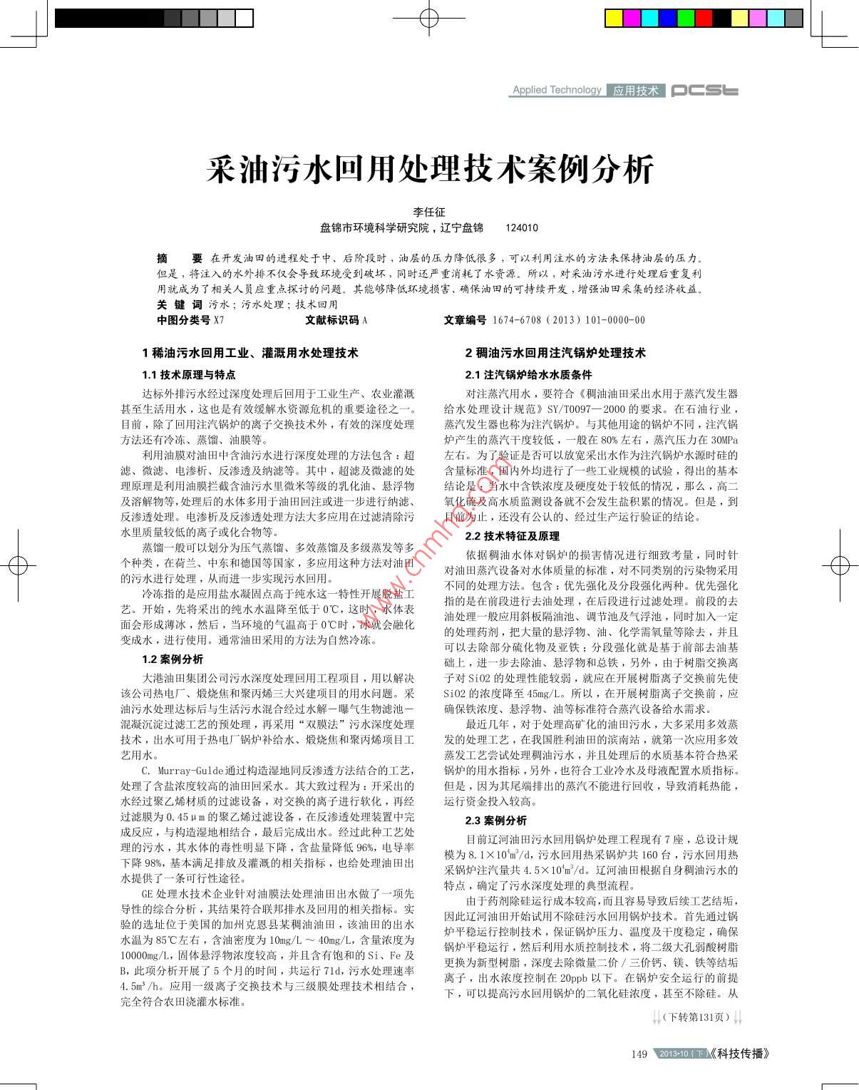 一φ-Applied Technology_應(yīng)用技術(shù)PCSb采油污水回用處理技術(shù)案例分析李任征.盤錦市環(huán)境科學(xué)研究院,遼寧盤錦124010商要在開發(fā)油田的進(jìn)程處于中、后階段時(shí),油層的壓力降低很多,可以利用注水的方法來保持油層的壓力。但是,將注入的水外排不僅會(huì)導(dǎo)致環(huán)境受到破壞,同時(shí)還嚴(yán)重消耗了水資源。所以,對(duì)采油污水進(jìn)行處理后重復(fù)利用就成為了相關(guān)人員應(yīng)重點(diǎn)探討的問題。其能夠降低環(huán)境損害、確保油田的可持續(xù)開發(fā), 增強(qiáng)油田采集的經(jīng)濟(jì)收益。關(guān)鍵詞污水;污水處理;技術(shù)回用中圖分類號(hào)X7文獻(xiàn)標(biāo)識(shí)碼A文章編號(hào)1674-6708 (2013) 101-0000-001稀油污水回用工業(yè)、灌溉用水處理技術(shù)2稠油污水回用注汽鍋爐處理技術(shù)1.1技術(shù)原理與特點(diǎn)2.1注汽鍋爐給水水質(zhì)條件達(dá)標(biāo)外排污水經(jīng)過深度處理后回用于工業(yè)生產(chǎn)、農(nóng)業(yè)灌溉對(duì)注蒸汽用水,要符合《稠油油田采出水用于蒸汽發(fā)生器甚至生活用水,這也是有效緩解水資源危機(jī)的重要途徑之-一。給水處理設(shè)計(jì)規(guī)范》SY/T0097-2000的要求。在石油行業(yè),目前,除了回用注汽鍋爐的離子交換技術(shù)外,有效的深度處理蒸汽發(fā) 生器也稱為注汽鍋爐。與其他用途的鍋爐不同,注汽鍋方法還有冷凍、蒸餾、油膜等。爐產(chǎn)生的蒸汽干度較低,一般在80%左右,蒸汽壓力在30MPa利用油膜對(duì)油田中含油污水進(jìn)行深度處理的方法包含:超左右。 為了驗(yàn)證是否可以放寬采出水作為注汽鍋爐水源時(shí)硅的患、 微濾、電滲析、反滲透及納濾等。其中,超濾及微濾的處含量標(biāo)準(zhǔn),國(guó)內(nèi)外均進(jìn)行了- -些工業(yè)規(guī)模的試驗(yàn),得出的基本理原理是利用油膜攔截含油污水里微米等級(jí)的乳化油、懸浮物結(jié)論是:當(dāng)水中含鐵濃度及硬度處于較低的情況,那么,高二及溶解物等,處理后的水體多用于油田回注或進(jìn)一步 進(jìn)行納濾、氧化硫及高水質(zhì)監(jiān)測(cè)設(shè)備就不會(huì)發(fā)生鹽積累的情況。但是,到反滲透處理。電滲析及反滲透處理方法大多應(yīng)用在過濾清除污目前為止,還沒有公認(rèn)的、經(jīng)過生產(chǎn)運(yùn)行驗(yàn)證的結(jié)論。水里質(zhì)量較低的離子或化合物等。2.2 技術(shù)特征及原理蒸餾一般可以劃分為壓氣蒸餾、 多效蒸餾及多級(jí)蒸發(fā)等多依據(jù)稠油水體對(duì)鍋爐的損害情況進(jìn)行細(xì)致考量,同時(shí)針個(gè)種類,在荷蘭、中東和德國(guó)等國(guó)家,多應(yīng)用這種方法對(duì)油田對(duì)油田蒸汽設(shè)備對(duì)水體質(zhì)量的標(biāo)準(zhǔn),對(duì)不同類別的污染物采用的污水進(jìn)行處理,從而進(jìn)一- 步實(shí)現(xiàn)污水回用。冷凍指的是應(yīng)用鹽水凝固點(diǎn)高于純水這一-特性開展脫鹽工不同的處理方法。包含:優(yōu)先強(qiáng)化及分段強(qiáng)化兩種。優(yōu)先強(qiáng)化藝。開始,先將采出的純水水溫降至低于0C,這時(shí),水體表指的是在前段進(jìn)行去油處理,在后段進(jìn)行過濾處理。前段的去面會(huì)形成薄冰,然后,當(dāng)環(huán)境的氣溫高于0C時(shí),冰就會(huì)融化油處理一般應(yīng)用斜板隔油池、調(diào)節(jié)池及氣浮池,同時(shí)加入一定的處理藥劑,把大量的懸浮物、油、化學(xué)需氧量等除去,并且變成水,進(jìn)行使用。通常油田采用的方法為自然冷凍??梢匀コ糠至蚧锛皝嗚F:分段強(qiáng)化就是基于前部去油基1.2案例分析礎(chǔ)上,進(jìn)一步去除油、懸浮物和總鐵,另外,由于樹脂交換離大港油田集團(tuán)公司污水深度處理回用工程項(xiàng)目,用以解決.子對(duì)Si02的處理性能較弱,就應(yīng)在開展樹脂離子交換前先使該公司熱電廠、煅燒焦和聚丙烯三大興建項(xiàng)目的用水問題。采Si02的濃度降至45mg/L。所以,在開展樹脂離子交換前,應(yīng)油污水處理達(dá)標(biāo)后與生活污水混合經(jīng)過水解-曝氣生物濾池-確保鐵濃度、懸浮物、油等標(biāo)準(zhǔn)符合蒸汽設(shè)備給水需求。混凝沉淀過濾工藝的預(yù)處理,再采用“雙膜法”污水深度處理最近幾年,對(duì)于處理高礦化的油田污水,大多采用多效蒸技術(shù),出水可用于熱電廠鍋爐補(bǔ)給水、煅燒焦和聚丙烯項(xiàng)目工發(fā)的處理工藝,在我國(guó)勝利油田的濱南站,就第一-次應(yīng)用多效藝用水蒸發(fā)工藝嘗試處理稠油污水,并且處理后的水質(zhì)基本符合熱采c. Murray-Gulde通過構(gòu)造濕地同反滲透方法結(jié)合的工藝,鍋爐的用水指標(biāo),另外,也符合工業(yè)冷水及母液配置水質(zhì)指標(biāo)。處理了含鹽濃度較高的油田回采水。其大致過程為:開采出的但是 ,因?yàn)槠湮捕伺懦龅恼羝荒苓M(jìn)行回收,導(dǎo)致消耗熱能,水經(jīng)過聚乙烯材質(zhì)的過濾設(shè)備,對(duì)交換的離子進(jìn)行軟化,再經(jīng)運(yùn)行資 金投入較高。過濾膜為0. 45 u m的聚乙烯過濾設(shè)備,在反滲透處理裝置中完2.3案例分析成反應(yīng),與構(gòu)造濕地相結(jié)合,最后完成出水。經(jīng)過此種工藝處目前遼河油田污水回用鍋爐處理工程現(xiàn)有7座,總設(shè)計(jì)規(guī)理的污水,