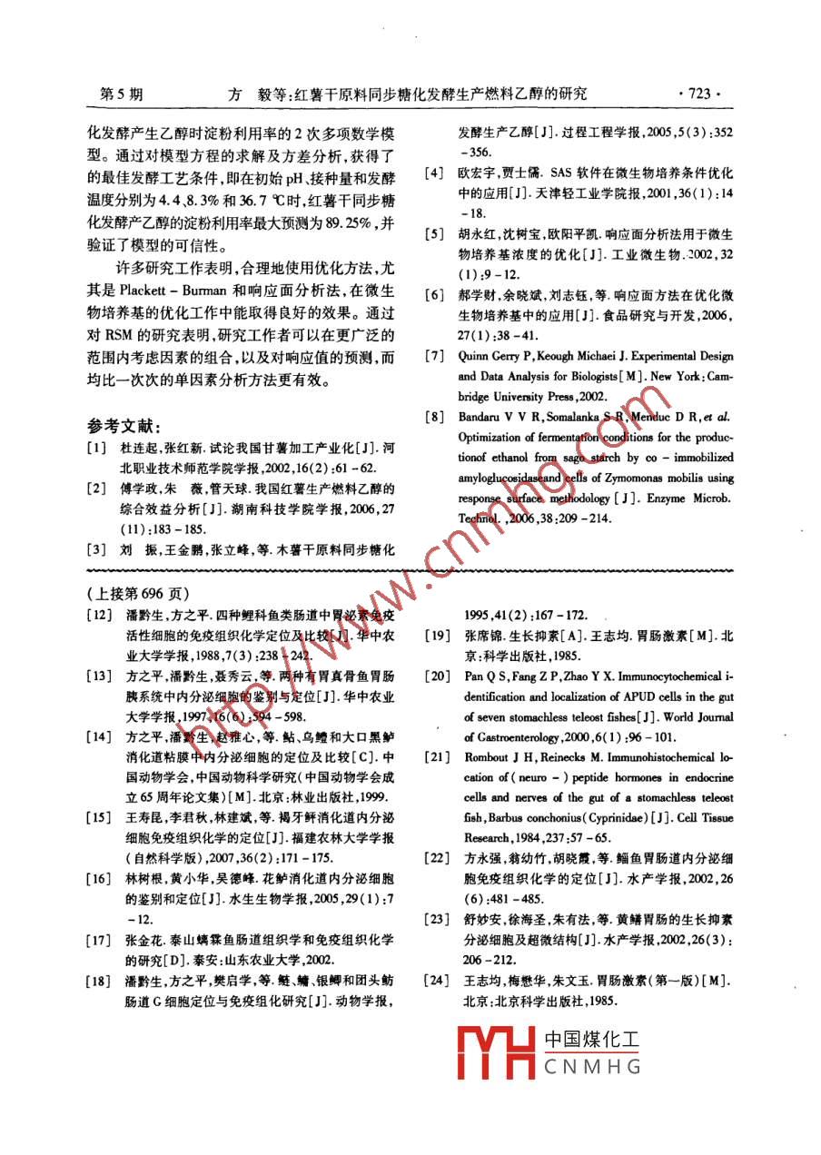 第26卷第5期西科學(xué)Vol. 26 No 52008年10月JIANGXI SCIENCE0ct.2008文章編號:1001-3679(2008)05-0719-05紅薯干原料同步糖化發(fā)酵生產(chǎn)燃料乙醇的研究方毅',印培民2,黃筱萍2(1南昌大學(xué)生命科學(xué)院,江西南昌330031;2.江西省科學(xué)院微生物研究所江西南昌330029)摘要:本研究以紅薯干為原料,用同步糖化發(fā)酵(SSF)生產(chǎn)燃料乙醇的新工藝,應(yīng)用 ackett-Bum_n實驗設(shè)計篩選彩響乙醇發(fā)酵的重要工藝參數(shù),然后通過Bx- Behnken實驗設(shè)計確定各重要工藝參數(shù)的最佳水平。實驗結(jié)果表明,彩響酒精產(chǎn)量的重要參數(shù)是初始pH、接種量和發(fā)酵溫度。優(yōu)化后的最佳工藝條件為初始pH4.4、接種量8.3%,發(fā)酵溫度36.7℃,淀粉利用率達(dá)到89.25%。在此條件下進(jìn)行50L發(fā)酵罐實驗,48h其淀粉利用率達(dá)到89.12%。關(guān)鍵詞紅薯干;同步糖化;然料乙醇;響應(yīng)面法(RSA)中圖分類號:TK6文獻(xiàn)標(biāo)識碼:AProduction of Ethanol by Simultaneous Saccharifictionand Fermentation from Sweet PotatoFANG Yi, YIN Pei-min, HUANG Xiao-ping(1. College of Life Science, Nanchang University, Jiangxi Nanchangnstitute of Microbiology, Jiangxi Academy of Sciences, Jiangxi Nanchang 330029 PRC)Abstract: The production of ethanol from sweet potato by simultaneous saccharification and fermentation(SSF)is presented. In the experiments, the kept parameters influencing ethanol fermentationwere screened out by Plackett-Burman design, then the optimum values of the parameters were de-termined by Box-Behnken design. The results suggested that the important parameters includedtial pH, inoculation amount and fermentation temperature. The optimum conditions were as followsitial ph at 4.42, inoculation amount as 8. 35%, and fermentation temperature 36. 69 C. Undersuch conditions starch utilization ratio can reach 89. 12% in 50 L ferment or at 48 h.Key words: Sweet Potato, Simultaneous Saccharifiction and Fermentation, Fuel ethanol, Responssurface analysis( RSA0前言的壓力穩(wěn)定糧食生產(chǎn),增加就業(yè)和農(nóng)民的收人減少環(huán)境污染而備受關(guān)注,并成為各國競相研究能源問題是當(dāng)今世界面臨的最為重要的問題與開發(fā)的重要課題之一。我國在“十五”期間將之一,隨著全球性能源短缺及石油危機(jī)的發(fā)生,尋開發(fā)燃料乙醇等石油替代品,節(jié)約石油資源的舉找新的能源資源已成為當(dāng)前世界各國決策層不可措列入了國家發(fā)展計劃綱要,并在河南黑龍江和回避的緊要任務(wù)。生物質(zhì)燃料乙醇作為一種可再吉林分別開展小麥燃料乙醇、玉米燃料乙醇的試生能源,其發(fā)展的背景和動力因能緩解能源危機(jī)生vTL中國煤化工國燃料乙醇采用收稿日期:2008-07-28;修訂日期:2008-08-23CNMHG作者簡介:方毅(198-),男湖南岳陽人南昌大學(xué)在讀碩士研究方向為發(fā)酵過程的優(yōu)化控制720江西科學(xué)2008年第26卷若干單一的糧食原料生產(chǎn)存在一定的片面性。出表1 Plackett- Burman實驗設(shè)計因素水平及編碼于原料多元化,燃料乙胖消費分布運輸?shù)纫蛩乜紤],我國未來的燃料乙醇項目重點應(yīng)在南方地區(qū)因素變量編碼水平未編碼編碼布設(shè),并且其原料的選擇應(yīng)關(guān)注資源豐富的紅薯H4)2S04/%X木薯等原料2l。CaC12/%甘薯( Sweet Potato)又名紅薯(芋)、白薯液化溫度/℃X3(芋)、番薯、紅苕、地瓜、山芋等。甘薯在我國種糖化酶量/%X40.050.1植面廣,全國除青藏高原外,各地均有種植,尤以黃淮平原、四川和東南措海各省山丘地帶較為集初始pH中。我國甘薯種植面積為1000×10ha,總產(chǎn)約接種量/%X1.5×10°t,居世界之首。紅薯所含淀粉濃度高,發(fā)酵溫度/℃X且氮源豐富,很適合作為燃料乙醇的生產(chǎn)原料。發(fā)酵時間/h本文探討了采用同步糖化發(fā)酵3( Simultaneous Saccharification and Fermentation,SSF)法,以從 Plackett- Burman實驗篩選出的重要因紅薯干為原料進(jìn)行燃料乙醇生產(chǎn)的生產(chǎn)條件的優(yōu)素,因素取值作進(jìn)一步調(diào)整后,利用 Design-Ex化(借助統(tǒng)計軟件),為工業(yè)應(yīng)用提供依據(jù)。pert Version6.0.5(Stt-Ease,inc2001)進(jìn)行Box1材料與方法- Behnken響應(yīng)面法實驗,最后驗證模型的可信度和50L發(fā)酵罐的放大發(fā)酵實驗。1.1菌種釀酒酵母( Saccharomyces cerevisiae)y-1,2實驗結(jié)果與討論江西省科學(xué)院生物技術(shù)有限責(zé)任公司保存。2.1PB實驗12材料Plackett- Burman(PB)法是一種近飽和的2優(yōu)質(zhì)紅薯干(江西省科學(xué)院生物技術(shù)有限責(zé)水平試驗設(shè)計方法。它基于非完全平衡塊原理,任公司紅薯基地出產(chǎn),淀粉含量6%左右),液化能用最少試驗次數(shù)估計出因素的主效應(yīng),以從眾酶(杰能科公司產(chǎn)品),糖化酶(杰能科公司產(chǎn)多的考察因素中快速有效地篩選出最為重要的幾品),(NH4)2SO4(工業(yè)級)。個因素供進(jìn)一步研究-。13主要實驗儀器本文以淀粉利用率為響應(yīng)值,選用實驗次數(shù)氣相色譜儀(島津GL14B),旋轉(zhuǎn)蒸發(fā)器(江為N=12的實驗設(shè)計,對(NH)2SO,液化溫度,蘇常州),數(shù)顯pH計( Sartorius PH-10)。CaCl2,糖化酶量,初始pH,接種量,發(fā)酵溫度,發(fā)14實驗內(nèi)容與乙醇濃度檢測方法酵時間進(jìn)行考察,各因素水平依據(jù)單因素實驗和1.4.1乙醇濃度檢測取100g發(fā)酵液,倒人經(jīng)驗選取,結(jié)果見表2。500mL燒瓶中,再加人100g水,蒸發(fā)出100g液從表3的結