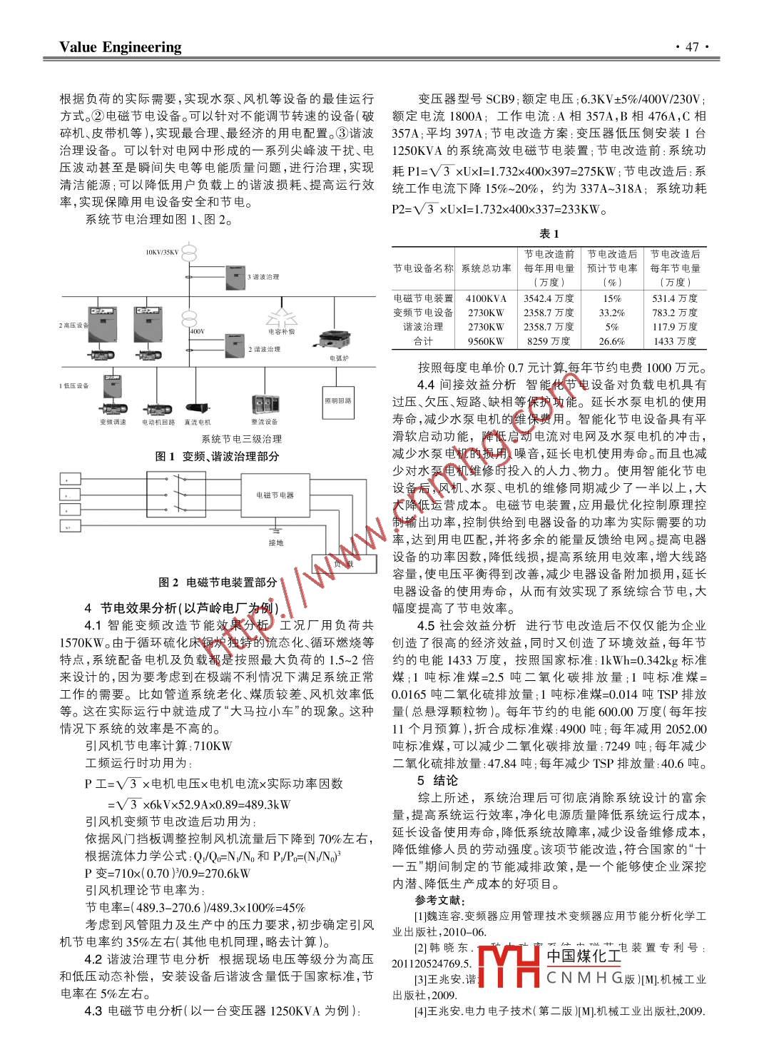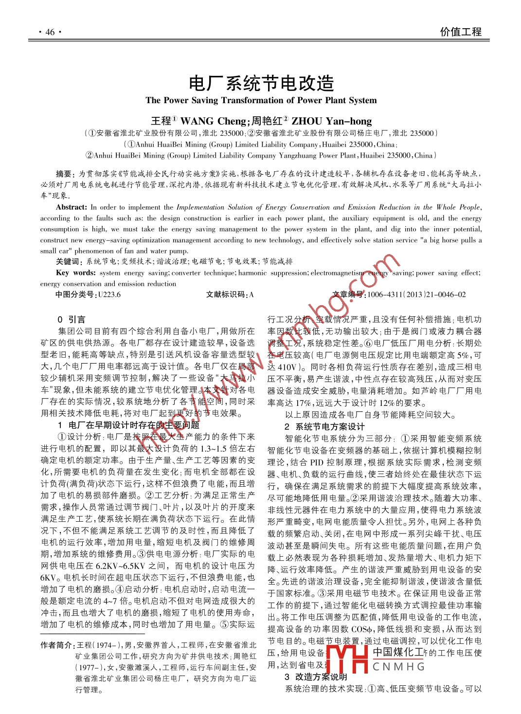 價(jià)值工程電廠系統(tǒng)節(jié)電改造The Power Saving Transformation of Power Plant System王程 WANG Cheng;周艷紅2 ZHOU Yan-hong(①安徽省淮北礦業(yè)股份有限公司,淮北235000②安徽省淮北礦業(yè)股份有限公司楊莊電廠,淮北235000((Anhui HuaiBei Mining(Group) Limited Liability Company, Huaibei 235000, China@2)Anhui Huai Bei Mining(Group) Limited Liability Company Yangzhuang Power Plant, Huaibei 235000, China摘要:為貫徹落實(shí)巛節(jié)能減排全民行動(dòng)實(shí)施方案》實(shí)施,根據(jù)各電廠存在的設(shè)計(jì)建造較早,各輔杋存在設(shè)備老舊、能耗高等缺點(diǎn),須對廠用電系統(tǒng)電耗進(jìn)行節(jié)能管理,深挖內(nèi)潛。依據(jù)現(xiàn)有新科技技術(shù)建立節(jié)電優(yōu)化管理,有效解決風(fēng)杌、水泵等廠用系統(tǒng)“大馬拉小車”現(xiàn)象。according to the faults such as the kse Implementation Solution of Energy Conservation and Emission Reduction in the Whole PeopleAbstract: In order to implement thign construction is earlier in each power plant, the auxiliary equipment is old, and the energyonsumption is high, we must take the energy saving management to the power system in the plant, and dig into the inner potential,construct new energy-saving optimization management according to new technology, and effectively solve station service"a big horse pulls asmall car"phenomenon of fan and water pump.關(guān)鍵詞:系統(tǒng)節(jié)電;變頻技術(shù);諧波治理;電磁節(jié)電;節(jié)電效果;節(jié)能減排Key words: system energy saving; converter technique; harmonic suppression; electromagnetism energy saving; power saving effectenergy colation中圖分類號(hào):U223.6文獻(xiàn)標(biāo)識(shí)碼:A文章編號(hào):1006-431(2013)21-0046-00引言行工況分析:空載情況嚴(yán)重,且沒有任何補(bǔ)償措施;電機(jī)功集團(tuán)公司目前有四個(gè)綜合利用自備小電廠,用做所在率因數(shù)比較低,無功輸出較大;由于是閥門或液力耦合器礦區(qū)的供電供熱源。各電廠都存在設(shè)計(jì)建造較早,設(shè)備選調(diào)整工況,系統(tǒng)穩(wěn)定性差。⑥電廠低壓廠用電分析:長期處型老舊,能耗高等缺點(diǎn),特別是引送風(fēng)機(jī)設(shè)備容量選型較在電壓較高(電廠電源側(cè)電壓規(guī)定比用電端額定高5%,可大,幾個(gè)電廠廠用電率都遠(yuǎn)高于設(shè)計(jì)值。各電廠僅在局部達(dá)410V)。同時(shí)各相負(fù)荷運(yùn)行性質(zhì)存在差別,造成三相電較少輔機(jī)采用變頻調(diào)節(jié)控制,解決了一些設(shè)備“大馬拉小壓不平衡,易產(chǎn)生諧波,中性點(diǎn)存在較高殘壓,從而對變壓車”現(xiàn)象,但未能系統(tǒng)的建立節(jié)電優(yōu)化管理。本文針對各電器設(shè)備造成安全威脅,電量消耗增加。如蘆嶺電廠廠用電廠存在的實(shí)際情況,較系統(tǒng)地分析了各節(jié)能空間,同時(shí)采率高達(dá)17%,遠(yuǎn)遠(yuǎn)大于設(shè)計(jì)時(shí)12%的要求。用相關(guān)技術(shù)降低電耗,將對電廠起到更好的節(jié)電效果。以上原因造成各電廠自身節(jié)能降耗空間較大。1電廠在早期設(shè)計(jì)時(shí)存在的主要問題2系統(tǒng)節(jié)電方案設(shè)計(jì)①設(shè)計(jì)分析:電廠是按照在最大生產(chǎn)能力的條件下來智能化節(jié)電系統(tǒng)分為三部分:①采用智能變頻系統(tǒng)進(jìn)行電機(jī)的配置,即以其最大設(shè)計(jì)負(fù)荷的13-1.5倍左右智能化節(jié)電設(shè)備在變頻器的基礎(chǔ)上,依據(jù)計(jì)算機(jī)模糊控制確定電機(jī)的額定功率。由于生產(chǎn)量、生產(chǎn)工藝等因素的變理論,結(jié)合PD控制原理,根據(jù)系統(tǒng)實(shí)際需求,檢測變頻化,所需要電機(jī)的負(fù)荷量在發(fā)生變化;而電機(jī)全部都在設(shè)器、電機(jī)、負(fù)載的運(yùn)行曲線,使三者始終處在最佳狀態(tài)下運(yùn)計(jì)負(fù)荷(滿負(fù)荷狀態(tài)下運(yùn)行,這樣不但浪費(fèi)了電能,而且增行,確保在滿足系統(tǒng)需求的前提下大幅度提高系統(tǒng)效率加了電機(jī)的易損部件磨損。②工藝分析:為滿足正常生產(chǎn)盡可能地降低用電量。②采用諧波治理技術(shù)。隨著大功率、需求,操作人員常通過調(diào)節(jié)閥門、葉片,以及葉片的開度來非線性元器件在電力系統(tǒng)中的大量應(yīng)用,使得電力系統(tǒng)波滿足生產(chǎn)工藝,使系統(tǒng)長期在滿負(fù)荷狀態(tài)下運(yùn)行。在此情形嚴(yán)重畸變,電網(wǎng)電能質(zhì)量令人擔(dān)憂。另外,電網(wǎng)上各種負(fù)況下,不但不能滿足系統(tǒng)工藝調(diào)節(jié)的及時(shí)性,而且降低了載的頻繁啟動(dòng)、關(guān)閉,在電網(wǎng)中形成一系列尖峰干擾、電壓電機(jī)的運(yùn)行效率,增加用電量,縮短電機(jī)及閥門的維修周波動(dòng)甚至是瞬間失電。所有這些電能質(zhì)量問題,在用戶負(fù)期,增加系統(tǒng)的維修費(fèi)用。③供電電源分析電廠實(shí)際的電載上必然表現(xiàn)為各種損耗增加、發(fā)熱量增大、電機(jī)力矩下網(wǎng)供電電壓在62KV-6KV之間,而電機(jī)的設(shè)計(jì)電壓為降、運(yùn)行效率降低。產(chǎn)生的諧波嚴(yán)重威脅到用電設(shè)備的安6KV。電機(jī)長時(shí)間在超電壓狀態(tài)下運(yùn)行,不但浪費(fèi)電能,也全。先進(jìn)的諧波治理設(shè)備,完全能抑制諧波,使諧波含量低增加了電機(jī)的磨損④啟動(dòng)分