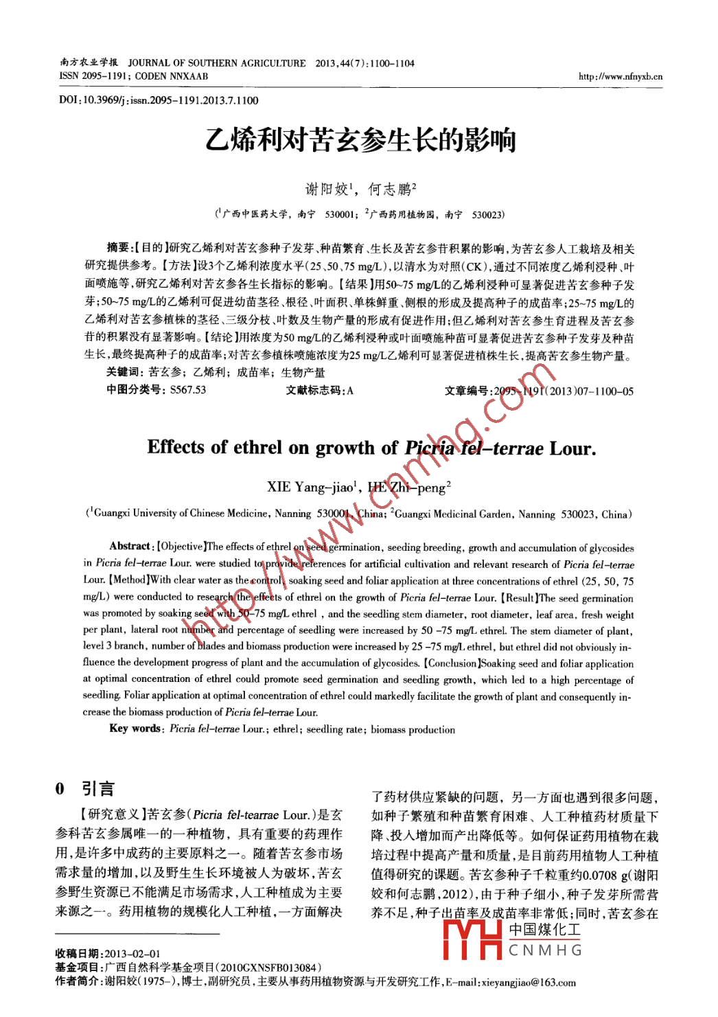 南方農(nóng)業(yè)學(xué)報(bào)JOURNAL OF SOUTHERN AGRICULTURE 2013.4()1100-1104ISSN 2095-1191; CODEN NNXAABhtp:/ww nfnyxb.cnDOI: 10.3969/jissn.2095-1 191.2013.7.1100乙烯利對(duì)苦參生長的影響謝陽姣',何志鵬2(廣西中醫(yī)藥大學(xué),南寧530001; 礦西藥用植物園,南寧530023)摘要:[目的]研究乙烯利對(duì)苦玄參種子發(fā)芽、種苗繁育、生長及苦玄參苷積累的影響,為苦玄參人工栽培及相關(guān)研究提供參考。[方法]設(shè)3個(gè)乙烯利濃度水平(25.50.75 mg/L),以清水為對(duì)照(CK),通過不同濃度乙烯利浸種葉面噴施等,研究乙烯利對(duì)苦玄參各生長指標(biāo)的影響。[結(jié)果]用50 -75 mg/L的乙烯利浸種可顯著促進(jìn)苦玄參種子發(fā)芽;50~75 mg/L的乙烯利可促進(jìn)幼苗莖徑、根徑、葉面積、單株鮮重、側(cè)根的形成及提高種子的成苗率;25-~75 mgL的乙烯利對(duì)苦玄參植株的莖徑三級(jí)分枝、葉數(shù)及生物產(chǎn)量的形成有促進(jìn)作用;但乙烯利對(duì)苦玄參生育進(jìn)程及苦玄參昔的積累沒有顯著影響。[結(jié)論用濃度為50 mg/L的乙烯利浸種或葉面噴施種苗可顯著促進(jìn)苦玄參種子發(fā)芽及種苗生長,最終提高種子的成苗率;對(duì)苦玄參植株噴施濃度為25 mg/L乙烯利可顯著促進(jìn)植株生長,提高苦玄參生物產(chǎn)量。關(guān)鍵詞:苦玄參;乙烯利;成苗率;生物產(chǎn)量中圖分類號(hào): S567.53文獻(xiàn)標(biāo)志碼:A文章編號(hào):2095-1191(2013)07-1100-05Effects of ethrel on growth of Picria fel- -terrae Lour.XIE Yang jiao' , HE Zhi-peng2(Guangxi University of Chinese Mediceine, Nanning 53000, China; 2Guangxi Medicinal Garden, Nanning 530023, China)Abstract: [objective]The efecets of ethrel on seed germination, seeding breeding, growth and accumulation of glycosidesin Picria fel trrae Lour. were studied to provide references for atificial culivation and relevant research of Picria fel teraeLour. [Method]With clear water as the contol, soaking seed and fliar pplication at three concentations of ethrel (25, 50, 75mg/L) were conducted to research the efects of ethrel on the growth of Picria fel-terrae Lour. [Result ]The seed germinationwas promoted by soaking seed with 50- -75 mg/L ethrel , and the seedling stem diameter, root diameter, leaf area, fresh weightper plant, lateral root number and percentage of seedling were iincreased by 50 -75 mg/L ethrel. The stem diameter of plant,level 3 branch, number of blades and biomass production were increased by 25 -75 m/L ethrel, but ethrel did not obviously in-luence the development progress of plant and the accumulation of glycosides. [Conclusion]Soaking seed and foliar applicationat optimal concentration of ethrel could promote seed germination and seedling growth, which led to a high percentage ofseedling Foliar application at optimal concentration of ethrel could markedly facilitate the growth of plant and consequenly in-crease the biomass production of Picria felterrae Lour.Key words: Picria fel-terrae Lour; ethrel; seedling rate; biomass production0引言了藥材供應(yīng)緊缺的問題,另一方面也遇到很多問題,[研究意義]苦玄參(Picria fel-terrare Lour. )是玄如種子繁殖和種苗繁育困難、人工種植藥材質(zhì)量下參科苦玄參屬唯- - 的一種植物,具有重要的藥理作降、投入增加而產(chǎn)出降低等。如何保證藥用植物在栽用,是許多中成藥的主要原料之- -。隨著苦玄參市場培過程中提高產(chǎn)量和質(zhì)量,是目前藥用植物人工種植需求量的增加,以及野生生長環(huán)境被人為破壞,苦玄值得研究的課題??嘈⒎N子千粒重約0.0708 g(謝陽參野生資源已不能滿足市場需求,人工種植成為主要姣和何志鵬,2012),由于種子細(xì)小,種子發(fā)芽所需營來源之一。藥用植物的規(guī)?;斯しN植,一方面解決養(yǎng)不足,種子出苗率及成苗率非常低;同時(shí),苦玄參在中國煤化工收稿日期:2013-02-01MYHCNMHG基金項(xiàng)目:廣西自然科學(xué)基金項(xiàng)目(2010CXNSFB013084)作者簡介:謝陽姣( 1975- ), 博士,副研究員,主要從事藥用植物資源與開發(fā)研究工作, E- mail:xieyangjiao@ 163.com謝陽姣等:乙烯利對(duì)苦玄參生長的影響●1101●人工種植過程中可能出現(xiàn)活性成分含量及組成發(fā)生度30C,光照10000 lx, 恒溫培養(yǎng)箱培養(yǎng)。每處理設(shè)4個(gè)改變的現(xiàn)象,導(dǎo)致藥材質(zhì)量不如野生資源。因此,保證復(fù),每個(gè)重復(fù)100粒種子。播種后每天觀察種子發(fā)芽苦玄參種苗供應(yīng)及產(chǎn)量和質(zhì)量不下降,是苦玄參人工情況,當(dāng)日種子發(fā)芽數(shù)達(dá)到最大時(shí),定為種子發(fā)芽勢栽培需要解決的問題。[前人研究進(jìn)展]前人對(duì)苦玄參的計(jì)數(shù)時(shí)間;種子發(fā)芽數(shù)變化可忽略不計(jì)時(shí)定為發(fā)芽藥理、藥效的研究較多,但對(duì)苦玄參人工種植及其相率計(jì)數(shù)時(shí)間。各指標(biāo)計(jì)算公式:關(guān)研究較少。甄漢深等( 2007 )對(duì)苦玄參的人工種植進(jìn)發(fā)芽勢(%)=(發(fā)芽勢計(jì)數(shù)當(dāng)日種子發(fā)芽總數(shù)/供行了初步研究;嚴(yán)慧貞和藍(lán)子康(2009)根據(jù)多年的種試種子數(shù))x100植經(jīng)驗(yàn)闡述了苦玄參的栽培技術(shù)要點(diǎn);此外,董青松發(fā)芽率(%)=(發(fā)芽率計(jì)數(shù)當(dāng)日種子發(fā)芽總數(shù)/供等(2010)對(duì)苦玄參種子的發(fā)芽檢驗(yàn)做了相關(guān)研究,但對(duì)苦玄參目前種植中遇到的問題未曾涉及。前人的許1.2.3乙烯利對(duì)苦玄 參種苗繁育的影響于2