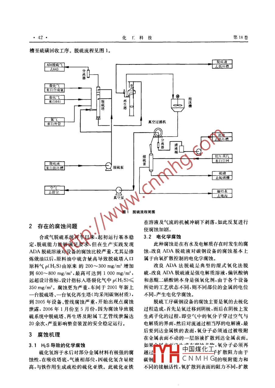 生產(chǎn)技術(shù)化工科技,2010,18(5):41~44scienCe TECHNOLOGY IN CHEMICAL INDUSTRY合成氣裝置脫硫操作中腐蝕問題的探討曲廣杰,李長途1,田吉風(fēng),孔令海,王榮利,陳大鵬21中國石油吉林石化公司化肥廠,吉林吉林132021;2.中國石油吉林燃料乙醇有限公司,吉林吉林132101)摘要:論述合成氣裝置所用原料—一重油中硫含量大幅度上升,導(dǎo)致脫硫系統(tǒng)設(shè)備、管線腐蝕嚴(yán)重的現(xiàn)象,生產(chǎn)實(shí)踐中發(fā)現(xiàn)易積硫的部位腐蝕比其它部位嚴(yán)重;探討脫硫操作中出現(xiàn)管線、塔、循環(huán)槽等腐蝕原因,分析腐蝕的機(jī)理為H2S導(dǎo)致的化學(xué)腐蝕和電化學(xué)腐蝕,了解腐蝕的主要破壞形態(tài)是全面腐蝕和局部腐蝕,并針對腐蝕采取了一系列措施,有效地解決了脫硫系統(tǒng)的腐蝕問題,保證了脫硫系統(tǒng)的安全平穩(wěn)運(yùn)行關(guān)鍵詞:合成氣;脫硫;腐飲;解決辦法中圖分類號:TE665.3文獻(xiàn)標(biāo)識碼:B文章編號:10080511(2010)050041-04中國石油吉林石化公司化肥廠合成氣裝置于Na2 CO3+ H2S- NaHS NaHCO, (1)1982年投產(chǎn),原設(shè)計(jì)使用煉制大慶石油后的重硫氡化物被五價(jià)釩迅速氧化成元素硫,而五油采用重油加壓氣化流程在3.0MPa、1350℃價(jià)釩還原成四價(jià)釩。條件下,部分氧化生成粗裂化氣,高溫裂化氣經(jīng)火2NaHS 4NaVO3+ H,0= Na2 V,O,+管式蛇管鍋爐回收廢熱,產(chǎn)生5.0MPa壓力的中4NaOH+2S↓壓蒸汽,氣體再經(jīng)過一系列凈化工序,制得合格的四價(jià)釩與氧化態(tài)的ADA作用,生成還原態(tài)合成氣(H2+CO),最終提供給丁辛醇裝置。其的ADA,而四價(jià)釩迅速氧化成五價(jià)釩恢復(fù)∫釩凈化工序脫硫工藝采用改良蒽醌二磺酸鈉的氧化性能(ADA)氧化法脫硫Na2V4O3+2ADA(氧化態(tài))+2NaOH+2003年由于原料供給改變,其前部公司煉油H2O=4NaVO2+2ADA(還原態(tài))(3)廠開始摻煉俄油,使原料重油中硫含量大幅度上ADA溶液的再生是在再生塔中加入大量空氣,升,導(dǎo)致脫硫系統(tǒng)設(shè)備、管線腐蝕比較嚴(yán)重空氣中的氧將還原態(tài)ADA氧化成氧化態(tài)ADA,恢1脫硫工藝原理與流程簡述復(fù)了ADA的氧化性能,同時(shí)單質(zhì)硫被吹出2ADA(還原態(tài))+O2=2ADA(氧化態(tài))1.1工藝原理+2H2O(4)合成氣裝置脫硫工藝采用改良ADA法脫除1.2工藝流程簡述粗裂化氣中的硫化氫氣化工序來的裂化氣從脫硫系統(tǒng)的脫硫塔底其反應(yīng)原理主要是以稀堿溶液(NaQO)為部進(jìn)人,塔底進(jìn)入的氣體與塔上部噴淋入塔的吸收劑,ADA溶液為氧載體,在V2O為催化劑ADA溶液接觸依據(jù)氣液物性參與工藝反應(yīng)實(shí)現(xiàn)的作用下吸收裂化氣中硫化氫實(shí)現(xiàn)氣體脫硫的脫硫處理后氣體中p(H2S)降低到5mgm以下。目的。脫硫后的裂化氣從塔頂出來,進(jìn)入下一生產(chǎn)具體反應(yīng)步驟如下工序,而吸收硫化氫后的脫硫溶液從塔底出來,進(jìn)稀堿溶液與硫化氡發(fā)生化學(xué)反應(yīng)。在氧化冉牛塔底部鼓入空氣,使其收稿日期:201006-06中國煤化工質(zhì)硫伴隨氣泡化公司化肥廣工程師長期從事合成氣生產(chǎn)技上升,CNMHG凝聚成較大顆粒,匯集成硫磺泡沫自塔上溢流口流到硫磺泡沫第18卷槽至硫磺回收工序。脫硫流程見圖1。廠疫化冖米們外管真空過濾機(jī)米論網(wǎng)■股磁液一自環(huán)硫一圖1脫硫流程簡圖2存在的腐蝕問題在溶液及氣流的機(jī)械沖刷下剝落,如此反復(fù)進(jìn)行使腐蝕加劇合成氣脫硫系統(tǒng)開車以來起初運(yùn)行基本穩(wěn)32電化學(xué)腐蝕定,脫硫能力能夠滿足要求,但在生產(chǎn)實(shí)踐發(fā)現(xiàn)此種腐蝕是在有水及電解質(zhì)存在時(shí)發(fā)生的腐ADA脫硫溶液對設(shè)備的腐蝕比較嚴(yán)重,尤其是摻蝕,改良ADA脫硫液對碳鋼設(shè)備的腐蝕基本上煉俄油以后,原料油中硫含量高導(dǎo)致脫硫塔入口屬于由氧擴(kuò)散控制的電化學(xué)腐蝕。原料氣p(H2S)由原來的200~300mg/m3增加改良ADA法脫硫是典型的濕式氧化法脫到600~800mg/m3,最高可達(dá)到1000mg/m3,硫改良ADA脫硫液是強(qiáng)電解質(zhì)溶液,偏釩酸鈉遠(yuǎn)超設(shè)計(jì)指標(biāo)設(shè)計(jì)指標(biāo)入塔裂化氣中p(H2S)≤和蒽醌二磺酸鈉本身是強(qiáng)氧化劑由于各個(gè)設(shè)備350mg/m3。腐蝕更為嚴(yán)重,車間于2001年新上所處的工藝狀態(tài)不同,則不同部位的金屬的電位一臺脫硫塔、一臺氧化再生塔(均采用碳鋼材質(zhì)),不同,產(chǎn)生電化學(xué)腐蝕到2005年設(shè)備、管線腐蝕嚴(yán)重,開始出現(xiàn)點(diǎn)腐蝕脫硫工序碳鋼設(shè)備的腐蝕主要是氧的去極化泄露,2006年1月份至5月份,因?yàn)楦g導(dǎo)致脫過程造成首先是氧遷移到陰極,而后在陰極上發(fā)硫系統(tǒng)中脫硫塔、再生塔及附屬T藝管線泄漏達(dá)生離子化的過程,即空氣中的氧分子穿過空氣與20余次,嚴(yán)重影響整套裝置的安全穩(wěn)定運(yùn)行電解質(zhì)的界面然后對流通過相當(dāng)厚的電解液,最3腐蝕機(jī)理后要到達(dá)金屬鐵的表面,氧分子必須通過被吸附在金屬表面不動的一層溶液擴(kuò)散到達(dá)金屬表面。3.1HS導(dǎo)致的化學(xué)腐蝕如心“,氧分子必須再硫化氫溶于水后對部分金屬材料有極強(qiáng)的腐越中國煤化工子擴(kuò)散阻力由于蝕性,在吸收塔底,氣液相部位因硫化氫含量較碳鋼CNMHG的吸附能力和高,與鐵作用生成疏松的硫