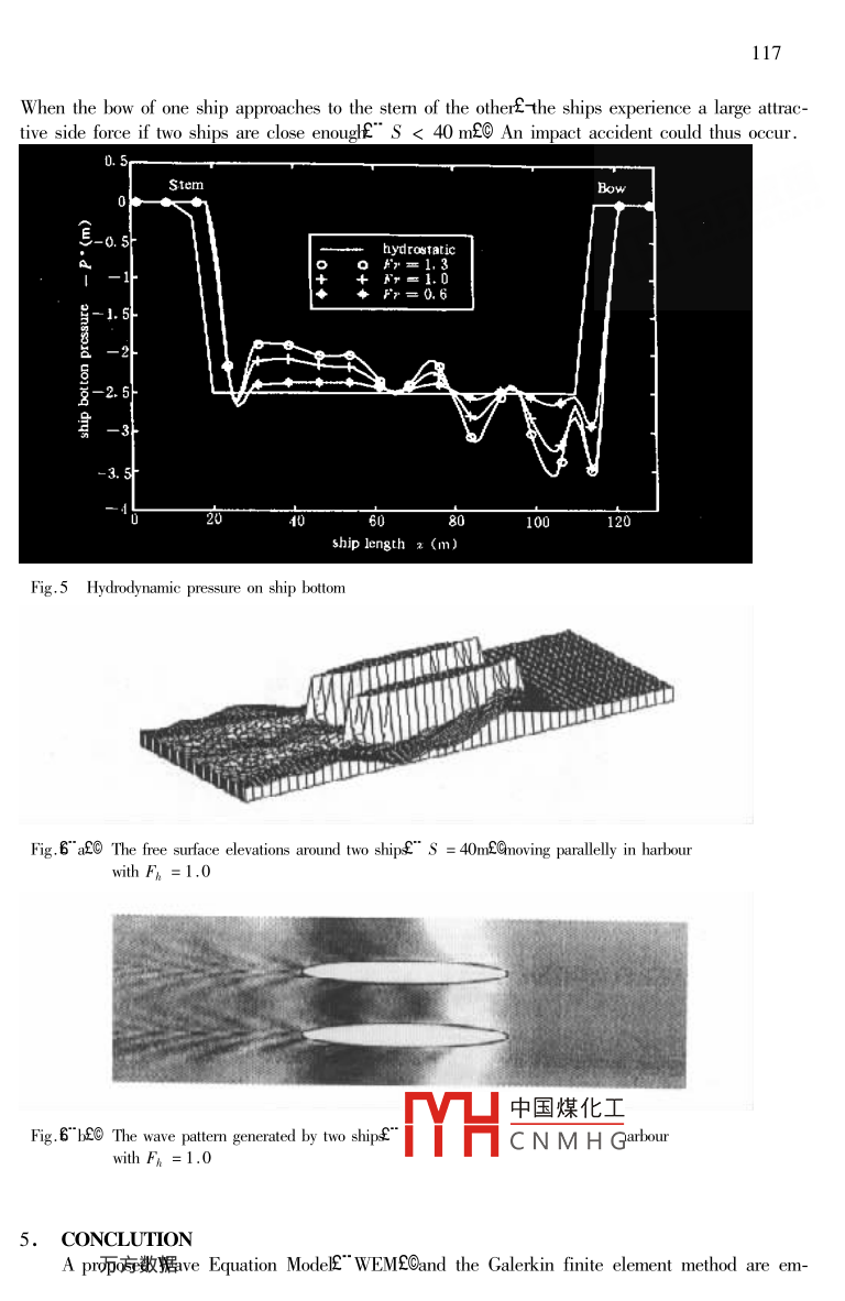 109Joumal of HydrodynamicsE fer. BE& *2000£0+09- 119China Ocean Press£ Beijing - Printed in ChinaWAVE EQUATION MODEL FOR SHIP WAVES IN BOUNDEDSHALLOW WATERT.S.LeeMechanical & Production Enginering Departmentf-National University of Singapore£-Singapore119620Wu Jian- kangf Xiong Chuan- guangMechanics Department of Huazhong University of Science & Technology E-Wuhan 430074E-P. R.ChinaC. ShuMechanical & Production Engineering Department- rNational University of Singapore£- Singaporef Received Dec. 18E-1999£OABSTRACT2 Ships were modelled as moving pressure disturbances on the free surface of a shal-ow water basin in the present paper. The moving- pressure generating waves were subjected to thereflection of land boundaries and the radiation of open boundaries. This paper proposed and exam-ined a wave equation modef" WEME@o solve the shallow water equations with moving surface pres-sures simulating ship waves in a bounded shallow water region. 'The Galerkin finite element methodwas used to solve a second order wave equation for the free surface elevations and the hydrodynamicpressure of the ship botom simultaneously. Horizontal velocities were obtained from the momentumequations. Numerical solutions of Series 60 Cp = 0. 6 ships moving with the depth Froude numberof Fn=0. 6E1. 0£1. 3 in a rectangular shallow water harbor were investigated. Three dimensional surfaceelevation profiles and the depth- averaged horizontal velocities were analysed. The numerical resultscharacterised very well the ship waves in shallow water. Strong boundary reflection waves werefound in the case of high depth Froude numbe£" Fn = 1. 32@ Waves generated by the interactionsof two ships moving in the same directions and in the opposite directions were also numerically in-vestigated in the present study .KEY WORDS ship wavesE- shallowv water equationsE FEM1. INTRODUCTIONIn the recent yearsE- waves in coastal shallow water£ generated by marine traffic and intensifiedby port expansion£ interaction with structures and reflection of land boundariesf Hhas become a cru-cial factor affecting water environments and engineering operation. In comparison with the windwaves and ocean swellsE-waves inside harbor ex中國煤化工1 certain areas. Thedominant ship waves are hardly dissipated in then with shorelinesf andmay cause wave resonance. This accumulatedMYHCNMHGevere increase of waveheight which causes damage to port facilities£- rdegradation of harbor infrastructures£- and excessivedisturbance to moored and moving vessels . The ship waves in riverfHakes£ Testuaries and coastal ar-eas are of great importance to environments£- engineering applications as well as ships.In shallow water areas£- the typical water depth is usually less than ship length. The wavelengthof ship waves aallow water is longer than that in deep water at the same speed. In many cases110the order of magnitude of the wavelength may be the same as ship length. In such situations the shipwaves in shallow water may be treated as shallow water waves£-i.e. k:h < < 1 2 and studied byshallow water equations. The nonlinearityE- energy dissipation and free surface disturbance may besignificant to shallow water waves£ 7and explicitly appear in the shallow water equations. The numer-ical solution of the Navier-Stokes equations are gaining popular in hydrodynamics in recent years .The shallow water equations are the depth-averaged Navier Stokes equations in the cases that the wa-ter depth is much less than horizontal flow scale. The shallow water is often bounded by shorelinesand varying seabed. The shoreline reflection makes ship waves even more complicated. The fielddata and experimental results in such situations are rarely available. Numerical model is of great in-terest in practical applications . The objective of this paper is to develop a finite element model to in-vestigate the characteristics of ship waves in bounded shallow water. In the present work ships areconsidered as moving pressure disturbance on the free surface£- rwhich is explicitly involved in theshallow water equations . This paper focuses the attention on the moving pressure on the free surface2-which generates waves in shallow water .The continuity equation is the first-order hyperbolic differential equation. It is known that thenumerical solution of the first-order hyperbolic differential equation has long been a difficult problemin computational fluid dynamics field . The numerical solutions of shallow water equations are easilyspoiled by numerical oscillationS 262EY. The wave equation modelE" WEME-first developed byLynch & Gra&U1E ntransforms the continuity equation and momentum equations to a second-orderwave equation2- then solves the wave equation for shallow water solutions£- instead of directly solvingcoupled continuity equation and momentum equations. The wave equation model eliminates numeri-cal oscillation effectively and decouples the continuity equation and momentum equations. Wave e-quation model has been sucssfully applied to many tidal computationS- 324252. The wave equationmodel and the Galerkin finite element method are employed to solve shallow water equations for in-vestigating ship waves in bounded shallow water in this paper. The numerical solutions of three-di-mensional free surface profiles and horizontal velocities are presented .2. WAVE EQUATION MODEL TO SOLVE SHALLOW WATER EQUATION WITHMOVING PRESSUREThe depth- averaged shallow water equations are given bydζ+ ViE" HVEO= 0f"120JHV+ Vi@"HVVE@+ gH°ζ + P£O+ tHV= 0f"20.pgwhere ζ is the surface elevation relative to still water£-V f" ufrfQs the depth- averaged horizontalvelocities£-H = h + ζ is the total water depthE-h is the still water depth£f" xEyEfGs the movingpressure on water surface£p is the water density£ g is the gravity acceleration£ tτ is the floor frictioncofficientE-und V =f" i. j EQs horizonl中國煤化工The present work is mainly concerned withMYHCNMH(Jing ship waves in shal-low wa