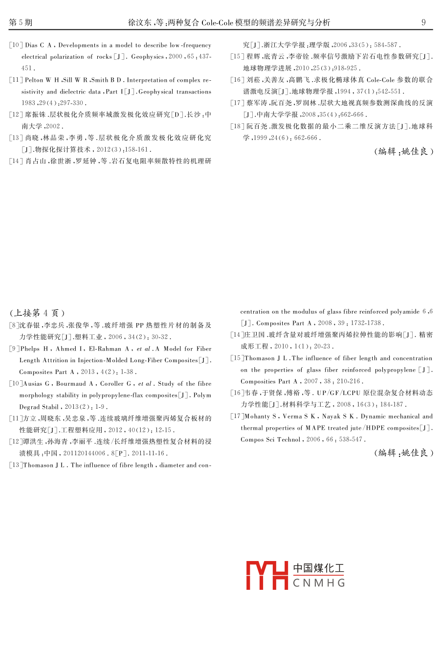 第27卷第5期山東理工大學(xué)學(xué)報(bào)(自然科學(xué)版)Vol.27 No .52013年9月Journal of Shandong U niversity of T echnology (N atural Science Edition )Sep. 2013文章編號(hào):1672- -6197(2013 )05- 0001-04連續(xù)玻纖增強(qiáng)聚烯烴預(yù)浸帶的力學(xué)性能劉雪靜,譚洪生,李麗平,譚哲興(山東理工大學(xué)材料科學(xué)與工程學(xué)院,山東淄博255091 )摘要:分別以五種聚烯烴樹(shù)脂為基體,采用自行設(shè)計(jì)的浸漬模具制備了連續(xù)玻璃纖維增強(qiáng)聚烯烴預(yù)浸帶,并采用熱模壓機(jī)將預(yù)浸帶壓制成相應(yīng)的板材.研究了五種基體樹(shù)脂、纖維含量、纖維分布對(duì)復(fù)合材料力學(xué)性能的影響.結(jié)果表明,加入玻纖后復(fù)合材料的拉伸強(qiáng)度、彎曲強(qiáng)度大幅度提高,纖維分布對(duì)材料的彎曲性能影響較大;纖維含量0~ - 70%范圍內(nèi),隨纖維用量的增加,復(fù)合材料的力學(xué)性能提高;在70%~75%范圍內(nèi),復(fù)合材料的力學(xué)性能隨纖維含量的增加而降低.動(dòng)態(tài)力學(xué)分析表明,加入纖維后明顯提高了復(fù)合材料的抗形變能力.關(guān)鍵詞:連續(xù)纖維增強(qiáng);玻璃纖維;浸漬帶;力學(xué)性能中圖分類號(hào): TQ327.1文獻(xiàn)標(biāo)志碼: AMechanical properties of continuous glass fiber reinforcedpolyolefin prepreg tapesLIU Xue-jing, TAN Hong-sheng, LI Li-ping, TAN Zhe-xing(School of M aterials Science and Engineering,Shandong U niversity of Technology,Zibo 255091 ,China )Abstract: Five kinds of polyolefin resins were used as matrix ,the continuous glass fiber rein-forced polyolefin prepreg tapes were prepared by a self -designed impregnation mold and theprepreg tapes w ere pressed into the corresponding plate using a hot stamping press . The influ-ences of five kinds of polyolefin,fiber content and fiber distribution on mechanical properties ofcomposites w ere studied . The results show that the tensile and flexural strengths increase obvi-ously with the addition of the glass fibers,and the influence of fiber distribution on flexural prop-erty of the composites w as more obviously than that of other property . In the range of 0~ 70%,the mechanical properties of the composites increased with the increase of the fiber content . Inthe range of 70% ~ 75% ,the mechanical properties of the composites decreased with the increaseof the fiber content . The result of dy namic mechanical behavior shows that the deformation re-sistance of the composites enhanced evidently with the increase of the glass fiber content .Key words: continuous fiber reinforced ; glass fiber ; prepreg tape ; mechanical properties70年代之前熱固性樹(shù)脂基復(fù)合材料主要應(yīng)用性樹(shù)脂基復(fù)合材料以滿足市場(chǎng)需求.熱塑性樹(shù)脂基于軍工產(chǎn)品,在較長(zhǎng)一段時(shí)間內(nèi),連續(xù)纖維增強(qiáng)熱固復(fù)合材料具有特定溫度范圍內(nèi)反復(fù)加熱熔融、冷卻性塑料應(yīng)用于工業(yè)領(lǐng)域,如管道、罐體等.70年代后硬化如工成刑方便機(jī)械性能好等特點(diǎn),被廣泛應(yīng)開(kāi)始轉(zhuǎn)向民用,但此材料的主要缺點(diǎn)是使用后不易用于Y片中國(guó)煤化工論,短玻纖增強(qiáng)聚烯烴回收利用2-2] ,為克服此缺點(diǎn),人們開(kāi)發(fā)出幾種熱塑熱塑. CNMHGi ,并廣泛應(yīng)用于汽車、收稿日期: 2013 -07 - 24基金項(xiàng)目:山東省自然科學(xué)基金資助項(xiàng)目(ZR2011EM M012)作者簡(jiǎn)介:劉雪靜,女,liuxuejing I@ 163.com ;通信作者:譚洪生,男,hshengtan@ 163 .com2山東理工大學(xué)學(xué)報(bào)(自然科學(xué)版)2013年建筑、化工、包裝、電力、運(yùn)輸?shù)阮I(lǐng)域50].連續(xù)/長(zhǎng)玻纖增強(qiáng)的復(fù)合材料由于具有更加優(yōu)異的性能,能滿足許多實(shí)際應(yīng)用對(duì)材料性能的要求,成為研究和應(yīng)用的熱點(diǎn)1011,而國(guó)內(nèi)有關(guān)連續(xù)玻璃纖維增強(qiáng)聚烯烴預(yù)浸帶復(fù)合材料的研究報(bào)道較少.筆者采用熔融浸漬工藝制備出連續(xù)纖維增強(qiáng)聚烯烴預(yù)浸帶,研究了樹(shù)脂基體與纖維含量對(duì)復(fù)合材料力學(xué)性能的影響,并通過(guò)動(dòng)態(tài)黏彈譜儀考察了玻璃纖維對(duì)聚烯烴↑動(dòng)態(tài)力學(xué)行為的影響.圖1兩層浸漬帶壓制復(fù)合材料板材示意圖!1實(shí)驗(yàn)部分其余按GB/T 1447- -2005進(jìn)行測(cè)試;彎曲強(qiáng)度:試樣尺寸為50mm X 12 .5mm X1.1 原材料2mm ,其余按GB/T 9341 - -2006進(jìn)行測(cè)試;高密度聚乙烯(HDPE)(PE A ),牌號(hào):DCDA .動(dòng)態(tài)力學(xué)行為測(cè)試:儀器為Q800型,美國(guó)TA2911 ,熔體質(zhì)量流動(dòng)速率M FR為20g /min; HDPE公司;測(cè)試條件為振動(dòng)頻率和振幅分別為1Hz和(PE B) ,牌號(hào):DGDB 2480 ,M FR為0.1g /min ;低密20μm,升溫速率為5°C/min,溫度范圍為一140~度聚乙烯(LLDPE)(PE C),牌號(hào): DFDA 7042,120C ,高純氮?dú)夥?測(cè)試樣條的尺寸為:35mm XMFR為1.9g/min ;抗沖共聚聚丙烯(IPC)(PP A): 10mmX 2mm .SP179. ,MFR為8.9g/min ,均為中國(guó)石油化工股份有限公司齊魯分公司生產(chǎn);2結(jié)果與討論P(yáng)P :牌號(hào)T30S(PP B),MFR為3g/min ,中國(guó)石油天然氣股份有限公司大慶石化分公司;2.1基體樹(shù)脂對(duì) 力學(xué)性能的影響馬來(lái)酸酐接枝聚丙烯(PP-g-MAH):PP-G .由圖2看出,不同樹(shù)脂制備的浸漬帶拉伸強(qiáng)度-1 ;馬來(lái)酸酐接枝聚乙烯(PE一g - MAH):PE-G不同.由于不同樹(shù)脂的流動(dòng)性不同其與玻璃纖維