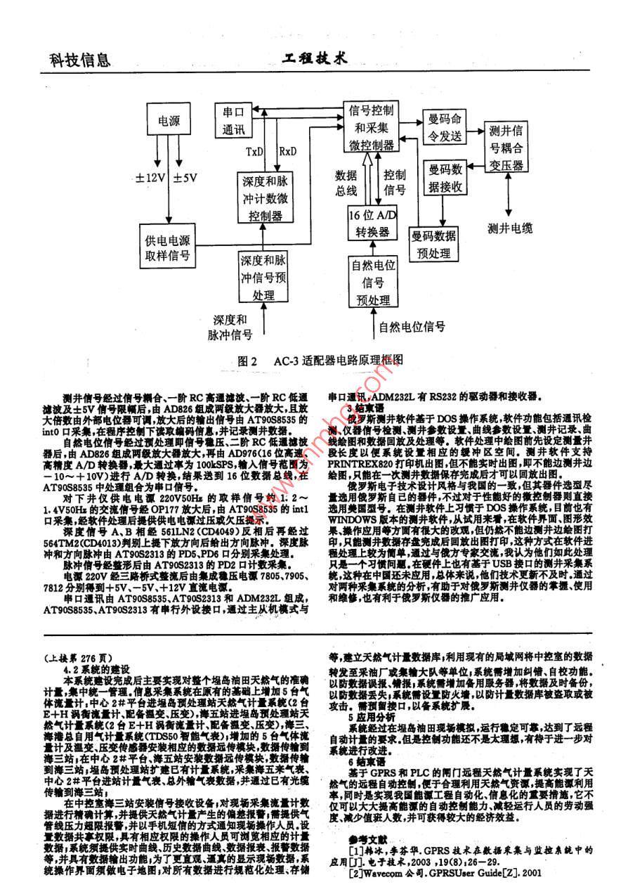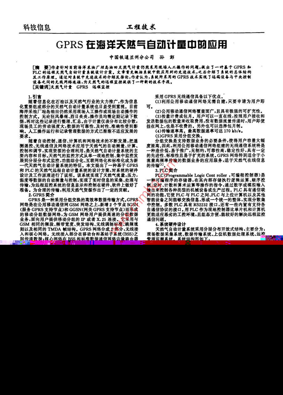 科技信息工程技術(shù)GPRS在海洋天惠氣自動計量的回用中國鋏遁蘭州分公司孫澎[擒嬰]作者針對目前海洋乘油廠堐島油田天然氣計重仍然乘用現(xiàn)場人工操作的問題,提出丁一種基于GPRS和PLC的遠程天然氣自動計量泉鯇設(shè)計方業(yè)。文拿首先括親毓中能應(yīng)用到的克遜技術(shù),之后介紹丁泉統(tǒng)的總體結(jié)構(gòu)及工作原理。通過對親蟯中先進技求的介紹及推論,作者認為,泉統(tǒng)所皋用的GPRS技術(shù)實現(xiàn)丁遠端設(shè)備與中夾控制設(shè)備之間的無線網(wǎng)絡(luò)連摟,為天然氣的遠程監(jiān)控提供丁一種新的技術(shù)手段[關(guān)鍵調(diào)]天然氣計量GPRS遠租藍控1.引言采用GPRS無線通信具備以下優(yōu)點隨著信息化在石油以及天然氣行業(yè)的大力推廣,作為信息(1)利用公用移動通信網(wǎng)絡(luò)無需自建,只要申請為用戶化重要組成部分的天然氣自動計量系統(tǒng)也日益受到重視。目前可(2)公用移動通信網(wǎng)絡(luò)覆蓋面廣,且具有極強的可擴充性控制方式。無論狂風暴雨、烈日炎炎,操作員均需定期記錄下數(shù)(3)按量計費或包月。用戶可以一直在線,按照用戶接收和據(jù)再對這些記錄進行整理匯總由于計量儀表分布比較分散,發(fā)送數(shù)據(jù)包的數(shù)量來收取費用沒有數(shù)據(jù)流量傳遞時,用戶即使現(xiàn)場員工的勞動強度大,數(shù)據(jù)的可靠性、及時性準確性受到影掛在網(wǎng)上,也是不收費的。另外也可以選擇包月制操作運行和記錄管理數(shù)據(jù)的方式已漸漸不適應(yīng)發(fā)展的(4)傳輸速率高。最高數(shù)據(jù)速率可達170kb/s。要求流自動控制通信計算機和網(wǎng)絡(luò)技術(shù)的不斷發(fā)廈把通5GPRS采用分組交換分組交換是支持數(shù)據(jù)業(yè)務(wù)的必要條件,使得用戶容量大幅測遙控、無線通信及網(wǎng)絡(luò)技術(shù)應(yīng)用于天然氣的自動測量、計算度提高因此,利用公用移動通信網(wǎng)絡(luò)組建的無線通信系統(tǒng)將是控制和調(diào)節(jié),實現(xiàn)資源的合理利用是天然氣自動計量系統(tǒng)的主種造價低,易于推廣,無制約,可靠性高,穩(wěn)定性好,具有一定要內(nèi)容和目標天然氣的監(jiān)控方式從單一現(xiàn)地控制集中監(jiān)控發(fā)的先進性標準性且易于擴充的系統(tǒng),GPRS網(wǎng)絡(luò)特別適合于小展到分層分布式監(jiān)控功能綜合化互聯(lián)網(wǎng)絡(luò)化和標準化成為新流量高頻率傳輸?shù)臄?shù)據(jù)業(yè)務(wù)的應(yīng)用服務(wù)適于天然氣在線信息一代天然氣自動計量系統(tǒng)的特征,本文提出了一種基于GPRs的傳檀p筒介和PLC的天然氣遠程自動計量系統(tǒng)的設(shè)計方案,對系統(tǒng)的硬件溫度等數(shù)據(jù)的自動測量與控制,實現(xiàn)了實時信息的采集、處理與一種可編程序的存儲器,在其內(nèi)部存儲執(zhí)行邏輯運算、順序控傳輸,為遠程監(jiān)控系統(tǒng)的信息顯示和控制在硬件、軟件上做好了制、定時、計數(shù)和算術(shù)運算等操作的指令,通過數(shù)字或模擬輸入準備。為合理的傳輸,利用天然氣資源作出了一定的貢獻。輸出來控制各種類型的機械設(shè)備或生產(chǎn)過程。PLC具有通信聯(lián)GPRS簡介網(wǎng)的功能,它使PLC與PLC之間、PLC與上位計算機以及其他GPRS是一種采用分組交換的高效率數(shù)據(jù)傳輸方式GPRS智能設(shè)備之間能夠交換信息形成一個統(tǒng)一的整體,實現(xiàn)分散集網(wǎng)絡(luò)是在公用移動通信網(wǎng)GSM網(wǎng)絡(luò)之上,新增2個節(jié)點SGSN中控制。多數(shù)PLc具有RS2232接口,還有一些內(nèi)置有支持各服務(wù)GPRS支持節(jié)點)和GGSN(網(wǎng)關(guān)GPRS支持節(jié)點)而形成自通信協(xié)議的接口,用PLc作為現(xiàn)地控制器比單片機和計算機的移動分組數(shù)據(jù)網(wǎng)絡(luò),為GSM網(wǎng)絡(luò)用戶提供高速的分組數(shù)據(jù)更能適應(yīng)惡劣的工控環(huán)境,且組態(tài)方便能較好的解決遠程監(jiān)控業(yè)務(wù),面向用戶提供移動分組的P或者X25連接,它采用與通信問題4.系統(tǒng)硬件設(shè)計則以及相同的TMDA幀結(jié)構(gòu),GPRS網(wǎng)絡(luò)分成2部分:無線接入和核心網(wǎng)絡(luò)。無線接入部分在移動臺和基站子系統(tǒng)(BSS)之現(xiàn)場數(shù)據(jù)采集系統(tǒng)、數(shù)據(jù)傳輸系統(tǒng)、上位機數(shù)據(jù)處理系統(tǒng)、遠控間傳遞數(shù)據(jù)核心網(wǎng)絡(luò)在BSS和標準數(shù)據(jù)通信網(wǎng)絡(luò)邊緣路由器管理監(jiān)測系統(tǒng)。系統(tǒng)結(jié)構(gòu)圖如下:之間中繼傳遞數(shù)據(jù)現(xiàn)場數(shù)據(jù)采集系統(tǒng)}數(shù)據(jù)傳輸系統(tǒng)上位機數(shù)據(jù)處理遠控管理監(jiān)測流量計UPS匚流量計}接收裝置及管理監(jiān)匚流量計上位控制計算機局域網(wǎng)匚流量計GPRs數(shù)據(jù)傳輸系統(tǒng)PLc服務(wù)器控制系統(tǒng)打印機【顯示器壓力變送器41中控室設(shè)計中控室硬件設(shè)備配量主要是接收設(shè)備和計算機網(wǎng)絡(luò)設(shè)備,主要根據(jù)采油廠要求及現(xiàn)場實際情況,該系統(tǒng)的所有信號采用包括: GPRSDTU有線 MODEM服務(wù)器、交換機、路由器激光GPRS方式將數(shù)據(jù)傳輸至中控室海三站),然后再利用現(xiàn)有的局打印機微機工作站避雷裝置、電源系統(t