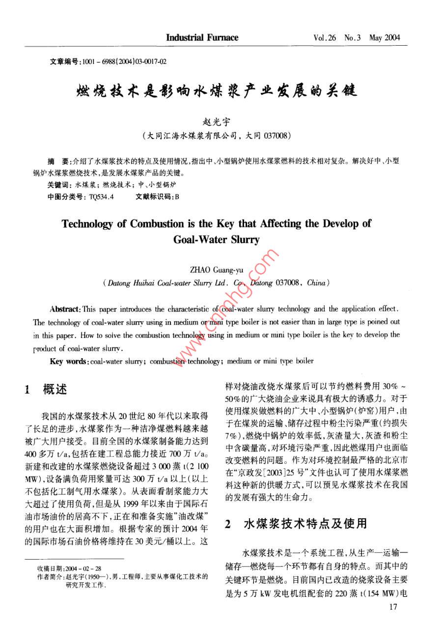 Industrial furnaceVol 26 No. 3 May 2004文章編號:1001-6988(2004)03-001702燃燒技術(shù)是影響水煤漿產(chǎn)業(yè)發(fā)屐的關(guān)鍵趙光宇(大同匯海水煤漿有限公司,大同037008)摘要:介紹了水煤漿技術(shù)的特點(diǎn)及使用情況,指出中、小型鍋爐使用水煤漿燃料的技術(shù)相對復(fù)雜。解決好中、小型鍋爐水煤漿燃燒技術(shù),是發(fā)展水煤漿產(chǎn)品的關(guān)鍵。關(guān)鍵詞:水煤漿;燃燒技術(shù);中、小型鍋爐中圖分類號:TQ5344文獻(xiàn)標(biāo)識碼:BTechnology of Combustion is the Key that Affecting the Develop ofGoal-Water SlurryZHAO Guang-yuDatong Huihai Coal-water Slurry Ltd. Co, Datong 037008, China)Abstract: This paper introduces the characteristic of coal-water slurry technology and the application effectThe technology of coal-water slurry using in medium or mini type boiler is not easier than in large type is poined outin this paper. How to soive the combustion technology using in medium or mini type boiler is the key to develop theof coal-water slurryKey words: coal-water slurry; combustion technology: medium or mini type boiler1概述樣對燒油改燒水煤漿后可以節(jié)約燃料費(fèi)用30%~50%的廣大燒油企業(yè)來說具有極大的誘惑力。對于我國的水煤漿技術(shù)從20世紀(jì)80年代以來取得使用煤炭做燃料的廣大中、小型鍋爐(爐窯)用戶,由了長足的進(jìn)步,水煤漿作為一種潔凈煤燃料越來越在煤炭的運(yùn)輸、儲存過程中粉塵污染嚴(yán)重(約損失被廣大用戶接受。目前全國的水煤漿制備能力達(dá)到7%),燃燒中鍋爐的效率低,灰渣量大,灰渣和粉塵400多萬t/a,包括在建工程總能力接近700萬an中含碳量高,對環(huán)境污染嚴(yán)重,因此燃煤用戶也面臨新建和改建的水煤漿燃燒設(shè)備超過3000蒸t(2100改變?nèi)剂系膯栴}。作為對環(huán)境控制最嚴(yán)格的北京市MW),設(shè)備滿負(fù)荷用漿量可達(dá)300萬t/a以上(以上在“京政發(fā)[2003]25號”文件也認(rèn)可了使用水煤漿燃不包括化工制氣用水煤漿)。從表面看制漿能力大料這種新的供暖方式,可以預(yù)見水煤漿技術(shù)在我國大超過了使用負(fù)荷,但是從1999年以來由于國際石的發(fā)展有強(qiáng)大的生命力。油市場油價的居高不下,正在和準(zhǔn)備實(shí)施”油改煤”的用戶也在大面積增加。根據(jù)專家的預(yù)計(jì)204年2水煤漿技術(shù)特點(diǎn)及使用的國際市場石油價格將維持在30美元/桶以上。這水煤漿技術(shù)是一個系統(tǒng)工程,從生產(chǎn)一運(yùn)輸收稿日期:2004-02-28儲存一燃燒每一個環(huán)節(jié)都有自身的特點(diǎn)。而其中的作者簡介:趙光宇(1950-).男,工程師,主要從事煤化工技術(shù)的研究開發(fā)工作關(guān)鍵環(huán)節(jié)是燃燒。目前國內(nèi)已改造的燒漿設(shè)備主要是為5萬kW發(fā)電機(jī)組配套的220蒸t(154MW)電綜述:燃燒技術(shù)是影響水煤漿產(chǎn)業(yè)發(fā)展的關(guān)鍵站鍋爐,每臺爐子的年用漿量在16-20萬t之間,(2)國家水煤漿中心工業(yè)窯爐燃燒技術(shù)研究所單個噴嘴的最大噴漿量在5th左右。這種鍋爐連(北京科技大學(xué))續(xù)工作,負(fù)荷變化小,燃燒效率和鍋爐效率高,生產(chǎn)(3)國家水煤漿中心柯林斯達(dá)水煤漿應(yīng)用研究穩(wěn)定,管理規(guī)范。需要解決的主要問題是延長易磨所(北京)損件(泵、閥、噴嘴)的壽命和減少煙氣中二氧化硫排(4)國家水煤漿中心水煤漿鍋爐研究設(shè)計(jì)制造放量。而且正在醞釀改造的還有更大的電站鍋爐基地(杭州)(410t、670t)。水煤漿作為一種潔凈煤產(chǎn)品既然可(5)國家水煤漿工程技術(shù)研究中心(北京)以用在大型鍋爐上就應(yīng)該可以用在中、小型鍋爐上(6)國家水煤漿中心南方公司(株州)我國現(xiàn)有的數(shù)十萬臺中、小型鍋爐,燒油、燒氣燃料(7)北京浙大國能科技有限公司(北京)價格高,用戶難以接受。燒煤又存在運(yùn)輸、儲存粉塵(8)清華同方能源環(huán)境公司(北京)污染,燃燒過程效率低,灰渣量大,灰渣和粉塵含碳(9)北京天融環(huán)保設(shè)備中心(北京)量高,煙囪排放難達(dá)標(biāo)等一系列問題。由于燒煤的(10)青島海眾實(shí)業(yè)有限公司(青島)污染,許多城市相繼提出了限制燒煤的政策。于是(11)鹽城東大熱能機(jī)械制造有限公司(江蘇鹽拔煙囪外遷工廠等項(xiàng)強(qiáng)制性環(huán)保措施在許多城市轟城)轟烈烈地行動起來。不燒煤燒什么?低硫重油的價(12)江陰鍋爐容器廠(江蘇江陰格2000元/t以上;輕油4000元/t以上;天然氣2.2(13)上海歐特氣化爐有限公司(上海)元/m3,折合成油價2750元/t;即使是按西氣東輸?shù)?14)棗莊礦業(yè)水煤漿燃燒工程公司(山東棗莊)市場價1.6元/m3折算也得2000元/t這樣的燃料(15)北京神霧熱能技術(shù)有限公司(北京)價格對大多數(shù)用戶來說是難以接受的。而與以上各(16)勝利油田發(fā)電廠(山東東營)項(xiàng)相比相同發(fā)熱量的水煤漿價格不足800元(約2.2(17)黑龍江天圣科技股份有限公司(哈爾濱)t水煤漿抵1t重油,北京市場價),環(huán)保效果還優(yōu)于(18)東北電力學(xué)院(吉林市)重油,水煤漿的優(yōu)勢顯而易見。但中、小型鍋爐的水(19)吉林省三意環(huán)保鍋爐有限公司(長春市)煤漿燃燒技術(shù)卻比較復(fù)雜。中、小型鍋爐普遍存在(20)武漢天元鍋爐有限公司(湖北武漢)負(fù)荷調(diào)整頻繁,開停次數(shù)多,管理工作跟不上,操作(21)湘潭鍋爐廠有限公司(湖南