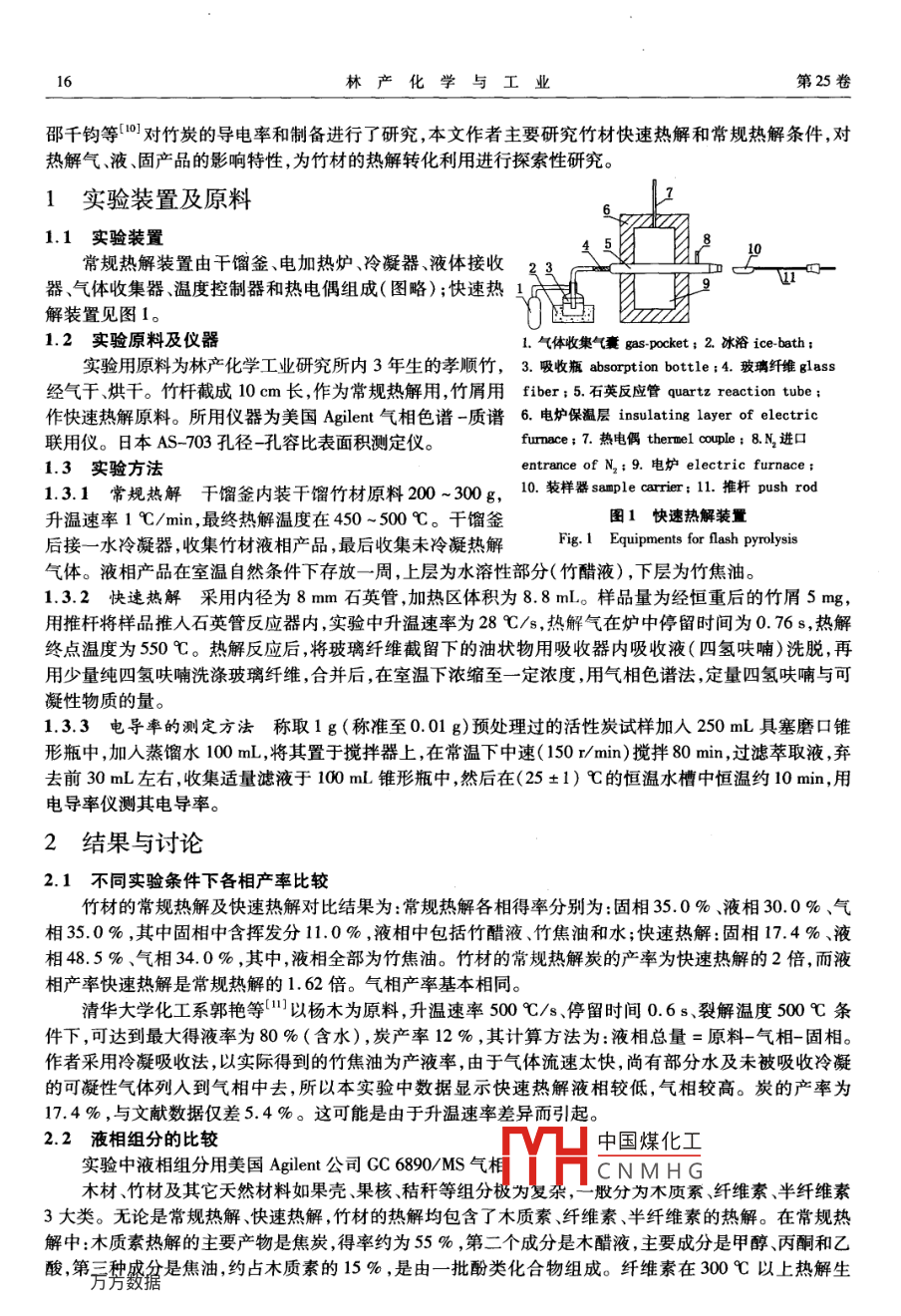 第25卷增刊林產(chǎn)化學(xué)與工業(yè)Vol 25 Supplement2005年10月Chemistry and Industry of forest Productsoct.2005研究報告竹材熱解特性研究蔣劍春,鄧先倫,張燕萍,施蔭銳(中國林業(yè)科學(xué)研究院林產(chǎn)化學(xué)工業(yè)研究所,江蘇南京210042)摘要:主要研究了竹材在快速熱解與常規(guī)熱解下液相、固相及氣相產(chǎn)品的得率差異??焖贌峤庀律郎?8℃/s,停留時間0.76s,溫度500℃,液相產(chǎn)品竹焦油得率為48.5%,主要組分JIANG JC為2,6-二甲氧基苯酚和2-甲氧基苯酚(愈瘡木酚),在常規(guī)熱解下升溫速率1℃/min,溫度500℃,液相得率為30%(包括水),組分主要為乙酸。在常規(guī)或緩慢熱解中,固相產(chǎn)物,炭的微孔結(jié)構(gòu)中,當熱解溫度低于550℃的情況下,主要孔徑在6.0~22.0mm,當熱解溫度在650~750℃,主要孔徑<2關(guān)鍵詞:熱解;微孔;酚類化合物;竹材中圖分類號:TQ351.2文獻標識碼:A文章編號:0253-2417(2005)0-0015STUDY ON THE CHARACTERISTIC FEATUREOF BAMBOO PYROLYSISJIANG Jian-chun, DENG Xian-lun, ZHANG Yan-ping, SHI Yin-ruInstitute of Chemical Industry of Forest Products, CAF, Nanying 210042, China)Abstract The characteristic feature of flash pyrolysis and conventional pyrolysis of bamboo were investigated. Thoperating conditions of flash pyrolysis was: temperature 500C, residence time of volatile matter 0. 76 s and heatingrate 28C/s. The yield of the liquid product was 48. 5 % containing 2, 6-dimethoxy phenol and 2-methoxy phenol asmajor constituents. The processing condition of conventional bamboo pyrolysis was: heating rate 1 C/min andtemperature 500C. The yield of liquid products including water was 30 % containing acetic acid asconstituent. In conventinal pyrolysis at temperature less than 550C, the main pore diameters were 6.. 0At pyrolysis temperature 650-750C, the main pore diameters were less than 2 nm.Key words: pyrolysis; micropore; phenols; bamboo竹材由于生長速度快,繁殖能力強,可不斷再生,具有極大開發(fā)利用潛力。中國是世界竹林面積最大,產(chǎn)量最高的國家。中國竹林主要分布在浙江、江西、福建、湖南湖北、安徽、廣東、廣西和四川等省區(qū)1。自20世紀90年代以來,日本興起了“竹炭熱”,進而引發(fā)了中國各地開發(fā)燒制竹炭的熱潮,并出口國外。日本在竹材炭化過程、竹炭應(yīng)用竹醋液和竹活性炭的研究方面做了大量研究工作(2),我國福建省、淅江省對竹炭竹醋液、竹活性炭也開展了大量開發(fā)研究工作,從氣、液、固3方面的利用進行了研究。如:胡永煌3發(fā)表了“竹炭竹醋液生產(chǎn)技術(shù)及應(yīng)用開發(fā)”的綜述文章。張文標等研究了高純度竹醋液的生產(chǎn)工藝。張玲等用竹節(jié)制取雙電層電容器用高出表而積活性歲的研容,左宋林進行了竹材炭化機理的研究。周建斌等用磷酸-復(fù)合活化劑制中國煤化1樊希安等利用微波輻射處理竹節(jié)廢料制備活性炭進行了研究。陳金根等CNMHG性炭進行了研究,收稿日期:2005-06-20作者簡介:蔣劍春(1955-),男,江蘇溧陽人,研究員,博士,博土生導(dǎo)師研究方向:生物質(zhì)能源和活性炭的開發(fā)與研究。16林產(chǎn)化學(xué)與工業(yè)第25卷邵千鈞等對竹炭的導(dǎo)電率和制備進行了研究,本文作者主要研究竹材快速熱解和常規(guī)熱解條件,對熱解氣、液、固產(chǎn)品的影響特性,為竹材的熱解轉(zhuǎn)化利用進行探索性研究。1實驗裝置及原料1實驗裝置常規(guī)熱解裝置由干餾釜、電加熱爐、冷凝器、液體接收器、氣體收集器、溫度控制器和熱電偶組成(圖略);快速熱1解裝置見圖I。12實驗原料及儀器1.氣體收集氣囊 gas pocket;2冰浴 ice-bath;實驗用原料為林產(chǎn)化學(xué)工業(yè)研究所內(nèi)3年生的孝順竹,3.吸收瓶 absorption bottle;4.玻璃纖維 glass經(jīng)氣干、烘干。竹桿截成10cm長,作為常規(guī)熱解用,竹屑用 fiber;5.石英反應(yīng)管 quartz reaction tube;作快速熱解原料。所用儀器為美國 agilent氣相色譜-質(zhì)譜6電爐保溫層 insulating layer of electric聯(lián)用儀。日本AS703孔徑孔容比表面積測定儀furnace;7.熱電偶 thermel couple;8.N2進口1.3實驗方法entrance of N2;9.電爐 electric furnace;1.3.1常規(guī)熱解干餾釜內(nèi)裝干餾竹材原料200~300g,10.裝樣器 sample carrier;1l推桿 push]rod升溫速率1℃/min,最終熱解溫度在450~500℃。干餾釜圖1快速熱解裝置后接一水冷凝器,收集竹材液相產(chǎn)品,最后收集未冷凝熱解Fig 1 Equi氣體。液相產(chǎn)品在室溫自然條件下存放一周,上層為水溶性部分(竹醋液),下層為竹焦油。1.3.2快速熱解采用內(nèi)徑為8mm石英管,加熱區(qū)體積為8.8mL。樣品量為經(jīng)恒重后的竹屑5mg,用推桿將樣品推入石英管反應(yīng)器內(nèi),實驗中升溫速率為28℃/s,熱解氣在爐中停留時間為0.76s,熱解終點溫度為550℃。熱解反應(yīng)后,將玻璃纖維截留下的油狀物用吸收器內(nèi)吸收液(四氫呋喃)洗脫,再用少量純四氫呋喃洗滌玻璃纖維,合并后,在室溫下濃縮至一定濃度,用氣相色譜法,定量四氫呋喃與可凝性物質(zhì)的量。1.3.3電導(dǎo)率的測定方法稱取1g(稱準至0.01g)預(yù)處理過的活性炭試樣加入250mL具塞磨口錐形瓶中,加入蒸餾水100mL,將其置于攪拌器上,在常溫下中速(150r/min)攪拌80min,過濾萃取液,棄去前30mL左右,收集適量濾液于100mL錐形瓶中,然后在(25±1)℃的恒溫水槽中恒溫約10min,用電導(dǎo)率儀測其電導(dǎo)率。2結(jié)果與討論1不同實驗條件下各相產(chǎn)率比較竹材的常規(guī)熱解及快速熱