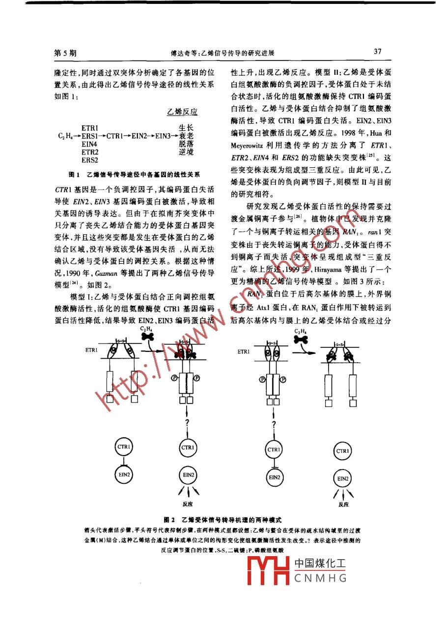 中國生物工程雜志第22卷第5期JOURNAL OF CHINESE BIOTECHNOLOGY2002年10月乙烯信號傳導的研究進展傅達奇李正國"(西南農(nóng)業(yè)大學食品科學學院重慶400716)Q94 A摘要植物內源澈素乙烯作為信號分子通過信號傳導途徑調節(jié)相關基因表達,控制植 物體的多種生理活動。乙烯信號傳導途徑中的許多基因巳被克隆定性,綜述了乙烯信號傳導途徑中的相關基因的功能及乙烯信號傳導模式。.關鍵詞乙烯基因信號傳導 調控模式乙烯作為一種內源激素調控植物多種生理轉基因康乃馨;1996年, Peeh等獲得轉基因甜活動,包括種子萌發(fā)、性別分化.器官脫落和果實瓜!”; 1995 年,中國農(nóng)業(yè)大學培育的轉基因“麗成熟等"。在植物體內,乙烯合成來源于蛋氨春"番茄品種獲得成功;1999年,葉志彪等培育得酸,ACC是乙烯合成的直接前體,合成途徑為:華番1號轉基因番茄。目前,乙烯的生物合成Mer→SAM- +ACC +CH。3個反應步驟分別由途徑及合成調控研究得較為深人,但乙烯調控基SAM合成酶,ACC合成酶,ACC氧化酶催化,3種因表達的機理尚不明確?,F(xiàn)在的觀點認為乙烯酶都由多基因家族編碼控制。ACC合成酶基因在植物體內作為信號分子存在,通過信號傳導途表達受發(fā)育階段和外界因素調控,它被認為是乙徑間接調控基因表達。近年來,遺傳學、生物化烯合成途徑中的關鍵酶,是乙烯合成的限速步學、分子生物學方法的廣泛運用使我們對乙烯的驟|21。乙烯的生物合成受外界條件影響:機械損信號傳導途徑的理解取得了巨大進步。乙烯信傷、病蟲害.干旱、水澇、CO2、IAA處理等引起乙號傳導途徑中的多個基因已被克隆定性,在此基烯合成增強, AVG、A0A. CO*、Ni*、DNP、CCCP礎上提出了多種乙烯信號傳導模式。下面就這等都能有效抑制乙烯合成!)。隨著分子生物學兩方面內容作-綜述。的發(fā)展,已從植物體內克隆了多個與乙烯合成相1三重反應表型關的基因?,F(xiàn)已從番茄中克隆了9個ACC合成酶基因,從甜瓜中克隆了5個ACC合成酶基因,黑暗環(huán)境條件下生長的黃化幼苗在乙烯存蘋果、黃瓜、香蕉、綠豆、康乃馨、矮牽牛、水稻等在的情況下,能表現(xiàn)特殊的表型變化,這種現(xiàn)象植物的ACC合成酶基因克隆也有報道'4。首先稱為“三重反應"。最典型的“三重反應"見于黃從番茄中克隆ACC氧化酶基因PTOM13,隨后在化豌豆幼苗,上胚軸和根的伸長受到抑制;上胚多種植物中都克隆了ACC氧化酶基因。我國分.軸徑向變粗;正常向地性消失,下胚軸向水平方別在哈蜜瓜、桃、中國“玉露"桃、番茄、獼猴桃中.向彎曲。擬南芥具有生長繁殖快,生長周期短,克隆了ACC氧化酶基因。在基因克隆的基礎重現(xiàn)性好等特點,常被作為模式植物通過三重反上,利用反義RNA技術控制果實成熟成為可能。應篩選突變株。1990年,Hamilto等采用反義RNA技術獲得了通研究表明,黃化幼苗的“三重反應"表型是乙過降低ACC氧化酶活性控制果實成熟的第-個烯作用的結果。乙烯誘導幼苗中相關基因表達,耐貯藏的轉基因番茄品種I51。此后,1991年,細胞伸長和細胞數(shù)量的增加受到抑制。導致“三Oller等獲得轉基因番茄'6| ;1995年,Savin等獲得重反應”表型消失的原因有兩種:一種是乙烯的生物合成受到抑制;另- -種是乙烯信號傳導途徑"通訊作者中國煤化工原理,我們可以通YHCNMHG第5期傅達奇等:乙烯信號傳導的研究進展過篩選乙烯反應突變體研究乙烯信號傳導途徑中共有5個保守區(qū)域.任何一個區(qū)域內的堿基變中的基因。目前,以擬南芥作為模式植物分離了化都可能導致ETR1 基因失活。細菌雙組分系兩種類型乙烯反應突變體:(1)不對外源乙烯作統(tǒng)中的組氨酸激酶與反應調控元件是獨立存在,出反應,包括乙烯不敏感突變體(ethylene-ETR1中的C端組氨酸激酶與信號接收區(qū)域insensitive, ein) ,抗乙烯突變體(ethylene- resistant,(receiver domain)同存在- .條多肽鏈上”。比較etr)。(2)在無外源乙烯存在下能組成型表現(xiàn)“三擬南芥和番茄受體基因的編碼蛋白發(fā)現(xiàn)N端疏重反應",包括組成型“三重反應"突變體水跨膜區(qū)域同源性為75%,組氨酸激酶區(qū)域同源(constitutive triple response ,ctr);乙烯超量產(chǎn)生突性為53%。其中, ETR1、ETR2、EIN4具有組氨酸變體(ethylene , overproduction, eto)l91 。激酶和信號接收區(qū)域兩個組分,但ERS1、 ERS2、NR缺乏信號接收區(qū)域(receiver domain)2乙烯信號傳導途徑中的相關基因乙烯與受體蛋白結合的條件,部位及機理一2.1乙烯 受體蛋白基因直都是學術界研究的熱點。全長ETR1 基因轉利用“三重反應"表型在擬南芥中鑒別了第人酵母菌株獲得轉基因酵母比野生型酵母結合-個乙烯不敏感突變體elr。突變體結合乙烯乙烯能力高100倍。截短的不含C端保留N端的能力只有野生型的1/5,在乙烯存在的條件下,的ETR1基因轉入酵母,發(fā)現(xiàn)也具有較強的乙烯不表現(xiàn)“三重反應“。把ETR1基因轉人酵母,獲結合能力,轉入N端保守區(qū)發(fā)生突變或不含N得的酵母菌株具有明顯的乙烯結合能力,野生型端的ETRI基因,獲得的轉基因酵母喪失乙烯結酵母菌株不能結合乙烯!101 ,由此推斷ETRI 基因合能力,由此可知ETR1是乙烯受體蛋白基因,為乙烯受體蛋白基因。乙烯受體蛋白由多基因乙烯與受體蛋白的結合區(qū)域為疏水的N端。另家族控制。目前,已先后從擬南芥中分離了5個外,研究還發(fā)現(xiàn)ETR1蛋白的N端165個