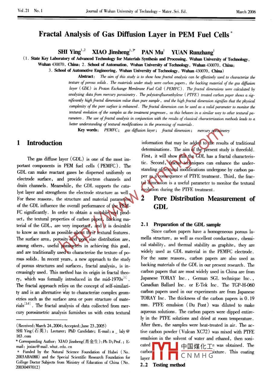 Vol 21 No IJoumal of Wuhan University of Technology-Mater. Sci.EdMarch 2006fractal Analysis of Gas Diffusion Layer in PEM Fuel CellsSHI Ying" XIAO Jinsheng PAN Mu YUAN Runzhang(1. State Key Laboratory of Advanced Technology for Materials Synthesis and Processing, wuhan University of TechnologyWuhan 430070, China; 2. School of Automation, Wuhan University of Technology, Wuhan 430070,China3. School of Automotive Engineering, Wuhan University of Technology, Wuhan 430070, ChiAbstract: The aim of this study is to show how fractal analysis can be effectiely used to characterize thetexture of porous solids. The materials under study were carbon papers, the backing material of the gas diffulayer( GDL) in Proton Exchange Membrane Fuel Cell( PEMFC). The fractal dimensions were calculatedanalyzing data from mercury porosimetry. The polytetrafluoroethylene( PTFE)treated carbon paper shous a sig-nificantly high fractal dimension ualue than pure sample, and the high fractal dimension signifies that the physicalcomplexity of the pore surface is enhanced, The fractal dimension can be used as a walid parameter to monitor theextural evolution of the samples as the treatment progresses, as this behaves in a similar way to other textural parameters. The use of fractal analysis in conjunction with the results of classical characterization methods leads to abetter understanding of textural modifications in the processing of materialsKey words: PEMFC; gas diffusion layer; fractal dimension mercury porosimetry1 Introductioninformation that may be added to the results of traditionaldeterminations. The aim of the present study is threefoldFirst, it will show that the gDl has a fractal characterisThe gas diffuse layer(GDL) is one of the most im- tic. Second, fractal techniques can enhance the underportant components in PEM fuel cells( PEMFC).TheGDL can make reactant gases be dispersed uniformly onstanding of textural modifications undergone by carbonelectrode surface, and provide electron channels and per as a consequence of PtFe treatment. Third, the fracdrain channels. Meanwhile, the GDL supports the cata- tal dimension is a useful parameter to monitor the texturalevolution during the PTFE treatmentFor these reasons, the structure and material parameters 2 Pore Distribution Measurement ofof the GDl influence the overall performance of the PEM-GDLFC significantly. In order to obtain a suitable end product, the textural properties of carbon paper, backing ma-terial of the GDL, are very important, and it is desirable 2.1 Preparation of the GDL sampleto know as much as possible about their textural featuresSince carbon papers have a homogeneous porous laThe surface area, porosity and pore size distribution are, mella structure, as well as excellent conductance, chemiamong others, useful parameters in achieving this goal, cal stability, and thermal stability as graphite, they areand are traditionally used to characterize the texture of po- widely used as GDl material in the PEMFC electroderous solids. In recent years, a new approach to the study For the same reasons, carbon papers are also used asof porous structures and surfaces, fractal analysis, is in- backing materials of the GDL in our present research.Thecreasingly used. This method has its origin in fractal theo- carbon papers that are most widely used in China are fromry, which was formally introduced in the mid-1970sJapanese TORAY Inc, German SGL technique IncThe fractal approach relies on the concept of self-similari- Canadian Ballard Inc. or E-Tek Inc. The TGP-H-060ty and is an altemative way to characterize complex georcarbon papers used in our experiments are from Japaneseetries such as the surface area or pore structure of mate- TORAY Inc. The thickness of the carbon papers is 0. 19rials(2-53. The fractal analysis of data collected from mer- mm. PTFE emulsion( Du Pont )was diluted to makeury porosimetric analysis furmishes us with extra textural aqueous solutions. The carbon papers were dipped entirely in the PTFE solutions and dried at room temperatureReceived: March 24, 2004; Accepted June 23, 2005)After then, the samples were heat-treated in air. The ac-SHI Ying(11): Lecturer: PhD Candidate: E-mail: a- laly@ tive carbon powder(Vulcan XC72)was mixed with PTFE* Corresponding Author: XIAO Jinsheng(肖金生):PhD;Pof.;Eemulsion in the solvent of water and ethanol then soni.mail, whut. edu. en中國煤化工 e was obtained.TheFunded byundation of Hubeixture. This coating2003ABA088)and the Special Scientific Research Foundation for laverCNMHGCollege Doctor Subjects from Ministry of Education of China(N20030497012)2.2 Testing methodVol 21 No. 1SHI Ying et al: Fractal Analysis of Gas Diffusion Layer in PEM Fuel CellsThe USA Quantachrome PoreMaster 33, which can try)is an important and widely used technique for thedistinguish the size to 7 nm, was used to measure the pore analysis of the pore structure of a variety of porous materi-size. In order to compare the change of pore size and pore als. It is based on the gradual intrusion of mercury into ardistribution between the pure carbon paper and the carbon evacuated pore system as an extemal pressure is applied;paper treated by PTFE, we chose the TGP-H-060 carbon increasing pressure makes smaller pores accessible to merpaper and the carbon paper with PTFE, respectively. Af- cury. The amount of mercury uptake is a function of prester fully dried for 2 h at 120 C, the samples weight was sure so that one can estimate the pore size distribution31.7954 g and 33. 7781 g, respectively, including the The amount of mercury uptake( calculate with mercurytest tube. And their pore sizes vary from 0. 2 um to 30 saturation)us pressure of carbon fiber paper is shown inFig 1, and the relationship of pore size us pore volume2. 3 Testing resultpercent is shown in Fig. 2Mercury intrusion porosimetry (or mercury porosime-020.1言004已003202530Pressure/MPaFig1 Relation between the amount of mercury uptake and the pressure drop da