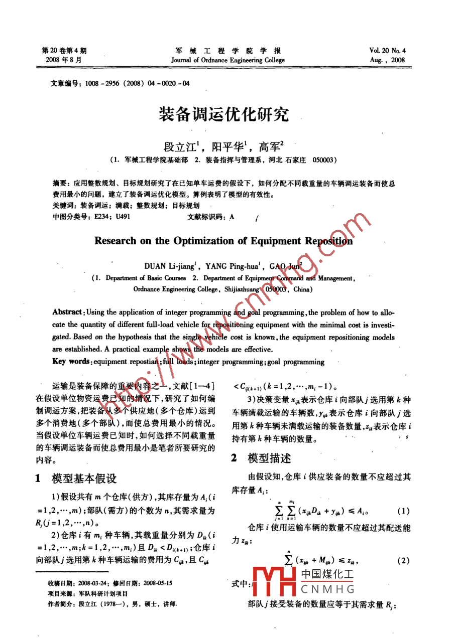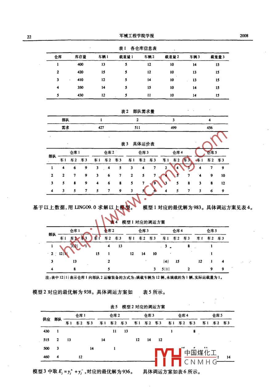 第20卷第4期軍槭工程學(xué)院學(xué)報(bào)VoL 20 No.42008年8月Joumal of Ordnance Engineering CollegeAug. , 2008文章編號(hào): 1008 -2956 (2008) 04-0020-04裝備調(diào)運(yùn)優(yōu)化研究段立江',陽(yáng)平華',高軍2(1.軍械工程學(xué)院基礎(chǔ)部2. 裝備指揮與管理系,河北石家莊050003)摘要:應(yīng)用整數(shù)規(guī)劃、目標(biāo)規(guī)劃研究了在已知單車運(yùn)費(fèi)的假設(shè)下,如何分配不同載重量的車輛調(diào)運(yùn)裝備而使總費(fèi)用最小的問題,建立了裝備調(diào)運(yùn)優(yōu)化模型。算例表明了模型的有效性。關(guān)鍵詞:裝備調(diào)運(yùn);滿載;整數(shù)規(guī)劃;目標(biāo)規(guī)劃中圖分類號(hào): E234; U491文獻(xiàn)標(biāo)識(shí)碼: AResearch on the Optimization of Equipment RepositionDUAN Li-jiang',YANG Ping-hua',GAO Jun2(1. Department of Basic Courses 2. Department of Equipment Command and Management,Ordnance Engineering College, Shijiazhuang 05003, China)Abstract:Using the application of integer programming and goal programming ,the problem of how to alloacate the quantity of different full-load vehicle for repositioning equipment with the minimal cost is investi-gated. Based on the hypothesis that the single vehicle cost is known , the equipment repositioning modelsare established. A practical example shows the models are effective.Key words :equipment repostian ;full loads ;integer programming; goal programming運(yùn)輸是裝備保障的重要內(nèi)容之一,文獻(xiàn)[1-4]0,y; =0;當(dāng)實(shí)際值未達(dá)到目標(biāo)值時(shí),有y;* =0,y; >0;當(dāng)實(shí)際值與目標(biāo)值一樣時(shí),有y;sL 2 E(xgDa+ym)≤A;=0,yj =0?,F(xiàn)假設(shè)裝備運(yùn)輸費(fèi)用最優(yōu)為第1優(yōu)先級(jí)P ,裝備供應(yīng)的偏差量為第2優(yōu)先級(jí)P2,同一級(jí)S(xa+Mu)≤u;內(nèi)的權(quán)重均為1,這樣模型1轉(zhuǎn)化為目標(biāo)規(guī)劃問題。客(aD.+yu)=R;模型3 minF =Pyxt +P:二E,0 .≥”均視為“≥" ,因此xg≥0且為整數(shù),0≤y°≤D° ,0≤yj≤D; ,i=1,2,jO,ya =0;*,m;j=1,2,.. ,n;k=1,2,.. ,m,。對(duì)模型1中的Ma =l1,ya >0。’作如下處理:引入適模型3中:當(dāng)?shù)臄?shù)e ,約束(4)變?yōu)?)偏差量y;與y;的上界可依據(jù)需求變動(dòng)的Mye≤yμ≤(Du -e)Mao(5)顯然在這種情況下,部隊(duì)接受裝備的數(shù)量等于范圍自定。文中假設(shè)D; =D; =min{號(hào)-e}.即認(rèn)其需求量,但運(yùn)輸車輛可能存在未滿載的情況。因?yàn)椴筷?duì)實(shí)際得到裝備的數(shù)量不應(yīng)超出(或可以少.此,對(duì)模型1作如下改進(jìn)。于)倉(cāng)庫(kù)最小滿載車輛載重的一。3.1滿載運(yùn)輸模型假設(shè)所選用的車輛均滿載,即2)R..1可取模型1、模型2求得的最優(yōu)值中較小的- -個(gè)或自定。模型2 minF =3)當(dāng)倉(cāng)庫(kù)存量較大且需求量可適當(dāng)調(diào)節(jié)時(shí),模型可令E;=y; +x; ;當(dāng)倉(cāng)庫(kù)量較小或裝備價(jià)值比較&t 2 ZxaDa≤A;高時(shí),模型可令E, =y; ;當(dāng)部隊(duì)的需求應(yīng)盡量滿足時(shí),模型可令E=xj。4算例xyDw≥R;下面設(shè)計(jì)-個(gè)實(shí)例:現(xiàn)假設(shè)有5個(gè)倉(cāng)庫(kù),每個(gè)倉(cāng)xμ≥0且為整數(shù),i=1,2,.. ,m;j=1,2,',n;k=1,庫(kù)均有3種不同的車輛,具體信息如表1所示;有42,* ,m;o個(gè)部中國(guó)煤化工向各部隊(duì)運(yùn)輸裝顯然在這種情況下,部隊(duì)實(shí)際接受到裝備的數(shù)備的YHCNMHG量大于等于其需求量。當(dāng)裝備緊缺或最小載重量遠(yuǎn)22軍械工程學(xué)院學(xué)報(bào)2008表1各倉(cāng)庫(kù)信息表倉(cāng)庫(kù)庫(kù)存量車輛1載重量1車輛2載重量2車輛3載重量300121014154203505430111表2部隊(duì)需求量部隊(duì)需求4279956表3具體運(yùn)價(jià)表部隊(duì)-倉(cāng)庫(kù)1倉(cāng)庫(kù)2倉(cāng)庫(kù)3倉(cāng)庫(kù)4倉(cāng)庫(kù)5車1車2車3車1車2車3車1車2車3車1車2車3車1 車2車32基于以上數(shù)據(jù),用LING09.0求解以上模型。模型 1對(duì)應(yīng)的最優(yōu)解為983。具體調(diào)運(yùn)方案見表4。表4模型1 對(duì)應(yīng)的調(diào)運(yùn)方案車1車2車3車1 車2車3車1車2車3車1車2車3車1車2車33|2| 14 133.12|1|15 112,1410335{1注:表中1211|表示倉(cāng)庫(kù)I向部隊(duì)2運(yùn)輸裝備的方式為:滿載車輛為12輛,未滿載的為1輛,實(shí)際運(yùn)載量為1。模型2對(duì)應(yīng)的最優(yōu)解為938。具體調(diào)運(yùn)方案如表5所示。.表5模型2 對(duì)應(yīng)的調(diào)運(yùn)方案供應(yīng)部隊(duì)車1車2車3車1車2車3車1車2車3 車1車2車3車1車2車3430 11113,515 2 1321412500 3中國(guó)煤化工,F(xiàn)YHCNMHG-模型3中取E,=y; +y; ,對(duì)應(yīng)的最優(yōu)解為936。具體 調(diào)運(yùn)方案如表6所示。第4期段立江等:裝備調(diào)運(yùn)優(yōu)化研究表6模型3 對(duì)應(yīng)的調(diào)運(yùn)方案供應(yīng)部隊(duì)倉(cāng)庫(kù)1倉(cāng)庫(kù)2倉(cāng)庫(kù)3倉(cāng)庫(kù)4倉(cāng)庫(kù)5車1車2車3,車1車2車3車1車2車3車1車2車3車1車2車310 23214,13500 312由算例可得:模型3對(duì)應(yīng)的調(diào)運(yùn)方案總費(fèi)用最[J].哈爾濱師范大學(xué)自然科學(xué)學(xué)報(bào),2004,20(5) :26-小;模型2求解效率最高,該模型適用于裝備數(shù)量比28.較充足的情形;模型1適用于裝備使用數(shù)量需嚴(yán)格[4]張紅偉,朱偉微,姜本超,等.運(yùn)輸生產(chǎn)中的數(shù)學(xué)模型[J].哈爾濱師范大學(xué)自然科學(xué)學(xué)報(bào),2004 ,20(6):79.控制的情