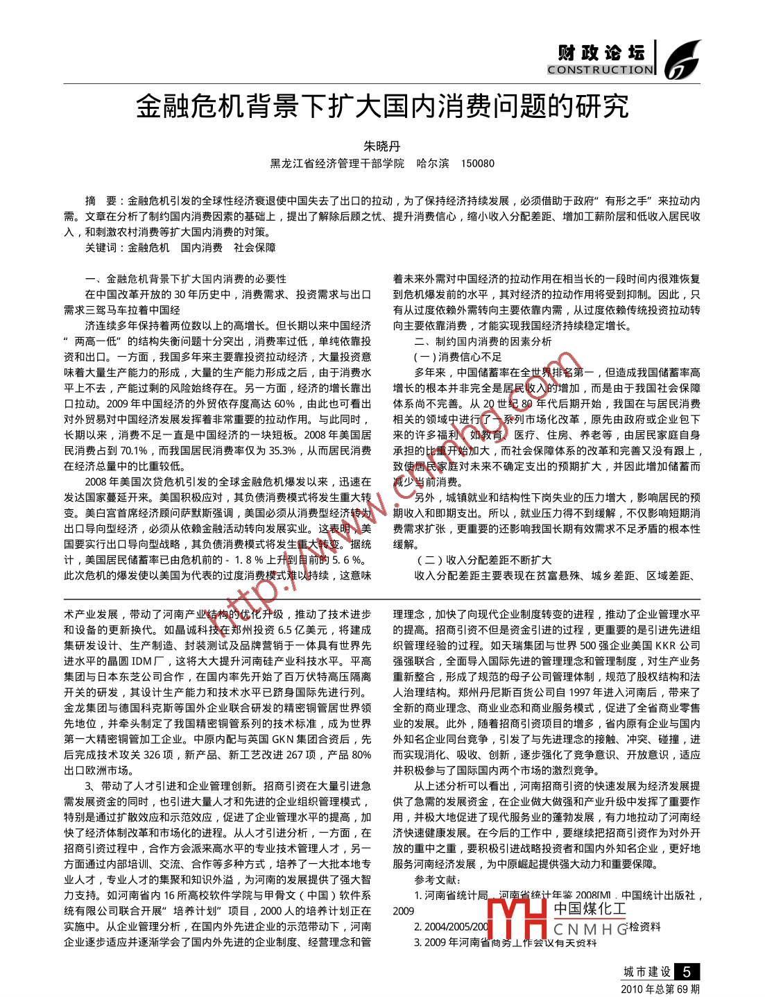 財(cái)政論壇IC ONST RUCTION .河南省招商引資的經(jīng)濟(jì)效應(yīng)分析劉忠廣河南工程學(xué)院鄭州450007摘要:近年來 ,隨著河南招商引資規(guī)模的不斷擴(kuò)大,質(zhì)量和水平的不斷提高,招商引資已成為了河南經(jīng)濟(jì)發(fā)展的重要資金來源。同時(shí),也促進(jìn)了河南現(xiàn)代服務(wù)業(yè)的快速發(fā)展,推動(dòng)了河南企業(yè)的做大做強(qiáng)和產(chǎn)業(yè)升級(jí)。關(guān)鍵詞:招商引資經(jīng)濟(jì)效應(yīng)產(chǎn)業(yè)升級(jí)近年來,在河南把開放帶動(dòng)作為加快經(jīng)濟(jì)社會(huì)發(fā)展的主戰(zhàn)略,2、促進(jìn)了商貿(mào)服務(wù)業(yè)迅速發(fā)展。1997年以來,隨著河南省第把招商引資作為發(fā)展開放型經(jīng)濟(jì)的重中之重和實(shí)施開放帶動(dòng)主戰(zhàn)略-家臺(tái) 商投資商業(yè)企業(yè)鄭州丹尼斯百貨有限公司在鄭州開業(yè),沃爾的突破口,招商引資工作-年 一個(gè)新臺(tái)階,利用境內(nèi)外資金的規(guī)?,?鄭州金水路分店、二七印象城分店和洛陽景華路分店相繼開業(yè),不斷擴(kuò)大,質(zhì)量和水平不斷提高,招商引資實(shí)現(xiàn)了超常規(guī)跨越式發(fā)家樂福 鄭州金水店、花園店、北環(huán)店也已開業(yè);麥德龍已經(jīng)進(jìn)駐鄭展,有力拉動(dòng)了河南經(jīng)濟(jì)平穩(wěn)較快發(fā)展,為促進(jìn)中原崛起做出了重東新區(qū) ,帶來了全新的”現(xiàn)購自運(yùn)”經(jīng)營模式;泰國正大集團(tuán)已經(jīng)要貢獻(xiàn)。投資2家易初蓮花超市;丹尼斯商業(yè)廣場(chǎng)、家樂福商業(yè)廣場(chǎng)、三維-、招商引資成為促進(jìn)河南經(jīng)濟(jì)發(fā)展的重要資金來源商業(yè)廣場(chǎng)等大型商業(yè)企業(yè)也已落戶焦作;開封市與香港爪哇集團(tuán)簽隨著河南招商引資工作力度的加大,大量境內(nèi)外資金的進(jìn)入約了 投資4億美元占地1079畝的大型休閑購物廣場(chǎng)項(xiàng)目;洛陽市了河南經(jīng)濟(jì)。從利用境內(nèi)外資金的總量分析,在利用境外資金方與 泰國正大集團(tuán)簽署了總投資26億元洛陽正大城市廣場(chǎng)暨市民中面,實(shí)際利用外資由2004年的8.7億美元達(dá)到2008年的40.3億美心項(xiàng)目。 隨著這些新簽重大項(xiàng)目的落地建設(shè),必將進(jìn)一步推動(dòng)河南元,增長3.6倍, 5年累計(jì)簽定外資項(xiàng)目2327個(gè),累計(jì)利用外資達(dá)的商 貿(mào)業(yè)發(fā)展,進(jìn)-步夯實(shí)河南商貿(mào)流通的基礎(chǔ)地位。110.3億美元。在利用省外資金方面,引資總額由2004年的370億3、加快了河南物流業(yè)快速發(fā)展。河南省雄踞中原腹地,是中元達(dá)到2008年的1849億元,增長4倍, 5年累計(jì)簽定省外資金項(xiàng)國鐵路、 公路、航空、信息兼具的重要綜合性交通通訊樞紐之一目16074個(gè),利用省外資金5249億元, 5年利用外資和利用省外也是中原地區(qū) 通向世界的重要門戶。日立物流株式會(huì)社成為首家進(jìn)資金累計(jì)已超過6000億元。入河南物流領(lǐng)域的世界500強(qiáng)企業(yè),美國聯(lián)邦快遞、中外運(yùn)集團(tuán)、從河南同期利用境內(nèi)外資金總額與城鎮(zhèn)固定資產(chǎn)投資規(guī)模增中遠(yuǎn)集團(tuán)、雙匯冷鏈物流等-大批國內(nèi)外知名物流企業(yè)進(jìn)入鄭州物長對(duì)比分析, 2004年- -2008 年河南實(shí)際利用境外資金年均增長流產(chǎn)業(yè)園 ,營業(yè)收入已超過100億。大力發(fā)展物流業(yè),有利于國內(nèi)46.1% ,利用省外資金年均增速50.0% ,而同期河南城鎮(zhèn)固定資產(chǎn)國際兩個(gè)市場(chǎng)產(chǎn)品、 生產(chǎn)要素的交換,也是中原崛起的基礎(chǔ)。投資年均增長37.5% ,分別高出8.6個(gè)百分點(diǎn)和12.5個(gè)百分點(diǎn),增4、提升了河南會(huì)展業(yè)發(fā)展水平。會(huì)展業(yè)是一 個(gè)集旅游、商業(yè)、速遠(yuǎn)遠(yuǎn)高于城鎮(zhèn)固定資產(chǎn)投資增長速度。從利用境內(nèi)外資金占城鎮(zhèn)物流、 通訊、餐飲、住宿等多方受益的產(chǎn)業(yè),它所帶來的人流、物固定資產(chǎn)投資的比重分析,利用境內(nèi)外資金所占比重由2004年的流 資金流和信息流,不僅可以促進(jìn)餐飲、住宿、購物等傳統(tǒng)服務(wù)18.1%達(dá)到2008 年的24.5%。因此,從數(shù)據(jù)可以看出,利用境內(nèi)業(yè)的繁榮 ,還可以刺激金融、保險(xiǎn)、物流、廣告、旅游、航空等現(xiàn)外資金已成為目前河南城鎮(zhèn)固定資產(chǎn)投資的重要來源之一, 有力地代服務(wù) 業(yè)的發(fā)展。近年來,隨著河南成功舉辦第二屆中部博覽會(huì)、拉動(dòng)了投資增長。河南國際投資貿(mào)易洽談會(huì)、紡織服裝玩具產(chǎn)業(yè)洽談會(huì)等-系列大招招商引資在拉動(dòng)全省固定資產(chǎn)投資增長的同時(shí),還間接拉動(dòng)了商 引資活動(dòng),有力地促進(jìn)了河南會(huì)展業(yè)的發(fā)展。2007 年,鄭州市河南新增工業(yè)貸款的增加。在招商引資項(xiàng)目引進(jìn)建設(shè)經(jīng)營過程中,全市展覽 面積首次超過100萬平方米,達(dá)到112萬平方米,成為我-方面,企業(yè)會(huì)因資金不足主要通過向金融機(jī)構(gòu)貸款的方式解決。國為數(shù)不多的展覽面積過百萬的內(nèi)陸城市之一。另- -方面,隨著河南招商引資引進(jìn)的一
