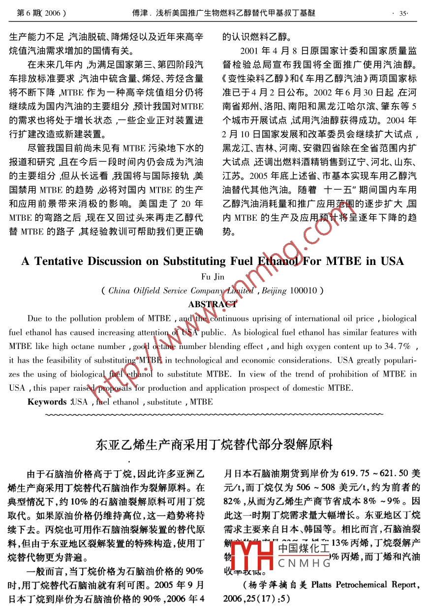 石油化工技術(shù)經(jīng)濟第22卷國內(nèi)外動態(tài)淺析美國推廣生物燃料乙醇替代甲基叔丁基醚傅津(中海油田服務(wù)股份有限公司北京100010)擿要:由于甲基叔丁基醚MTBE〕的污染問題以及囯際油價的持續(xù)高漲生物燃料乙醇越來越受到美國社會公眾的關(guān)注。生物燃料乙醇具有與MIBE相近的高辛烷值、良好的辛烷值調(diào)合效應(yīng)、含氧量高達34.7%等特性在技術(shù)和經(jīng)濟上都具有替代MTBE的可行性美國大力推廣生物燃料乙醇替代MTBE。針對美國禁用MTBE的趨勢對國內(nèi)MIBE的生產(chǎn)和應(yīng)用前景提出了發(fā)展建議關(guān)鍵詞:美國燃料乙醇替代甲基叔丁基醚自20世紀70年代石油危機以來,為了應(yīng)對20世紀90年代末期開始美國加州在湖泊石油價格急劇上漲的局面降低美國對國外石油和溪流中陸續(xù)發(fā)現(xiàn)有MIBE污染并在地下水中的依存度美國一直致力于各種各樣的汽車耗能也檢測出MTBE之后有關(guān)的爭論就開始了。加替代品研究其中包括油電兩用、天然氣、生物柴州從1997年秋季開始對MTBE及其他含氧化合油、氫燃料和乙醇等。目前美國感到要從長遠戰(zhàn)物對水資源影響進行全面調(diào)查于1998年底得出略的角度解決美國能源和污染問題,氫能源可能結(jié)論MBE對地下水和飲用水有污染如此用于是最有希望的嘗試。而從近中期的角度看燃料水處理和保健費用將每年高達30億美元。同時乙醇則可能最具吸引力。美國國土調(diào)查報告的結(jié)論也稱在全美范圍內(nèi)有27%的城區(qū)水井監(jiān)測到了MTBE。MTBE污染問1美國生物燃料乙醇替代MTBE的歷史緣由題越來越受到美國國會和社會公眾的關(guān)注美國甲基叔丁基醚MTBE)是異丁烯和甲醇在強各州紛紛采取措施逐漸減少直至禁止MTBE的使酸性陽離子交換樹脂作用下生成的一種高辛烷值用。其中緬因州已于1998年10月宣布禁用MT汽油組分其馬達法辛烷值為l0Ⅰ研究法辛烷值BEΣ添加劑。新澤西州鑒于本州環(huán)保部門已發(fā)現(xiàn)為117。在汽油組分中有良好的辛烷值調(diào)合效有400口私用井和65口公用井被MTBE污染的應(yīng)并具有很好的穩(wěn)定性和互溶性。所以汽油中事實于1999年4月12日也公開呼吁美國立法MTBE的添加作用在于它的抗爆性及含氧性。禁用汽油添加劑MTBE。美國加州于204年1美國環(huán)保局在1979年批準將MTBE作為無月1日起禁用MTBE亞利桑那州、康涅狄格州和鉛汽油添加劑使用后,MTBE被廣泛用于調(diào)和汽紐約州也尾隨其后。明尼蘇達州和內(nèi)布拉斯加州油。1990年美國國會通過空氣清凈法修正案,也通過法案減少汽油中MTBE加入量。對汽油除了要求控制蒸汽壓、苯含量外還要求含2003年4月美國參議院以67票對29票通氧汽油添加不超過2.7%(質(zhì)量分數(shù))的氧新配過了撥款75億美元挾持乙醇生產(chǎn)和禁用MTBE方汽油添加不少于2.0%(質(zhì)量分數(shù))的氧。這樣的j正家。據(jù)國可再生燃料協(xié)會報告各煉油廠為了滿足新配方汽油的含氧要求在含到中國煤化工禁止在汽油中添加和氧、新配方汽油中大量使用MTBE。過去10余年CNMHG間美國共有17個州使用新配方及含氧汽油,它收稿日期2006-0908。門的使用量一直占全美汽油消耗量的三分之作者簡介搏津女35歲經(jīng)濟師畢業(yè)于北京大學經(jīng)濟管而其中約85%使用了MTBE作為含氧化合物僅理學院。目前在中海油田股份有限公司董事會秘書辦公室約8%使用牽葧遞料乙醇作為含氧化合物第6期2006)傅津.淺析美囯推廣生物燃料乙醇替代甲基叔丁基醚使用MTBE另有5個州將在2006年內(nèi)禁用MT-汽油添加劑——乙醇、MTBE和乙基叔丁基醚BE(ETBE)調(diào)合性質(zhì)的比較。2006年2月14日美國國家環(huán)保局又頒布取消新配方汽油含氧要求的新法規(guī)法規(guī)規(guī)定全表1乙醇、MTBE、ETBE調(diào)合性質(zhì)的比較國自2006年5月6日起取消新配方汽油中含氧汽油添加劑類型乙醇 MTBE ETBE不小于2.0%的要求同時將停止已實施多年的含氧量(質(zhì)量分數(shù))%34.7318.1515.66對M'TBE有缺陷產(chǎn)品保護”這意味著繼續(xù)使用滿足含氧量2%要求所需的體積調(diào)入量%5.411.0212.79MTBE將有可能面臨訴訟的風險,該項法案的實調(diào)合蒸汽壓/MPa0.1240.0620.028施將對全面禁止使用MTBE產(chǎn)生重要的影響。辛烷值水平109.0109.0110.0隨著全美各地MBE的禁用生物燃料乙醇注辛烷值水平指RON和MON的平均值。作為MTBE的替代物逐漸成為美國新配方汽油添加的主要含氧化合物,乙醇含氧量高達35%,是些其他醚類如ETBE也可用于調(diào)和汽油MTBE理想的替代品,MTBE的禁用將大大推動ETBE的蒸汽壓低因此它比MTB更容易調(diào)合,了美國生物燃料乙醇工業(yè)的發(fā)展。但是其含氧量低要達到相同的汽油含氧量標準,從2006年5月到8月國際原油價格連續(xù)突所需調(diào)入量要高于MTBE。據(jù)美國《油氣雜志》統(tǒng)破70美元/桶最高達到75美元/桶使得美國國計現(xiàn)有的ETBE生產(chǎn)能力比MTBE要小得多供內(nèi)政界、經(jīng)貿(mào)界、消費者一度還懷疑的乙醇汽車和應(yīng)能力不足。另外除非ETBE裝置能達到目前乙醇提煉行業(yè)轉(zhuǎn)為前景看好的新能源行業(yè)之MTBE裝置的生產(chǎn)規(guī)模否則其生產(chǎn)成本要遠高克萊斯勒汽車公司在美國再生能源協(xié)會日前舉行于MTBE。甲基叔戊基醚TAME)的情況也比較的華盛