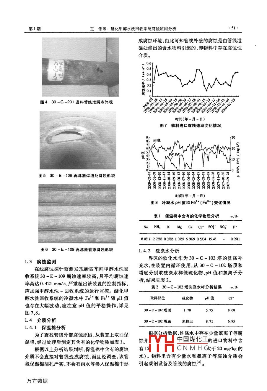 石油化工腐蝕與防專侖Corrosion& Protection in Petrochemical Industry2010,27(1)醚化甲醇水洗回收系統(tǒng)腐蝕原因分析王偉李慶梅呂慧(中國石油新疆獨山子石化公司新疆獨山子833600)摘要:對某石油化工廠碳四裝置醚化甲醇水洗回收系統(tǒng)的腐蝕原因進行了調查,通過分析腐蝕失效件的腐蝕形貌特點,檢測塔體內液體的組成,結合生產(chǎn)工藝條件初步認為失效的原因是沖刷腐蝕。根據(jù)分析結果提出了相應的設備防護對策。關鍵詞:甲醇洗滌水腐蝕原因對策中圖分類號:TQ050.9文獻標識碼:A文章編號:1007-015X(2010)01-0050-03某石化公司乙烯廠碳四裝置設計生產(chǎn)能力為圖2~6。30-C-103塔內壁有明顯減薄,擋流板5Ma,1995年8月投人運行至今,由于甲醇水洗腐蝕穿孔;30-C-102塔內壁附著大量紅褐色浮回收系統(tǒng)的管線和設備的腐蝕原因,造成裝置每年銹塔盤支撐件腐蝕脫落,液位計防護層腐蝕斷裂脫停工檢修,嚴重影響了裝置的穩(wěn)定生產(chǎn)。落;30-C-201進料線在物料的長周期沖刷過程中腐蝕失效穿孔口,發(fā)生物料泄露;30-E-109再1裝置簡介及腐蝕現(xiàn)狀沸器殼層焊縫處有明顯的腐蝕坑和裂紋,其管束有1.1加工工藝位置大量腐蝕坑和穿孔現(xiàn)象,平均每兩年更換一次管碳四醚化裝置包括脫硫加氫、一段醚化反應精芯。由于該系統(tǒng)嚴重腐蝕,造成該裝置多次非計劃餾、二段醚化反應精餾、甲醇水洗回收系統(tǒng)和丁烯性停工檢修,甚至影響到該裝置的安全生產(chǎn)。1超級精餾部分。通過脫硫、加氫反應和醚化反應,采用普通精餾及超級精餾的方法從煉油廠碳四及抽余碳四原料中獲得MTBE產(chǎn)品和高純度丁烯1產(chǎn)品。副產(chǎn)品是含正丁烷、異丁烷的剩余碳四。裝置的腐蝕主要集中在甲醇水洗精餾塔回收系統(tǒng),介質為水、甲醇;壓力為1.18MPa;溫度為40130℃;系統(tǒng)材質為20號碳鋼。碳四醚化甲醇回收系統(tǒng)工藝流程見圖1。圖2大修時碳四30-C-103塔腐蝕情況甲醇去E102冷凝物料去MAP103A/B來E-20202A/B化學污水圖1碳四醚化甲醇回收系統(tǒng)工藝流程時如0--1n2塔腐蝕情況中國煤化工1.2現(xiàn)場調查收稿CNMHG-11-16。大檢修過程中發(fā)現(xiàn)該系統(tǒng)中的塔體內壁、再沸作者簡介:王偉(1982-),男,畢業(yè)于重慶理工大學材料與工程學院現(xiàn)今在中國石油新騷獨山子石化公司研究院防器管束、塔部件及部分管線均存在嚴重的腐蝕,見腐蝕研究中心主要從事防腐研究工作第1期王偉等,醚化甲醇水洗回收系統(tǒng)腐蝕原因分析51成腐蝕環(huán)境,由此可知管線外壁的腐蝕是由管線泄漏處滲出的含水物料引起的,即物料中存在腐蝕性介質圖4C-201進料管線泄漏點外觀時間(年一月一日)圖7物料進口腐蝕速率變化情況圖530-E-109再沸器焊縫處腐蝕形貌e N時間(年-月-日圖8冷凝水pH值和Fe2·(Fe3·)變化情況表1保溫棉中含有的化學物質分析NH. K Mg Ca CI- SO:- NO Fa1228038L36556809as31545Q 011圖630一E-109再沸器管束腐蝕形貌1.4.2洗滌水分析1.3腐蝕監(jiān)測界區(qū)的軟化水作為30-C-102塔的洗滌補在線腐蝕探針監(jiān)測發(fā)現(xiàn)碳四車間甲醇水洗回充水,在裝置內循環(huán)使用,從30-c-102塔頂和收系統(tǒng)30-E-109腐蝕速率較高月平均腐蝕速塔底分別取洗滌水樣做硫化物、pH值和氯離子分率高達0.421mm/a,嚴重超出該裝置的控制指標析,結果見表2。應加強甲醇水洗一回收系統(tǒng)的運行監(jiān)控。醚化甲表230-C-102塔洗滌水樣分析結果w,%醇水洗回收系統(tǒng)的冷凝水中Fe2和Fe隨pH值取樣部位硫化物pH值也存在大幅波動,應注意pH值的平穩(wěn)操作,詳見l.788.68圖7,830-C-102塔頂5.751.4介質分析30-C-102塔底未檢出8.711.4.1保溫棉分析為了查找管線外部腐蝕原因,從裝置上取回保數(shù)據(jù)洗滌水中存在少量氯離子等腐溫棉,經(jīng)過處理后測定其含有的化學物質如表1蝕介中國煤化工的進口物料中含根據(jù)以上分析結果判斷保溫棉中含有的腐蝕有15CNMH(于20mg/kg的介質不會直接對管線造成腐蝕,而且經(jīng)調查該管水)。物料里含有少量水和氯離子等腐蝕介質會段保溫棉捆扎嚴實,不會有雨水等滲入保溫棉中形引起碳鋼設備及管線的腐蝕。石油化工腐蝕與防護第27卷2腐蝕原因統(tǒng)中循環(huán)利用,所以生產(chǎn)補水應控制無鹽水的水質可以肯定C4、甲醇和水幾種介質以任何比例及工藝?;旌蠈μ间摬馁|均不構成腐蝕,因為在反應系統(tǒng)沒(2)溶解氧的來源:洗滌補充水來自軟水區(qū)的有給設備造成腐蝕。但進入甲醇水洗回收系統(tǒng)后軟水罐,同原料甲醇罐一樣,均是常壓罐,空氣中的對碳鋼設備造成了嚴重的腐蝕,由分析結果、腐蝕氧溶解在水和甲醇中隨進料線進入甲醇水洗回收產(chǎn)物及其腐蝕特征可以推測是一種氧化和沖刷共系統(tǒng),在這里溶解氧和水構成了原電池的陰極吸氧同作用而引起的腐蝕,其最終腐蝕產(chǎn)物為紅褐色粉腐蝕條件溶解氧含量越高,腐蝕速率越快,因此應末或膠質的Fe2O3·XH2O控制進入30-C-102塔的溶解氧含量腐蝕機理在甲醇回收系統(tǒng)的設備中,與甲醇水溶液有接3控制措施及建議觸的部位,都不同程度地發(fā)生了腐蝕,腐蝕過程(1)建議對該系統(tǒng)進行工藝調查分析評估采如下:取有效措施控制進入裝置的腐蝕性介質指標,將其金屬表面與導電雜質形成原電池3:優(yōu)化指標納入操作規(guī)程控制指標。陽極(金屬表面)Fe-2e→+Fe(2)可否采取擴