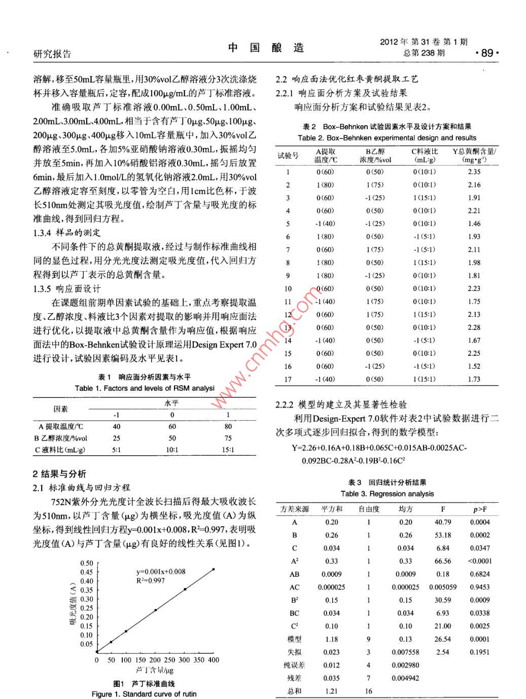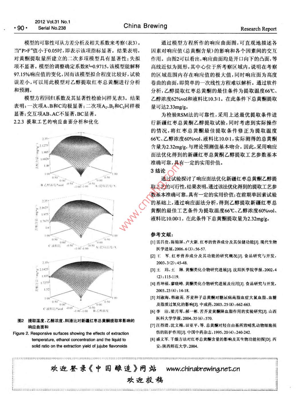 2012Vo|31No.1·88Serial No 238China brewingResearch report響應(yīng)面法優(yōu)化新疆紅棗總黃酮乙醇提取工藝趙志永,蒲彬,賀玉鳳,劉成江,吳洪斌,王俊鋼,金新文←(新疆農(nóng)墾科學(xué)院農(nóng)產(chǎn)品加工研究所,新疆石河子832000)摘要:以新疆紅棗為原料,為優(yōu)化新疆紅棗中總黃酮的乙醇提取工藝,選擇提取溫度、乙醇濃度、液料比為自變量,總黃酮含量作為響應(yīng)值,采用 Box-Behnken設(shè)計(jì)方法,研究各自變量及其交互作用對(duì)總黃醒提取量的影響。采用響應(yīng)面分析軟件,模擬得到二次多項(xiàng)式回歸方程的預(yù)測(cè)模型,并確定乙醇提取最佳工藝條件為提取溫度66℃、乙醇濃度60%vol液料比100。在此條件下,總黃酮的平均提取量為232mgg,與理論預(yù)測(cè)值基本吻合,說(shuō)明響應(yīng)面法優(yōu)化新疆紅棗總黃酮乙醇提取工藝可行關(guān)鍵詞:響應(yīng)面法:新疆紅棗:乙醇;提取工藝中圖分類號(hào):O658文獻(xiàn)標(biāo)識(shí)碼:A文章編號(hào):0254-5071(2012)01-0088-03Optimization of ethanol extraction process of total flavonoids from Xinjiang jujube by response surface methodologyZHAO Zhiyong, PU Bin, HE Yufeng, LIU Chengjiang, WU Hongbin, WANG Jungang, JIN Xinwen*(Institute of Agro-Products Processing Science and Technology, Xinjiang Academy of Agricultural andReclamation Science, Shihezi 832000, China)Abstract: To optimize the ethanol extraction of total flavonoids from Xinjiang jujube, the effects of extraction temperature, ethanol concentration, liquid to solid ratio and their interactions on the extraction yield of jujube flavonoids were studied with Box-Behnken design. The predictive polynomialquadratic equations model was developed by response surface methodology software. The optimum extraction conditions were obtained as followsextraction temperature 66C, ethanol concentration 60%vol and liquid to solid ratio 10.0. Under the optimal conditions, the extraction rate of totalflavonoids was 2. 32mg/g, which agreed well with the predictive value, indicating the optimized process was feasibleKey words: response surface methodology, Xinjiang jujube; ethanol; extraction process紅棗又稱華棗、大棗是鼠李科棗屬植物棗樹(shù)的果實(shí),1.1材料在日本、韓國(guó)也有少量種植。主要分布在北緯23°~425°紅棗:品種為駿棗購(gòu)自新疆阿克蘇市農(nóng)一師。東經(jīng)76°~124之間的廣大區(qū)域。紅棗在我國(guó)已有三千多1.2儀器與試劑年的歷史,在周代黃河流域已有成片的棗園種植。紅棗有紫外可見(jiàn)分光光度計(jì)(上海精密科學(xué)儀器有限公司百果之王”的美稱,含有糖、維生素、氨基酸、黃酮類等752N);三用電熱恒溫箱(天津市泰斯特儀器有限公司成分國(guó)。SHHW21.600AⅡ);高速離心機(jī)(上海安亭科學(xué)儀器廠近十年來(lái)紅棗在新疆百果之中嶄露頭角、發(fā)展迅猛。TGL-10B);電子天平(北京賽多利斯儀器系統(tǒng)有限公司,據(jù)資料,2010年新疆紅棗種植面積已達(dá)到400萬(wàn)畝掛果面BS23S);循環(huán)水真空泵(上海亞榮生化儀器廠,SHzⅢ);積120萬(wàn)畝,產(chǎn)量17萬(wàn)t。一躍成為繼河北、山西、山東、河旋轉(zhuǎn)蒸發(fā)器(上海亞榮生化儀器廠,RE52AA);冷凍干燥南、陜西等5個(gè)主產(chǎn)區(qū)之后的新主產(chǎn)區(qū)。再過(guò)3~5年,新疆機(jī)(北京松源華興科技發(fā)展有限公司,LGJ-18)蘆丁標(biāo)準(zhǔn)紅棗將進(jìn)入大量結(jié)果期,屆時(shí)紅棗的精深加工技術(shù)若跟品(上海碩光科技公司);亞硝酸鈉、硝酸鋁、氫氧化鈉、無(wú)不上發(fā)展形勢(shì)的話,勢(shì)必會(huì)影響紅棗產(chǎn)業(yè)的良性發(fā)展。因水乙醇等均為分析純。此,紅棗的深加工技術(shù)必然會(huì)成為影響新疆紅棗產(chǎn)業(yè)化1.3方法的關(guān)鍵技術(shù)之一13.1樣品制備黃酮類化合物又名生物類黃酮,許多研究已表明生紅棗粉碎后,過(guò)40目篩,以四分法制得樣品,于65℃烘物類黃酮具有多種生物活性。除有抗菌、消炎、抗突變、干置于干燥器內(nèi)備用。降壓、清熱解毒、鎮(zhèn)靜、利尿等作用外,在抗氧化、抗癌、防1.32紅棗總黃酮提取工藝路線癌抑制脂肪酶等方面也有顯著效果。本研究以新疆紅原料→干燥→粉碎→過(guò)篩→乙醇浸提→過(guò)濾→濾液→離心棗為試驗(yàn)原料,利用乙醇提取其中的總黃酮類物質(zhì),在課分離→濃縮→冷凍干燥→黃酮題組前期單因素試驗(yàn)的基礎(chǔ)上,通過(guò)響應(yīng)面法對(duì)提取工藝13標(biāo)準(zhǔn)曲線的繪制進(jìn)行優(yōu)化,以期為新疆紅棗精深加工技術(shù)提供理論依據(jù)。取蘆丁標(biāo)準(zhǔn)品于105℃熱風(fēng)干燥至恒重,并于干燥器1材料與方法內(nèi)冷卻至室溫。精確稱量標(biāo)準(zhǔn)品50mg加30%vol乙醇溶液收稿日期:20110712基金項(xiàng)目:新疆生產(chǎn)建設(shè)兵團(tuán)科技攻關(guān)項(xiàng)日(2010GG61)作者簡(jiǎn)介:趙志永(1981-)男,內(nèi)蒙古赤峰人,助理研究員,研究方向?yàn)檗r(nóng)產(chǎn)品加工和生物質(zhì)能源:金新文*副研究員,通訊作者。研究報(bào)告中國(guó)釀造2012年第31卷第1期總第238期·89·溶解,移至50mL容量瓶里,用30%vol乙醇溶液分3次洗滌燒2.2響應(yīng)面法優(yōu)化紅棗黃酮提取工藝杯并移入容量瓶后,定容,配成100μgmL的蘆丁標(biāo)準(zhǔn)溶液。2.2.1響應(yīng)面分析方案及試驗(yàn)結(jié)果準(zhǔn)確吸取蘆丁標(biāo)準(zhǔn)溶液0.00mL、0.50mL、1.00mL、響應(yīng)面分析方案和