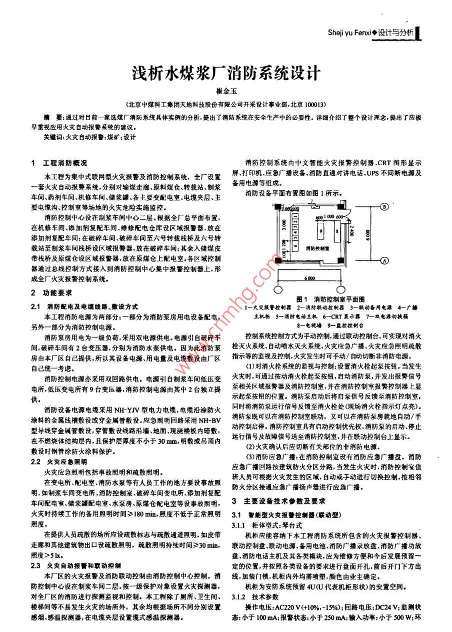 Sheji yu Fenxi◆設(shè)計(jì)與分析淺析水煤漿廠消防系統(tǒng)設(shè)計(jì)崔金玉(北京中煤科工集團(tuán)天地科技股份有限公司開采設(shè)計(jì)事業(yè)部,北京100013)摘要:通過對(duì)日前一家選煤廠消防系統(tǒng)具體實(shí)例的分析,提出了消防系統(tǒng)在安全生產(chǎn)中的必要性。詳細(xì)介紹了整個(gè)設(shè)計(jì)理念提出了應(yīng)極早重視應(yīng)用火災(zāi)自動(dòng)報(bào)警系統(tǒng)的建議關(guān)鍵詞:火災(zāi)自動(dòng)報(bào)警:煤礦;設(shè)計(jì)1工程消防概況消防控制系統(tǒng)由中文智能火災(zāi)報(bào)警控制器CRT圖形顯示本工程為集中式聯(lián)網(wǎng)型火災(zāi)報(bào)警及消防控制系統(tǒng),全廠設(shè)置屏、打印機(jī)應(yīng)急廣播設(shè)備消防直通對(duì)講電話UPS不間斷電源及套火災(zāi)自動(dòng)報(bào)警系統(tǒng)分別對(duì)輸煤走廊原料煤倉轉(zhuǎn)載站、制漿備用電源等組成車間、藥劑車間、機(jī)修車間、儲(chǔ)漿罐、各主要變配電室電纜夾層、主消防設(shè)備平面布置圖如圖1所示。要電纜溝控制室等場地的火災(zāi)危險(xiǎn)實(shí)施監(jiān)控消防控制中心設(shè)在制漿車間中心二層。根據(jù)全廠總平面布置,在機(jī)修車間、添加劑復(fù)配車間維修配電倉庫設(shè)區(qū)域報(bào)警器,放在添加劑復(fù)配車間:在破碎車間、破碎車間至六號(hào)轉(zhuǎn)載棧橋及六號(hào)轉(zhuǎn)載站至制漿車間棧橋設(shè)區(qū)域報(bào)警器,放在破碎車間;其余入儲(chǔ)煤皮防控制帶棧橋及原煤倉設(shè)區(qū)域報(bào)警器放在原煤倉上配電室各區(qū)域控制器通過總線控制方式接入到消防控制中心集中報(bào)警控制器上,形成全廠火災(zāi)報(bào)警控制系統(tǒng)2功能要求圖1消防控制室平面圖2.1消防配電及電纜線路、敷設(shè)方式1一火災(zāi)報(bào)警控制器2一消防聯(lián)動(dòng)控制器3一聯(lián)動(dòng)備用電源4廣播本工程消防電源為兩部分:一部分為消防泵房用電設(shè)備配電,主機(jī)柜5-消防電話主機(jī)6CRT罡示器7一雙電源切換稿另外一部分為消防控制電源。一電視墻9一藍(lán)控控制臺(tái)消防泵房用電為一級(jí)負(fù)荷采用雙電源供電。電源引自破碎車控制系統(tǒng)控制方式為手動(dòng)控制通過聯(lián)動(dòng)控制臺(tái),可實(shí)現(xiàn)對(duì)消火間,破碎車間有2臺(tái)變壓器分別為消防水泵供電。因?yàn)榇讼辣盟缁鹣到y(tǒng)自動(dòng)噴水滅火系統(tǒng)、火災(zāi)應(yīng)急廣播火災(zāi)應(yīng)急照明疏散房由本廠區(qū)自己提供所以其設(shè)備電源用電量及電纜敷設(shè)由廠區(qū)指示等的監(jiān)視及控制火災(zāi)發(fā)生時(shí)可手動(dòng)/動(dòng)切斷非消防電源自己統(tǒng)一考慮。(1)對(duì)消火栓系統(tǒng)的監(jiān)視與控制:設(shè)置消火栓起泵按鈕。當(dāng)發(fā)生消防控制電源亦采用雙回路供電。電源引自制漿車間低壓變火災(zāi)時(shí)可通過按動(dòng)消火栓起泵按鈕啟動(dòng)消防泵,并發(fā)出報(bào)警信號(hào)電所低壓變電所有9臺(tái)變壓器,消防控制電源由其中2臺(tái)獨(dú)立提至相關(guān)區(qū)域報(bào)警器及消防控制室并在消防控制室報(bào)控制器上顯供示起泵按鈕的位置。消防泵啟動(dòng)后將啟泵信號(hào)反饋至消防控制室,消防設(shè)備電源電纜采用NHYN型電力電纜,電纜沿涂防火同時(shí)將消防泵運(yùn)行信號(hào)反饋至消火栓處(現(xiàn)場消火栓指示燈點(diǎn)亮涂料的金屬線槽敷設(shè)或穿金屬管敷設(shè)應(yīng)急照明回路采用NHBv消防泵既可以在消防控制室聯(lián)動(dòng),又可以在消防泵房就地自動(dòng)/手型導(dǎo)線穿金屬管敷設(shè)穿管敷設(shè)線路沿墻、地面現(xiàn)澆樓板內(nèi)暗敷,動(dòng)控制啟停。消防控制室具有啟動(dòng)控制優(yōu)先權(quán)消防泵的啟動(dòng)停止在不燃燒體結(jié)構(gòu)層內(nèi)且保護(hù)層厚度不小于30m,明數(shù)或吊頂內(nèi)運(yùn)行信號(hào)及故障信號(hào)送至消防控制室并在聯(lián)動(dòng)控制臺(tái)上顯示數(shù)設(shè)時(shí)鋼管涂防火涂料保護(hù)。2)火災(zāi)確認(rèn)后應(yīng)切斷有關(guān)部位的非消防電源22火災(zāi)應(yīng)急照明(3)消防應(yīng)急廣播:在消防控制室設(shè)有消防應(yīng)急廣播盤。消防應(yīng)急廣播回路按建筑防火分區(qū)分路,當(dāng)發(fā)生火災(zāi)時(shí),消防控制室值火災(zāi)應(yīng)急照明包括事故照明和疏散照明在變電所配電室、消防水泵等有人員工作的地方要設(shè)事故照班人員可根據(jù)火災(zāi)發(fā)生的區(qū)域,自動(dòng)或手動(dòng)進(jìn)行切換控制技相鄰明如制漿車間變電所、消防控制室、破碎車間變電所添加劑復(fù)配防火分區(qū)接通應(yīng)急廣播揚(yáng)聲器進(jìn)行應(yīng)急廣播。車間配電室、儲(chǔ)漿罐配電室、水泵房、原煤倉配電室等設(shè)事故照明,3主要設(shè)備技術(shù)參數(shù)及要求火災(zāi)時(shí)持續(xù)工作的備用照明時(shí)間≥180min,照度不低于正常照明31智能型火災(zāi)報(bào)警控制器(聯(lián)動(dòng)型)照度。311柜體型式:琴臺(tái)式在提供人員疏散的場所應(yīng)設(shè)疏散標(biāo)志與疏散通道照明。如皮帶機(jī)柜應(yīng)能容納下本工程消防系統(tǒng)所包含的火災(zāi)報(bào)警控制器走廊