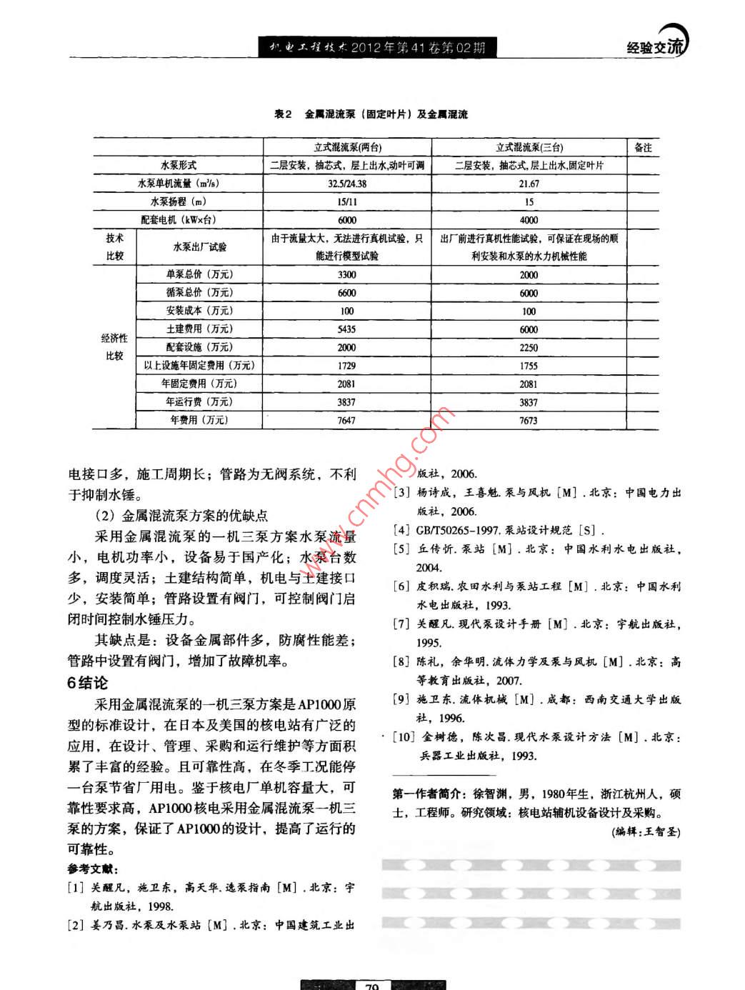 機(jī)電工程技術(shù)2012年第41卷第02期經(jīng)驗(yàn)交流DOI: 10. 3969/j. issn. 1009- -9492. 2012. 02. 020AP1000核電循環(huán)水泵選型及配置分析徐智淵',程亮2(1.中國(guó)電能成套設(shè)備有限公司,北京100011; 2.國(guó)家知識(shí)產(chǎn)權(quán)局專利局,北京100088)摘要:循環(huán)水泵與方案配置是否合理直接影響整個(gè)核電機(jī)組的熱經(jīng)濟(jì)性和安全性。從循環(huán)水泵的選型原則、方案選擇和經(jīng)濟(jì)性比較等方面,通過(guò)分析比較后給出金屬混流泵及混凝土蝸殼泵的優(yōu)缺點(diǎn),并指出這兩個(gè)技術(shù)方案各自的優(yōu)缺點(diǎn)和適用范圍。關(guān)鍵詞: AP1000核電;循環(huán)水泵;系統(tǒng)設(shè)計(jì);選型分析中圈分類號(hào): TL353文獻(xiàn)標(biāo)識(shí)碼: A文章編號(hào): 1009 - 9492 (2012)02 -0075 -05analysis of Circulating Water Pump Selection and Configurationof AP1000 Nuclear Power PlantXU Zhi-yuan', CHENG Liang(1.China Power Complete Equipment Co, Ltd, Beijing 10011,China; 2.State Inellectual Property Office of theP.R.C, Beijing 100088,China)Abstract: The proper choose of eirculating water pump model is direct lfeet the economic and security of Nuclear Power Unit. This articlegives the recommendatory scheme after comparison of metallic pump and volute pump form the spect of type choosing, scheme choiceand economy comparison, and points out the merits, defects and the pplicable scope of each scheme.Key words: AP1000 nuclear power; eirculting water pump; system design; model choosing1引言廠用水系統(tǒng)(SWS) 是非安全相關(guān),因此循環(huán)水循環(huán)水泵作為核電機(jī)組循環(huán)水系統(tǒng)的重要設(shè)泵房的設(shè)計(jì)與核安全無(wú)關(guān),按常規(guī)標(biāo)準(zhǔn)進(jìn)行設(shè)備,負(fù)責(zé)將經(jīng)過(guò)過(guò)濾的冷卻水輸送到冷凝器,保計(jì),常規(guī)設(shè)計(jì)按三十三年一遇水位設(shè)計(jì),百年- -證汽輪機(jī)排汽在凝汽器中不斷凝結(jié),帶走機(jī)組的遇水位校核。余熱。因此對(duì)于循環(huán)水泵的選型及配置的方案對(duì)2核電循環(huán)水泵常用泵型及其特點(diǎn).核電機(jī)組的安全性及經(jīng)濟(jì)性有著非常重要的作用。目前核電站循環(huán)水泵主要可分為兩大類,即某AP1000核電站循環(huán)水系統(tǒng)流程為:海生物混凝土渦殼泵(離心式泵)和金屬混流泵(包括攔截設(shè)施- >取水明渠- +泵房前池→粗格柵(附帶固定葉或動(dòng)葉可調(diào))兩種。歐洲的核電廠及采用加氯框) -→鋼閘門-→欄污柵-→鼓型旋轉(zhuǎn)濾網(wǎng)-→循歐洲核電技術(shù)的國(guó)內(nèi)廠址主要采用混凝土渦殼式環(huán)水泵-→液控蝶閥-→循環(huán)水壓力進(jìn)水管-→凝汽器的循環(huán)水泵,如大亞灣核電、 嶺澳核電、秦山核及輔機(jī)-→循環(huán)水壓力回水管-→虹吸井-→排水暗溝電等。美國(guó)、日本的核電廠多采用金屬混流式循-排水口- +排水明渠- +大海。環(huán)水泵,如日本泊3核電、臺(tái)灣龍門核電等。由.其循環(huán)水量(海水)每臺(tái)機(jī)組約為67m'/s于AP1000核電采用美國(guó)西屋的設(shè)計(jì)思路,因此在(包括常規(guī)島開式冷卻水量1m/s,及核島開式冷其標(biāo)準(zhǔn)設(shè)計(jì)中也推薦采用金屬混流式循環(huán)水泵。卻水量2m2/s),一期工程兩臺(tái)機(jī)組總海水量約為核電站循環(huán)水系統(tǒng)流量比較大,百萬(wàn)千瓦核134m/s。由于本工程核島采用西屋公司先進(jìn)的非電機(jī)組循環(huán)水量在60m/s以上,水泵揚(yáng)程通常在能動(dòng)AP1000技術(shù),核島的最終熱阱為大氣,核島10~13m左右。根據(jù)其流量特點(diǎn),電站循環(huán)水泵常收稿日期: 2011-09-2575下。1(經(jīng)驗(yàn)交流機(jī)電工程技術(shù)2012年第41卷第02期Q-n2-^40 t40 FQ-H32 F3224 t16 F\Q-NNPSH0203010Q/(m/)Q(m/)(a)離心泵(b)混流泵圖1離心泵 與混流泵性能曲線采用低速離心泵或混流泵。離心泵與混流泵的主離開此區(qū)間,泵的效率隨偏離而降低,偏離該數(shù)要性能差別": (1) 離心泵起動(dòng)功率低,Q -N曲線越大降低的越多。比轉(zhuǎn)數(shù)n,決定泵的結(jié)構(gòu),進(jìn)而沿流量方向上升;而混流泵起動(dòng)功率高,Q-N沿影響泵的效率區(qū)間,所以合理選擇泵的比轉(zhuǎn)速對(duì)流量方向下降; (2)離心泵的Q-H曲線均勻下設(shè)計(jì)選型具有重要的意義周。降,無(wú)拐點(diǎn);混流泵的Q-H曲線有拐點(diǎn); (3)離反映泵的汽蝕特征的參數(shù)為泵的汽蝕比轉(zhuǎn)數(shù)心泵-般采用閉閥啟動(dòng);混流泵-般為開閥啟動(dòng)。C%。離心泵與混流泵性能曲線如圖1所示。ce 5.62nJ0 。(2)3循環(huán)水泵選型原則NPSHN4循環(huán)水泵選型的目的是滿足供水性能需泵的人口相對(duì)流速是決定泵的汽蝕比轉(zhuǎn)數(shù)C要、安全運(yùn)行需要、安裝維護(hù)方便、制造和運(yùn)值大小的關(guān)鍵因素,泵的入口直徑越大,相對(duì)流行成本低等要求。選型的基本參數(shù)包括:輸送速越低,C值就越大,則泵的抗汽蝕性能越好。介質(zhì)的物理化學(xué)性質(zhì)、工藝參數(shù)(包括流量Q、但泵的設(shè)計(jì)要求水流通過(guò)葉輪的流速相對(duì)變化較揚(yáng)程H、轉(zhuǎn)速n、裝置汽蝕余量NPSHa等)、安小,也就是相對(duì)較高一些的人口流速可以獲得更裝條件2。好的流動(dòng)條件,有利于提高泵的效率。因而汽蝕在滿足流量、揚(yáng)程性能的條件