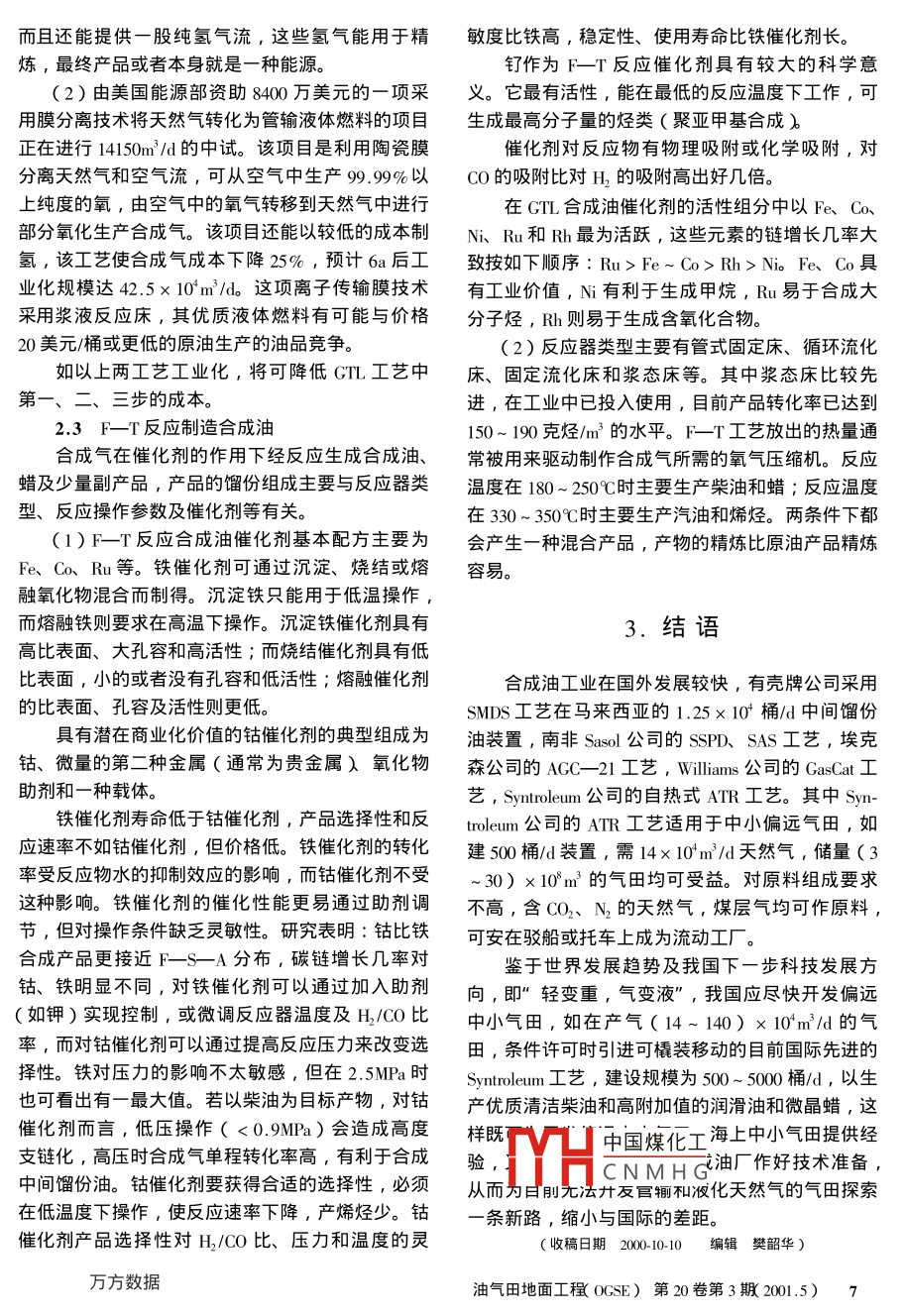 天然氣合成油技術(shù)胡宏宇周松劉晶晶(大慶油田設(shè)計院黑龍江省大慶市163712)摘要我國應(yīng)盡快開發(fā)偏遠中小氣田,主要由以下四步組成如在產(chǎn)氣(14~140)×103m3的氣田,條第一步,合成氣的制造??諝饨?jīng)過空分裝置分件許可時可引進橇裝移動的目前國際先進的出氧氣,氧氣與天然氣反應(yīng),生成一定H2/CO比Syntroleum工藝,建設(shè)規(guī)模為500~5000桶/d的合成氣裝置,以生產(chǎn)優(yōu)質(zhì)清潔柴油和高附加值的潤第二步,合成油反應(yīng)。由F一T工藝使合成氣滑油和微晶蠟,這樣既可為開發(fā)偏遠中小氣轉(zhuǎn)化成含蠟烴類和少量副產(chǎn)品。田、海上中小氣田提供經(jīng)驗,又可為我國建第三步,產(chǎn)品改質(zhì)。F一T合成的產(chǎn)品經(jīng)加氫設(shè)大型合成油廠作好技術(shù)準(zhǔn)備,從而為目前裂解或異構(gòu)化轉(zhuǎn)化成高質(zhì)量中間餾份油。無法開發(fā)管輸和液化天然氣的氣田探索一條第四步,改質(zhì)產(chǎn)品常規(guī)蒸餾。新路,縮小與國際的差距。2.2合成氣的制造主題詞天然氣合成油品需求合成氣的生產(chǎn)工藝主要有如下幾類:①蒸汽重工藝液態(tài)烴整;②部分氧化制合成氣,其優(yōu)點是比蒸汽重整投資少且效率高,但需要純氧,制氧的費用抵消了它的優(yōu)點;③部分氧化和蒸汽重整;④自熱重整工1.概述藝,其優(yōu)點是用空氣作氧化劑,成本下降,缺點是尾氣不能循環(huán),但可作為燃料利用,因此天然氣的天然氣合成液態(tài)烴技術(shù)(C)完全不同于液有效利用率不高;⑤偶合感應(yīng)等離子體(ICP)轉(zhuǎn)化天然氣技術(shù)(ING)。CIL技術(shù)是在40年代德國化工藝,可從天然氣生產(chǎn)H/CO比為0.5:1-15:1用煤經(jīng)合成氣制烴類的FT工藝上發(fā)展起來的,的合成氣。ICP系統(tǒng)產(chǎn)生合成氣的轉(zhuǎn)化效率大于它利用催化劑將以甲烷為主的天然氣經(jīng)合成氣C095%,與蒸汽甲烷轉(zhuǎn)化和部分氧化不同,它無需使+H2)轉(zhuǎn)化為一種以直鏈烴為主、包含各種分子用空氣或氧氣,因此氣體中沒有不需要的氮氣或量、在常溫下穩(wěn)定的液態(tài)烴,與高品質(zhì)的原油制品CO,,使所得合成氣能很好的與FT合成相匹配極為相似。主要優(yōu)點是運輸成本較為低廉,管輸無并可使液體燃料產(chǎn)率提高50%。ICP與常規(guī)的電弧需高壓,車運無需超低溫冷卻。另外產(chǎn)品中不含等離子體不同,它沒有電極消耗。等離子氣體(試硫、金屬、烯烴、氮,比常規(guī)石油生產(chǎn)的油品更清驗中采用CO2)在可調(diào)頻率350~450Hz下通過感潔,其最終產(chǎn)品是煉廠的中間餾份——煤油、柴油應(yīng)線圈,將氣體在<0.1s時間內(nèi)加熱到40000以和粗柴油,這些恰是目前世界需要增長迅速的油上,等離子體直接噴入反應(yīng)室,甲烷則從等離子體品。建議采用CI技術(shù),將目前許多因經(jīng)濟或技周圍引入。H/CO比例可通過蒸汽或CO2加以術(shù)原因無法動用的天然氣資源、伴生氣、放空干調(diào)節(jié)氣、煤層氣資源動用起來,讓新型、清潔、高效的合成氣制造費用占總投資、總生產(chǎn)費用的合成油發(fā)揮更大的經(jīng)濟和社會效益60%,空分裝置投資較大是個重要原因。第二步中加氫調(diào)整H2CO比例及第三步中加氫改質(zhì)所需氫2.天然氣合成油技術(shù)氣均中國煤化外又開發(fā)了兩個新工藝2.1工藝簡介CNMHG(1Jm人啦罡 Canmet能源中心正試天然氣合成油的GTL工藝因為第二步采用圖制造一種不同類型的陶瓷膜,這種膜能從氣體混T反應(yīng)工藝,又稱F—合成油工藝。合成油工藝合物中除掉氫,把甲烷的部分氧化反應(yīng)向前推進,6油氣鞠播工程OCsE)第20卷第3期201.5)而且還能提供一股純氫氣流,這些氫氣能用于精敏度比鐵高,穩(wěn)定性、使用壽命比鐵催化劑長。煉,最終產(chǎn)品或者本身就是一種能源。釕作為F—T反應(yīng)催化劑具有較大的科學(xué)意(2)由美國能源部資助8400萬美元的一項采義。它最有活性,能在最低的反應(yīng)溫度下工作,可用膜分離技術(shù)將夭然氣轉(zhuǎn)化為管輸液體燃料的項目生成最高分子量的烴類(聚亞甲基合成知正在進行14150m3/d的中試。該項目是利用陶瓷膜催化劑對反應(yīng)物有物理吸附或化學(xué)吸附,對分離天然氣和空氣流,可從空氣中生產(chǎn)99.99%以CO的吸附比對H,的吸附高出好幾倍。上純度的氧,由空氣中的氧氣轉(zhuǎn)移到天然氣中進行在GIL合成油催化劑的活性組分中以Fe、Co、部分氧化生產(chǎn)合成氣。該項目還能以較低的成本制N、Ru和h最為活躍,這些元素的鏈增長幾率大氫,該工藝使合成氣成本下降25%,預(yù)計6a后工致按如下順序:Ru>Fe~Co>Rh>Ni。Fe、Co具業(yè)化規(guī)模達42.5×l0m3/d。這項離子傳輸膜技術(shù)有工業(yè)價值,Ni有利于生成甲烷,Ru易于合成大采用漿液反應(yīng)床,其優(yōu)質(zhì)液體燃料有可能與價格分子烴,Rh則易于生成含氧化合物20美元/桶或更低的原油生產(chǎn)的油品競爭。(2)反應(yīng)器類型主要有管式固定床、循環(huán)流化如以上兩工藝工業(yè)化,將可降低GmL工藝中床、固定流化床和漿態(tài)床等。其中漿態(tài)床比較先弟、三步的成本。進,在工業(yè)中已投入使用,目前產(chǎn)品轉(zhuǎn)化率已達到2.3F-T反應(yīng)制造合成油150~190克烴/m3的水平。F—一T工藝放出的熱量通合成氣在催化劑的作用下經(jīng)反應(yīng)生