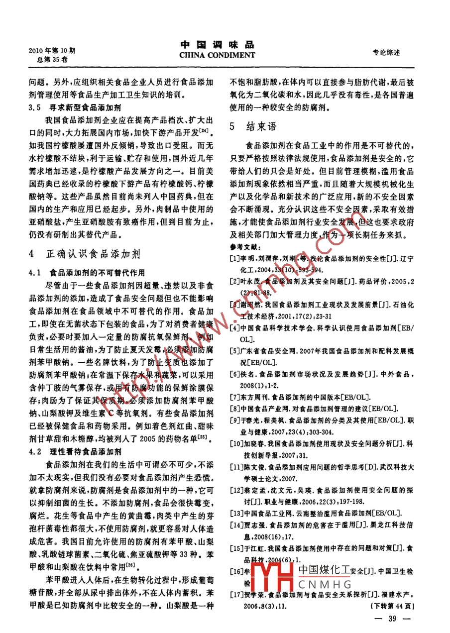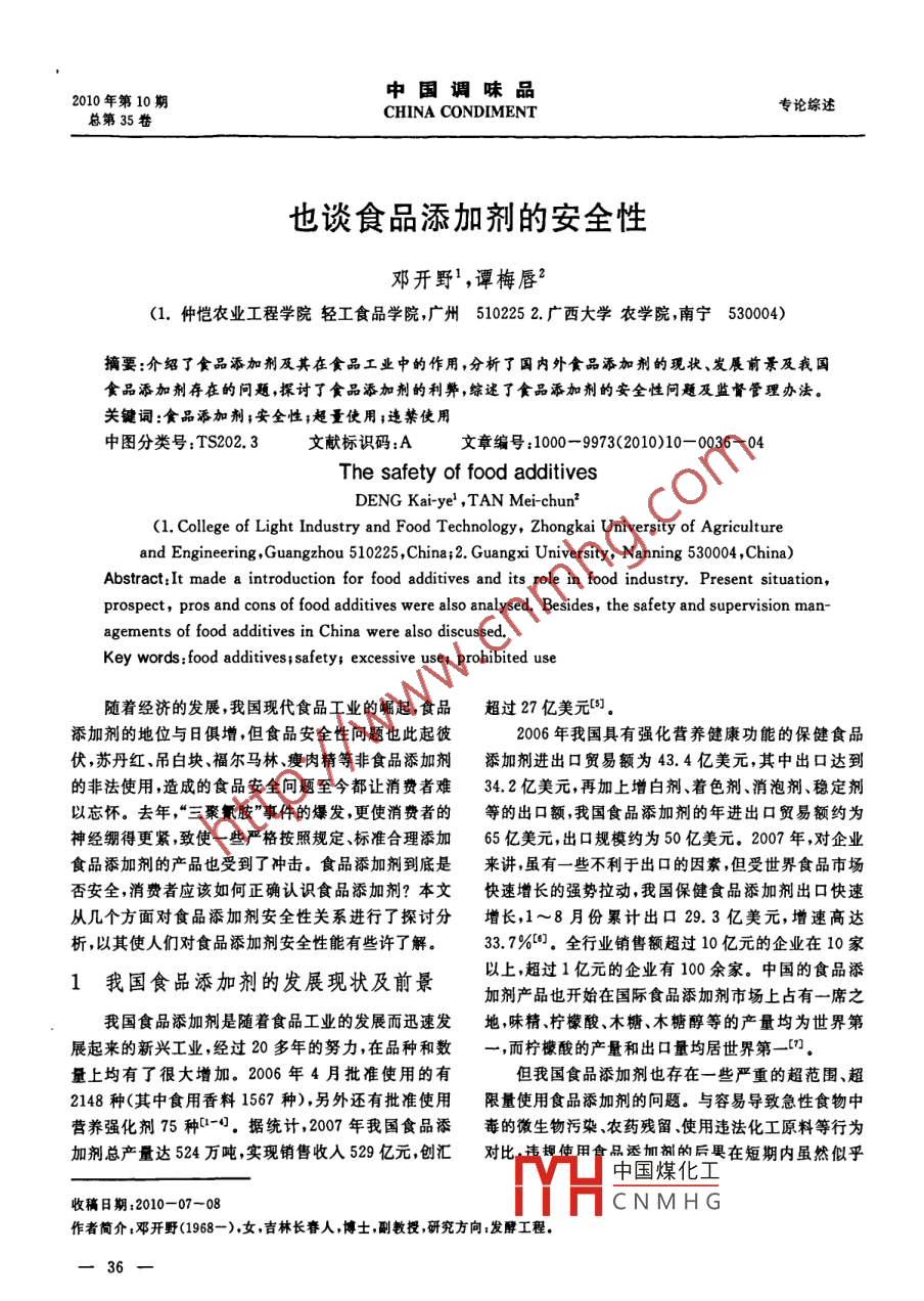 中國調(diào)味品2010年第10期CHINA CONDIMENT專論綜述總第35卷也談食品添加劑的安全性鄧開野' ,譚梅唇2(1.仲愷農(nóng)業(yè)工程學(xué)院輕工食品學(xué)院,廣州510225 2.廣西大學(xué)農(nóng)學(xué)院,南寧530004)摘要:介紹了食品添加劑及其在食品工業(yè)中的作用,分析了國內(nèi)外食品添加劑的現(xiàn)狀、發(fā)展前景及我國食品添加劑存在的問題,探討了食品添加劑的利弊,綜述了食品添加劑的安全性問題及監(jiān)督管理辦法。關(guān)鍵詞:食品添加劑;安全性;超量使用;違禁使用中圖分類號:TS202.3文獻(xiàn)標(biāo)識碼:A文章編號:1000-9973(2010)10- -0036-04The safety of food additivesDENG Kai-ye' ,TAN Mei-chun'(1. College of Light Industry and Food Technology , Zhongkai University of Agricultureand Engineering ,Guangzhou 510225 ,China;2. Guangxi University, Nanning 530004 ,China)Abstract:It made a introduction for food additives and its role in food industry. Present situation,prospect, pros and cons of food additives were also analysed. Besides, the safety and supervision man-agements of food additives in China were also discussed,Key words:food additives;safety; excessive use; prohibited use隨著經(jīng)濟(jì)的發(fā)展,我國現(xiàn)代食品工業(yè)的崛起,食品超過27億美元[5]。.添加劑的地位與日俱增,但食品安全性問題也此起彼2006年我國具有強(qiáng)化營養(yǎng)健康功能的保健食品伏,蘇丹紅、吊白塊、福爾馬林、瘦肉精等非食品添加劑添加劑進(jìn)出口貿(mào)易額為43.4億美元,其中出口達(dá)到的非法使用,造成的食品安全問題至今都讓消費者難34.2億美元,再加上增白劑、著色劑、消泡劑、穩(wěn)定劑以忘懷。去年,“三聚氰胺”事件的爆發(fā),更使消費者的等的出口額,我國食品添加劑的年進(jìn)出口貿(mào)易額約為神經(jīng)繃得更緊,致使一些嚴(yán)格按照規(guī)定、標(biāo)準(zhǔn)合理添加65億美元,出口規(guī)模約為50億美元。2007年,對企業(yè)食品添加劑的產(chǎn)品也受到了沖擊。食品添加劑到底是來講,雖有一些不利于出口的因素,但受世界食品市場否安全,消費者應(yīng)該如何正確認(rèn)識食品添加劑?本文快速增長的強(qiáng)勢拉動,我國保健食品添加劑出口快速從幾個方面對食品添加劑安全性關(guān)系進(jìn)行了探討分增長,1~8月份累計出口29.3億美元,增速高達(dá)析,以其使人們對食品添加劑安全性能有些許了解.33. 7%0。全行業(yè)銷售額超過10 億元的企業(yè)在10家1我國食品添加劑的發(fā)展現(xiàn)狀及前景以上,超過1億元的企業(yè)有100 余家。中國的食品添加劑產(chǎn)品也開始在國際食品添加劑市場上占有一席之我國食品添加劑是隨著食品工業(yè)的發(fā)展而迅速發(fā)地,味精、檸檬酸、木糖、木糖醇等的產(chǎn)量均為世界第展起來的新興工業(yè),經(jīng)過20多年的努力,在品種和數(shù)一 ,而檸檬酸的產(chǎn)量和出口量均居世界第- _c1.量上均有了很大增加。2006年4月批準(zhǔn)使用的有但我國食品添加劑也存在一些嚴(yán)重的超范圍、超2148種(其中食用香料1567種),另外還有批準(zhǔn)使用限量使用食品添加劑的問題。與容易導(dǎo)致急性食物中營養(yǎng)強(qiáng)化劑75種[1-0.據(jù)統(tǒng)計,2007年我國食品添毒 的微生物污染、農(nóng)藥殘留、使用違法化工原料等行為加劑總產(chǎn)量達(dá)524萬噸,實現(xiàn)銷售收入529億元,創(chuàng)匯對比。違規(guī)使用食品添加劑的后果在短期內(nèi)雖然似乎中國煤化工收稿日期:2010-07-08YHCNMHG作者簡介:鄧開野(1968- -),女 ,吉林長春人,博士,副教授,研究方向:發(fā)酵工程.中國調(diào)味品2010年第10期CHINA CONDIMENT專論綜述總第35卷比較輕,但長期必然危害消費者的健康、損害我國食品生,如將含甲醛成分的工業(yè)用品“吊白塊”違禁添加到添加劑行業(yè)的聲譽(yù)并影響食品工業(yè)的健康發(fā)展。因此食品中去,加工米粉加入吊白塊,可使其看上去光潔白這些問題應(yīng)該引起政府管理機(jī)構(gòu)、行業(yè)和企業(yè)的高度凈。實際上在消費者食用這些工業(yè)添加劑加工的食品重視,針對問題產(chǎn)生的原因,采取措施加以解決[8-10]。達(dá)到--定量時,必然對身體健康造成損害,嚴(yán)重的可能2我國食品添加劑現(xiàn)存的安全性問題導(dǎo)致死亡(10。去年,鬧得佛沸揚揚的三聚氰胺事件,就是在牛奶中添加了三聚氰胺,在檢測時可以提高蛋2.1濫用食品添加劑白質(zhì)的含量,但三聚氰胺進(jìn)入人體后,發(fā)生取代反應(yīng)2.1.1超量、超范圍 .違禁使用食品添加劑(水解) ,生成三聚氰酸,三聚氰酸和三聚氰胺形成大的自2008年6月1日開始施行《食品添加劑使用衛(wèi)網(wǎng)狀結(jié)構(gòu),造成結(jié)石。危及嬰幼兒泌尿系統(tǒng)。當(dāng)這些生標(biāo)準(zhǔn)》。食品添加劑使用時所允許使用的最大添加非法添加物由于濫用而暴露出問題時,人們卻往往因量。如果超過《食品添加劑使用衛(wèi)生標(biāo)準(zhǔn))中規(guī)定的最為對食品添加劑缺乏了解,在認(rèn)識上存在誤區(qū),不能正大使用量,應(yīng)按照《食品添加劑衛(wèi)生管理辦法)規(guī)定,向確區(qū)分食品添加劑與非法添加物,而是把它們混為一衛(wèi)生部提出審批。衛(wèi)生部批準(zhǔn)后方可使用,按規(guī)定使談,將責(zé)任歸結(jié)到食品添加劑身上,造成食品添加劑危用是安全的。害食品安全的錯誤觀念[1]。容易出向題