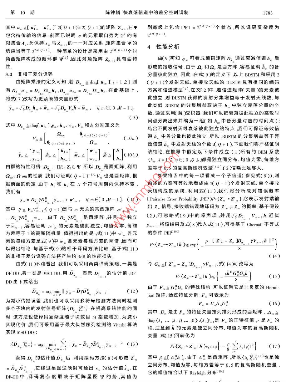 第10期電子學(xué)報(bào)Vol 33 No 102005年10月ACTA ELECTRONICA SINICA0ct.2005快衰落信道中的差分空時(shí)調(diào)制陳鐘麟喻莉朱光喜胡臻平華中科技大學(xué)電子與信息工程系湖北武漢430074摘要:利用基擴(kuò)展模型,針對(duì)平坦快衰落信道提岀了差分空時(shí)調(diào)制方法.它不僅可避免這類信道中難于實(shí)現(xiàn)的信道估計(jì)而且可同時(shí)獲得由多發(fā)射天線提供的滿空間分集以及由快衰落信道提供的最大 Doppler分集.仿真結(jié)果驗(yàn)證了設(shè)計(jì)的優(yōu)越性關(guān)鍵詞:空時(shí)碼冫差分調(diào)制;快衰落信道; Doppler分集中圖分類號(hào):T911.3文獻(xiàn)標(biāo)識(shí)碼:A文章編號(hào):0372-2112(2005)10-1781-05Differential Space-Time Modulation for Rapidly Fading ChannelsCHEN Zhong-lin YU Li ZHU Guang-xi ,HU Zhen-pingDepartment of Electronics Information Engineering, Huazhong Unicersity of Science and Technology Wuhan, Hubei 430074, ChinaAbstract: Relying on basis expansion model this paper presents a differential space-time modulation method for flat rapidlyfading channels. The design not only foregoes channel estimation being difficult in such channels but also achieves the full space diversity provided by multiple transmit antennas and the maximum Doppler diversity offered by rapidly fading channels simultaneouslySimulation results are given to support our developmentKey words: space-time code differential modulation arapidly fading channels doppler diversity引言作為改進(jìn)本文針對(duì)平坦快衰落信道提出了采用基擴(kuò)展模型(( Basis Expansion Model BEM)可獲得更大分集增益的差近年來差分空時(shí)碼受到廣泛關(guān)注1-5這是由于(1)在分空時(shí)調(diào)制方法它可看成文獻(xiàn)8中分組差分編碼技術(shù)在多接收端沒有信道狀態(tài)信息( Channel State Information,CsI)的條天線情形下的推廣,眾所周知信道的快衰落特性意味著信道件下它可確保系統(tǒng)獲得滿天線分集從而減小接收設(shè)備的實(shí)沖激響應(yīng)的時(shí)變曲線中包含較多的高頻成份,因此,當(dāng)采用現(xiàn)復(fù)雜度增加有效的傳輸帶寬〔2迕髙速移動(dòng)環(huán)境中,信道BEM對(duì)信道建模時(shí)必須采用更多旳隨杋基分量才能更精確的快衰落特性使得信道估計(jì)變得異常困難地描述信道ν.由于這些隨機(jī)基分量彼此獨(dú)立所以可提供新在以往的差分空時(shí)調(diào)制 Differential Space- Time modulation,的自由度和分集來源(即 Doppler分集).基于以上分析,提出DsTM汧究中通常假定信道具有慢衰落特性-5].但在快衰了內(nèi)嵌(解)交織器模塊的差分空時(shí)調(diào)制方法 BDSTA(BEM落條件下這些設(shè)計(jì)的性能急劇下降6.為克服時(shí)間選擇性 based Differential Space- Time Modulation)通過采用交織器可以褒落帶來的不利影響Z,Li首先設(shè)計(jì)了雙差分空時(shí)分組碼在獨(dú)立衰落的時(shí)間點(diǎn)上利用不同的發(fā)射天線輸出編碼矩陣的[6]它的譯碼結(jié)構(gòu)相對(duì)簡(jiǎn)單但由于每次差分檢測(cè)都將在判信號(hào)使得 BDSTM不僅可獲得滿空間分集增益,還可利用決信號(hào)中引入噪聲因而帶來功率損失瀉與CSI已知的相干檢 Doppler分集進(jìn)一步提高系統(tǒng)性能.測(cè)比較其性能下降約為6dB. Schober采用按符號(hào)周期變化的本文第二部分介紹系統(tǒng)模型;第三部分講述差分空時(shí)編信道模型計(jì)對(duì)差分酉空時(shí)調(diào)制 Differential Unitary Space-rime譯碼方法涕四部分給岀了性能分析第五部分是仿真結(jié)果;Modulation dustm)2提出了基于多符號(hào)檢測(cè)的差分檢測(cè)器最后總結(jié)全文( Multiple- Symbol- Detection-based Differential Detector, MSD-DD)和符號(hào)表示冽矢量(矩陣)用粗體的小寫(大寫序母表示復(fù)雜度更低的判決反饋差分譯碼器( Decision- Feedback differ-上標(biāo)T、*、H分別表示矩陣的轉(zhuǎn)置、復(fù)共軛、復(fù)共軛轉(zhuǎn)置ntial Decoder DE-DD)7.不論是MsD-DD還是DF-DD接收端diag[d1d2…dn丁表示MxM的對(duì)角方陣其主對(duì)角元必須預(yù)先獲知信道衰減及加性噪聲的二階統(tǒng)計(jì)量實(shí)用中這素由元素d1,d2灬,,du決定.I表示M×M的單位矩陣Ⅱ、樣的要求通常難于滿足在這些改進(jìn)方案中6)系統(tǒng)可獲得Ⅱ分別表示交織器、解交織器對(duì)應(yīng)的線性變換方陣「a表的最大分集增益僅取決于收發(fā)天線數(shù)的乘積示不小于a的最小整數(shù)[a,b]a≤b)表示整數(shù)集合,它的1782電子學(xué)報(bào)2005年元素x滿足不等式a≤x≤b.hn將取一組新的數(shù)值2信道模型在接收端解復(fù)用器輸入取樣信號(hào)x(n)輸出x(n)和x(n).它們經(jīng)串并轉(zhuǎn)換后分別形成P×1的列矢量x1和為敘述簡(jiǎn)單僅考慮雙發(fā)射天線、單接收天線的情形參x2x1+14xjj∈[0,P-1J=12)令w1A[u(0)見圖1)設(shè)系統(tǒng)的傳輸數(shù)據(jù)率為Rb星圖調(diào)制符號(hào)n(2)灬(N-2)w2A[(1),n(3)灬,n(N-1),Datsn-取自( cardinality為2"的集合A,在發(fā)射端,n)被分盤diah10),h(2)灬…h(huán)(N-2)],D2dagh1),h3)組后生成P×1的列矢量s(k)[sk)]4s(AP+n-1k≥0n∈[I,P]).差分編碼器輸入s(k)輸出兩個(gè)P×1列矢h(N-1)]信道模型(1)可表示為如下矢量形式量u(k)和u、k).由于系統(tǒng)把矢量對(duì){u(k),u、k)作為獨(dú)√pDu(i=12)(3)立的處理單元因此在以下表述中將省略標(biāo)號(hào)k,1、n2經(jīng)令h盤[h0灬hi=12).根據(jù)BEM我們有深度為M的交織器處理后形成兩個(gè)Px1的列矢量u