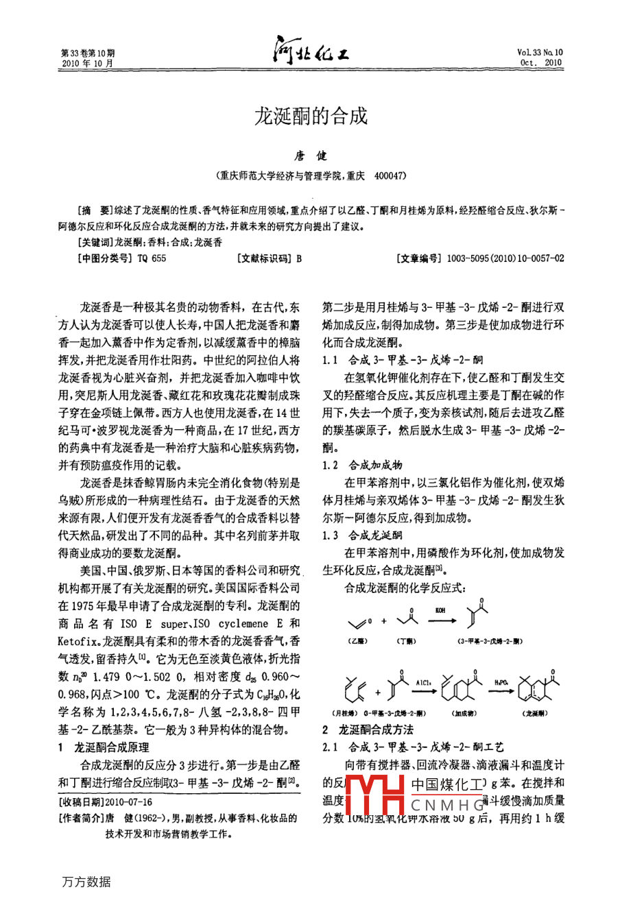第33卷第10期河北化工VoL33 Na 102010年10月0ct. 2010龍涎酮的合成唐健(重慶師范大學(xué)經(jīng)濟(jì)與管理學(xué)院,重慶40047)[摘要]綜述了龍涎酮的性質(zhì) 、香氣特征和應(yīng)用領(lǐng)域,重點介紹了以乙醛.丁酮和月桂烯為原料,經(jīng)羥醛縮合反應(yīng)、狄爾斯-阿德爾反應(yīng)和環(huán)化反應(yīng)合成龍涎酮的方法,并就未來的研究方向提出了建議。[關(guān)鍵詞]龍涎酮;香料;合成:龍涎香[中圖分類號] TQ 655[文獻(xiàn)標(biāo)識碼] B[文章編號] 1003-5095 (2010) 10-0057-02龍涎香是一-種極其名貴的動物香料,在古代,東第二步是用月桂烯與3-甲基-3-戊烯-2-酮進(jìn)行雙方人認(rèn)為龍涎香可以使人長壽,中國人把龍涎香和麝烯加成反應(yīng),制得加成物。第三步是使加成物進(jìn)行環(huán)香一起加入薰香中作為定香劑,以減緩蔑香中的樟腦化而合成龍涎酮。揮發(fā),并把龍涎香用作壯陽藥。中世紀(jì)的阿拉伯人將1.1 合成3-甲基-3-戊烯-2-酮龍涎香視為心臟興奮劑,并把龍涎香加入咖啡中飲在氫氧化鉀催化劑存在下,使乙醛和丁酮發(fā)生交用,突尼斯人用龍涎香、藏紅花和玫瑰花花瓣制成珠叉的羥醛縮合,反應(yīng)。其反應(yīng)機(jī)理主要是丁酮在堿的作子穿在金項鏈上佩帶。西方人也使用龍涎香,在14世用下,失去一個質(zhì)子,變?yōu)橛H核試劑,隨后去進(jìn)攻乙醛紀(jì)馬可●波羅視龍涎香為-種商品,在17世紀(jì),西方的羰基碳原子,然后脫水生成3-甲基-3-戊烯-2-的藥典中有龍涎香是一種治療 大腦和心臟疾病藥物,酮。并有預(yù)防瘟疫作用的記載。1.2 合成加成物龍涎香是抹香鯨胃腸內(nèi)未完全消化食物(特別是在甲苯溶劑中,以三氯化鋁作為催化劑,使雙烯烏賊)所形成的一種病理性結(jié)石。由于龍涎香的天然體月桂烯與親雙烯體3-甲基-3-戊烯-2-酮發(fā)生狄來源有限,人們便開發(fā)有龍涎香香氣的合成香料以替爾斯-阿德爾反應(yīng),得到加成物。代天然品,研發(fā)出了不同的品種。其中名列前茅并取1.3 合成龍涎酮得商業(yè)成功的要數(shù)龍涎酮。在甲苯溶劑中,用磷酸作為環(huán)化劑,使加成物發(fā)美國、中國、俄羅斯、日本等國的香料公司和研究生環(huán)化反應(yīng),合成龍涎酮。機(jī)構(gòu)都開展了有關(guān)龍涎酮的研究。美國國際香料公司合成龍涎酮的化學(xué)反應(yīng)式:在1975年最早申請了合成龍涎酮的專利。龍涎酮的Ko商品名有ISO Esuper.ISO cyclemene E和Ketofix.龍涎酮具有柔和的帶木香的龍涎香香氣,香(乙酯)(T南)(3-甲基-3-戊端-2-酬)氣透發(fā),留香持久”。它為無色至淡黃色液體,折光指數(shù)n3° 1.479 0~1.502 0,相對密度ds 0.960~0.968,閃點>100 C.龍涎酮的分子式為CH2O,化ef世二學(xué)名稱為1,2,3,4,5,6,7,8- 八氫-2,3,8,8- 四甲(月桂姆) 0-甲基-0婚-2-刪)(加成物)(龍涎制)基-2-乙?;?。它一-般為 3種異構(gòu)體的混合物。2龍涎酮合成方法1龍涎酮合成原理2.1 合成3-甲基-3-戊烯-2-酮工藝合成龍涎酮的反應(yīng)分3步進(jìn)行。第-步是由乙醛向帶有攪拌器、回流冷凝器、滴液漏斗和溫度計和丁酮進(jìn)行縮合反應(yīng)制取3-甲基-3-戊烯-2-酮。的反中國煤化工g苯。在攪拌和[收稿日期]2010-07-16溫度CN M H斗緩慢滴加質(zhì)量[作者簡介]唐健 (1962-),男,副教授,從事香料、化妝品的分?jǐn)?shù)1U%的氫氧化鉀水路液5U g后,再用約1 h緩技術(shù)開發(fā)和市場營銷教學(xué)工作。.58*河北化工第10期慢滴加質(zhì)量分?jǐn)?shù)40%乙醛330 go加料完畢后,在溫度精、香皂香精和化妝品香精的配制,可作為變調(diào)劑使為30 C條件下繼續(xù)攪拌反應(yīng)3 h,即結(jié)束反應(yīng)。用。由于龍涎酮兼具紫羅蘭香氣,并可以給花香型香用質(zhì)量分?jǐn)?shù)10%的乙酸水溶液將反應(yīng)混合物中精增強(qiáng)香氣和賦予動物香香韻,尤其適用于香水香精和至pH值為7,并用蒸餾水洗滌,再通過常壓蒸餾回的調(diào)配,在配方中的質(zhì)量百分含量可以高達(dá)10%日。另收苯,然后進(jìn)行減壓蒸餾,收集63 C/6. 57 kPa餾外,龍涎酮對提高煙草的香氣品質(zhì)有極佳的效果,可份,可以得到約100 g3-甲基-3-戊烯-2-酮淡黃,以用它調(diào)配煙用香 精以用于煙草的加香。色透明液體。合成龍涎酮的關(guān)鍵中間體為月桂烯,不僅可以用2.2合成加成物工藝石油化工產(chǎn)品中的Cs烯烴制取,也可以從月桂葉油、向裝有攪拌器、溫度計和回流冷凝器的反應(yīng)器馬鞭草油、蛇麻油、黃柏油等中提取月桂烯,更能夠利中,加入100 g3-甲基-3-戊烯-2-酮、140 g月桂用松節(jié)油所含的β-蒎烯進(jìn)行熱裂解開環(huán),從而經(jīng)濟(jì)烯.11 g三氯化鋁和300 g甲苯。保持反應(yīng)溫度40~地制取月桂烯同。50 C條件下攪拌反應(yīng)6 h,即結(jié)束反應(yīng)??傻玫郊s總之,利用月桂烯合成龍涎酮是經(jīng)濟(jì)可行的。同160 g加成物。時還需要改進(jìn)龍涎酮合成工藝,一是研究利用陽離子.3合成龍涎酮工藝交換樹脂替代無機(jī)酸(磷酸)作為催化劑,以減小環(huán)境污染,二是研究進(jìn)一步提高合成反應(yīng)中香氣強(qiáng)度大的中,加入160 g加成物.50 g 85%磷酸和250 g甲苯。龍涎酮異構(gòu)體的收率,使龍涎酮合成工藝更加完善。攪拌加熱,在保持溫度70~80 C條件下攪拌反應(yīng)參考文獻(xiàn)3~4 h,即結(jié)束反應(yīng)。[1]愈福良日用化工原料手冊[M].北京:中國輕工業(yè)出版社,1994.將反應(yīng)混