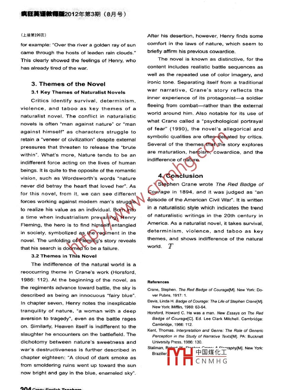 瘋狂&語教師放2012年第3期(8月號)An Analysis of Stephen Crane'sThe Red Badge of Courage李楠(黃淮學(xué)院,河南駐馬店463000)Abstract: The Red Badge of Courage. the masterpiece of Stephen Crane, was“an episode of theAmerican Civil War". It is written in a naturalistic style which indicates the trend of natu-ralistic writings in the 20th century in America. As a naturalist novel, it takes survival,determinism, violence, and taboo as key themes, and shows indifference of the naturalworld.Key words: Stephen Crane, The Red Badge of Courage, naturalism, indiference of the nature[中圖分類號] 106[文獻(xiàn)標(biāo)識碼] A[文章編號] 1006-2831(2012)08-0198-3 doi:10.3969/j.issn.1006-2831 .2012.03.054The Red Badge of Courage is a warfascinated with issues of Century Magazinenovel by American author Stephen Cranethat were largely devoted to famous battles and(1871~1900). Taking place during the Americanmilitary leaders from the Civil War (Davis, 1998:Civil War, the story is about a young private of63). Frustrated with the dryly written stories,the Union Army, Henry Fleming, who flees fromCrane stated, "I wonder that some of thosethe field of battle. Overcome with shame, hefellows don't tell how they felt in those scraps.longs for a wound--a“red badge of courage"-They spout enough of what they did, but they'reto counteract his cowardice. When his regimentas emotionless as rocks." Returning to theseonce again faces the enemy, Henry acts as amagazines during subsequent visits to thestandard-bearer. It is a great work which is bothstudio, he decided to write a war novel. He laterreadable and worthy studying, and it has beenstated that he "had been unconsciously workingcalled "the first modern war novel".the detail of the story out through most of hisboyhood" and had imagined "war stories ever1. Introduction of the Authorsince he was out of knickerbockers" (Davis,Stephen Crane published his first novel-1998: 64).Maggie: A Girl of the Streets in March 1893At the time, Crane was intermittentlyat the age of 21. Maggie was not a success,employed as a free-lance writer, contributingeither financially or critically. Most criticsarticles to various New York City newspapers.thought the unsentimental Bowery tale crudeHe began writing what would become Theor vulgar, and Crane chose to publish the workRed Badge of Courage in June 1893, whileprivately after it was repeatedly rejected foliving with his older brother Edmund in Lakepublication (Stallman, 1968: 70-71). CraneView, New Jersey. Crane conceived the storyfound inspiration for his next novel whilefrom the中國煤化工19 private whospending hours lounging in a friend's studio inis at firsi:YHCN MH Gns of the glorythe early summer of 1893. There, he becameof war, only to become disillusioned by war's收稿日期: 2012-4-12;修改稿: 2012-5-8 5198 Crazy English Teachers研究reality. He took the private's surname,“Fleming",all his literary heroes are depicted with strongfrom his sister-in-law's maiden name. He wouldnaturalistic features. He always explored in hislater relate that the first paragraphs came toworks for unique writing techniques and hishim with“every word in place, every comma,work influenced later writers greatly, so he wasevery period fixed". Working mostly nights, hecalled“the forerunner of American naturalism".wrote from around midnight until four or fiveThe words and expressions in his work are justin the morning. Because he could not afford asimple but vivid. His writings were reflection oftypewriter, he carefully wrote in ink on legal-the environment and social reality of the newsized paper, occasionally crossing through orcontinent during or after the Civil War.overlying a word. If he did change something,2.1 Naturalistic Feature of Characteristicshe would rewrite the whole page. He laterThe characters in naturalistic novelsmoved to New York City, where he completedare more or less similar to each other. Theirthe novel in April 1894.attempts at exercising free will or choice arehamstrung by forces beyond their control.2. Naturalistic Writing Style ofIn this novel, Henry Fleming is just a typicalthe Novelcharacter of this kind. Coming from the country,The Red Badge of Courage, thehis life was governed by the Army. No glorifiedmasterpiece of Crane, was“an episode of thepatriots, brave soldiers and heroes can beAmerican Civil War". It has a distinctive styleeasily found in this naturalistic work, instead,which is often described as naturalistic, realistic,we can see only real human-beings with theirimpressionistic or a mixture of the three (Crane,true feelings and fear. So the young boy- -also1917: 1). in which the naturalistic style is thea soldier fight and flee in the battle fieid withoutmost important one. It is written in a naturalistica clear aim, but only instinct and passion thatstyle which indicates the trend of naturalisticdominated Henry's each actions.writings in the 20th century in America. We can2.2 The Combination of Impressionisticidentify this novel as a typical naturalistic one .and Naturalistic StyleThe term "naturalism” describes a typeIn this novel, Crane uses the techniquesof literature that attempts to apply scientificof Impressionism to express his naturalisticprinciples of objectivity and detachment toattitude. Crane successfully conveys to theits study of human beings. In many ways,reader his pessimistic views of Naturalismnaturalism grew out of the foundations laid bythrough the employment of words of colors, theearlier realist writers, leading some to call itpanoramic rendition and the hero's changingan“emphasized realism". But, unlike realism,impressions of the American Civil War and thewhich focuses on literary technique, naturalismworld in which he lives. The author used thirdimplies a philosophical position: for naturalisticperson narrating the story, but for us readerswriters,since human beings are, in Emileit is quite easy to feel what the hero feels, andZo