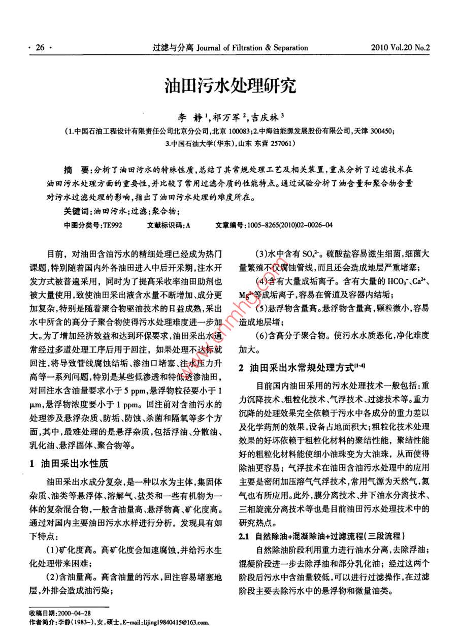●26●過濾與分離Jourmal of Filtration & Separation2010 Vol.20 No.2油田污水處理研究李靜',祁萬(wàn)軍",吉慶林3(1.中國(guó)石油工程設(shè)計(jì)有限責(zé)任公司北京分公司,北京10083;2.中海 油能源發(fā)展股份有限公司,天津300450;3.中國(guó)石油大學(xué)(華東),山東東營(yíng)257061)摘要:分析了 油田污水的特殊性質(zhì) ,總結(jié) 了其常規(guī)處理工藝及相關(guān)裝置,重點(diǎn)分析 了過濾技術(shù)在油田污水處理方面的重要性,并比較了常用過濾介質(zhì)的性能特點(diǎn)。通過試驗(yàn)分析了油含量和聚合物含量對(duì)污水過濾處理的影響,指出了油田污水處理的難度所在。關(guān)鍵詞:油田污水;過濾;聚合物;中團(tuán)分類號(hào):TE992文獻(xiàn)標(biāo)識(shí)碼:A文章編號(hào): 1005- 8265/2010)02-0026-04目前,對(duì)油田含油污水的精細(xì)處理已經(jīng)成為熱門(3)水中含有SO子。硫酸鹽容易滋生細(xì)菌,細(xì)菌大課題,特別隨著國(guó)內(nèi)外各油田進(jìn)入中后開采期,注水開量繁殖不僅腐蝕管線,而且還會(huì)造成地層嚴(yán)重堵塞;發(fā)方式被普遍采用,同時(shí)為了提高采收率油田助劑也(4)含有大量成垢離子。含有大量的HCO3、Ca?*、被大量使用,致使油田采出液含水量不斷增加、成分更Mg”°等成垢離子,容易在管道及容器內(nèi)結(jié)垢;加復(fù)雜,特別是隨著聚合物驅(qū)油技術(shù)的8益成熟,采出(5)懸浮物含量高。懸浮物含量高,顆粒微小,容易水中所含的高分子聚合物使得污水處理難度進(jìn)一-步加造成地層堵;大。為了增加經(jīng)濟(jì)效益和達(dá)到環(huán)保要求,油田采出水通(6)含高分子聚合物。使污水水質(zhì)惡化,凈化難度常經(jīng)過多道處理工序后用于回注,如果處理不達(dá)標(biāo)就加大?;刈?將導(dǎo)致管線腐蝕結(jié)垢、滲油口堵塞、注水壓力升2油田采出水常規(guī)處理方式1-4高等一系列問題,特別是某些低滲透和特低透滲油田,對(duì)回注水含油量要求小于5 ppm,懸浮物粒徑要小于1目前國(guó)內(nèi)油田采用的污水處理技術(shù)一般包括:重μm,懸浮物濃度要小于1 ppm?;刈⑶皩?duì)含油污水的力沉降技術(shù)、粗?;夹g(shù)、氣浮技術(shù)、過濾技術(shù)等。重力處理涉及懸浮雜質(zhì)、防垢、防蝕、殺菌和隔氧等多個(gè)方沉降的處理效果完全依賴于污水中各成分的重力差以面,其中,最難處理的是懸浮雜質(zhì),包括浮油、分散油、及化學(xué)藥劑的效果,設(shè)備占地面積大;粗?;夹g(shù)處理效果的好壞依賴于粗?;牧系木劢Y(jié)性能,聚結(jié)性能乳化油、懸浮固體、聚合物等。好的粗粒化材料能使細(xì)小油珠變?yōu)榇笥椭?,從而使?油田采出水性質(zhì)除油更容易;氣浮技術(shù)在油田含油污水處理中的應(yīng)用油田采出水成分復(fù)雜,是一一種以水為主體,集固體主要是密閉加壓溶氣氣浮技術(shù),常用氣源為天然氣,氮雜質(zhì)、油類等懸浮體、溶解氣、鹽類和一些有機(jī)物為一氣也有所應(yīng)用。 此外,膜分離技術(shù)、井下油水分離技術(shù)、體的復(fù)雜混合物,一般含油量高、懸浮物高、礦化度高。三相旋流分離技術(shù)等也是目前油田污水處理技術(shù)中的通過對(duì)國(guó)內(nèi)主要油田污水水樣進(jìn)行分析,發(fā)現(xiàn)具有如研究熱點(diǎn)。.下特點(diǎn):2.1自然除油+混凝除油+過濾流程(三段流程)(1)礦化度高。高礦化度會(huì)加速腐蝕,并給污水生自然除油階段利用重力進(jìn)行油水分離,去除浮油;化處理帶來(lái)困難;混凝階段進(jìn)-步去除浮油和部分乳化油;經(jīng)過這兩個(gè)(2)含油量高。高含油量的污水,回注容易堵塞地階段后污水中含油量較低,可以進(jìn)行過濾操作,在過濾層,外排會(huì)造成油污染;階段主要去除污水中的懸浮物和微量油類。收稿日期:2000 04-28作者簡(jiǎn)介:李靜(1983-),女,碩士,E-mail:1jing19840415@163.com.2010 Vol.20 No.2過濾與分離Jourmal of Filtration & Separation●27●該流程形成于油田開發(fā)初期,其特點(diǎn)是適應(yīng)性強(qiáng),技術(shù)具有處理精度高、運(yùn)行成本較低、占地面積小、結(jié)廢水含油量變化幅度較大時(shí),一般也能滿足回注所需構(gòu)緊湊 、消耗小、容易實(shí)現(xiàn)生產(chǎn)的自動(dòng)化操作和連續(xù)化水質(zhì)的要求,但該流程所需的構(gòu)筑物比較多。后來(lái)形成操作等優(yōu)點(diǎn),而且對(duì)油田污水中的懸浮物處理效果很的不同處理流程,都是在此基礎(chǔ)上完善、發(fā)展起來(lái)的。好,因而一直是油田采用的污水深度處理技術(shù)和研究2.2混凝除油+過濾流程(兩段流程)熱點(diǎn),隨著理論水平和硬件設(shè)備的不斷完善,過濾技術(shù)隨著混凝技術(shù)的提高,利用高質(zhì)量的破乳劑可將取得了長(zhǎng)足進(jìn)步。經(jīng)過一次混凝除油處理后的污水含油量控制100 ppm過濾技術(shù)作為油田含油污水處理的重要手段,在以下,于是對(duì)原來(lái)的三段流程進(jìn)行簡(jiǎn)化,形成了二段處油 田的污水凈化處理中應(yīng)用非常廣泛,我國(guó)油田應(yīng)用理工藝,構(gòu)筑物的投資僅為原來(lái)的3/4。同時(shí)處理技術(shù)最早、最多的是石英砂過濾器,目前應(yīng)用較廣泛的還有和設(shè)備的更新也使該流程更加實(shí)用,如無(wú)閥濾池技術(shù)雙層濾料過濾器多層濾料過濾器、雙向流過濾器和核與