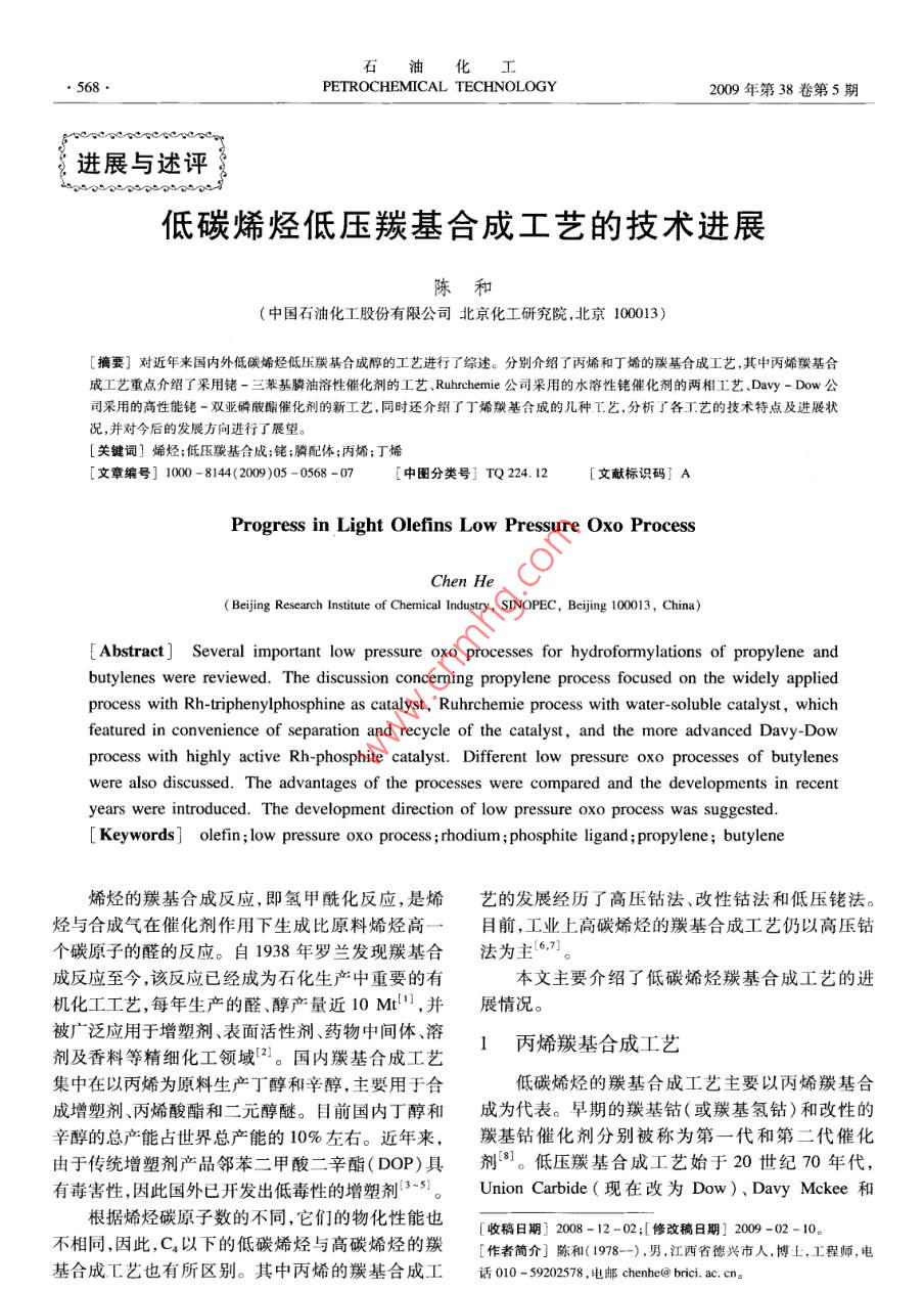 低碳烯烴低壓羰基合成工藝的技術(shù)進展