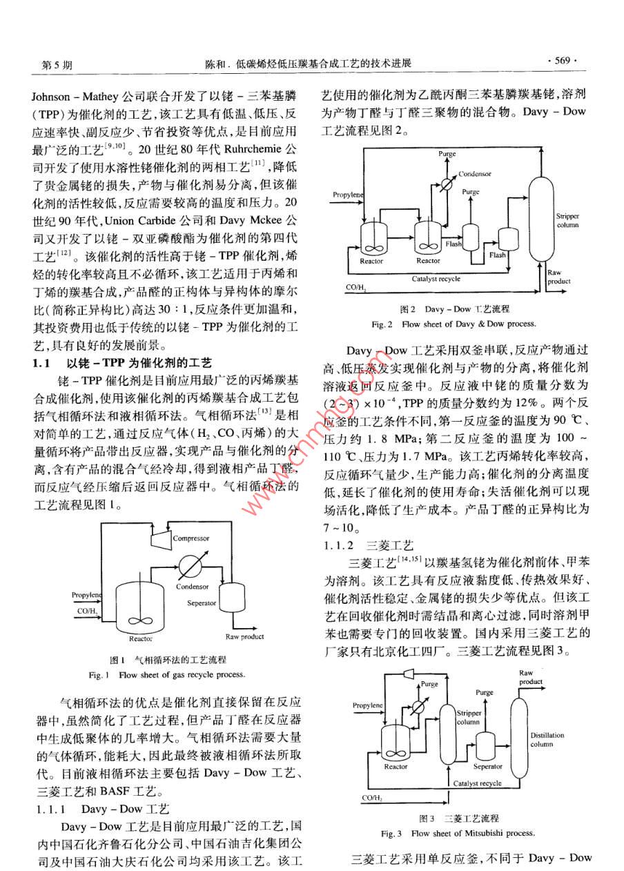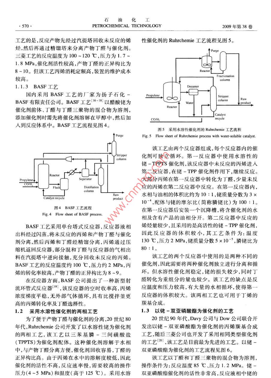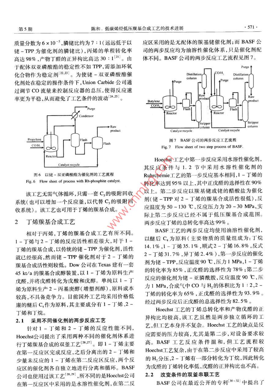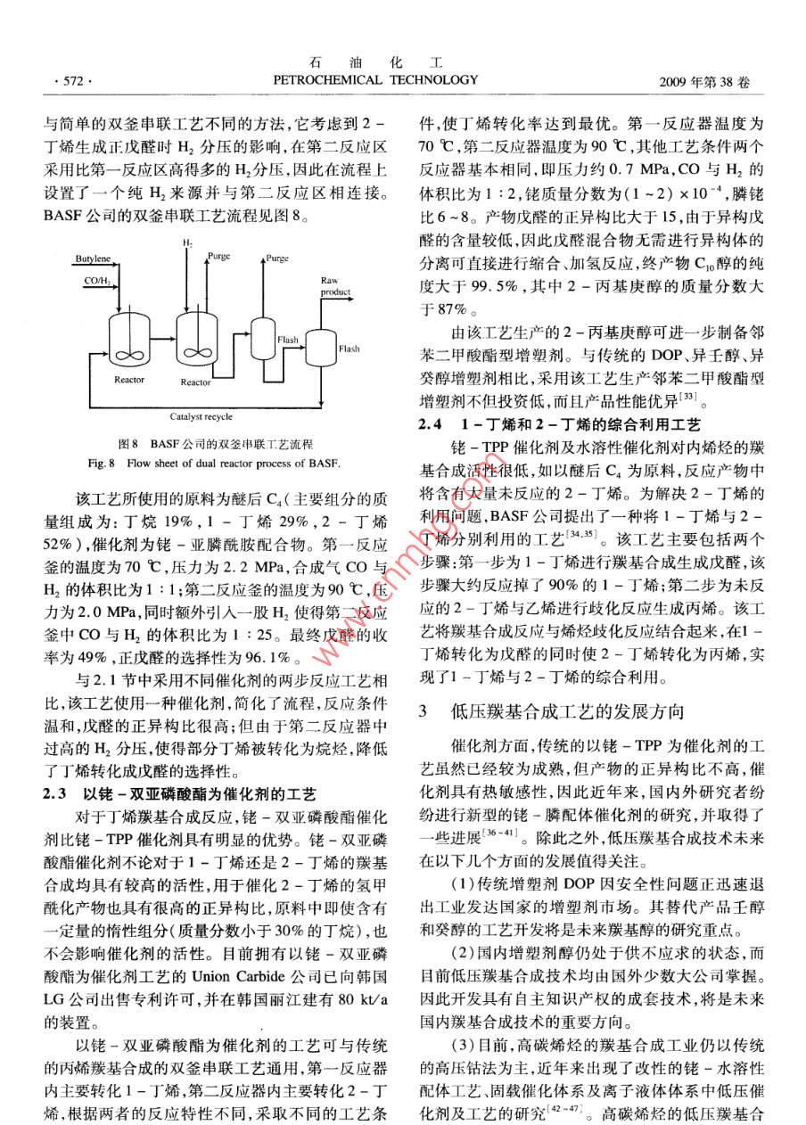 石油化I568 .PETROCHEMICAL TECHNOLOGY2009年第38卷第5期進展與述評低碳烯烴低壓羰基合成工藝的技術(shù)進展陳和(中國石油化工股份有限公司北京化工研究院,北京100013)[摘要]對近年來國內(nèi)外低碳烯烴低壓羰基合成醇的工藝進行了綜述。分別介紹了丙烯和丁烯的羰基合成工藝,其中丙烯羰基合成工藝重點介紹了采用銠-三苯基膦油溶性催化劑的工藝Ruhrchemie 公司采用的水溶性銠催化劑的兩相工藝Davy- Dow公司采用的高性能銠-雙亞磷肢酯催化劑的新工藝,同時還介紹了丁烯羰基合成的幾種工藝,分析了各工藝的技術(shù)特點及進展狀況,并對今后的發(fā)展方向進行了展望。[關(guān)鍵詞]烯烴;低壓羰基合成;銠;膦配體;丙烯;丁烯[文章編號] 1000 - 8144(2009)05 -0568 -07[中圍分類號] TQ 224.12[文獻標識碼] A .Progress in Light Olefins Low Pressure Oxo ProcessChen He( Beijing Research Insitute of Chemical Industry, SINOPEC, Beijing 100013, China)[ Abstract] Several important low pressure oxo processes for hydroformylations of propylene andbutylenes were reviewed. The discussion concerming propylene process focused on the widely appliedprocess with Rh-triphenylphosphine as catalyst, Ruhrchemie process with water-soluble catalyst, whichfeatured in convenience of separation and recycle of the catalyst, and the more advanced Davy-Dowprocess with highly active Rh-phosphite catalyst. Different low pressure oxO processes of butyleneswere also discussed. The advantages of the processes were compared and the developments in recentyears were introduced. The development direction of low pressure oxO process was suggested.[ Keywords] olefin;low pressure oxo process ;rhodium;phosphite ligand ;propylene ; butylene烯烴的羰基合成反應(yīng),即氫甲?;磻?yīng),是烯藝的發(fā)展經(jīng)歷了高壓鈷法、改性鈷法和低壓銠法。烴與合成氣在催化劑作用下生成比原料烯烴高-一目前,工業(yè)上高碳烯烴的羰基合成工藝仍以高壓鈷個碳原子的醛的反應(yīng)。自1938年羅蘭發(fā)現(xiàn)羰基合法為主(67。成反應(yīng)至今,該反應(yīng)已經(jīng)成為石化生產(chǎn)中重要的有本文主要介紹了低碳烯烴羰基合成工藝的進機化工工藝,每年生產(chǎn)的醛、醇產(chǎn)量近10 Mt',并展情況。被廣泛應(yīng)用于增塑劑、表面活性劑、藥物中間體、溶1丙烯羰基合成工藝劑及香料等精細化工領(lǐng)域2]。國內(nèi)羰基合成工藝集中在以丙烯為原料生產(chǎn)丁醇和辛醇,主要用于合低碳烯烴的羰基合成工藝主要以丙烯羰基合成增塑劑、丙烯酸酯和二元醇醚。目前國內(nèi)丁醇和成為代表。早期的羰基鈷(或羰基氫鈷)和改性的辛醇的總產(chǎn)能占世界總產(chǎn)能的10%左右。近年來,羰基鈷催化劑分別被稱為第- - 代和第二代催化由于傳統(tǒng)增塑劑產(chǎn)品鄰苯二甲酸二辛酯(DOP)具劑[8]。低壓羰基合成工藝始于20世紀70年代,有毒害性,因此國外已開發(fā)出低毒性的增塑劑(3-5]。Union Carbide (現(xiàn)在改為Dow)、Davy Mckee和根據(jù)烯烴碳原子數(shù)的不同,它們的物化性能也[收稿日期] 2008 -12 -02;[修改稿日期] 2009-02 - 10。不相同,因此,C,以下的低碳烯烴與高碳烯烴的羰[作者簡介]陳和( 1978--),男,江西省德興市人,博士,工程師,電基合成工藝也有所區(qū)別。其中丙烯的羰基合成工話010 -59202578.電郵chenhe@ brici. ac. cn。第5期陳和.低碳烯烴低壓羰基合成工藝的技術(shù)進展Johnson - Mathey公司聯(lián)合開發(fā)了以銠-三苯基膦藝使用的催化劑為乙酰丙酮三苯基膦羰基銠,溶劑(TPP)為催化劑的工藝,該工藝具有低溫、低壓、反為產(chǎn)物丁醛與丁醛三聚物的混合物。Davy - Dow應(yīng)速率快、副反應(yīng)少、節(jié)省投資等優(yōu)點,是目前應(yīng)用工藝流程見圖2。最廣泛的工藝19.10]。20 世紀80年代Ruhrchemie公Puge司開發(fā)了使用水溶性銠催化劑的兩相工藝"1 ,降低Condensor了貴金屬銠的損失,產(chǎn)物與催化劑易分離,但該催PropylenePurge化劑的活性較低,反應(yīng)需要較高的溫度和壓力。20Stripper世紀90年代,UnionCarbide公司和DavyMckee公column司又開發(fā)了以銠-雙亞磷酸酯為催化劑的第四代工藝|12]。該催化劑的活性高于銠- TPP催化劑,烯ReactorReactoFlash烴的轉(zhuǎn)化率較高且不必循環(huán),該工藝適用于丙烯和Catalyst recycle! product丁烯的羰基合成,產(chǎn)品醛的正構(gòu)體與異構(gòu)體的摩爾COH。比(簡稱正異構(gòu)比)高達30:1,反應(yīng)條件更加溫和,圖2 Davy- Dow工藝流程其投資費用也低于傳統(tǒng)的以銠- TPP為催化劑的工Fig.2 Flow sheet of Davy & Dow process.藝,具有良好的發(fā)展前景。Davy-Dow工藝采用雙釜串聯(lián),反應(yīng)產(chǎn)物通過1.1 以銠-TPP為催化劑的工藝高、低壓蒸發(fā)實現(xiàn)催化劑與產(chǎn)物的分離,將催化劑銠- TPP催化劑是目前應(yīng)用最廣泛的丙烯羰基溶液返回反應(yīng)釜中。反應(yīng)液中銠的質(zhì)量分數(shù)為合成催化劑,使用該催化劑的丙烯羰基合成工藝包(2~3) x 10-4 ,TPP的質(zhì)量分數(shù)約為12%。兩個反括氣相循環(huán)法和液相循環(huán)法。氣相循環(huán)法("! 是相應(yīng)釜的工藝條件不同,第一反應(yīng)釜的溫度為90 C、對簡單的工藝,通過反應(yīng)氣體(H2、CO、丙烯)的大壓力約1. 8 MPa;第二反應(yīng)釜的溫度為100 ~量循環(huán)將產(chǎn)品帶出反應(yīng)器,實現(xiàn)產(chǎn)品與催化劑的分110 C、壓力為1.7 MPa。該工藝丙烯轉(zhuǎn)化率較高,離,含有產(chǎn)品的混合氣經(jīng)冷卻,得到液