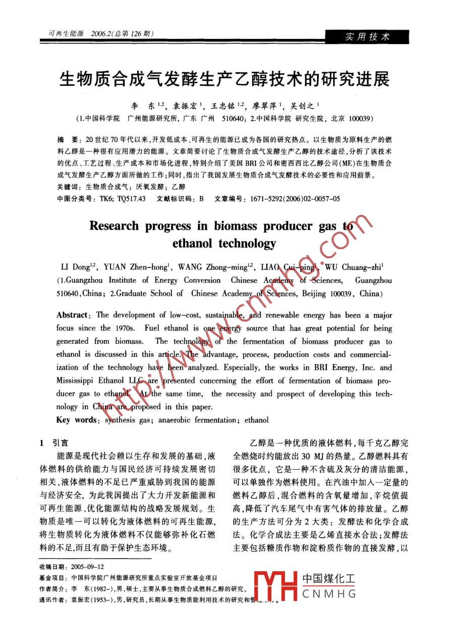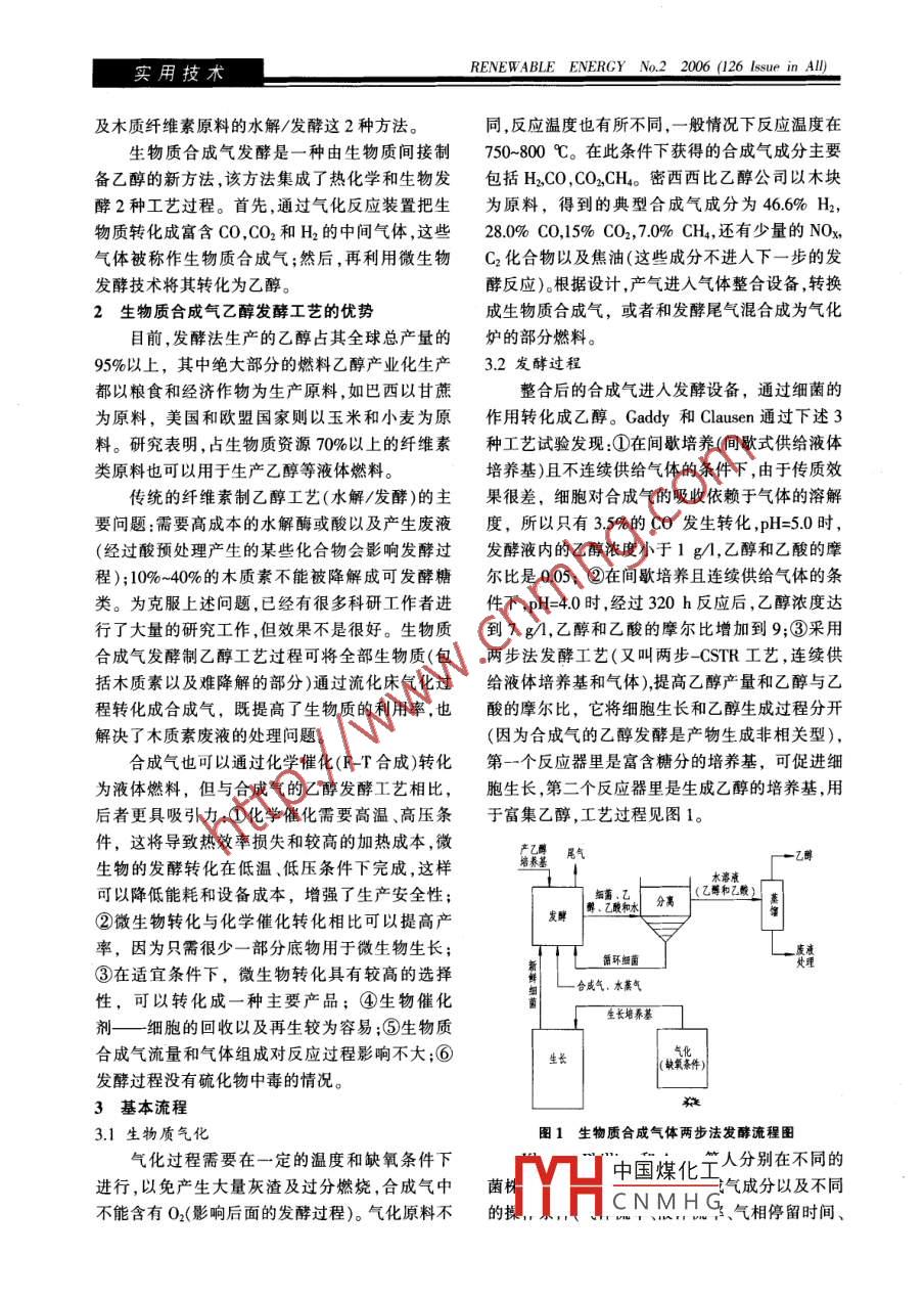 可冉生能源2006.2(總第126期)實(shí)用技術(shù)生物質(zhì)合成氣發(fā)酵生產(chǎn)乙醇技術(shù)的研究進(jìn)展李東口2,袁振宏1,王忠銘口2,廖翠萍',吳創(chuàng)之(1.中國科學(xué)院廣州能源研究所,廣東廣州510640;2.中國科學(xué)院研究生院,北京100039)摘要:20世紀(jì)70年代以來,開發(fā)低成本、可再生的能源已成為各國的研究熱點(diǎn)。以生物質(zhì)為原料生產(chǎn)的燃料乙醇是一種很有應(yīng)用潛力的能源。文章簡要討論了生物質(zhì)合成氣發(fā)酵生產(chǎn)乙醇的技術(shù)途徑,分析了該技術(shù)的優(yōu)點(diǎn)、工藝過程、生產(chǎn)成本和市場化進(jìn)程,特別介紹了美國BR公司和密西西比乙醇公司(ME)在生物質(zhì)合成氣發(fā)酵生產(chǎn)乙醇方面所做的工作;同時(shí),指出了我國發(fā)展生物質(zhì)合成氣發(fā)酵技術(shù)的必要性和應(yīng)用前景。關(guān)鍵詞:生物質(zhì)合成氣;厭氧發(fā)酵;乙醇中圖分類號:TK6;TQ51743文獻(xiàn)標(biāo)識碼:B文章編號:1671-5292(2006)02-0057-05Research progress in biomass producer gas toethanol technologyLI Dong", YUAN Zhen-hong, WANG Zhong-ming, LIAO Cui-ping, WU Chuang-zhi(1. Guangzhou Institute of Energy Conversion Chinese Academy of Sciences, Guangzhou510640, China; 2. Graduate School of Chinese Academy of Sciences, Beijing 100039, ChinaAbstract: The development of low-cost, sustainable, and renewable energy has been a majorfocus since the 1970s. Fuel ethanol is one energy source that has great potential for beinggenerated from biomass. The technology of the fermentation of biomass producer gas toethanol is discussed in this article. The advantage, process, production costs and commercialen analyzed. Especially, the works in BRI Energy, Inc. andMississippi Ethanol LLC are presented concerning the effort of fermentation of biomassducer gas to ethanol. At the same time, the necessity and prospect of developing thisna ased in this papeKey words: synthesis gas; anaerobic fermentation; ethanol1引言乙醇是一種優(yōu)質(zhì)的液體燃料,每千克乙醇完能源是現(xiàn)代社會賴以生存和發(fā)展的基礎(chǔ),液全燃燒時(shí)約能放出30MJ的熱量。乙醇燃料具有體燃料的供給能力與國民經(jīng)濟(jì)可持續(xù)發(fā)展密切很多優(yōu)點(diǎn),它是一種不含硫及灰分的清潔能源,相關(guān),液體燃料的不足已嚴(yán)重威脅到我國的能源可以單獨(dú)作為燃料使用。在汽油中加入一定量的與經(jīng)濟(jì)安全,為此我國提出了大力開發(fā)新能源和燃料乙醇后,混合燃料的含氧量增加,辛烷值提可再生能源、優(yōu)化能源結(jié)構(gòu)的戰(zhàn)略發(fā)展規(guī)劃。生高,降低了汽車尾氣中有害氣體的排放量。乙醇物質(zhì)是唯一可以轉(zhuǎn)化為液體燃料的可再生能源,的生產(chǎn)方法可分為2大類:發(fā)酵法和化學(xué)合成將生物質(zhì)轉(zhuǎn)化為液體燃料不僅能夠彌補(bǔ)化石燃法?;瘜W(xué)合成法主要是乙烯直接水合法;發(fā)酵法料的不足,而且有助于保護(hù)生態(tài)環(huán)境。主要包括糖質(zhì)作物和淀粉質(zhì)作物的直接發(fā)酵,以收稿日期:2005-09-12基金項(xiàng)目:中國科學(xué)院廣州能源研究所重點(diǎn)實(shí)驗(yàn)室開放基金項(xiàng)目中國煤化工作者簡介:李東(1982-),男,碩士,主要從事生物質(zhì)合成燃料乙醇的研究。通訊作者:袁振宏(1953-),男研究員,長期從事生物質(zhì)能利用技術(shù)的研究和CNMHG57實(shí)用技術(shù)RENEWABLE ENERGY No. 2 2006(126 Issue in All及木質(zhì)纖維素原料的水解/發(fā)酵這2種方法。同,反應(yīng)溫度也有所不同,一般情況下反應(yīng)溫度在生物質(zhì)合成氣發(fā)酵是一種由生物質(zhì)間接制750-800℃。在此條件下獲得的合成氣成分主要備乙醇的新方法,該方法集成了熱化學(xué)和生物發(fā)包括H2CO,CO2CH4。密西西比乙醇公司以木塊酵2種工藝過程。首先,通過氣化反應(yīng)裝置把生為原料,得到的典型合成氣成分為466%H2物質(zhì)轉(zhuǎn)化成富含CO,CO2和H2的中間氣體,這些28.0%CO,15%CO2,7.0%CH4,還有少量的NOx氣體被稱作生物質(zhì)合成氣;然后,再利用微生物C2化合物以及焦油(這些成分不進(jìn)入下一步的發(fā)發(fā)酵技術(shù)將其轉(zhuǎn)化為乙醇。酵反應(yīng))根據(jù)設(shè)計(jì),產(chǎn)氣進(jìn)入氣體整合設(shè)備,轉(zhuǎn)換2生物質(zhì)合成氣乙醇發(fā)酵工藝的優(yōu)勢成生物質(zhì)合成氣,或者和發(fā)酵尾氣混合成為氣化目前,發(fā)酵法生產(chǎn)的乙醇占其全球總產(chǎn)量的爐的部分燃料。95%以上,其中絕大部分的燃料乙醇產(chǎn)業(yè)化生產(chǎn)3.2發(fā)酵過程都以糧食和經(jīng)濟(jì)作物為生產(chǎn)原料,如巴西以甘蔗整合后的合成氣進(jìn)入發(fā)酵設(shè)備,通過細(xì)菌的為原料,美國和歐盟國家則以玉米和小麥為原作用轉(zhuǎn)化成乙醇。 Gaddy和 Clausen通過下述3料。研究表明,占生物質(zhì)資源70%以上的纖維素種工藝試驗(yàn)發(fā)現(xiàn):①在間歇培養(yǎng)(間歇式供給液體類原料也可以用于生產(chǎn)乙醇等液體燃料。培養(yǎng)基)且不連續(xù)供給氣體的條件下,由于傳質(zhì)效傳統(tǒng)的纖維素制乙醇工藝(水解/發(fā)酵)的主果很差,細(xì)胞對合成氣的吸收依賴于氣體的溶解要問題:需要高成本的水解酶或酸以及產(chǎn)生廢液度,所以只有3.5%的CO發(fā)生轉(zhuǎn)化,pH=5.0時(shí),(經(jīng)過酸預(yù)處理產(chǎn)生的某些化合物會影響發(fā)酵過發(fā)酵