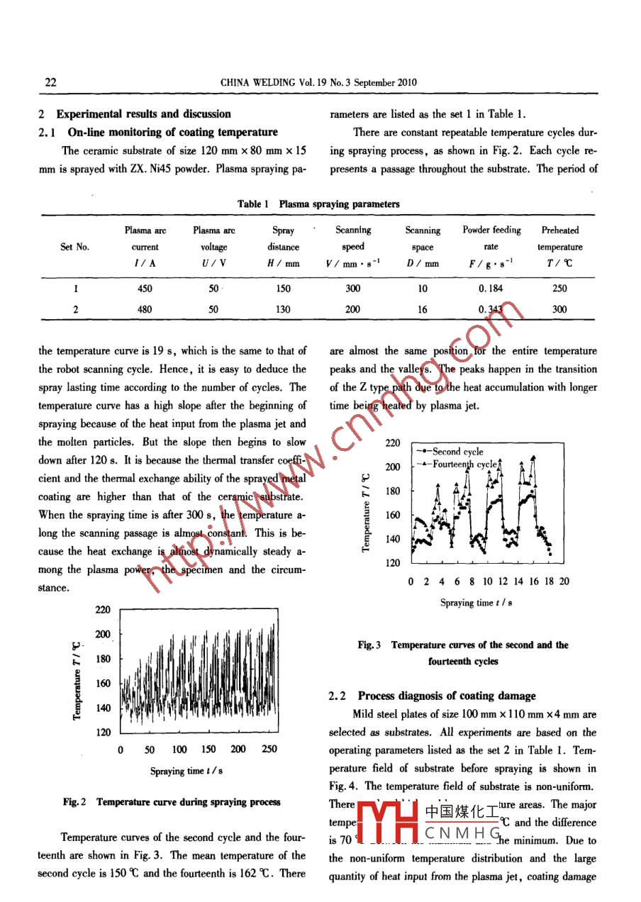 On-line temperature monitoring and process diagnosis of plasma sprayed coatings21On-line temperature monitoring and processdiagnosis of plasma sprayed coatingsYang Yunzhen and Xia Weisheng楊云珍,夏衛(wèi)生**Abstract On-line temperature monioring of plasma sprayed coating is presented, which is based on IR pyromelery combinedt0 robot riecories. Temperature fields of the subtrate before spraying and the deposited coating when the damage happensare laken to inestigate the temperature fluctuation informatin. Experimental results demonstrate that coating damage alwaysoccurs in the temperature transition area of the substrate from the higher t0 the lover , as well as the higher temperature area.The temperature diference betoeen the peak and the mean of the relevant regions is beyond 30 -50 C or even higher. Thisase provides the omen of cooting damage and the focusing scopes for the process control of coating temperature in plasmaspraying.Key words plasma spraying, coating temperature , temperature field, coating damage, process diagnosis0 Introductionperature of various areas, the maximum temperature of theCoating temperature is an important factor influencinggiven sample.the formability and quality of plasma spraying coat-ings' -3]. Hence, it is important and necessary to monitor1.2 On-line temperature detecting device and methodand control of coating temperature'4. Up to now, manyThe on-line temperature detecting device is an IR py-efforts have been devoted to measure coating temperatures ,rometer typed Thermalert TX. The pyrometer is fixed onsuch as thermocouple, IR pyrometer'5-n! and infraredthe end arm of a six-axis robot ( Motoman, UP20) andcamera-9. IR pyrometry, as a non-contact and nonde-synchronously moves with the plasma torch. This case pro-structive examination method,' has a wider application forvides the pyrometer the scanning mechanism to enlarge itsits simplicity and practicalityf"0. In this paper, the coat-detecting scope and flexibility. Schematic diagram of tem-ing temperature measurement is performed by an IR py- perature monitoring is shown in Fig. 1.rometer. A thermal imager is also applied to obtain thePlate fixed in thetemperature field, and main efforts are focused on the tem-end arm of robotPlasma gunperature fluctuation when coating damage happens.Pyrometer 'Display and interfacesPlasma jet1 Temperature detecting devices and methodsParticle flux1.1 Detecting device for temperature fieldPLC| AD moduleSubstrateAn uncooled focus plane array ( UFPA) detector isselected to obtain the temperature field. Its sample fre-Data processing and adjustmentof robot spray triectoriesquency is 60 Hz. With the special software, it is possibleand comfortable to analyze the results and calculate tem-Fig. 1 Schematic diagram of temperature monitoring中國(guó)煤化工* " The work is supported by the National Natural Science Foundation of C蚌Yang Yunzhen, College of Autonotive Engineering, Wuhan UniversityYHCNMHGs Weisheng, College ofMaterial Science and Engineering, Huazhong University of Science and Technology, Wuhan, 430074. Xia Weisheng, Corresponding author,E-mail: xiaianhust@ hotmail. com22CHINA WELDING Vol. 19 No.3 September 20102 Experimental results and discussionrameters are listed as the set 1 in Table 1.2.1 On-line monitoring of coating temperatureThere are constant repeatable temperature cycles dur-The ceramic substrate of size 120 mm x 80 mm x 15ing spraying process, as shown in Fig. 2. Each cycle re-mm is sprayed with zX. Ni45 powder. Plasma spraying pa-presents a passage throughout the substrate. The period ofTable 1 Plasma spraying parametersPlasma arcPlasma areSprayScanningPowder feedingPreheatedSet No.currentvoltagedistancespeedspaceatetemperature1/ AU/ VH/mm.V/ mm. s-'D/ mmF/g.s-'T/C45050.15030000. 184250248050130200160.343the temperature curveis 19 s, which is the same to that ofare almost the same position for the entire temperaturethe robot scanning cycle. Hence, it is easy to deduce thepeaks and the valleys. The peaks happen in the transitionspray lasting time according to the number of cycles. Theof the z type path due to the heat accumulation with longertemperature curve has a high slope after the beginning oftime being heated by plasma jet.spraying because of the heat input from the plasma jet andthe molten particles. But the slope then begins to slow220一一 Second cycledown after 120s. It is because the thermal transfer coeff-.-Fourteenth ceyelcient and the thermal exchange ability of the sprayed metal180coating are higher than that of the ceramic substrate.When the spraying time is after 300 s, the temperature a160long the scanning passage is almost constant. This is be-140cause the heat exchange is almost dynamically steady a-120mong the plasma power, the specimen and the circum-02468101214161820stance.Spraying time t1sFig.3 Temperature curves of the second and thefourteenth cycles2.2 Process diagnosis of coating damageMild steel plates of size 100 mm x 110 mm x4 mm areselected as substrates. All experiments are based on the05010015020025operating parameters listed as the set 2 in Table 1. Tem-Spraying time I/sperature field of substrate before spraying is shown inFig. 4. The temperature field of substrate is non-uniform.Fig.2 Temperature curve during spraying processThere中國(guó)煤化工-ture areas. The majortempeC and the differenceTemperature curves of the second cycle and the four-is70YH_CN M H Ghe mnimum. Due 1oteenth are shown in Fig. 3. The mean temperature of thethe non-uniform temperature distribution and the largesecond cyele is 150C and the furteenth is 162心. There quanity of heat input from the plasma jet, coaing damageOn-line temperature monitoring and process diagnosis of plasma sprayed coatings2390 C diference between the areas of coating damage andtheir nearby areas, as denoted by the rectangles in Fig. 6. .260240220200181601401200100200300400500600700Fig.4 Temperature field of substrate before sprayingData pointswill hap