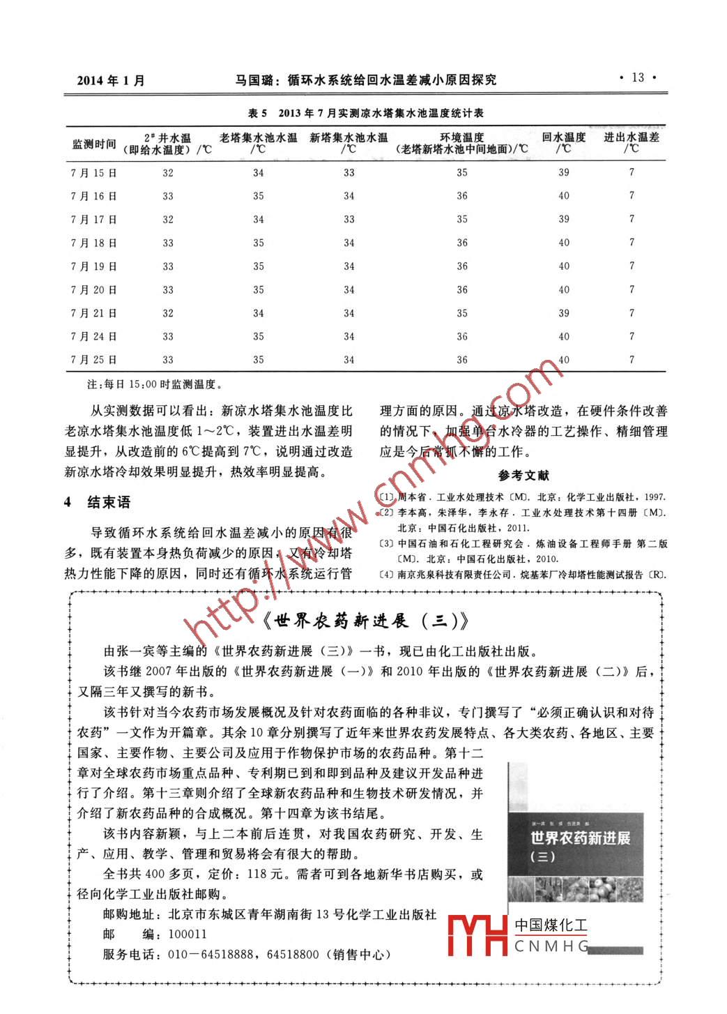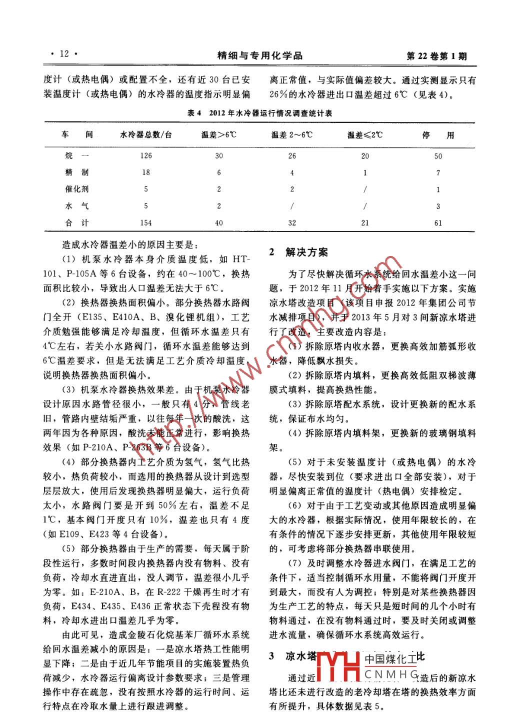 Jan.2014精細(xì)與專用化學(xué)品第22卷第1期10●Fine and Specialty Chemicals2014年1月循環(huán)水系統(tǒng)給回水溫差減小原因探究馬國璐(南京金陵亨斯邁新材料有限責(zé)任公司,江蘇南京210046)摘要:從涼水塔內(nèi)填料、布水管、風(fēng)機(jī)運(yùn)行、水冷器運(yùn)行等方面查找循環(huán)水系統(tǒng)給回水溫差戰(zhàn)小的原因,并提出了解決的方案。關(guān)鍵詞:循環(huán)水;溫差;熱負(fù)荷Study on the reasons of temperature difference decreases between the feedwater and return water in circulating water systemMA Guo-lu(Nanjing Jjinling Huntsman New Materials Co.,Ltd.,Nanjing 210046 ,China)Abstract: The reason of temperature difference decreases between the feed water and return water was found outby analysis of the cooling tower packing, water tubes distributor, fan operation,water cooler operation and so on,the specialty solution was put forward.Key words:cooling water; temperature difference; therma! load金陵石化烷基苯廠循環(huán)水裝置負(fù)貴向烷基苯聯(lián)系統(tǒng)達(dá)到運(yùn)行的最佳平衡工況點(diǎn)。合裝置、脫硫裝置、催化劑裝置及水氣車間供氣裝1溫差 減少原因分析置提供低于33C的循環(huán)冷卻水。裝置始建于1982年,2000年裝置改造后循環(huán)水量為3000m2/h。裝1.1從裝置熱負(fù)荷查找原 因置分0.40MPa的高壓系統(tǒng)、0.32MPa的低壓系多年來,烷基苯廠著重實(shí)施節(jié)能挖潛工作,對(duì)統(tǒng),經(jīng)水冷設(shè)備使用后的低壓回水,由回水泵升壓于主裝置的富余熱源進(jìn)行回收,特別是加氫脫芳裝后與高壓回水經(jīng)6間逆流式冷卻塔噴淋后與空氣自置余熱利用、重蠟熱量回收、F-501 加熱爐余熱系上而下接觸進(jìn)行熱交換,冷卻后的循環(huán)水落人集水統(tǒng)改造、C405塔循環(huán)烷烴余熱回收等項(xiàng)目實(shí)施后,池。該6間冷卻塔進(jìn)出水設(shè)計(jì)值是33~38C的5C2003~2012年在年平均給水溫度基本恒定的前提溫差。2006~2009年循環(huán)水給回水溫差基本達(dá)到下,裝置熱負(fù)荷逐年降低(見圖1),從2003年的6C以上。但是從2010年開始,循環(huán)水溫差逐年遞.42C降低到目前的36.4C左右。減,2012 年循環(huán)水溫差平均只有3.8C,與往年相比下降了3C左右。按照《中石化工業(yè)水管理辦法》中石化安[2007] 533 號(hào)文第四十一條及集團(tuán)公司設(shè)備大檢查“循環(huán)水給回水溫差不小于6C”34的要求,存在差距。同時(shí)從節(jié)能角度考慮,在排除+ -裝置出水晶度C裝置熱負(fù)荷減小的前提下,循環(huán)水溫差的減小,勢(shì)必會(huì)造成循環(huán)水用量的增加,電耗、水耗、藥劑消耗等同步增加,不利于裝置的經(jīng)濟(jì)運(yùn)行。因此,查找循環(huán)水系統(tǒng)溫差減小的原因,制定解決措施,并圖1 2003~2012年循環(huán)水回水溫度比較從系統(tǒng)運(yùn)行的安全性、經(jīng)濟(jì)性、水冷設(shè)備運(yùn)行的長(zhǎng)1.2 涼水塔性步古五5田中國煤化工。{機(jī)械通風(fēng)冷卻周期等方面綜合考慮,制定出合理的溫差范圍,使該裝置CNMHG收稿日期: 2013-11-08作者簡(jiǎn)介:馬國璐, 女,主要從事循環(huán)水系統(tǒng)管理工作。.2014年1月馬國璐:循環(huán)水系統(tǒng)給回水溫差減小原因探究11●塔,冷卻塔內(nèi)填料的好壞、噴淋裝置、收水布水裝越好,反之則差。而熱力特性方程中Q =Aλ"中,置的運(yùn)行情況、風(fēng)機(jī)的運(yùn)行情況以及塔的通風(fēng)量大冷卻數(shù)Q的大小和系數(shù)A的大小成正比,反映了小將直接影響循環(huán)水的冷卻效果。相同氣水比條件下,不同填料的熱力性能的高低,1.2.1 冷卻塔內(nèi)填料、噴淋、收水、布水裝置的系數(shù)A高,冷卻數(shù)2就越高。因此對(duì)兩次測(cè)出的使用情況冷卻塔熱力性能曲線進(jìn)行比較,表明填料的熱力性2012年10月,趁烷一裝置大修循環(huán)水系統(tǒng)停能有明顯下降。車之際,檢查了冷卻塔內(nèi)部件的使用情況。(2)收水、布水。目前2組塔的配件情況是:(1)淋水填料是冷卻塔的重要組成部分,是決配水系統(tǒng)采用管式布水,噴頭為ABS材料的三濺定冷卻塔效率高低的關(guān)鍵部件,其性能的優(yōu)劣將直式噴嘴,收水器為BO160°~45°弧形收水器。內(nèi)部接影響到整塔的熱工效果,冷卻塔中水的冷卻過程件存在老化破損情況,布水主管及支管腐蝕嚴(yán)重,主要在淋水填料中進(jìn)行,其所產(chǎn)生的水溫降可達(dá)整由于原塔設(shè)計(jì)缺陷導(dǎo)致塔內(nèi)配水不均,原塔采用的個(gè)塔溫降的70%~80%,是冷卻塔中的關(guān)鍵部分。玻璃鋼收水器收水效率低,現(xiàn)場(chǎng)有的塔布水不均,目前冷卻塔內(nèi)使用的填料是BT33-60薄膜式玻璃有少量噴頭脫落也有一定的影響,涼水塔性能測(cè)試鋼填料,高約1. 25m。由于該型號(hào)的填料材質(zhì)較試驗(yàn)數(shù)據(jù)見表2。厚,比表面積較小,已經(jīng)逐漸被淘汰,且使用年限表2冷卻塔飄水損失率較長(zhǎng),表面結(jié)垢加重(明 顯看到表面有白色垢層),A-362#飄水損失率A-364*飄水出現(xiàn)老化破損現(xiàn)象(在水冷器檢修時(shí)發(fā)現(xiàn)附著的黏測(cè)試時(shí)間%損失率/%泥里夾雜著有碎裂的填料),換熱性能低,嚴(yán)重影2006年5月0. 0006210. 000478響冷卻塔的熱工性能。冷卻塔測(cè)試數(shù)據(jù)見表1。2012年5月0. 001680. 00125表1冷卻塔冷卻數(shù)測(cè)試數(shù)據(jù)對(duì)比塔體飄水現