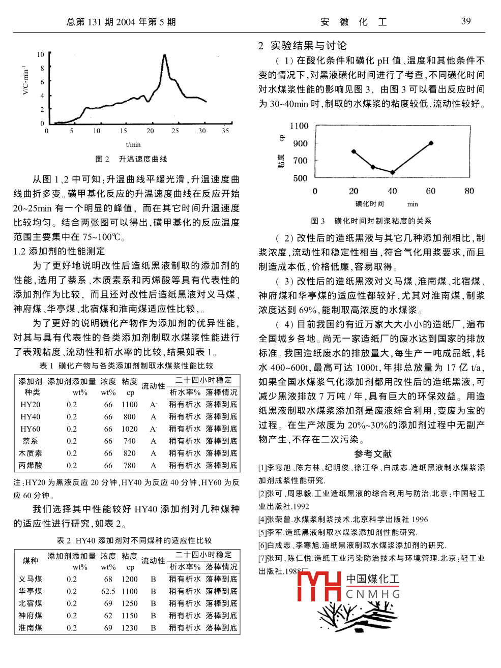 38總第131期2004年第5期安徽化工改性后的造紙黑液制水煤漿添加劑的研究(淮化集團(tuán)有限公司,淮南232038)摘要研究了如何利用造紙黑液中的有效成分制備岀質(zhì)優(yōu)價(jià)廉的水煤漿添加劑。通過大量的實(shí)驗(yàn),得出制備水煤漿添加劑的最佳工藝條件:濃度15%的造紙黑液250m中,需加入磺化劑ABl5g,磺化反應(yīng)時(shí)間40分鐘,縮合反應(yīng)時(shí)間2h通過一系列制漿試驗(yàn)結(jié)果表明:添加劑性能優(yōu)良,所制取水煤漿能夠滿足工業(yè)生產(chǎn)要求關(guān)鍵詞造紙黑液添加劑水煤漿綜合利用在我國造紙廢水排放量大約占工業(yè)廢水總排放量平。隨著中東局勢(shì)動(dòng)蕩不安,石油價(jià)格大幅上漲,德士古的10%黑液對(duì)環(huán)境污染最為嚴(yán)重,如不加以治理,能引水煤漿氣化技術(shù)受到重視,國內(nèi)上世紀(jì)90年代引進(jìn)四起整個(gè)水體污染和生態(tài)環(huán)境的嚴(yán)重破壞。黑液是由有機(jī)套德士古裝置以來,又有五家正在上馬,對(duì)添加劑的需物與無機(jī)物兩部分組成,有機(jī)物包括:植物纖維原料溶求也越來越大,添加劑的研究工作越來越受重視,先后岀的木素,有機(jī)酸和半纖維素、纖維素的降解物等物質(zhì);岀現(xiàn)了萘系、丙烯酸系、木質(zhì)素系添加劑。改性后的造紙無機(jī)物包括№aOH、Na2S、NaO∽3、Na2SO和SiO等黑液黑液制岀的水煤漿流動(dòng)性、穩(wěn)定性好,價(jià)格低廉,具有廣固形物中無機(jī)物約占30%,有機(jī)物約占70%,其中的堿闊發(fā)展前景。木質(zhì)素是由樹脂形成的皂化物本身均具有較強(qiáng)的表面1實(shí)驗(yàn)部份活性,組成復(fù)雜,難以經(jīng)濟(jì)有效的分離提純,循環(huán)利用,1.1黑液的改性而直接排放對(duì)環(huán)境的污染相當(dāng)嚴(yán)重,其治理技術(shù)一直是1.1.1黑液的理化性質(zhì)攻關(guān)的重點(diǎn)。國內(nèi)對(duì)黑液制取水煤漿添加劑的報(bào)道,主黑液來源于穎上造紙廠,密度105gml,pH7.5,固含要是對(duì)木質(zhì)素提取、磺化和改性。提取木質(zhì)素后排出的量12.1%,木質(zhì)素含量4.62%。酸性廢液仍然存在嚴(yán)重的環(huán)境污染問題,針對(duì)這些問題1.1.2添加劑的制備開展了造紙黑液制取水煤漿添加劑新技術(shù)研究。通過對(duì)取100ml造紙黑液加入反應(yīng)釜(250ml)中,用50~黑液中木質(zhì)素有效成分磺化直接制水煤漿添加劑。6oml蒸餾水稀釋定量的磺化劑加入反應(yīng)釜中并加入定黑液中木質(zhì)素含量約為黑液中固型物含量的20%~量的甲醛,開始攪拌,同時(shí)開始加熱,待指示溫度與設(shè)定30%并且大部分是以堿木質(zhì)素的形式存在。木質(zhì)素主要溫度相差10-15℃時(shí)采用當(dāng)達(dá)到高設(shè)定溫度時(shí),恒溫?cái)?shù)由三種不同類型的苯基丙烷單體通過脫氫聚合而成。小時(shí),到設(shè)定時(shí)間時(shí),停止加熱與攪拌,讓反應(yīng)釜自然冷般黑液中有效堿含量1.14%。堿木質(zhì)素完全溶于卻到室溫,打開反應(yīng)釜取出反應(yīng)液并裝入容量瓶中保黑液中,呈親水膠體,因而不發(fā)生沉淀,堿木質(zhì)素膠體有存,以備制水煤漿之用帶電的核和溶劑化外殼,構(gòu)成親水基團(tuán)。由于堿木質(zhì)素磺甲基化反應(yīng)過程為考察磺甲基化反應(yīng)的溫度變親水基團(tuán)的存在,使黑液具有一定的表面活性。但由于化情況,將反應(yīng)過程中的溫度記錄作圖1和圖2。堿木質(zhì)素親水膠體基團(tuán)易被破壞,所以黑液的表面活性不太穩(wěn)定,因此要利用黑液生產(chǎn)水煤漿添加劑必須在堿木質(zhì)素中引入磺酸基陰離子表面活性基團(tuán)進(jìn)行改性,利用黑液制取水煤漿添加劑的反應(yīng)原理主要是在木質(zhì)素分子中的烯醇基引入磺酸基。中國煤化工自20世紀(jì)70年代石油危機(jī)以來,世界主要發(fā)達(dá)國CNMHG家如美國、日本、加拿大、瑞典、意大利、英國、法國和俄羅斯等相繼投入了大量人力,物力和才力尋求代油燃料,進(jìn)行水煤漿技術(shù)的研究開發(fā)。目前國外水煤漿技術(shù)圖1升溫曲線已日趨成熟,建成一批水煤漿廠,達(dá)到了工業(yè)應(yīng)用的水總第131期2004年第5期安徽化工2實(shí)驗(yàn)結(jié)果與討論(1)在酸化條件和磺化p值、溫度和其他條件不變的情況下,對(duì)黑液磺化時(shí)間進(jìn)行了考查,不同磺化時(shí)間對(duì)水煤漿性能的影響見圖3,由圖3可以看出反應(yīng)時(shí)間2為30~40min時(shí),制取的水煤漿的粘度較低,流動(dòng)性較好。圖2升溫速度曲線700從圖1、2中可知:升溫曲線平緩光滑,升溫速度曲500線曲折多變?;羌谆磻?yīng)的升溫速度曲線在反應(yīng)開始20~25min有一個(gè)明顯的峰值,而在其它時(shí)間升溫速度磺化時(shí)間比較均勻。結(jié)合兩張圖可以得出,磺甲基化的反應(yīng)溫度圖3磺化時(shí)間對(duì)制漿粘度的關(guān)系范圍主要集中在75~100℃。(2)改性后的造紙黑液與其它幾種添加劑相比,制1.2添加劑的性能測(cè)定漿濃度,流動(dòng)性和穩(wěn)定性相當(dāng),符合氣化用漿要求,而且為了更好地說明改性后造紙黑液制取的添加劑的制造成本低,價(jià)格低廉,容易取得。性能,選用了萘系、木質(zhì)素系和丙烯酸等具有代表性的(3)改性后的造紙黑液對(duì)義馬煤、淮南煤、北宿煤、添加劑作為比較,而且還對(duì)改性后造紙黑液