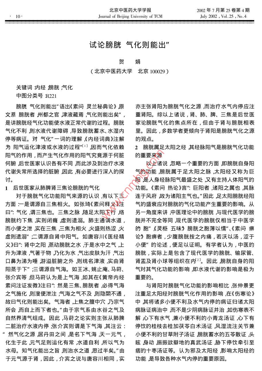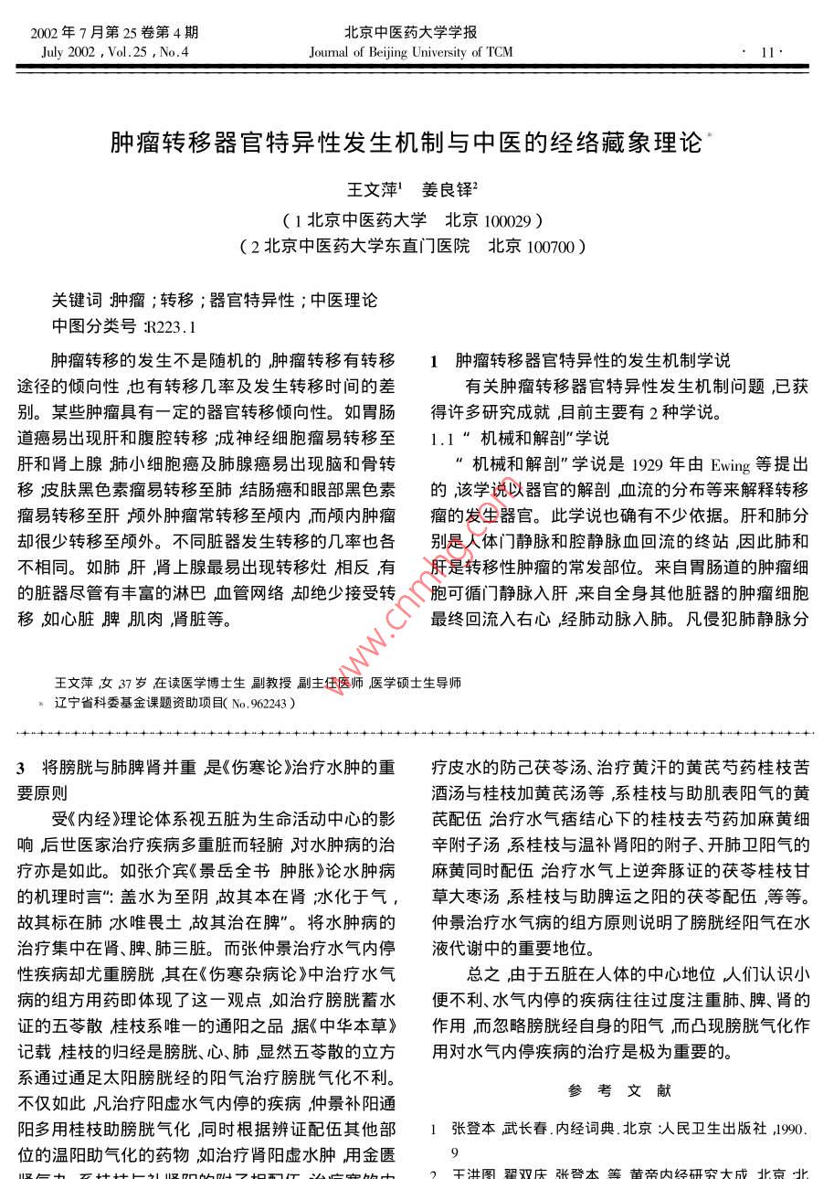 北京中醫(yī)藥大學(xué)學(xué)報(bào)2002年7月第25卷第4期10.Journal of Beiing University of TCMJuly 2002 , Vol.25 ,No.4試論膀胱氣化則能出"賀(北京中醫(yī)藥大學(xué)北京100029 )關(guān)鍵詞:內(nèi)經(jīng)膀胱;氣化中圖分類號(hào):R221膀胱氣化則能出”語出《素問靈蘭秘典論》原亦主張腎陽為膀胱氣化之源,而治療水氣內(nèi)停應(yīng)注文系膀胱者州都之官津液藏焉,氣化則能出矣”,重腎陽。綜以.上諸說,腎、肺、脾、三焦是后世醫(yī)是講膀胱經(jīng)氣化功能使水液正常代謝的過程。膀胱家論膀胱氣化的焦點(diǎn)所在,但由于腎與膀胱相表氣化不利則水液代謝障礙導(dǎo)致膀胱蓄水、水濕內(nèi)里。因此,多數(shù)學(xué)者更傾向于腎陽是膀胱氣化之源停等病證。對(duì)氣化”-詞的理解《內(nèi)經(jīng)詞典》注解的觀點(diǎn)。為陽氣運(yùn)化津液或水液的過程”1] ,因而氣化依賴2膀胱屬足太陽之經(jīng) 其經(jīng)脈陽氣是膀胱氣化功能陽氣的作用,而產(chǎn)生氣化作用的陽氣究竟源于何臟的重要來源何腑后世醫(yī)家認(rèn)識(shí)各有不同而此涉及到治療水液以上諸說忽略一個(gè)重要的方面即膀胱自身陽代謝失常所選擇的臟腑,因此,有必要進(jìn)行深入的探氣的功能,膀胱屬于足太陽之脈,太陽經(jīng)又稱為巨討。陽是人身經(jīng)脈陽氣最盛之處,又有主持人體陽氣的1后世醫(yī)家從肺脾腎三焦論膀胱的氣化功能?!端貑枱嵴摗费?:巨陽者,諸陽之屬也其脈對(duì)于膀胱氣化功能陽氣來源的認(rèn)識(shí),有以下三,連于風(fēng)府故為諸陽主氣也?!币虼俗闾柊螂捉?jīng)陽方面:-是謂源自三焦相火。如張琦《素問釋義》注氣的盛衰應(yīng)對(duì)膀胱的氣化功能產(chǎn)生重要的影響。從曰”:氣化,謂三焦也。三焦之脈隨足太陽下行絡(luò)另- -角度來講,中醫(yī)理論中的膀胱與現(xiàn)代醫(yī)學(xué)的膀膀胱約下焦實(shí)則閉癃虛則遺溺。肺主通調(diào)水道,胱并不完全等同現(xiàn)代醫(yī)學(xué)的膀胱僅相當(dāng)于中醫(yī)學(xué)而小便之泄實(shí)在三焦三焦為相火火盛則熱澀火的胞"《靈樞五味》膀胱之胞薄以懦”、《素問痹虛則遺溺”二謂源自腎中陽氣。如唐容川《醫(yī)經(jīng)精論》胞痹者,少腹膀胱按之內(nèi)痛,若沃以湯,澀于義》曰”:腎中之陽蒸動(dòng)膀胱之水,于是水中之氣上小便”的論述, 便足以證明。有學(xué)者認(rèn)為,中醫(yī)的升為津液,氣著于物乃化為水,氣出皮膚為汗氣出.膀胱,實(shí)際上是包含了現(xiàn)代醫(yī)學(xué)的膀胱、輸尿管、口鼻為涕為唾游溢臟腑之外,則統(tǒng)名津液,實(shí)由腎腎盂及腎小球等組織在內(nèi)2。因此膀胱自身的陽陽蒸于下”;三謂源自氣海。如王冰、姚止庵、馬蒔、氣對(duì)其氣化功能的影響,即水液代謝的影響是極為張介賓等,但馬蒔認(rèn)為是上氣海,如其在《黃帝內(nèi)經(jīng)重要的。素問注證發(fā)微》注曰”:然是三焦、膀胱者,必得氣海與腎陽對(duì)膀胱氣化功能的影響相比張仲景更之氣施化則溲便泄注;氣海之氣不及則隱闕不通,注重足太陽經(jīng)對(duì)膀胱氣化作用的影響,在《傷寒論》故日氣化則能出矣。氣海者上焦之膻中穴乃宗氣中其將諸多小便不利及水氣內(nèi)停的病證歸諸太陽所會(huì),而自上而下者也?!庇捎谧跉庀涤伤戎畾饧安∶}證病治中而不是少陰病脈證并治如傷寒表不自然界清氣組成。因此,馬蒔之論實(shí)則主張從肺脾解心下有水氣,兼小便不利的小青龍湯證心下有二臟治療水液內(nèi)停張介賓則謂是下氣海其注云:停飲的桂枝去桂加茯苓白術(shù)湯證,風(fēng)濕流注關(guān)節(jié)兼“然氣化之源居丹田之間是名下氣海天一元?dú)?,小便不利的甘草附子湯證膀胱蓄水的五苓散證頭化生于此元?dú)庾銊t運(yùn)化有常,水道自利,所以氣為眩身動(dòng)振振欲擗地的真武湯證,脅下停飲牽引至水母。知?dú)饣艹鲋紕t治水之道思過半矣?!庇?痞的十棗湯證等。認(rèn)為邪及太陽經(jīng)影響太陽經(jīng)的于元?dú)庠从谀I,因此,介賓之說與唐容川相同,實(shí)功能是導(dǎo)致各種水氣內(nèi)停的重要原因。2002年7月第25卷第4期北京中醫(yī)藥大學(xué)學(xué)報(bào)July 2002 , Vol.25 ,No.4Joumal of Beijing University of TCM11,腫瘤轉(zhuǎn)移器官特異性發(fā)生機(jī)制與中醫(yī)的經(jīng)絡(luò)藏象理論王文萍’姜良鐸2( 1北京中醫(yī)藥大學(xué) 北京100029)( 2北京中醫(yī)藥大學(xué)東直門醫(yī)院北京100700)關(guān)鍵詞腫瘤;轉(zhuǎn)移;器官特異性;中醫(yī)理論中圖分類號(hào):R223.1腫瘤轉(zhuǎn)移的發(fā)生不是隨機(jī)的,腫瘤轉(zhuǎn)移有轉(zhuǎn)移1腫瘤轉(zhuǎn)移器官特異性的發(fā)生機(jī)制學(xué)說途徑的傾向性也有轉(zhuǎn)移幾率及發(fā)生轉(zhuǎn)移時(shí)間的差有關(guān)腫瘤轉(zhuǎn)移器官特異性發(fā)生機(jī)制問題,已獲別。某些腫瘤具有一定的器官轉(zhuǎn)移傾向性。如胃腸得許多研究成就,目前主要有2種學(xué)說。道癌易出現(xiàn)肝和腹腔轉(zhuǎn)移;成神經(jīng)細(xì)胞瘤易轉(zhuǎn)移至1.1“機(jī)械和解剖”學(xué)說肝和腎.上腺肺小細(xì)胞癌及肺腺癌易出現(xiàn)腦和骨轉(zhuǎn)”機(jī)械和解剖”學(xué)說是1929年由Ewing等提出移皮膚黑色素瘤易轉(zhuǎn)移至肺結(jié)腸癌和眼部黑色素的,該學(xué)說以器官的解剖,血流的分布等來解釋轉(zhuǎ