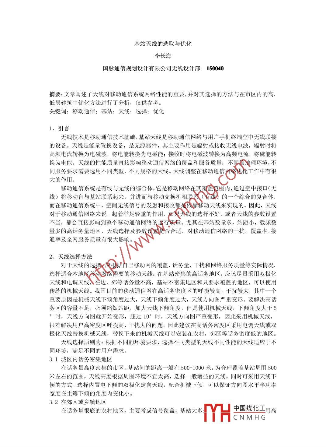 基站天線的選取與優(yōu)化李長(zhǎng)海國(guó)脈通信規(guī)劃設(shè)計(jì)有限公司無(wú)線設(shè)計(jì)部150040摘要:文章闡述了天線對(duì)移動(dòng)通信系統(tǒng)網(wǎng)絡(luò)性能的重要,并對(duì)其選擇的方法與在市區(qū)內(nèi)的高、低層建筑中優(yōu)化方法進(jìn)行了分析,僅供參考。關(guān)鍵詞:移動(dòng)通信;基站;天線;選擇;優(yōu)化1、引言無(wú)線技術(shù)是移動(dòng)通信技術(shù)基礎(chǔ),基站天線是移動(dòng)通信網(wǎng)絡(luò)與用戶手機(jī)終端空中無(wú)線聯(lián)接的設(shè)備。天線是能量置換設(shè)備,是無(wú)源器件,其主要作用是輻射或接收無(wú)線電波,輻射時(shí)將高頻電流轉(zhuǎn)換為電磁波,將電能轉(zhuǎn)換為電磁能;接收時(shí)將電磁波轉(zhuǎn)換為高頻電流,將磁能轉(zhuǎn)換為電能。天線的性能質(zhì)量直接影響移動(dòng)通信網(wǎng)絡(luò)的覆蓋和服務(wù)質(zhì)量;不同的地理環(huán)境,不同服務(wù)要求需要選用不同類(lèi)型,不同規(guī)格的天線。天線調(diào)整在移動(dòng)通信網(wǎng)絡(luò)優(yōu)化工作中有很大的作用。移動(dòng)通信系統(tǒng)是有線與無(wú)線的綜合體,它是移動(dòng)網(wǎng)絡(luò)在其覆蓋范圍內(nèi),通過(guò)空中接口(無(wú)線)將移動(dòng)臺(tái)與基站聯(lián)系起來(lái),并進(jìn)而與移動(dòng)交換機(jī)相聯(lián)系(有線)的一一個(gè)綜合的復(fù)合體。.而在移動(dòng)通信系統(tǒng)中,空間無(wú)線信號(hào)的發(fā)射和接收都是依靠移動(dòng)天線來(lái)實(shí)現(xiàn)的。因此,天線對(duì)于移動(dòng)通信網(wǎng)絡(luò)來(lái)說(shuō),起著舉足輕重的作用,如果天線的選擇不好,或者天線的參數(shù)設(shè)置不當(dāng),都會(huì)直接影響到整個(gè)移動(dòng)通信網(wǎng)絡(luò)的運(yùn)行質(zhì)量。尤其在基站數(shù)量多,站距小,載頻數(shù)量多的高話務(wù)量地區(qū),天線選擇及參數(shù)設(shè)置是否合適,對(duì)移動(dòng)通信網(wǎng)絡(luò)的干擾,覆蓋率,接通率及全網(wǎng)服務(wù)質(zhì)量有很大影響。2、天線選擇方法對(duì)于天線的選擇,應(yīng)根據(jù)自己移動(dòng)網(wǎng)的覆蓋,話務(wù)量,干擾和網(wǎng)絡(luò)服務(wù)質(zhì)量等實(shí)際情況,選擇適合本地區(qū)移動(dòng)網(wǎng)絡(luò)需要的移動(dòng)天線:在基站密集的高話務(wù)地區(qū),應(yīng)該盡量采用雙極化天線和電調(diào)天線,在邊、郊等話務(wù)量不高,基站不密集地區(qū)和只要求覆蓋的地區(qū),可以使用傳統(tǒng)的機(jī)械天線。我國(guó)目前的移動(dòng)通信網(wǎng)在高話務(wù)密度區(qū)的呼損較高,干擾較大,其中一個(gè)重要原因是機(jī)械天線下傾角度過(guò)大,天線下傾角度過(guò)大,天線方向圖嚴(yán)重變形。要解決高話務(wù)區(qū)的容量不足,必須縮短站距,加大天線下傾角度,但是使用機(jī)械天線,下 傾角度大于5°時(shí),天線方向圖就開(kāi)始變形,超過(guò)10° 時(shí),天線方向圖嚴(yán)重變形,因此采用機(jī)械天線,很難解決用戶高密度區(qū)呼損高、干擾大的問(wèn)題。因此建議在高話務(wù)密度區(qū)采用電調(diào)天線或雙極化天線替換機(jī)械天線,替換下來(lái)的機(jī)械天線可以安裝在農(nóng)村,郊區(qū)等話務(wù)密度低的地區(qū)。天線選擇原則為:根據(jù)不同的環(huán)境要求,選擇不同類(lèi)型的天線不同性能的天線適應(yīng)于不同環(huán)境,滿足不同的用戶需求。3.1城區(qū)內(nèi)話務(wù)密集地區(qū)在話務(wù)量高度密集的市區(qū),基站間的距離一般在500-1000米,為合理覆蓋基站周?chē)?00米左右的范圍,天線高度根據(jù)周?chē)h(huán)境不宜太高,選擇- - 般增益的天線,同時(shí)可采用天線下傾的方式。選擇內(nèi)置電下傾的雙極化定向天線,配合機(jī)械下傾,可以保證方向圖水平半功率寬度在主瓣下傾的角度內(nèi)變化小。3.2在郊區(qū)或鄉(xiāng)鎮(zhèn)地區(qū)在話務(wù)量很底的農(nóng)村地區(qū),主要考慮信號(hào)覆蓋,基站大多中國(guó)煤化工用高M(jìn)YHCNMHG增益的全向天線,天線架高可設(shè)在40-50米,同時(shí)適當(dāng)調(diào)大基站發(fā)射功率,以增強(qiáng)信號(hào)的覆蓋范圍,一般平原地區(qū)--90dBm覆蓋距離可達(dá)5公里。3.3在鐵路或公路沿線在鐵路或公路沿線主要考慮沿線的帶狀覆蓋分布,可以采用雙扇區(qū)型基站,每個(gè)區(qū)180;天線宜采用單極化3dB波瓣寬度為90°的高增益定向天線,兩天線相背放置,最大輻射方向與高速路的方向一致。3.4在城區(qū)內(nèi)的一些室內(nèi)或地下在城區(qū)內(nèi)的一些室內(nèi)或地下,如:高大寫(xiě)字樓內(nèi),地下超市,大酒店的大堂等,信號(hào)覆蓋較差,但話務(wù)量較高。為滿足這一區(qū)域用戶的通信需求,可采用室內(nèi)微蜂窩或室內(nèi)分布系統(tǒng),天線采用分布式的低增益天線,以避免信號(hào)干擾影響通信質(zhì)量。4、天線的優(yōu)化GSM數(shù)字移動(dòng)通信發(fā)展非常迅速,從早期規(guī)劃的大區(qū)制,到后來(lái)的小區(qū)制,直到現(xiàn)在的微蜂窩、微微蜂窩,相對(duì)應(yīng)的天線從早期架設(shè)在屋面鐵塔上,到后來(lái)天線降到屋面上,直到現(xiàn)在要把天線設(shè)置在屋面下的外墻側(cè)面上。所有的這些變化都說(shuō)明,對(duì)GSM基站站點(diǎn)