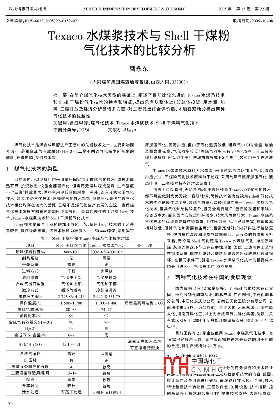 科技情報(bào)開發(fā)與經(jīng)濟(jì)SCITECH INFORMATION DEVELOPMENT ECONOMY2005年第15卷第22期文章編號(hào):1005-6033(2005)22-0152-02收稿日期:2005-10-08Texaco水煤漿技術(shù)與 Shell干煤粉氣化技術(shù)的比較分析曹永東(大同煤礦集團(tuán)煤變油籌備組,山西大同,037000)摘要:在簡(jiǎn)介煤氣化技術(shù)類型的基礎(chǔ)上,闡述了目前比較先進(jìn)的 Texaco水煤漿技術(shù)和 Shell干煤粉氣化技術(shù)的特點(diǎn)和特征,提出只有從整體上(如總體投資、用水量、能耗、三廢排放及經(jīng)濟(jì)分析等諸多方面)對(duì)二者做出綜合評(píng)價(jià)后,才能客觀地分析出兩種氣化技術(shù)的優(yōu)越性關(guān)鍵詞:合成甲醇;煤氣化技術(shù); Texaco水煤漿技術(shù); Shell千煤粉氣化技術(shù)中圖分類號(hào):TQ54文獻(xiàn)標(biāo)識(shí)碼:A煤氣化技術(shù)是煤合成甲醇生產(chǎn)工藝中的關(guān)鍵技術(shù)之—。主要影響因床加壓氣化,固定排渣,但由于氣化溫度較低,粗煤氣中CH4含量、焦油素為:一是粗合成氣有效組分(H2+CO);二是不同的氣化技術(shù)所帶來的及酚含量較高,氣化效率較低(冷煤氣效率只有70%~76%),且三廢處能耗、環(huán)境影響、投資成本等。理系統(tǒng)復(fù)雜,所以只用于生產(chǎn)城市煤氣或lGCC電廠,較少用于生產(chǎn)合成1煤氣化技術(shù)的類型Texaco水煤漿技術(shù)原料為水煤漿,采用純氧氣流床加壓氣化,液態(tài)目前國(guó)內(nèi)小型甲醇廠均采用常壓固定層間歇煤氣化技術(shù),該技術(shù)成排渣;She干煤粉氣化技術(shù)原料為干粉煤,采用純氧氣流床加壓氣化、液熟可靠,投資較省,設(shè)備全部國(guó)產(chǎn)化,但需用無煙塊煤或型煤,生產(chǎn)強(qiáng)度態(tài)排渣。二者技術(shù)特點(diǎn)的對(duì)比見表1小,“三廢”排放量大,原料利用率低且能耗高。另外,還有其他常壓氣化由表1可以看出,無論是She干煤粉還是 Texaco水煤漿氣化技術(shù)技術(shù),如K-T爐氣化技術(shù),恩德爐氣化技術(shù)等等,但與當(dāng)代先進(jìn)的煤氣化都不可能做到完美無缺??陀^地講,兩種技術(shù)各有優(yōu)缺點(diǎn):shel氣化技技術(shù)相比均存在較大的差距,已經(jīng)不是煤氣化生產(chǎn)發(fā)展的主流。當(dāng)代煤術(shù)的優(yōu)點(diǎn)是操作溫度高,冷煤氣效率和炭轉(zhuǎn)化率均高于 Texaco水煤漿氣氣化技術(shù)發(fā)展方向是純氧加壓連續(xù)氣化,最具代表性的工藝有 Lurgi技化技術(shù),但其氣化爐結(jié)構(gòu)較復(fù)雜,且完全需要進(jìn)囗(包括濾灰器和廢鍋術(shù)、 Texaco水煤漿技術(shù)和 Shell干煤粉氣化技術(shù)。投資成本大;而且國(guó)內(nèi)實(shí)際運(yùn)行經(jīng)驗(yàn)少,技術(shù)風(fēng)險(xiǎn)也較大。 Texaco水煤漿Lurgi技術(shù)是最早工業(yè)化的加壓氣化工藝,使用 Lurgi技術(shù)的工藝裝氣化技術(shù)的優(yōu)點(diǎn)是設(shè)備結(jié)構(gòu)簡(jiǎn)單,工作壓力高,運(yùn)行經(jīng)驗(yàn)豐富投資成本置較多,操作經(jīng)驗(yàn)豐富。該技術(shù)原料為粒度6mm-50mm碎煤,采用固定相對(duì)較低,但其氣化爐需要有備用爐,且需定期對(duì)爐內(nèi)部件進(jìn)行檢修更表 Shel干煤粉和 Texaco水煤漿氣化技術(shù)對(duì)比換,爐內(nèi)操作溫度和冷煤氣效率較低。從設(shè)備的故障率分析來看,無論是Shel氣化還是 Texaco水煤漿氣化,均在原料shel干煤粉氣化 Texaco水煤漿氣化煤、灰渣的輸送環(huán)節(jié)上存在磨蝕現(xiàn)象因此,上述兩種工藝均原料煤粉粒度/m800×106300×106-400×1在排渣系統(tǒng)、排灰系統(tǒng)以及進(jìn)料系統(tǒng)容易岀現(xiàn)故障和設(shè)備損制漿系統(tǒng)需要壞。在相同條件下,引進(jìn) Texaco水煤漿氣化技術(shù)的投資成本F燥系統(tǒng)無約是引進(jìn)Shel氣化技術(shù)的90%左右料方式水煤漿進(jìn)料位置氣化爐下部氣化爐頂部2兩種氣化技術(shù)在中國(guó)的發(fā)展現(xiàn)狀合成氣出口位置氣化爐上部氣化爐下部激冷方式冷卻液激冷國(guó)內(nèi)目前已有12家企業(yè)簽訂了 Shell氣化技術(shù)轉(zhuǎn)讓合操作壓力/kPa274586-44132942-8531.79同。他們分別是湖南岳陽、湖北應(yīng)城、廣西柳州、中石化湖北作溫度r℃1500-170010140后者最高可達(dá)到160分公司中石化安慶分公司云南云天化工股份有限公冷煤氣效率/%74-77南沾化集團(tuán)(以上為合成氨);大連大化、河南永城、河南中原炭轉(zhuǎn)化率/%大化、河南開洋化工(以上為合成甲醇);神化集團(tuán)(制氫)。只合成氣有效組分(H2+CO有武漢雙環(huán)于2004年9月份開始設(shè)備安裝,預(yù)計(jì)2005年試合成氣N2含量/%目前國(guó)內(nèi)有21家企業(yè)使用 Texaco水煤漿氣化技術(shù)。有后者無需加入蒸汽16家已經(jīng)投產(chǎn)運(yùn)營(yíng),其中陜西榆林神木是新建的用于甲醇H-O/(H+CO)低1.3~1,4可直接進(jìn)行變換的合成其生產(chǎn)規(guī)模為20萬合成氣循環(huán)需要不需要H2壓縮無中國(guó)煤化工關(guān)鍵設(shè)備國(guó)產(chǎn)化程度較高主要設(shè)備制造周期月較短CNMHG讓分為商務(wù)談判和技術(shù)轉(zhuǎn)讓刀w判主妥走叉u雙方就該項(xiàng)技術(shù)的內(nèi)容、范圍投資較高低轉(zhuǎn)讓條件及費(fèi)用等進(jìn)行磋商,最終簽訂技術(shù)轉(zhuǎn)讓合同;技術(shù)開車時(shí)間較長(zhǎng)較短轉(zhuǎn)讓包括技術(shù)轉(zhuǎn)讓費(fèi)、工程軟件包(關(guā