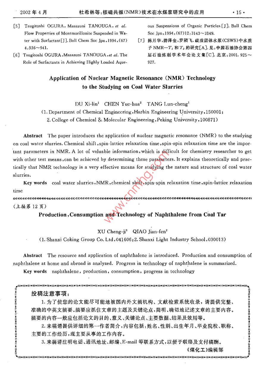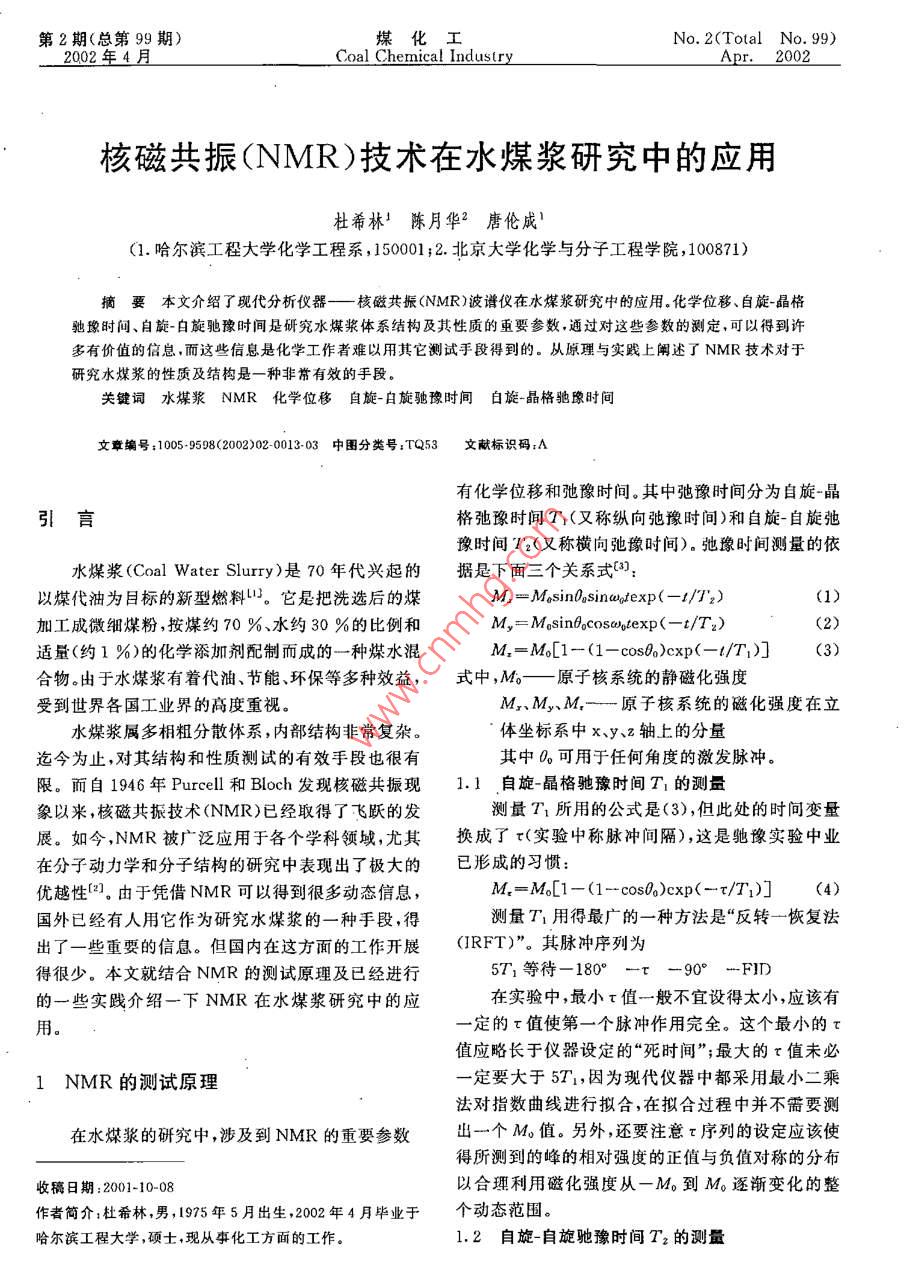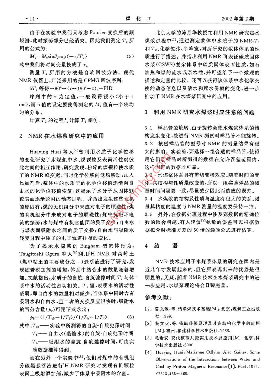 第2期(總第99期)煤化工No. 2(Total No 99)2002年4月oal Chemical IndustrApr.2002核磁共振(NMR)技術(shù)在水煤漿研究中的應(yīng)用杜希林!陳月華2唐倫成(1.哈爾濱工程大學(xué)化學(xué)工程系,150001;2.北京大學(xué)化學(xué)與分子工程學(xué)院,100871)摘要本文介紹了現(xiàn)代分析儀器——一核磁共振(NMR)波譜儀在水煤漿研究中的應(yīng)用。化學(xué)位移、自旋晶格馳豫時(shí)間、自旋-自旋馳豫時(shí)間是研究水煤漿體系結(jié)構(gòu)及其性質(zhì)的重要參數(shù),通過對(duì)這些參數(shù)的測(cè)定,可以得到許多有價(jià)值的信息,而這些信息是化學(xué)工作者難以用其它測(cè)試手段得到的。從原理與實(shí)踐上闡述了NMR技術(shù)對(duì)于研究水煤漿的性質(zhì)及結(jié)構(gòu)是一種非常有效的手段。關(guān)鍵詞水煤漿NMR化學(xué)位移自旋-自旋馳豫時(shí)間自旋-晶格孢豫時(shí)間文章編號(hào);10059598(2002)02-001303中圖分類號(hào):TQ53文獻(xiàn)標(biāo)識(shí)碼:A有化學(xué)位移和弛豫時(shí)間。其中弛豫時(shí)間分為自旋晶引言格弛豫時(shí)間T1(又稱縱向弛豫時(shí)間)和自旋-自旋弛豫時(shí)間T2(又稱橫向弛豫時(shí)間)。弛豫時(shí)間測(cè)量的依水煤漿( Coal Water Slurry)是70年代興起的據(jù)是下面三個(gè)關(guān)系式3以煤代油為目標(biāo)的新型燃料u。它是把洗選后的煤M,-MasinDosinadfexp(-1/T2)(1)加工成微細(xì)煤粉,按煤約70%、水約30%的比例和M,=Mosintocoswotexp(-t/T2)適量(約1%)的化學(xué)添加劑配制而成的一種煤水混M,=M6[1-(1-cos0)cxp(-t/T1)合物。由于水煤漿有著代油、節(jié)能、環(huán)保等多種效益,式中,M——原子核系統(tǒng)的靜磁化強(qiáng)度受到世界各國(guó)工業(yè)界的高度重視M、My、M—一原子核系統(tǒng)的磁化強(qiáng)度在立水煤漿屬多相粗分散體系,內(nèi)部結(jié)構(gòu)非常復(fù)雜。體坐標(biāo)系中x、y、z軸上的分量迄今為止,對(duì)其結(jié)構(gòu)和性質(zhì)測(cè)試的有效手段也很有其中可用于任何角度的激發(fā)脈沖。限。而自1946年 Purcell和 Bloch發(fā)現(xiàn)核磁共振現(xiàn)1.1自旋-晶格馳豫時(shí)間T1的測(cè)量象以來,核磁共振技術(shù)(NMR)已經(jīng)取得了飛躍的發(fā)測(cè)量T1所用的公式是(3),但此處的時(shí)間變量展。如今,NMR被廣泛應(yīng)用于各個(gè)學(xué)科領(lǐng)域,尤其換成了r實(shí)驗(yàn)中稱脈沖間隔),這是馳豫實(shí)驗(yàn)中業(yè)在分子動(dòng)力學(xué)和分子結(jié)構(gòu)的研究中表現(xiàn)出了極大的已形成的習(xí)慣優(yōu)越性(2]。由于憑借NMR可以得到很多動(dòng)態(tài)信息,M=M6[1-(1-cos0)cxp(-τ/T1)](4)國(guó)外已經(jīng)有人用它作為研究水煤漿的一種手段,得測(cè)量T1用得最廣的一種方法是“反轉(zhuǎn)一恢復(fù)法出了一些重要的信息。但國(guó)內(nèi)在這方面的工作開展(RFT)”。其脈沖序列為得很少。本文就結(jié)合NMR的測(cè)試原理及已經(jīng)進(jìn)行5T1等待-180°-r-90°-FID的一些實(shí)踐介紹一下NMR在水煤漿研究中的應(yīng)在實(shí)驗(yàn)中,最小τ值一般不宜設(shè)得太小,應(yīng)該有用。定的τ值使第一個(gè)脈沖作用完全。這個(gè)最小的τ值應(yīng)略長(zhǎng)于儀器設(shè)定的“死時(shí)間”;最大的τ值未必1NMR的測(cè)試原理定要大于571,因?yàn)楝F(xiàn)代儀器中都采用最小二乘法對(duì)指數(shù)曲線進(jìn)行擬合,在擬合過程中并不需要測(cè)在水煤漿的研究中涉及到NMR的重要參數(shù)出一個(gè)M值。另外,還要注意序列的設(shè)定應(yīng)該使得所測(cè)到的峰的相對(duì)強(qiáng)度的正值與負(fù)值對(duì)稱的分布收稿日期:2001-10以合理利用磁化強(qiáng)度從一M到M。逐漸變化的整作者簡(jiǎn)介杜希林,男,1975年5月出生,2002年4月畢業(yè)于個(gè)動(dòng)態(tài)范圍。哈爾濱工程大學(xué),碩士,現(xiàn)從事化工方面的工作1.2自旋-自旋馳豫時(shí)間T2的測(cè)量14煤化工2002年第2期由于在實(shí)驗(yàn)中我們只考慮 Fourier變換后的頻北京大學(xué)的陳月華教授在利用NMR研究焦水域譜,此時(shí)振蕩部分已經(jīng)消失。因此我們測(cè)定T2所煤漿過程中,通過測(cè)定漿體中水質(zhì)子的NMRT用的公式為和T2、化學(xué)位移、半峰寬,對(duì)所研究的漿體體系的性M,-MosinBoexp(-T/T2)(5)質(zhì)進(jìn)行了描述。并指出利用NMR可表征碳質(zhì)固體式中我們將時(shí)間變量換成了τ水漿(CSwS)復(fù)雜體系中碳質(zhì)固體表面性質(zhì),如石測(cè)量T:所用的方法是自旋回波方法?,F(xiàn)代油焦和煤的疏水或親水性,并可望給予一個(gè)微觀的NMR儀器上,廣泛釆用的是CPMG回波序列描述和定量的比較。還可以獲得該體系中水化學(xué)交5T1等待-90°-(z-180°-τ)n-FID換的動(dòng)態(tài)信息以及活水和死水份額的變化,進(jìn)一步序列中的為定值,一般設(shè)得很小(小于1推動(dòng)了NMR在水煤漿研究中的應(yīng)用ms),而n值的設(shè)定要使得測(cè)定的M值有一個(gè)較均勻的分布。3利用NMR研究水煤漿時(shí)應(yīng)注意的問題計(jì)算T2的過程與計(jì)算T1相仿。3.1樣品管的旋轉(zhuǎn)。由于旋轉(zhuǎn)會(huì)使水煤漿體系的結(jié)2NMR在水煤漿研究中的應(yīng)用構(gòu)發(fā)生變化,故進(jìn)行NMR測(cè)試時(shí)樣品管不能旋轉(zhuǎn)3.2核磁樣品管的型號(hào)對(duì)NMR的測(cè)量結(jié)果有很Huaying Huai等人曾利