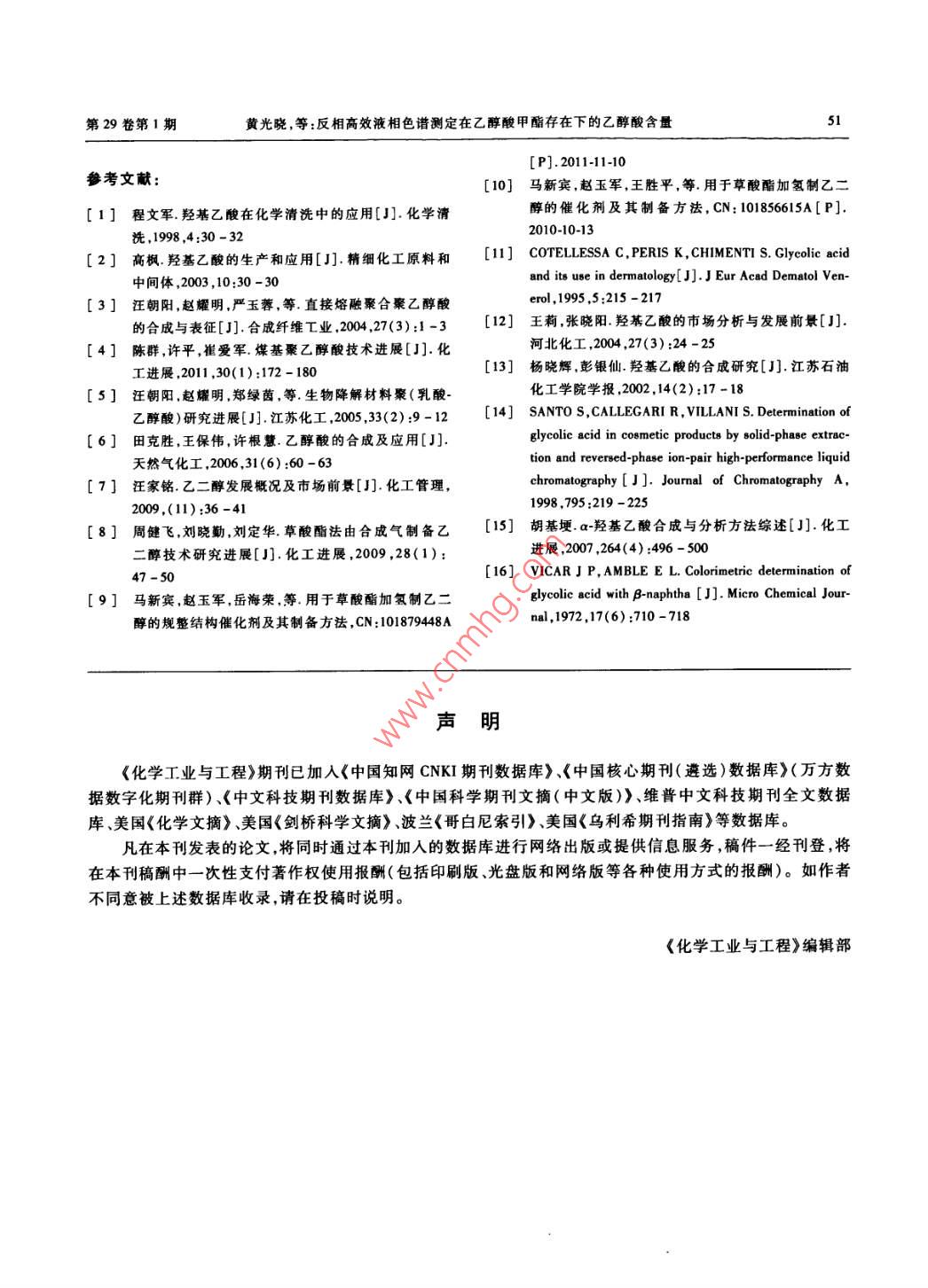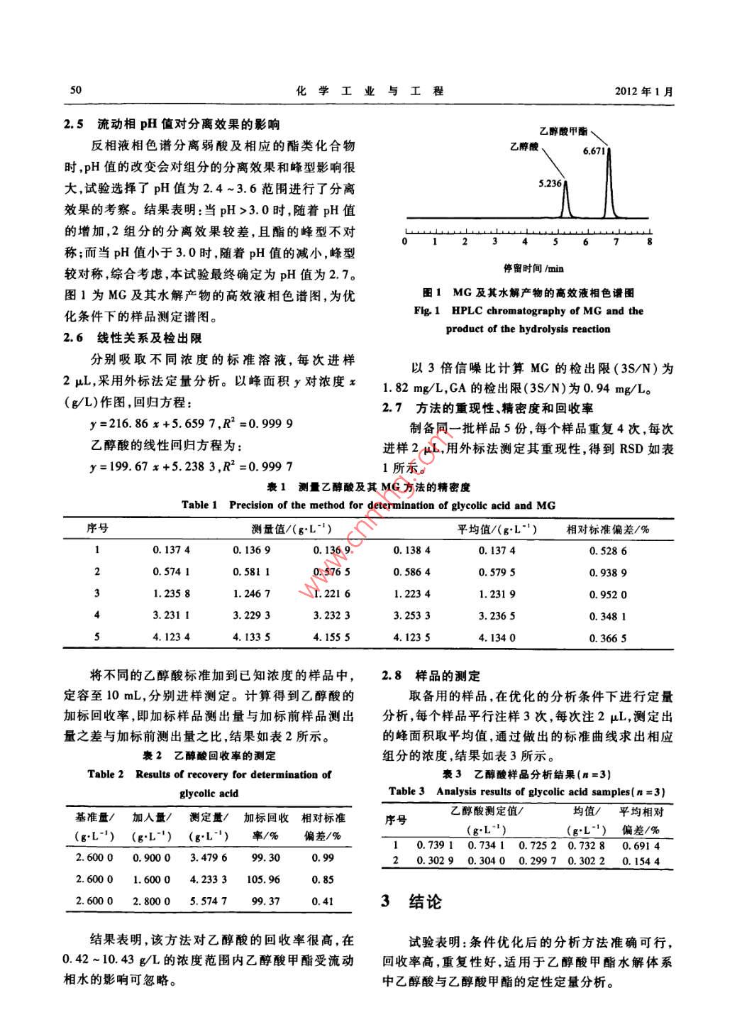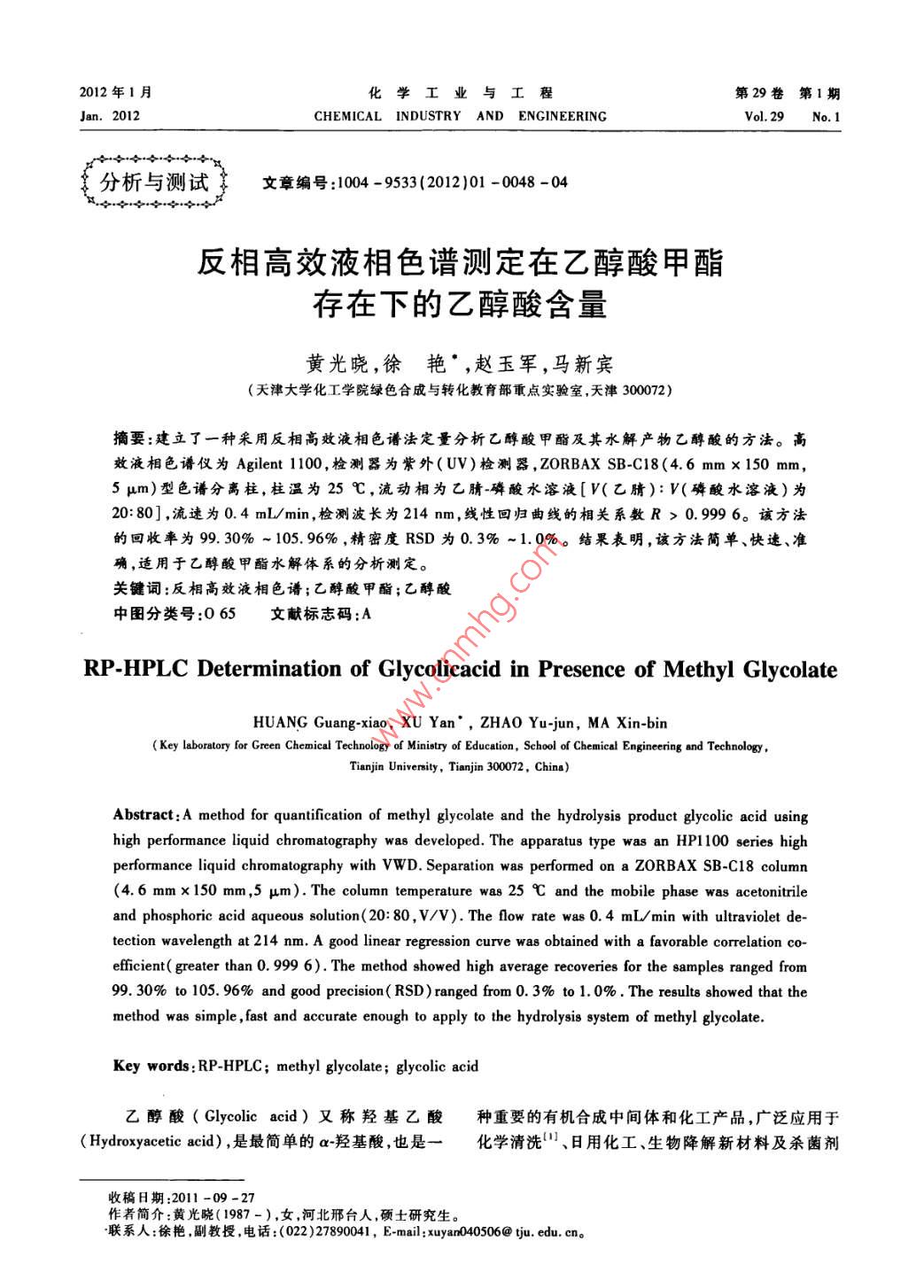 2012年1月化學(xué)工業(yè)與工程第29卷第1期CHEMICAL INDUSTRY AND ENGINEERINGVol 29 No. 1◆……分析與測試了文章編號:0-9300200804反相高效液相色譜測定在乙醇酸甲酯存在下的乙醇酸含量黃光曉,徐艷·,趙玉軍,馬新賓(天津大學(xué)化工學(xué)院綠色合成與轉(zhuǎn)化教育部重點實驗室,天津300072)摘要:建立了一種采用反相高效液相色譜法定量分析乙醇酸甲酯及其水解產(chǎn)物乙醇酸的方法。高效液相色譜儀為 Agilent1100,檢測器為紫外(UV)檢測器, ZORBAX SB-C18(4.6mmx150mm,5μm)型色譜分離柱,柱溫為25℃,流動相為乙腈-磷酸水溶液[V(乙腈):V(磷酸水溶液)為20:80],流速為0.4mL/min,檢測波長為214mm,線性回歸曲線的相關(guān)系數(shù)R>0.9996。該方法的回收率為99.30%-105.%6%,精密度RSD為0.3%~1.0%。結(jié)果表明,該方法簡單、快遠(yuǎn)、準(zhǔn)確,適用于乙醇酸甲酯水解體系的分析測定。關(guān)鍵詞:反相高效液相色譜;乙醇酸甲酯;乙醇酸中圖分類號:065文獻(xiàn)標(biāo)志碼:ARP-HPLC Determination of Glycolicacid in Presence of Methyl GlycolateHUANG Guang-xiao, XU Yan", ZHAO Yu-jun, MA Xin-binKey laboratory for Green Chemical Technology of Ministry of Education, School of Chemical Engineering and TechnologyTianjin University. T300072,ChirAbstract: A method for quantification of methyl glycolate and the hydrolysis product glycolic acid usinghigh performance liquid chromatography was developed. The apparatus type was an HP1100 series highperformance liquid chromatography with VWD Separation was performed on a ZORBAX SB-C18 column(4. 6 mm x 150 mm, 5 um). The column temperature was 25 C and the mobile phase was acetonitrileand phosphoric acid aqueous solution( 20: 80, V/V). The flow rate was 0. 4 mL min with ultraviolet detection wavelength at 214 nm. a good linear regression curve was obtained with a favorable correlation co-efficient( greater than 0. 999 6). The method showed high average recoveries for the samples ranged from99. 30% to 105. 96% and good precision( RSD )ranged from 0. 3% to 1.0%. The results showed that themethod was simple, fast and accurate enough to apply to the hydrolysis system of methyl glycolateKey words: RP-HPLC; methyl glycolate; glycolic acid乙醇酸( Glycolic acid)又稱羥基乙酸種重要的有機(jī)合成中間體和化工產(chǎn)品,廣泛應(yīng)用于( Hydroxyacetic acid),是最簡單的a羥基酸,也是一化學(xué)清洗、日用化工、生物降解新材料及殺菌劑收稿日期:2011-09-27作者簡介:黃光曉(1987-),女,河北邢臺人,碩士研究生。聯(lián)系人:徐艷副教授,電話:(022)27890041,E-mal: xuyan040506@ju.edu,cn第29卷第1期黃光曉,等:反相高效液相色譜測定在乙醇酸甲酯存在下的乙醇酸含量等領(lǐng)域2]。羥基乙酸可以自聚合成聚羥基乙酸釋法配制0.42、1.04、2.09、3.13、4.17、6.26和(PGA)134,也可以和乳酸發(fā)生共聚,合成聚乳酸乙10.43g/L的標(biāo)準(zhǔn)溶液。配制濃度分別為0.24、醇酸(PLGA)151,它們都是重要的生物降解材料,具0.60、1.20、1.80、2.41、3.00和6.00g/L的乙醇酸有無毒、生物兼容、可在生物體內(nèi)外降解等獨特性標(biāo)準(zhǔn)溶液。能,廣泛應(yīng)用于縫合補(bǔ)強(qiáng)材料、手術(shù)縫合線、藥物緩樣品的制備:從乙醇酸甲酯水解反應(yīng)器內(nèi)準(zhǔn)確釋載體和組織工程等醫(yī)用高分子領(lǐng)域。稱取混合液,根據(jù)濃度稀釋150-200倍,然后用目前我國煤制乙二醇的技術(shù)已經(jīng)從研究開發(fā)0.45m孔徑濾膜過濾,備用??焖龠M(jìn)入了工業(yè)化實用階段10。乙醇酸甲酯作為配制的所有樣品均經(jīng)過0.45μm的有機(jī)過濾煤制乙二醇副產(chǎn)品,進(jìn)行其下游產(chǎn)品的開發(fā)和利用膜過濾處理后注入色譜。成為一個重要的研究方向。乙醇酸甲酯水解合成1.2試驗方法乙醇酸與目前已經(jīng)工業(yè)化的氯乙酸水解法13和用2μL的進(jìn)樣器吸取樣品,在不同的色譜條件羥基乙腈水解法相比,具有操作安全、對環(huán)境無污下,連續(xù)注入數(shù)次,優(yōu)化分析條件,在最適宜條件下染的優(yōu)勢,是一條很有發(fā)展前途的綠色工藝路將配制的標(biāo)準(zhǔn)溶液,利用外標(biāo)法做出標(biāo)準(zhǔn)曲線,采線。乙醇酸的分析方法目前主要有:比色法、氣用峰保留值比較法和峰面積增量法進(jìn)行定性定量相色譜法、高效液相色譜法、化學(xué)發(fā)光法、離子色分析。譜法、毛細(xì)管電泳法和核磁共振法等。其中,比色法( Spectrophotography)基于濃硫酸、萘酚與羥基2結(jié)果與討論乙酸的顯色反應(yīng)6,而多種化學(xué)物質(zhì)在濃硫酸與萘酚同時存在時可以顯色,所以此法定量分析的準(zhǔn)確2.1檢測波長的確定性不高。氣相色譜法(GC),由于乙醇酸的熱不穩(wěn)定對乙醇酸甲酯、乙醇酸的標(biāo)樣用756PC型紫外性和化學(xué)活潑性羥基,只能經(jīng)過硅烷化衍生后再分分光光度計進(jìn)行全波長掃描(200~700m),試驗析其含量,而衍生化處理會使分析結(jié)果的重現(xiàn)性較發(fā)現(xiàn)在202m處乙醇酸甲酯有最大吸收峰,214mm差,且價格昂貴。處乙醇酸有較大吸收峰,考慮到流動相用的是乙腈針對乙醇酸甲酯水解反應(yīng)體系建立的高效液和磷酸水溶液,在203m處有比較明顯的溶劑吸收相色譜法,有著明顯的簡便、快速、準(zhǔn)確、高效的特峰,所以檢測波長確定為214mm。點,適用于乙醇酸甲酯存在下的乙醇酸含量的測定。2.2流速的選擇隨著流速的減小,各組分峰的保留時間都逐漸1試驗部分增加,樣品的分離度逐漸增大,綜合考慮組分的出峰時