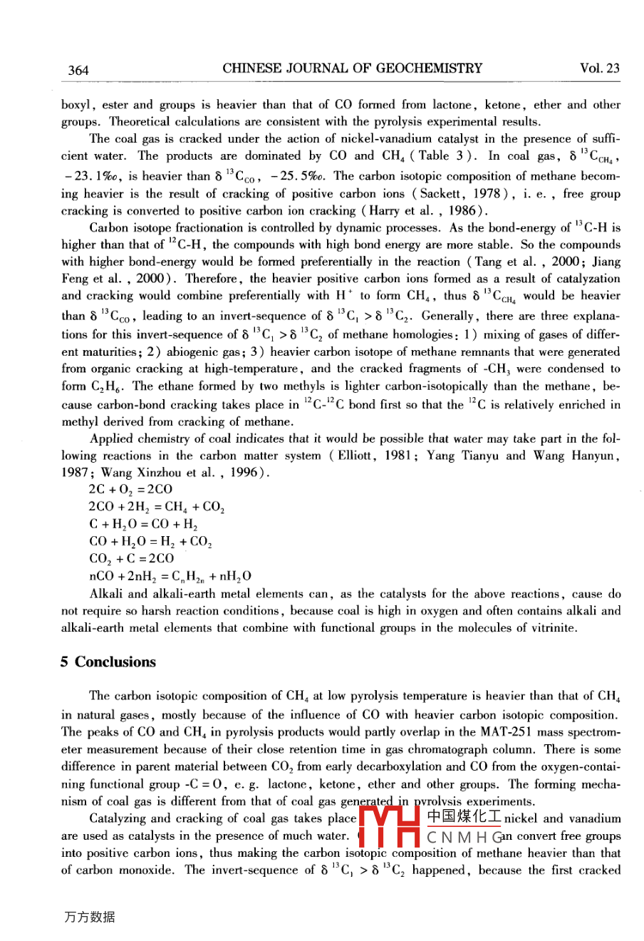 Vol 23 No 4CHINESE JOURNAL OF GEOCHEMISTRY2004The Influence of co on the carbon IsotopicComposition of Ch in Closed PyrolysisExperiment With CoalLIU Quanyou(劉全有) and Liu Wenhui(劉文匯State Key Laboratory of Gas Geochemistry, Lanzhou Institute of GeologyChinese academy of Sciences, Lanzhou 730000, China)Abstract: A low-mature coal (R, =0. 4%, from the Manjiaer depression, Tarim Basin, Chi-na)was subjected to closed system pyrolysis, in sealed gold tubes, under isothermal temperature conditions. The carbon isotopic compositions of the pyrolyst fractions( hydrocarbon, CO 2Co, etc.)at two temperature points(350%C and 550C)were measured. The results showedthat8CcHA value is generally heavier at 350%C than that at 550C, because the high abun-dance of Co generated at low temperature would greatly influence 8CCH, value, and the reten-tion time of CO in gas chromatograph is close to that of CHa. But Co is formed through chemicalreaction of the oxygen-containing functional group-C=0, e. g. lactones, ketones, ether, etat low temperature, while CO, comes mainly from decarboxylizationThe carbon isotopic composition of coal gas from Lanzhou Coal Gas Works was definitelyfferent from that of thermally pyrolysed products from coal. The8 CcHA value of coal gas wasabnormally heavier than 8'Cco. At the same time, the reversed sequence(8C1>8C2) of8C and 8C? happened. The bond energy of free ions generally decides the sequence ofgeneration of hydrocarbon fractions according to the chemical structure, whereas the stability ofpyrolysate fractions and their carbon isotope fractionation are affected by the C-C bond energy.Key words low rank coal vitrinite: thermal simulating experiment; coal gas; carbonisotope fractionation1 IntroductionThe carbon isotopic composition of natural gases is regarded as a contant tracer used in the geohemical research of natural gases. Based on the carbon isotopic composition, the genetic types ofnatural gases are basically divided to determine the maturation of natural gases and make gas-sourcecorrelations( Stahl, 1973; Stahl and Carey, 1975; Stahl et al., 1977; James, 1983; Schoell1983, 1988; Dai Jinxing et al., 1992; Fu Jiamo et al., 1992 Xu yongchang, 1994). The formation of natural gases could be deduced in terms of carbon isotopic variations in pyrolysis experiments, because the carbon isotopic composition can reflect parent source rock type and its thermal e-volution( Fu Jiamo et al., 1992; Xu Yongchang, 1994; Huang Difan et al., 1995; Tang et al.2000). Therefore, great attention should always be paid to carbon isotopic composition in naturalgas research. Previous studies showed that the carbon isotopic composition of methane(8Cbecame gradually heavier with the parent source rock eve中國煤化工 ivy hydrocarbons( James, 1983; Schoell, 1983 ) The study of carbon isotYHCNMHGrolysis experiISSN10009426This study was supported by the National Basic Research(973 )Program of China(No. 2001 CB209102)360CHINESE JOURNAL OF GEOCHEMISTRYVol 23ment is helpful to probe the carbon isotopic composition of gases produced during thermal evolutionof the parent source rocks, and natural gas typesThe pyrolysis gases are composed of hydrocarbon and non-hydrocarbon gases(e.g. CO2, COetc.). The pyrolysis products were injected into an MAT-251 mass spectrometer to measure theircarbon isotopes, with analytical error( standard deviation) less than 0. 3%0. The hydrocarbon gaseswhich dont come up to the lower limit of mass spectrometric measurement cannot be detected, because of a high abundance of CO,, Co and a very low abundance of hydrocarbon gases at low pyrol-ysis temperature. At the same time, the peaks of CO and CH, were hard to separate from each otherin chromatograph separation on the MAT-251 mass spectrometer because of their close retentiontime. So, the measured 8CcH, was influenced, to some extent by the abundance of CO under thesame experimental conditions, especially at low temperature. Actually, 8CcH, values measured onthe Mat-251 mass spectrometer are the bulk values of carbon isotopes of CO and CH4( Table 1). Inprevious pyrolysis experiments, the carbon isotopic composition of CHa often showed a trend of beingfirst heavy and then light at low temperatures, finally the carbon isotopic composition of Cha becameheavy once again for high-rank coals( Peters et al., 1981; Schoell, 1983; Liu Quanyou, 2001Tang et al., 2000). This result is always inconsistent with the natural result that the carbon isotopiccomposition of methane becomes heavier gradually with the evolution of parent source rocks. Previous explanation is usually based on the heavy carbon isotopic composition of remnant-absorbed hydrocarbons in the original sample dismounted from the primary pyrolysis stage and inhomogeneousmaterial( Peters et al., 1981)Table 1. Carbon isotopes of pyrolysis gasesT(℃)Rn(%)8"C2(%)8"C(%)8"c(%)0.7420.526.5Vitrinite7431.4These samples were measured on an MAT-251 mass spectrometer; PDB. C %oThe carbon isotopic composition of methane measured is true because the abundance of co isnegligible in nature gases( Xu Yongchang, 1994 ). But in pyrolysis experiments large amounts ofCo were liberated from organic matter at low temperature, especially at 400C. Sometimes, theabundance of CO in pyrolysis is higher than that of CHA. So, it is difficult to precisely measure thecarbon isotopic composition of methane due to the partial overlap of Co peak and CH, peak. Therefore, the influence of CO on the measurement of carbon isotopic composition of methane is very precise. The lower the temperature is, the more obvious this influence will be. This influence woulddisappear"with decreasing CO abundance and greatly increasing CHa abundance with the rise of2 Experimental device and pyrolysis product analysisA low-mature coal(R =0.4%, from the Manjiaer depression, Tarim Basin, China),wassubjected to closed system pyrolysis, in sealed goldtemperature conditieranging from 250 to 550C at temperature intervals中