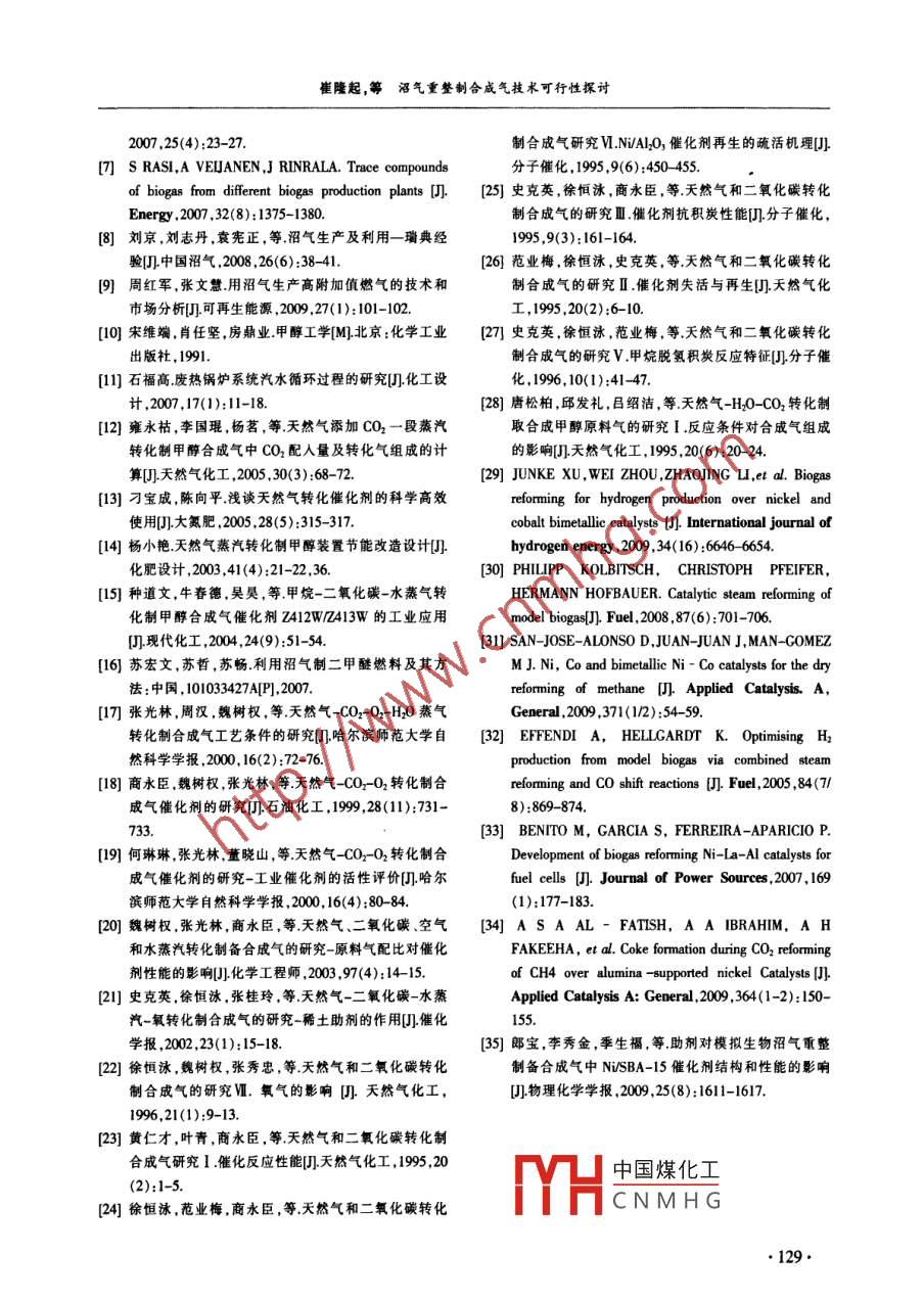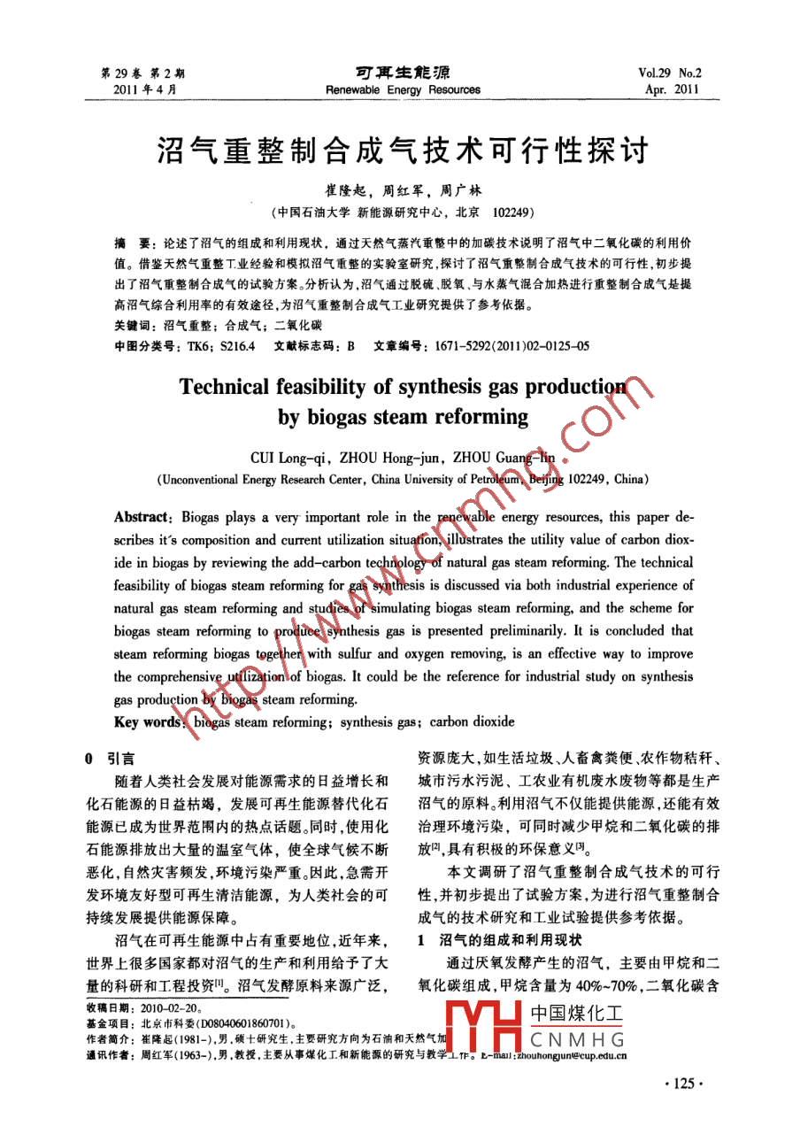 第29卷第2期可再生能獠Vol 29 No. 22011年4月Renewable Energy ResourcesApr.2011沼氣重整制合成氣技術可行性探討崔隆起,周紅軍,周廣林(中國石油大學新能源研究中心,北京102249)摘要:論述了沼氣的組成和利用現(xiàn)狀,通過天然氣蒸汽重整中的加碳技術說明了沼氣中二氧化碳的利用價值。借鑒天然氣重整工業(yè)經(jīng)驗和模擬沼氣重整的實驗室研究,探討了沼氣重整制合成氣技術的可行性,初步提出了沼氣重整制合成氣的試驗方案。分析認為,沼氣通過脫硫、脫氧、與水蒸氣混合加熱進行重整制合成氣是提高沼氣綜合利用率的有效途徑,為沼氣重整制合成氣工業(yè)研究提供了參考依據(jù)。關鍵詞:沼氣重整;合成氣;二氧化碳中圖分類號:TK6;S2164文獻標志碼:B文章編號:1671-5292(2011)02-0125-05Technical feasibility of synthesis gas productionby biogas steam reformingCUI Long-qi, ZHOU Hong-jun, ZHOU Guang-lin( Unconventional Energy Research Center, China University of Petroleum, Beijing 102249, China)Abstract: Biogas plays a very important role in the renewable energy resources, this paper describes it's composition and current utilization situation, illustrates the utility value of carbon dioxide in biogas by reviewing the add-carbon technology of natural gas steam reforming. The technicalfeasibility of biogas steam reforming for gas synthesis is discussed via both industrial experience ofnatural gas steam reforming and studies of simulating biogas steam reforming, and the scheme forbiogas steam reforming to produce synthesis gas is presented preliminarily. It is concluded thatsteam reforming biogas together with sulfur and oxygen removing, is an effective way to improvethe comprehensive utilization of biogas. It could be the reference for industrial study on synthesisgas production by biogas steam reformingKey words: biogas steam reforming: synthesis gas; carbon dioxide0引言資源龐大,如生活垃圾、人畜禽糞便、農(nóng)作物秸稈、隨著人類社會發(fā)展對能源需求的日益增長和城市污水污泥、工農(nóng)業(yè)有機廢水廢物等都是生產(chǎn)化石能源的日益枯竭,發(fā)展可再生能源替代化石沼氣的原料。利用沼氣不僅能提供能源還能有效能源已成為世界范圍內的熱點話題。同時,使用化治理環(huán)境污染,可同時減少甲烷和二氧化碳的排石能源排放出大量的溫室氣體,使全球氣候不斷放,具有積極的環(huán)保意義惡化,自然災害頻發(fā),環(huán)境污染嚴重。因此,急需開本文調研了沼氣重整制合成氣技術的可行發(fā)環(huán)境友好型可再生清潔能源,為人類社會的可性,并初步提出了試驗方案,為進行沼氣重整制合持續(xù)發(fā)展提供能源保障成氣的技術研究和工業(yè)試驗提供參考依據(jù)。沼氣在可再生能源中占有重要地位,近年來,1沼氣的組成和利用現(xiàn)狀世界上很多國家都對沼氣的生產(chǎn)和利用給予了大通過厭氧發(fā)酵產(chǎn)生的沼氣,主要由甲烷和二量的科研和工程投資。沼氣發(fā)酵原料來源廣泛,氧化碳組成甲烷含量為40%-70%,二氧化碳含收稿日期:201002-20基金項目:北京市科委(Do8040601860701)。中國煤化工作者簡介:崔隆起1(1981-,男,頒士研究生,主要研究方向為石油和天然氣加CNMHG通訊作者:周紅軍(1963-),男,教授,主要從事煤化工和新能源的研究與教可再生能驃2011,29(2)量為30%-60%4,此外,沼氣中還含有少量的硫囊1天然氣一段蒸汽重整出口氣體組成化氫氨氣、氧氣、氫氣、氮氣、一氧化碳和鹵代烴Table 1 The gas composition after first-stage steam等多種揮發(fā)性有機化合物。沼氣的來源不同reforming of natural gas其組成也不同,尤其是微量化合物含量的差別較分析項目CHH2CoCO2N2大如果沼氣不加以利用直接排放到大氣中,不僅一段出口93770955951324049會增加溫室氣體的大量排放,還會污染環(huán)境,甚至注:摘自2008年4月7日吐哈油田甲醇廠甲醇裝置分析報表發(fā)生安全事故。天然氣為原料的一段蒸汽重整制甲醇裝置中,存目前,沼氣利用主要有兩種形式:①用作天在著H2過量而碳不足的問題。為了解決這個問然氣的替代品,直接燃燒供熱或用于發(fā)電;②蒸汽題,有兩種方法可供選擇,一是增設二段純氧爐,重整制氫用于生產(chǎn)燃料電池或蒸汽重整制合成氣二是在一段爐前或爐后補碳。生產(chǎn)柴油替代品二甲醚(DME)燃料,用于農(nóng)業(yè)機2.1二段純氧爐調節(jié)法械等。第一種利用方式已經(jīng)在世界范圍內普遍應此方法是一段重整后的混合氣體與預熱后的用,沼氣在供熱、熱電聯(lián)產(chǎn)、車用燃料、并入天然氣純氧在二段純氧爐混合燃燒,不需要外加熱源,爐管等方面展現(xiàn)出良好的應用前景,技術日趨成內主要發(fā)生的是氫氣燃燒反應。吐哈油田甲醇廠熟;第二種利用方式尚未形成工業(yè)化。在產(chǎn)能擴建時采用了增設二段純氧爐的方案,投同沼氣的直接燃燒利用相比,用沼氣生產(chǎn)高運以來運行效果良好,經(jīng)濟效益明顯。投運后二段附加值燃料具有更大的經(jīng)濟效益,烴類蒸汽重爐出口氣體組成穩(wěn)定(表2)。整作為制備能源原料的途徑已經(jīng)得到充分肯定表2二段爐出口氣體組成因此,可以借鑒天然氣蒸汽重整對沼氣重整進行be2The8 s composition after second- stage steam研究。reforming of natural gas2甲烷蒸汽重整分析項目CH4H2沼氣和天然氣組成相似,主要成分都是甲烷,二段出口031705117281100.90在現(xiàn)有技術基礎上天然氣蒸汽重整裝置無需大的注:摘自2008年4月28日吐哈油田甲醇廠甲