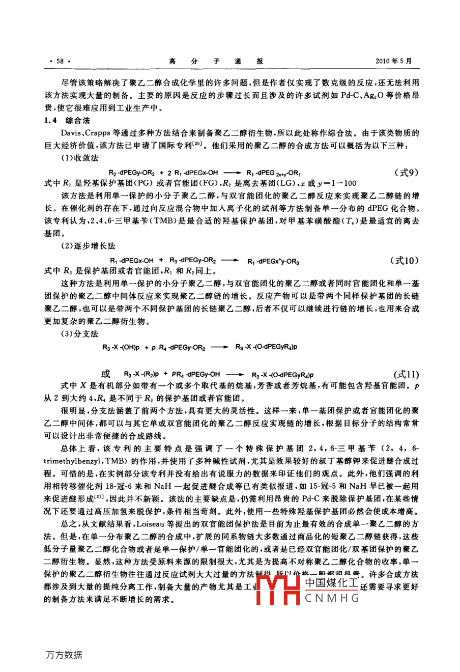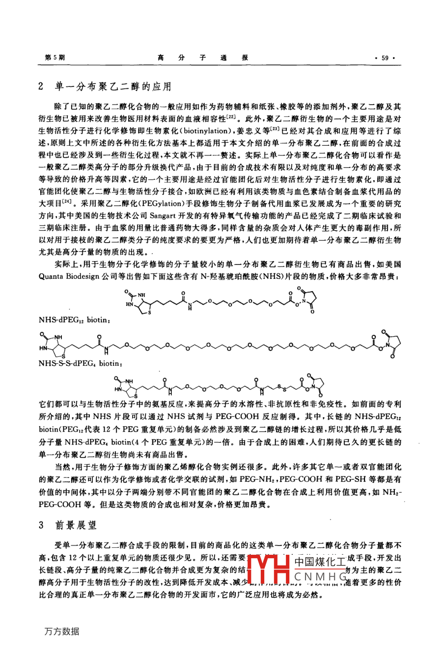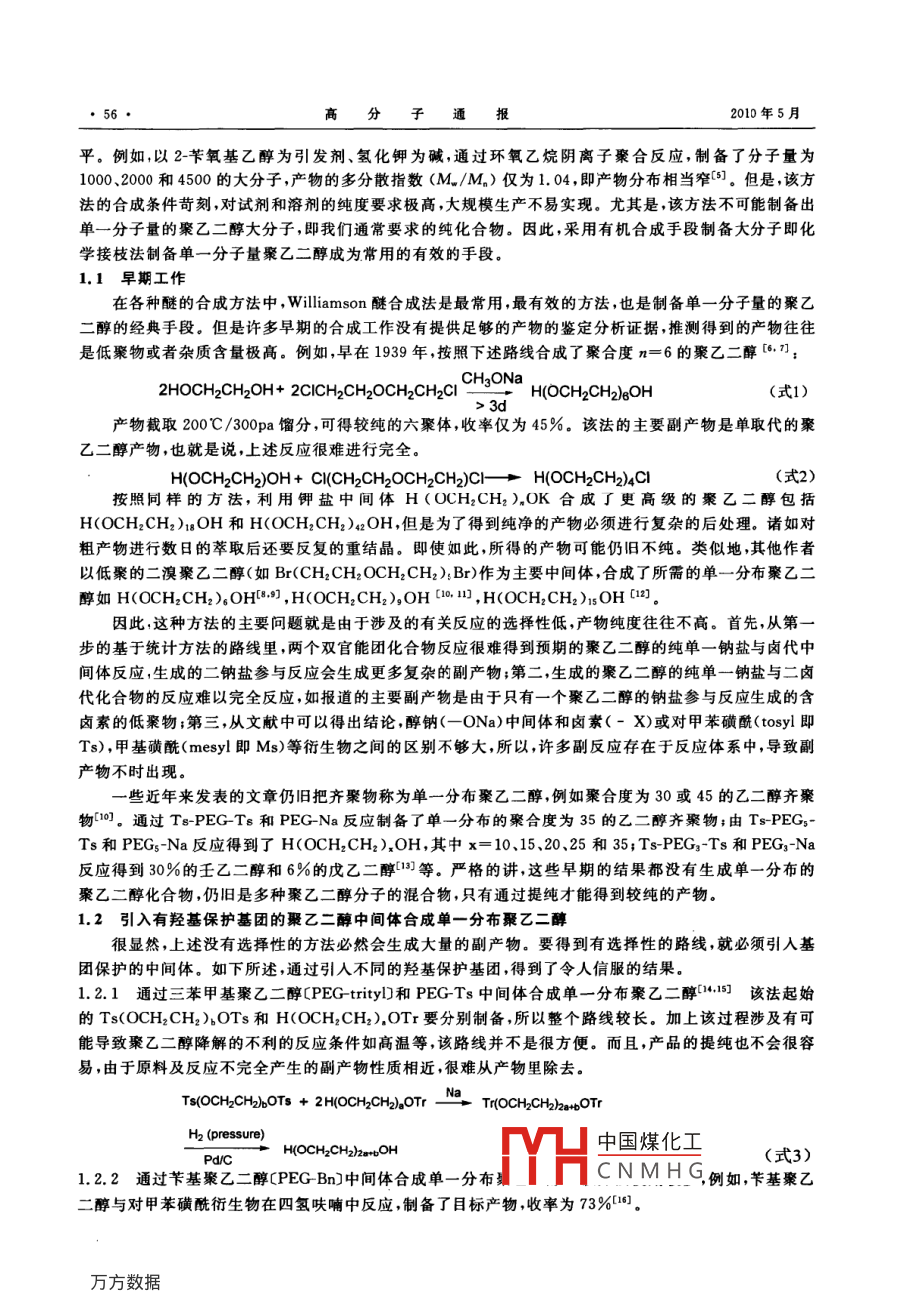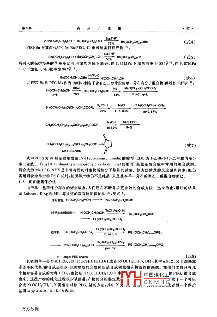 第5期高分子通報(bào)55知識(shí)介紹單一分布聚乙二醇的合成及其應(yīng)用馮柏成1,趙金鎧2,管憲文3(1.青島科技大學(xué)化工學(xué)院,青島266042;2.青島迪愛(ài)生精細(xì)化學(xué)有限公司,青島266101;3.青島潤(rùn)興光電材料有限公司,青島266024)摘要:聚乙二醇(PEG)經(jīng)過(guò)對(duì)端基官能團(tuán)化接枝到藥物等生物活性分子上后,可提高藥物等的水溶性、抗免疫原性、生物相容性和穩(wěn)定性并降低毒性。工業(yè)級(jí)聚乙二醇由于雜質(zhì)含量高尤其是其中二醇的含量過(guò)高、分子量分布過(guò)寬,不能直接用于藥物等的改性。除利用聚合方法制備窄分布高純度的聚乙二醇外,采用有機(jī)合成方法合成單一聚乙二醇鏈?zhǔn)怯行У氖侄?。?duì)“單一鏈長(zhǎng)( discrete length)”或者“單一分布( mono-disperse)”的聚乙二醇高分子聚合物的近年來(lái)主要合成方法的進(jìn)展進(jìn)行了綜述并簡(jiǎn)介了其主要應(yīng)用關(guān)鍵詞:關(guān)鍵詞:聚乙二醇;單一分布;官能團(tuán)化引言聚乙二醇( polyethylene glycol,PEG)價(jià)格低廉、用途廣泛,屬于一般的化學(xué)品,而官能團(tuán)化的聚乙二醇如氨基聚乙二醇可以對(duì)生物活性分子改性,是實(shí)現(xiàn)藥物傳輸及其控釋等的重要中間體口-4??茖W(xué)研究發(fā)現(xiàn),聚乙二醇經(jīng)過(guò)官能團(tuán)化接枝到藥物等生物活性分子上后,可提高藥物等的水溶性、生物相容性和穩(wěn)定性并降低毒性。由于聚乙二醇類(lèi)化合物優(yōu)異的生物相容性,已被美國(guó)食品和藥物管理局(FDA)批準(zhǔn)用于藥物和食品等與人體有關(guān)的產(chǎn)品中。但是工業(yè)級(jí)聚乙二醇由于雜質(zhì)含量高、分子量分布過(guò)寬,尤其是聚乙二醇單甲醚中的二醇含量過(guò)高,不能直接用于藥物等的改性,因此合成單一分布聚乙二醇一直是該領(lǐng)域的研究熱點(diǎn)。經(jīng)過(guò)二十多年的努力,已有多家公司開(kāi)發(fā)生產(chǎn)了藥品級(jí)的窄分布聚乙二醇并對(duì)其進(jìn)行了官能團(tuán)化,如日本油脂化學(xué)、美國(guó)道化學(xué)公司等。目前,已有幾支聚乙二醇化的藥物上市,如第一代產(chǎn)品 Dagen°、 Oncaspar;第二代產(chǎn)品 PEG-Intron、 Pegvisomant、 Somavert·、 pegfilgrastim以及Neulasta·。在歐洲主要有羅氏公司的 Pegasys,即 peginterferon alfa-2a于2002年被FDA批準(zhǔn)用于慢性C型肝炎的治療。然而,盡管許多合成的聚乙二醇產(chǎn)品的分子量分布已經(jīng)相當(dāng)窄,最小已可以達(dá)到多分散系數(shù)(M/M)為1.05以下,但仍舊是不同分子量聚乙二醇的混合物,尤其是其中含有的雜質(zhì),往往導(dǎo)致對(duì)生物活性分子修飾過(guò)程的重復(fù)性難以保證。在藥物等生物活性分子的研究應(yīng)用中,避免引人混合物是普遍采用的策略高純度是最終產(chǎn)物追求的主要目標(biāo)之一,所以人們從很早就希望制備單一鏈長(zhǎng)/分子量( discrete-length)的聚乙二醇或者單一分布( mono-disperse)的聚乙二醇純化合物以應(yīng)用于藥物等領(lǐng)域。所謂單一分子量聚乙二醇理論上應(yīng)為特定鏈長(zhǎng)的純化合物,最近常被特稱(chēng)為dPEG或者“準(zhǔn)確PEG”( exact PEG)。1單一分布聚乙二醇的合成單一分布聚乙二醇可以經(jīng)由多種化學(xué)方法合成,而其中效率最高的無(wú)疑還是采用聚合手段。當(dāng)然,這種方法生成的產(chǎn)物必然是大分子混合物,只是產(chǎn)物的分yHs中國(guó)煤化工到非常窄的水作者簡(jiǎn)介:馮柏成,男,44歲,博士,副教授,任教于青島科技大學(xué),主要CNMH通訊聯(lián)系人,E-mail:fbc515@163.com·56高分子通報(bào)2010年5月平。例如,以2-芐氧基乙醇為引發(fā)劑、氫化鉀為堿,通過(guò)環(huán)氧乙烷陰離子聚合反應(yīng),制備了分子量為1000、2000和4500的大分子,產(chǎn)物的多分散指數(shù)(M/Mn)僅為1.04,即產(chǎn)物分布相當(dāng)窄。但是,該方法的合成條件苛刻,對(duì)試劑和溶劑的純度要求極高,大規(guī)模生產(chǎn)不易實(shí)現(xiàn)。尤其是,該方法不可能制備出單一分子量的聚乙二醇大分子,即我們通常要求的純化合物。因此,采用有機(jī)合成手段制備大分子即化學(xué)接枝法制備單一分子量聚乙二醇成為常用的有效的手段。1.1早期工作在各種醚的合成方法中, Williamson醚合成法是最常用,最有效的方法,也是制備單一分子量的聚乙二醇的經(jīng)典手段。但是許多早期的合成工作沒(méi)有提供足夠的產(chǎn)物的鑒定分析證據(jù),推測(cè)得到的產(chǎn)物往往是低聚物或者雜質(zhì)含量極高。例如,早在1939年,按照下述路線(xiàn)合成了聚合度n=6的聚乙二醇[6,72HOCH2CH2OH+2CICH2 CH2OCH2CH, CI CH3ONaH(OCH2 CH2)BOH(式1)>3d產(chǎn)物截取200℃/300pa餾分,可得較純的六聚體,收率僅為45%。該法的主要副產(chǎn)物是單取代的聚乙二醇產(chǎn)物,也就是說(shuō),上述反應(yīng)很難進(jìn)行完全。H(OCH2 CH2)OH+ Cl(CH2CH2OCH2 CH2)Ch- H(OCH2 CH2)4Cl(式2)按照同樣的方法,利用鉀鹽中間體H(OCH2CH2)OK合成了更高級(jí)的聚乙二醇包括H(OCH2CH2)18OH和H(OCH2CH2)42OH,但是為了得到純凈的產(chǎn)物必須進(jìn)行復(fù)雜的后處理。諸如對(duì)粗產(chǎn)物進(jìn)行數(shù)日的萃取后還要反復(fù)的重結(jié)晶。即使如此,所得的產(chǎn)物可能仍舊不純。類(lèi)似地,其他作者以低聚的二溴聚乙二醇(如Br(CH2CH2OCH2CH2)5