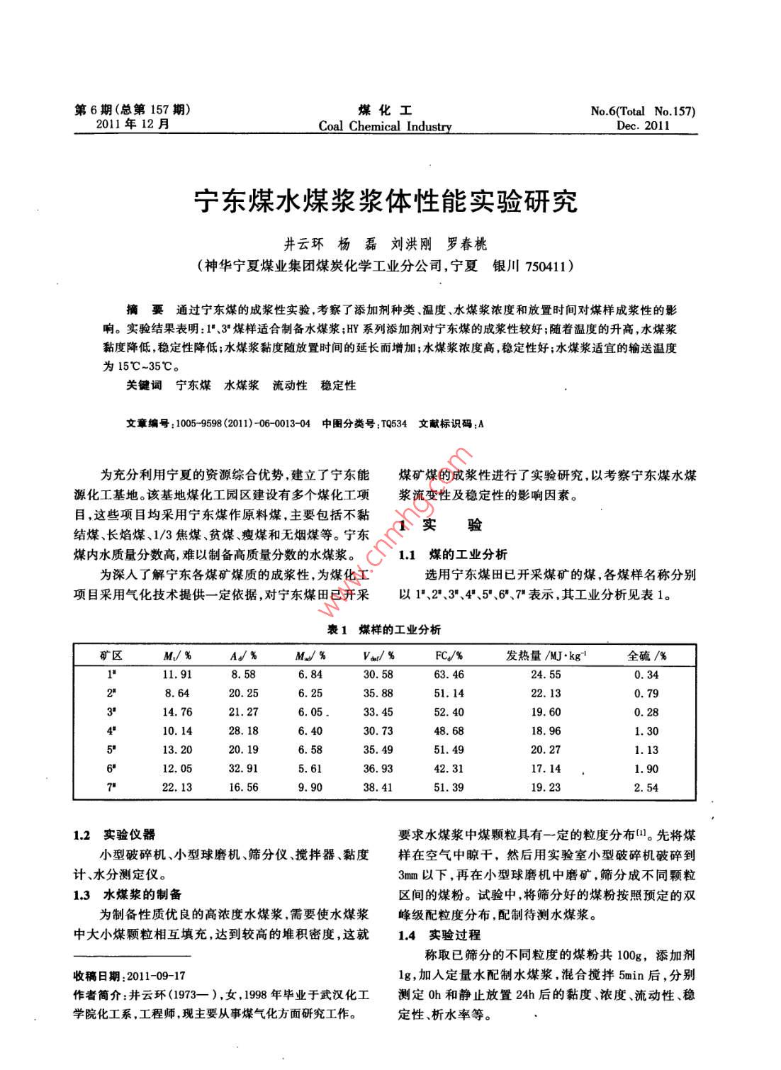 寧東煤水煤漿漿體性能實(shí)驗(yàn)研究